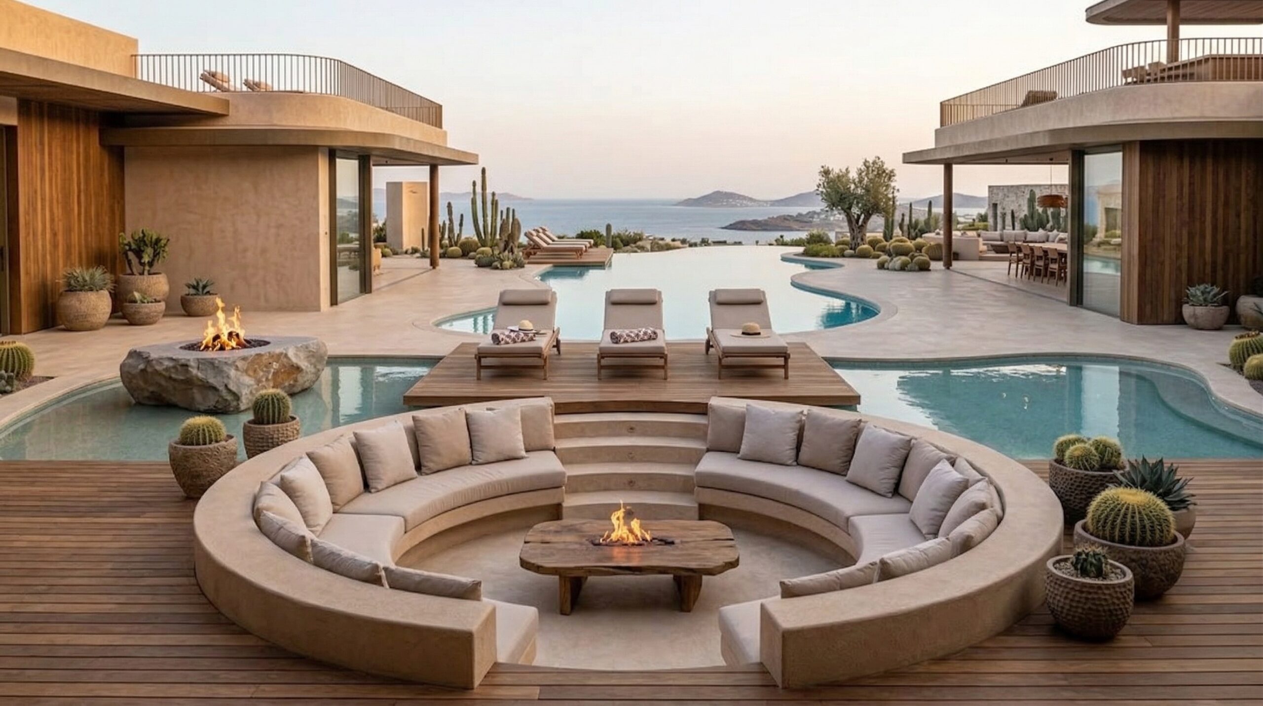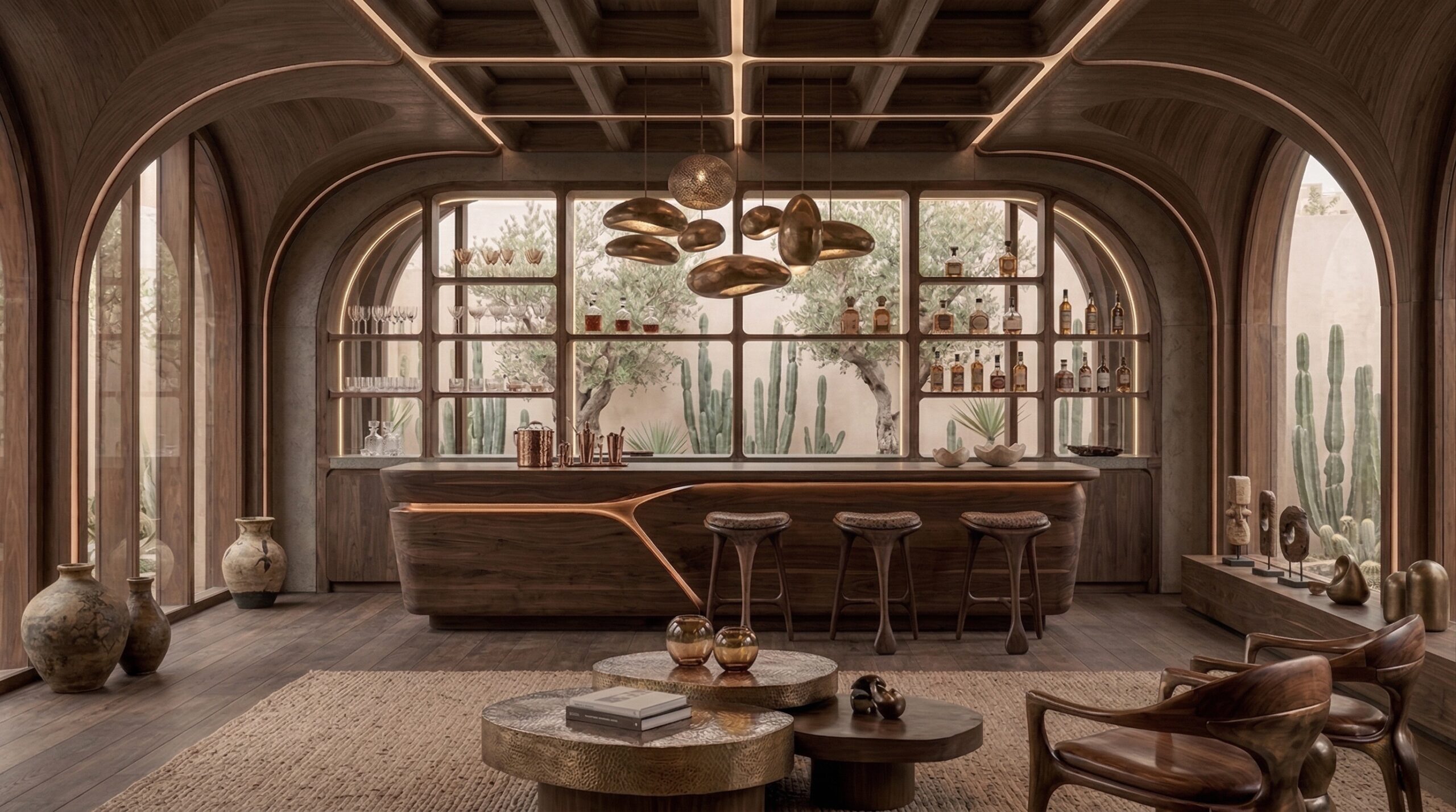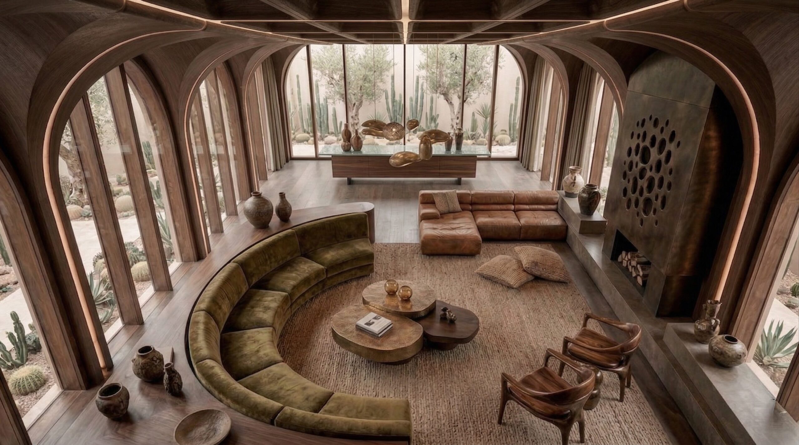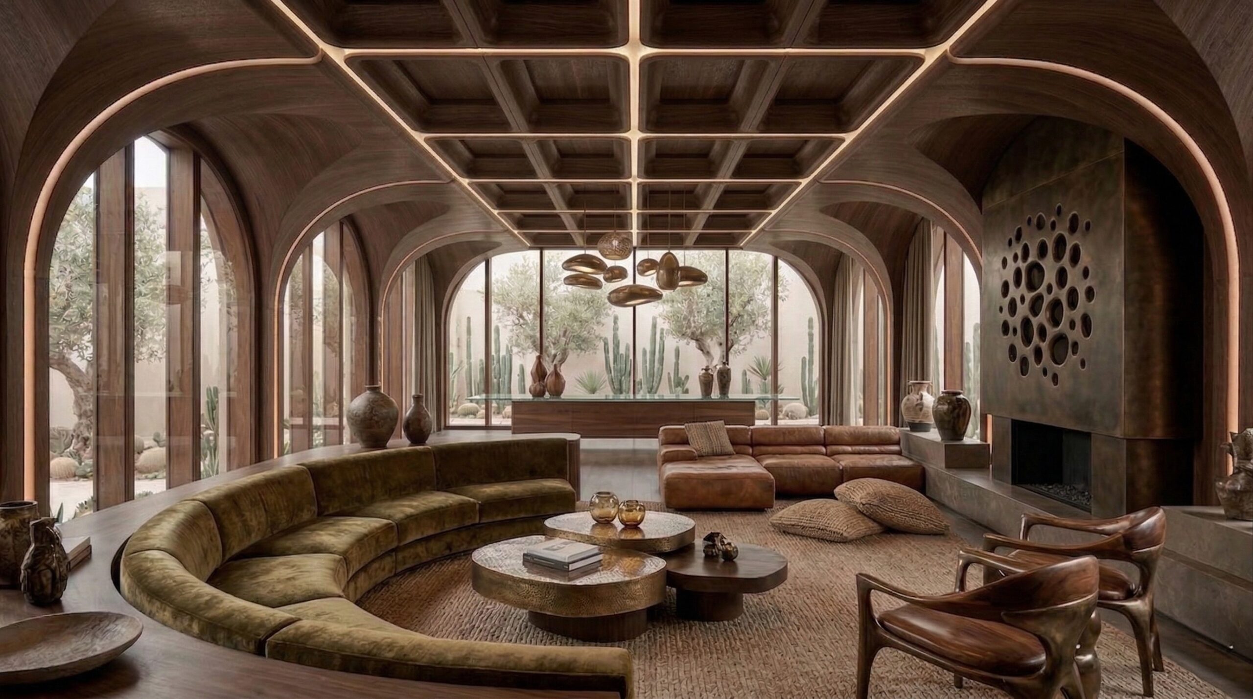 Ahşap tonlarının hâkim olduğu iç mekânda, kavisli ve yere yakın oturma elemanları, dairesel yerleşimli lounge alanları ve özel tasarım masif mobilyalar mekâna heykelsi ve davetkâr bir karakter kazandırır. Doğal taş zeminler, dokulu duvar yüzeyleri ve el işçiliğini hissettiren detaylar sıcak ve rafine bir atmosfer oluştururken; merkezi oturma çukuru ve açık plan yaşam alanları sosyal etkileşimi güçlendirir.