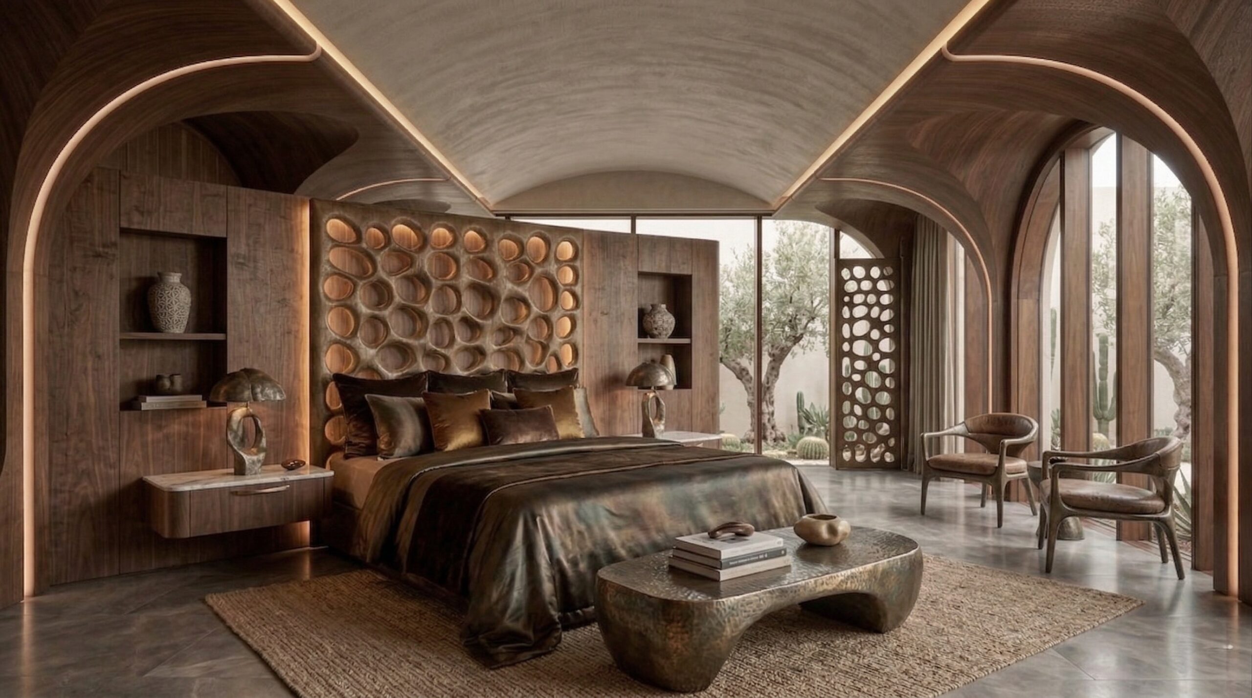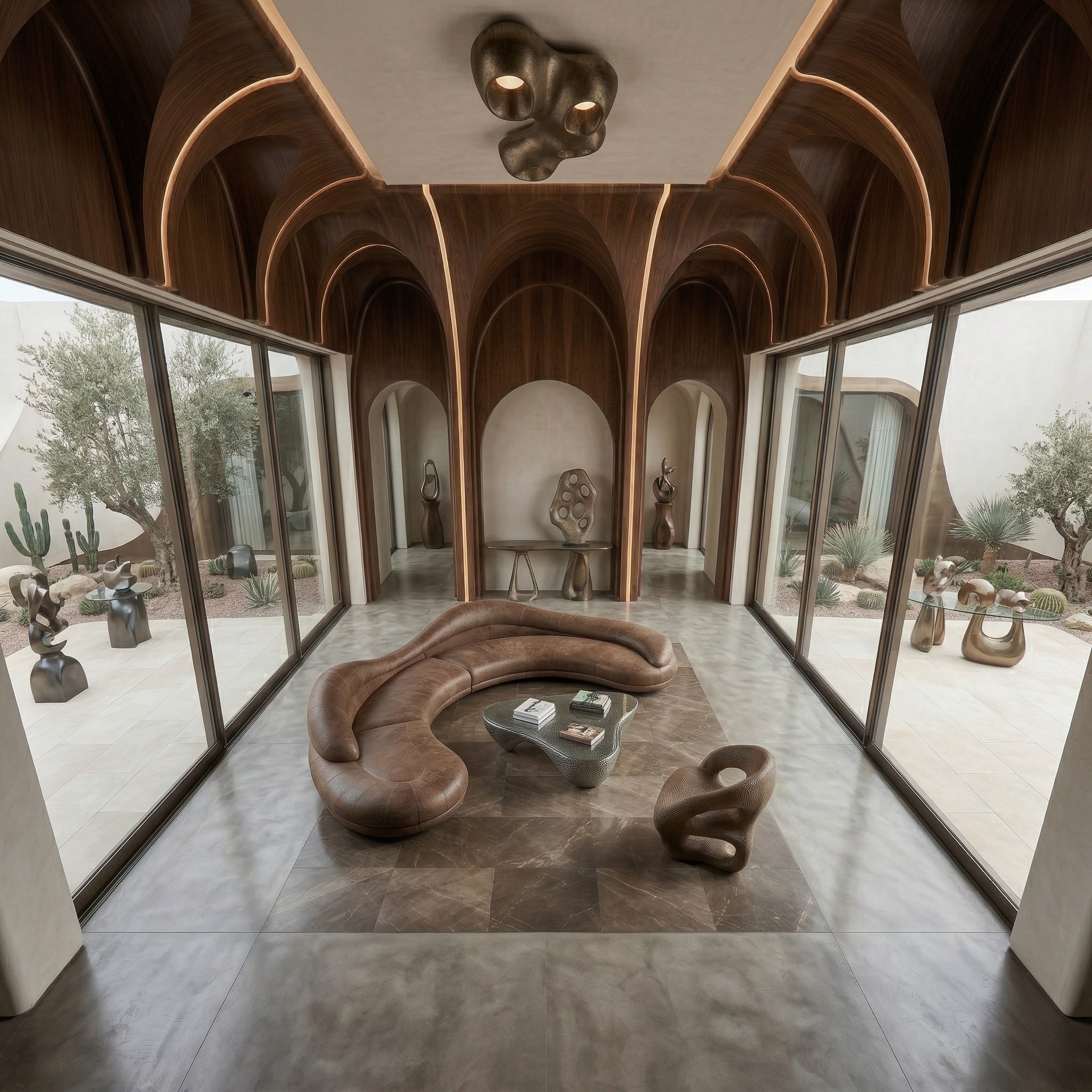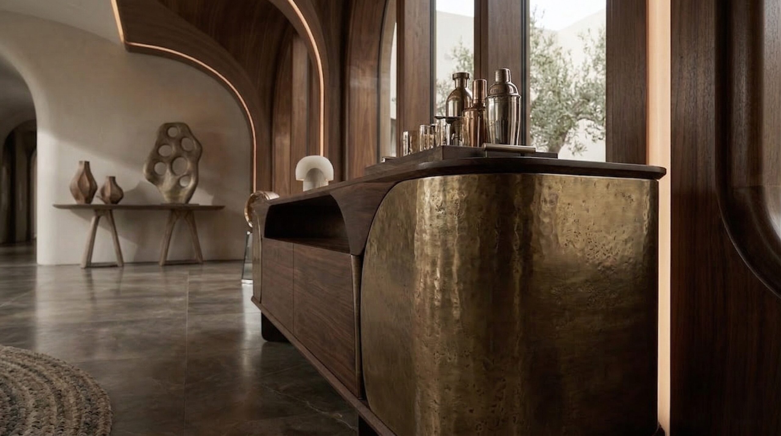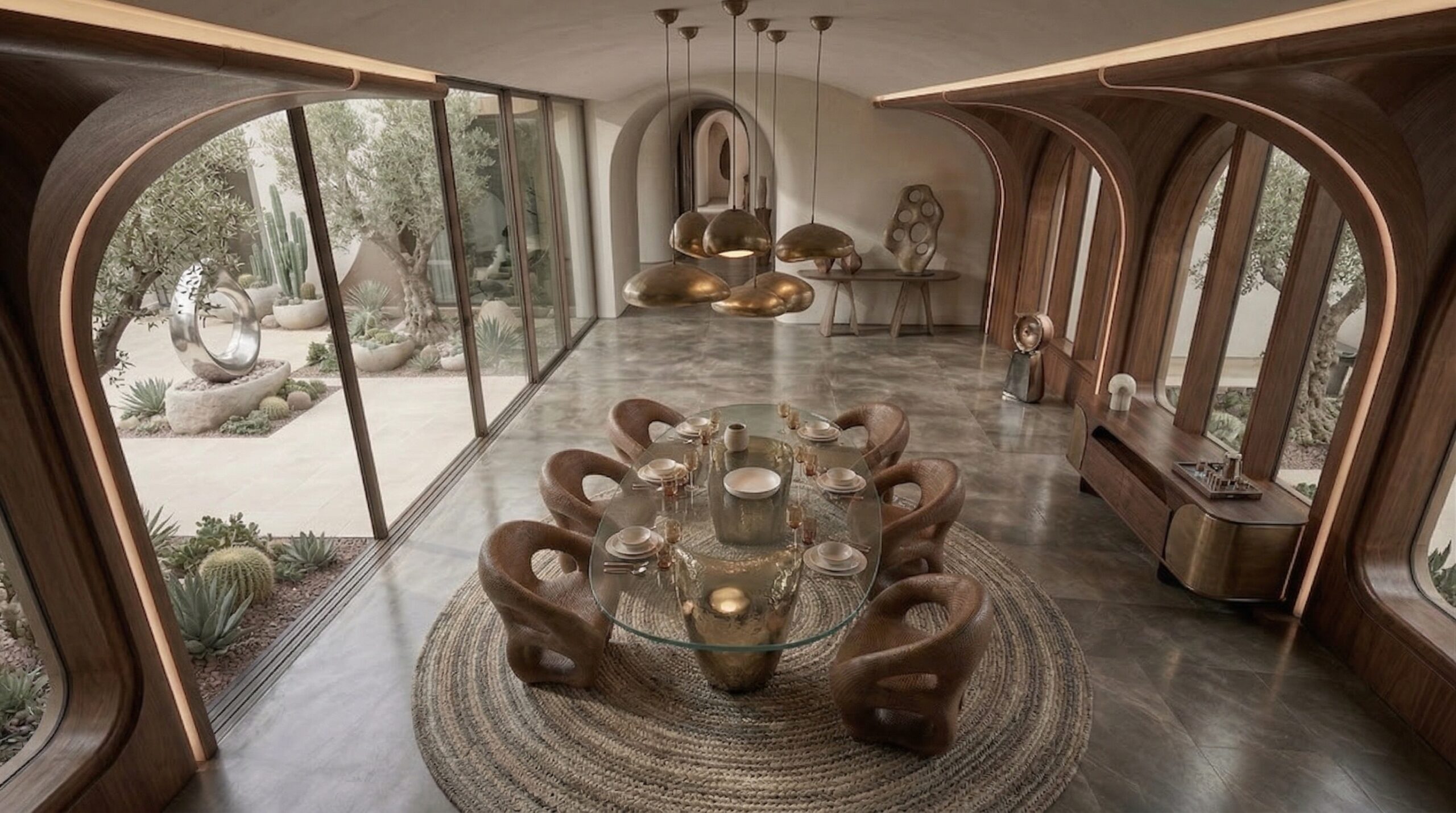 Ahşap tonlarının hâkim olduğu iç mekânda, kavisli ve yere yakın oturma elemanları, dairesel yerleşimli lounge alanları ve özel tasarım masif mobilyalar mekâna heykelsi ve davetkâr bir karakter kazandırır. Doğal taş zeminler, dokulu duvar yüzeyleri ve el işçiliğini hissettiren detaylar sıcak ve rafine bir atmosfer oluştururken; merkezi oturma çukuru ve açık plan yaşam alanları sosyal etkileşimi güçlendirir.