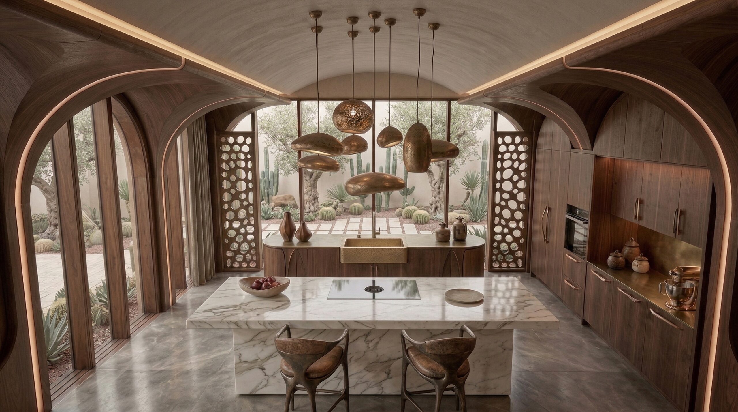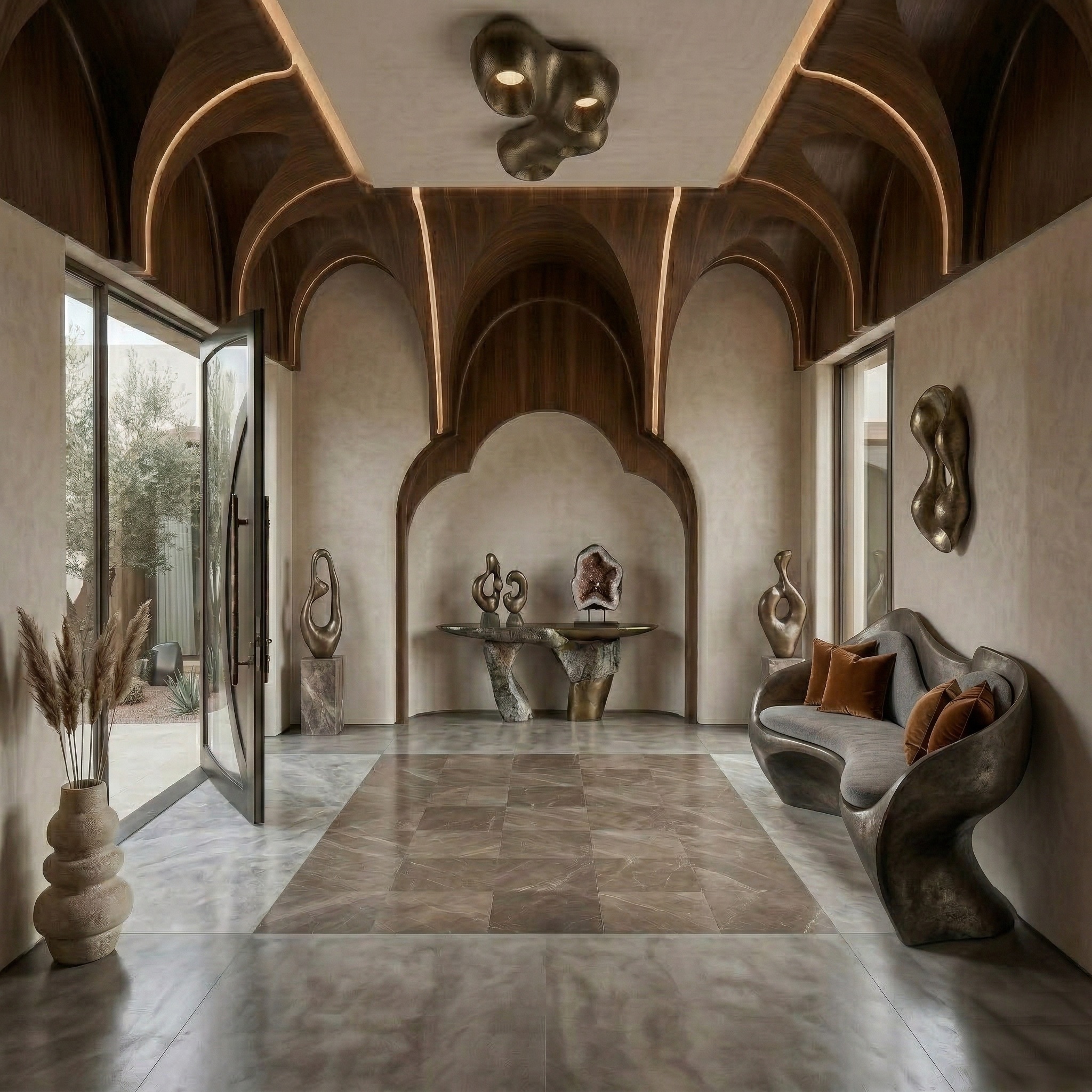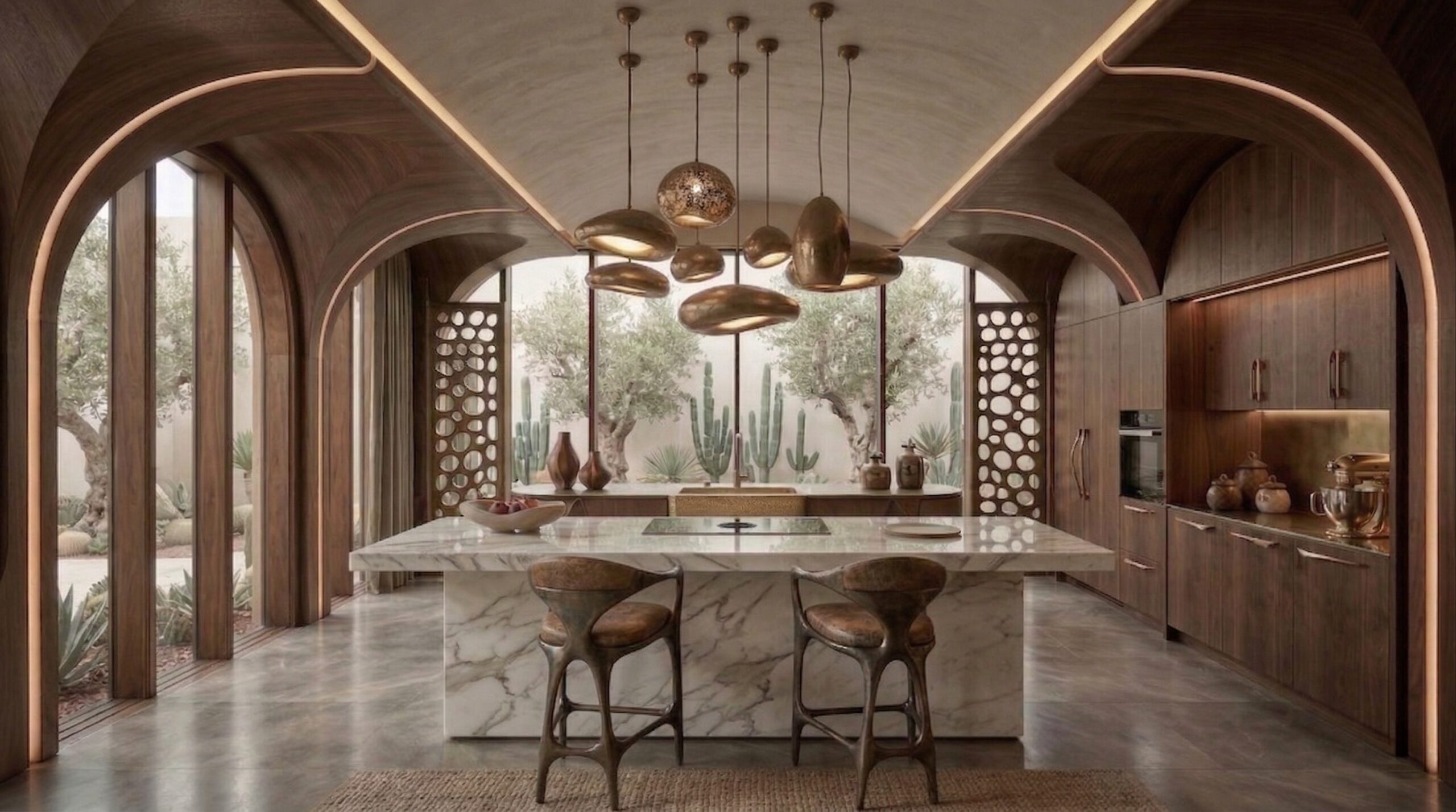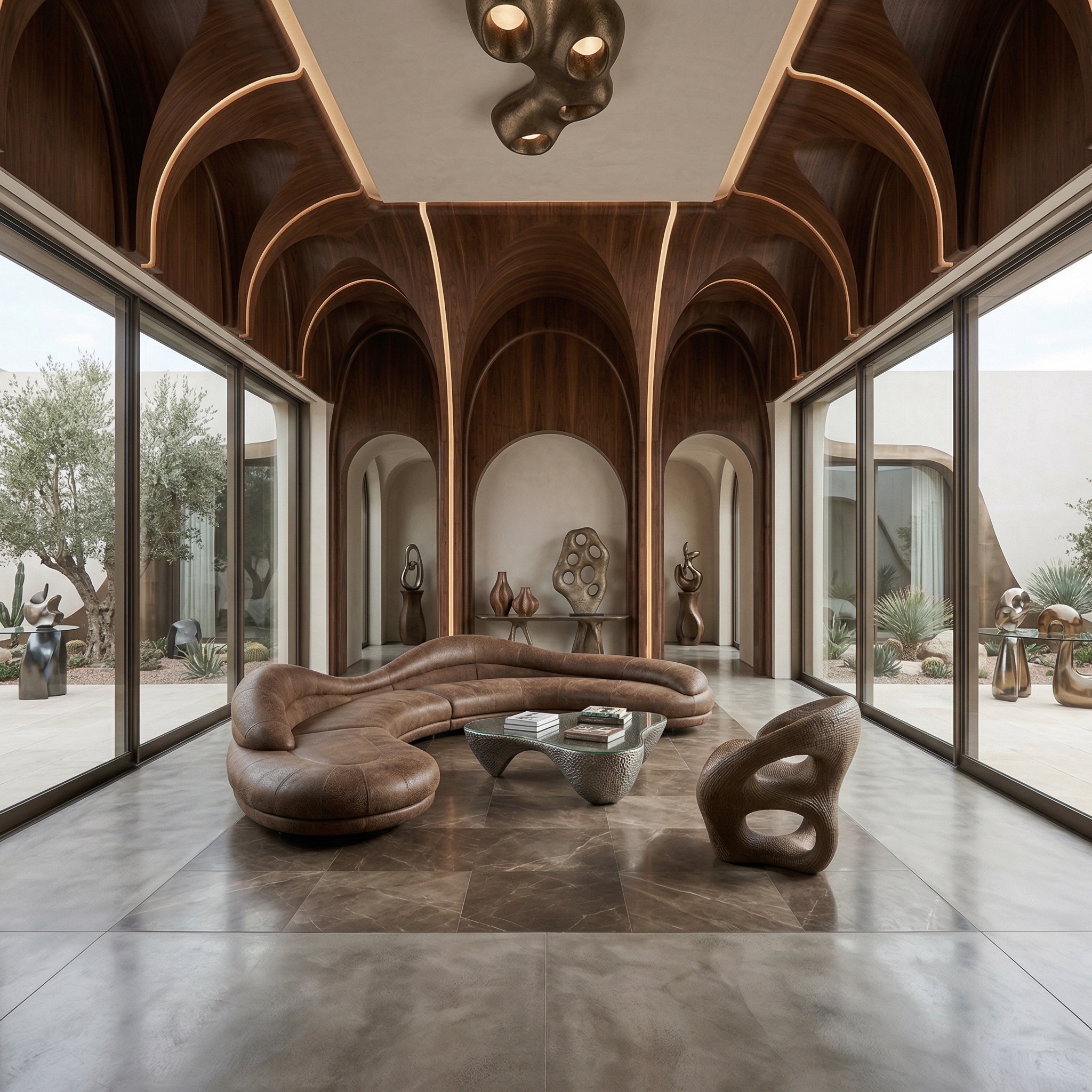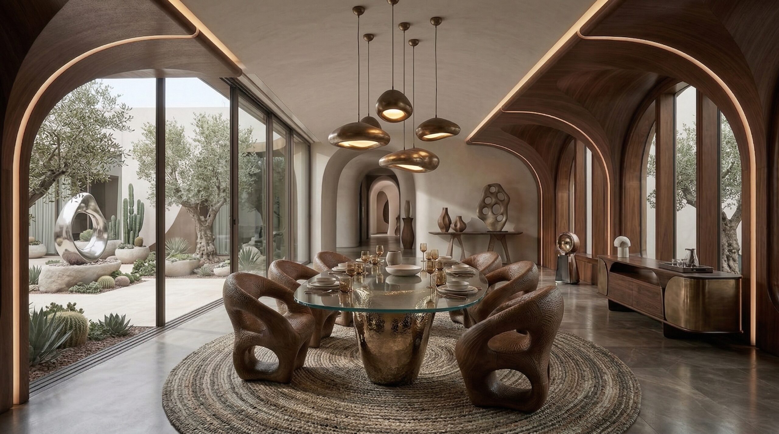 Ahşap tonlarının hâkim olduğu iç mekânda, kavisli ve yere yakın oturma elemanları, dairesel yerleşimli lounge alanları ve özel tasarım masif mobilyalar mekâna heykelsi ve davetkâr bir karakter kazandırır. Doğal taş zeminler, dokulu duvar yüzeyleri ve el işçiliğini hissettiren detaylar sıcak ve rafine bir atmosfer oluştururken; merkezi oturma çukuru ve açık plan yaşam alanları sosyal etkileşimi güçlendirir.