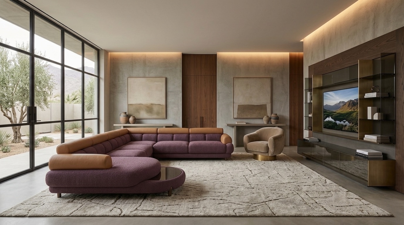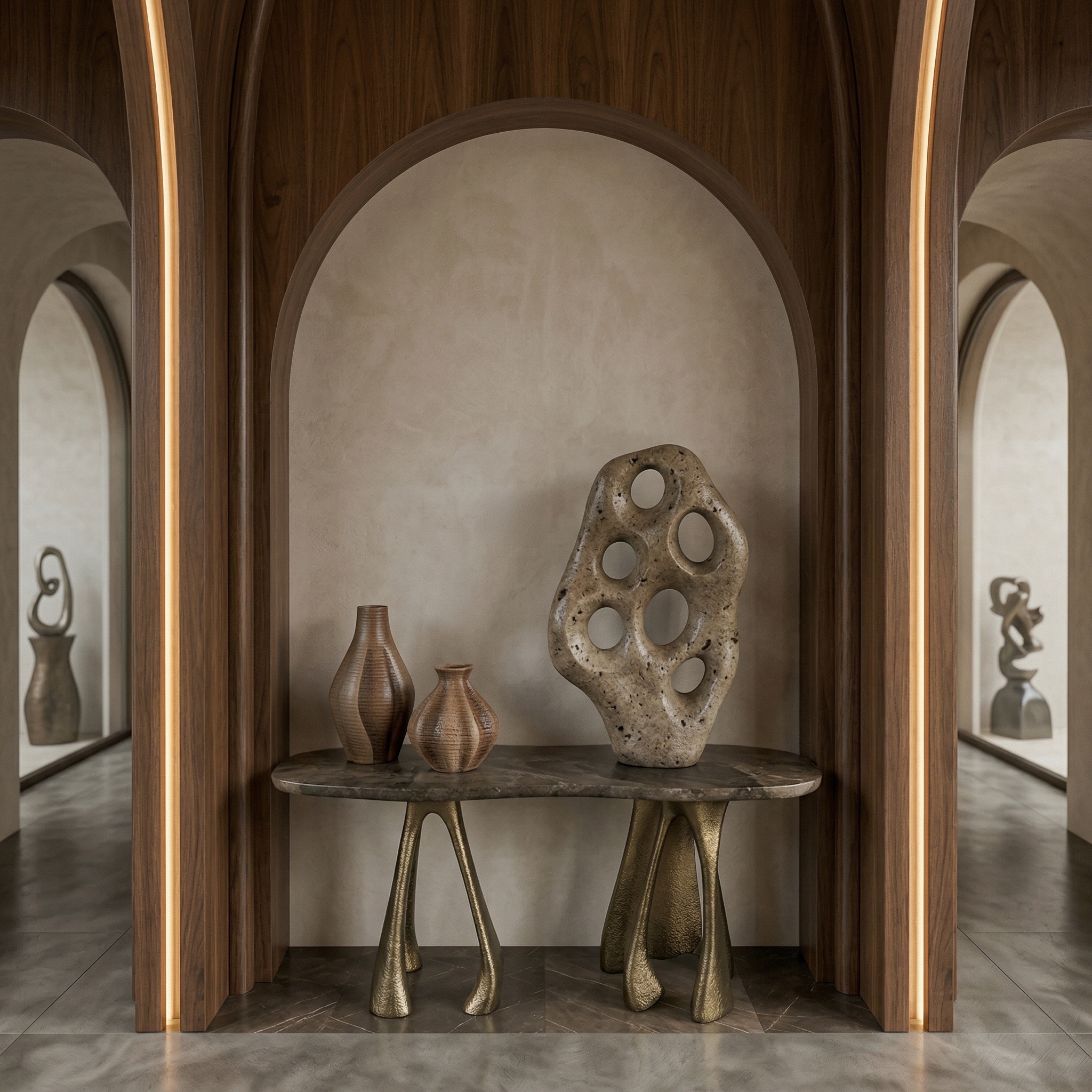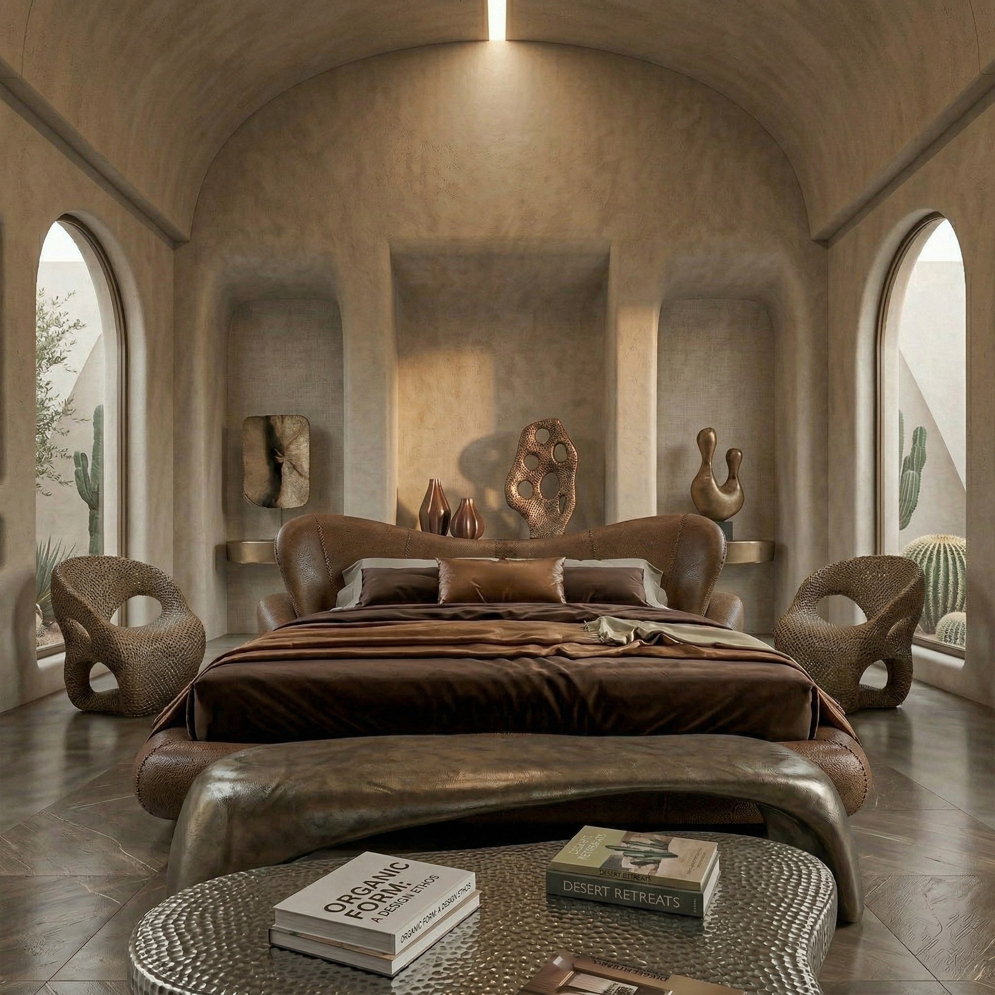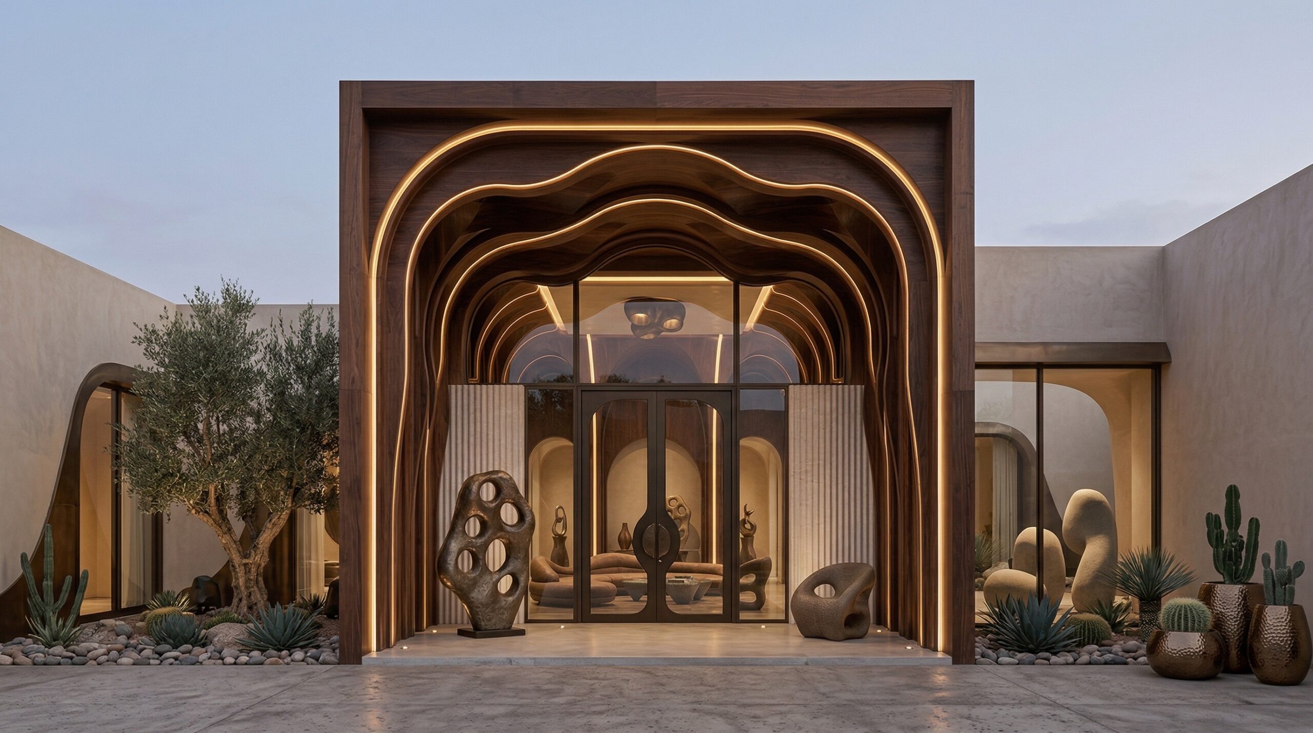Ahşap tonlarının hâkim olduğu iç mekânda, kavisli ve yere yakın oturma elemanları, dairesel yerleşimli lounge alanları ve özel tasarım masif mobilyalar mekâna heykelsi ve davetkâr bir karakter kazandırır. Doğal taş zeminler, dokulu duvar yüzeyleri ve el işçiliğini hissettiren detaylar sıcak ve rafine bir atmosfer oluştururken; merkezi oturma çukuru ve açık plan yaşam alanları sosyal etkileşimi güçlendirir.