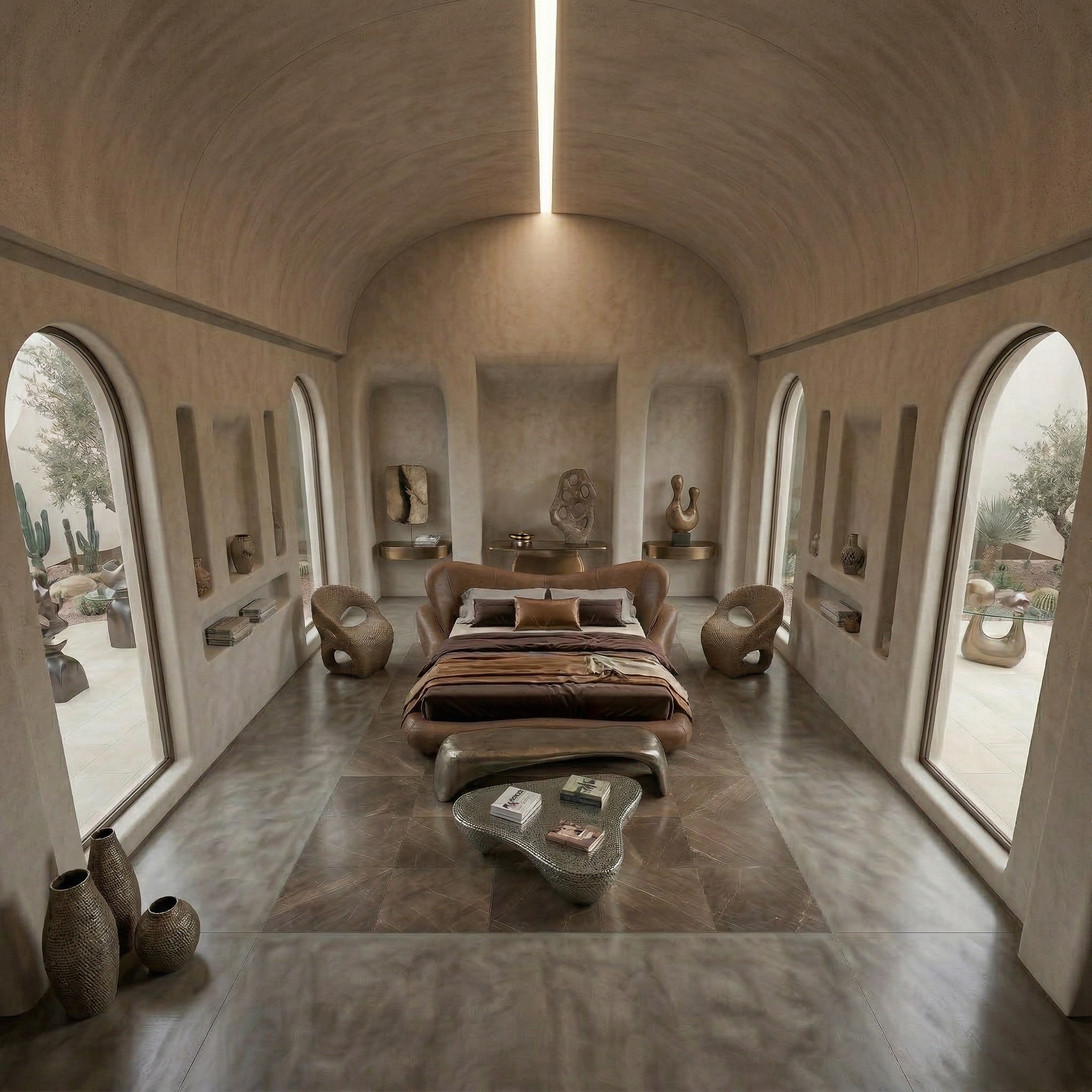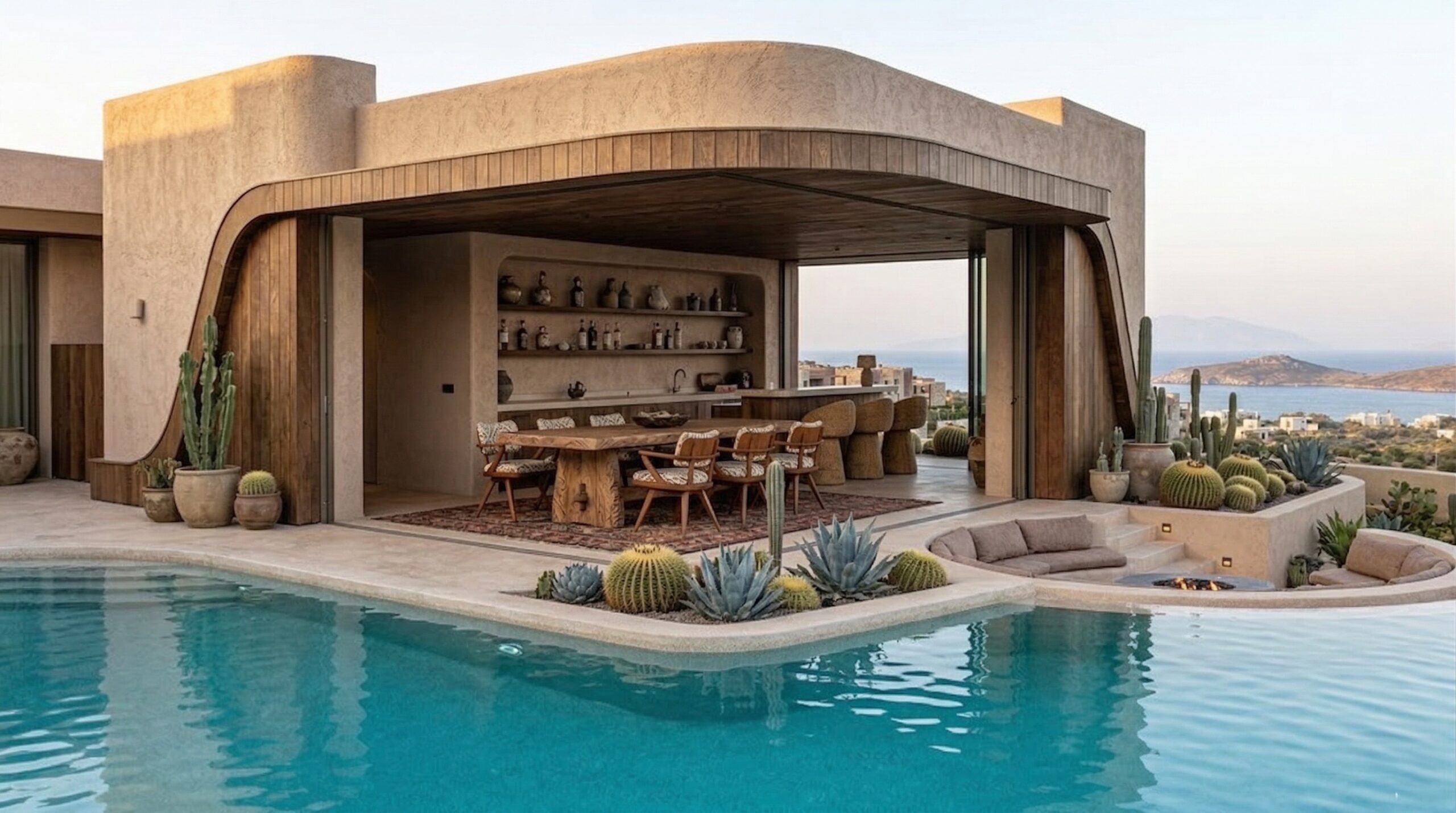 Ege kıyılarına hâkim panoramik deniz manzarası, bu villanın mimari kurgusunun merkezinde yer alırken; kemerli açıklıklar ve organik geçişler mekânlar arasında akıcı bir bütünlük oluşturur. İç ve dış mekân arasındaki sınırlar geniş açıklıklar ve teras bağlantıları ile silinerek, gün ışığı ve doğal hava akışı yaşam deneyiminin temel bileşenine dönüşür.