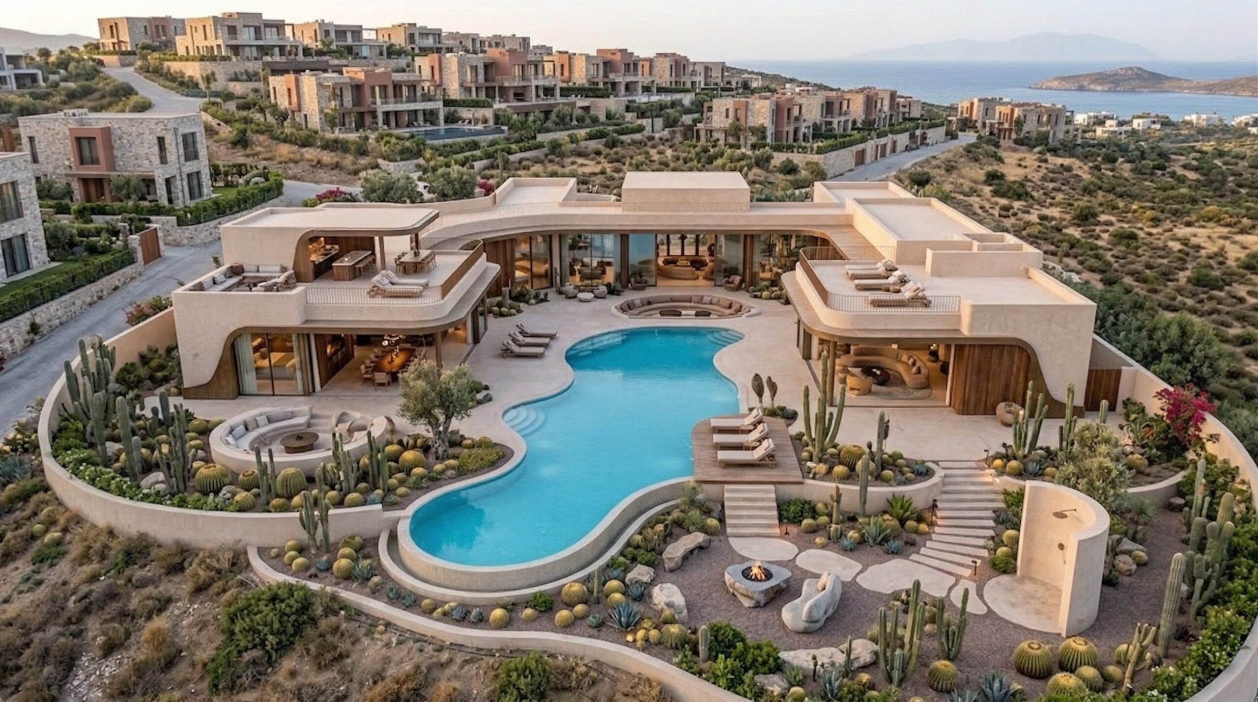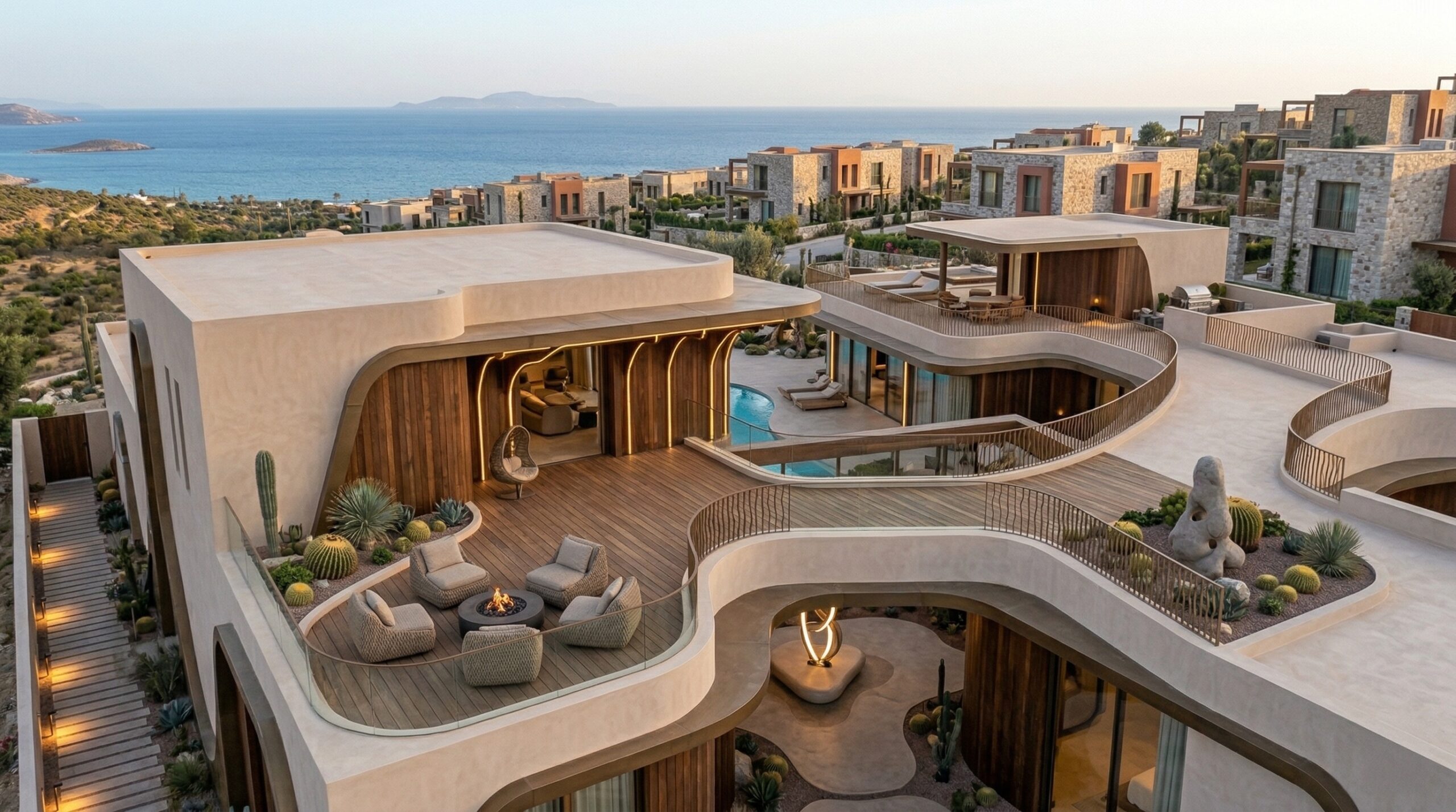 Yapı, Bodrum’un topografyası ve manzarasıyla bütünleşen, Akdeniz yaşam kültürünü çağdaş ve zamansız bir mimari dil ile yeniden yorumlayan güçlü bir konut deneyimi sunar.