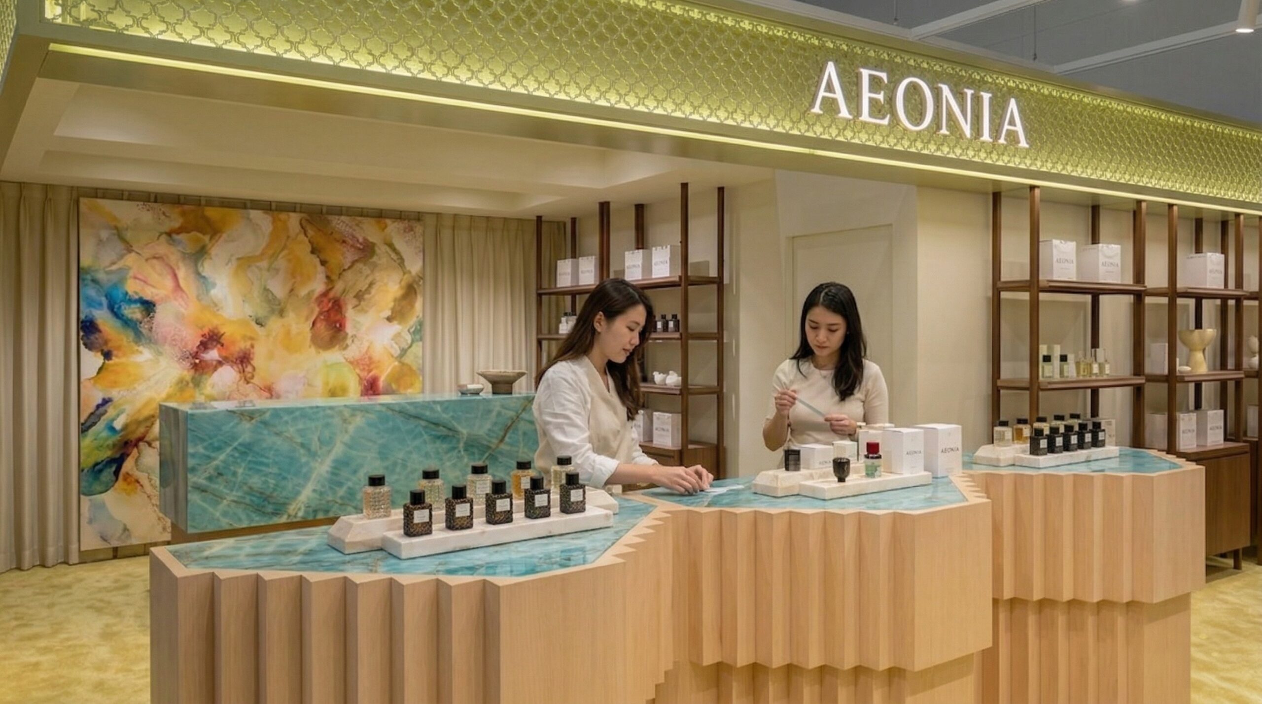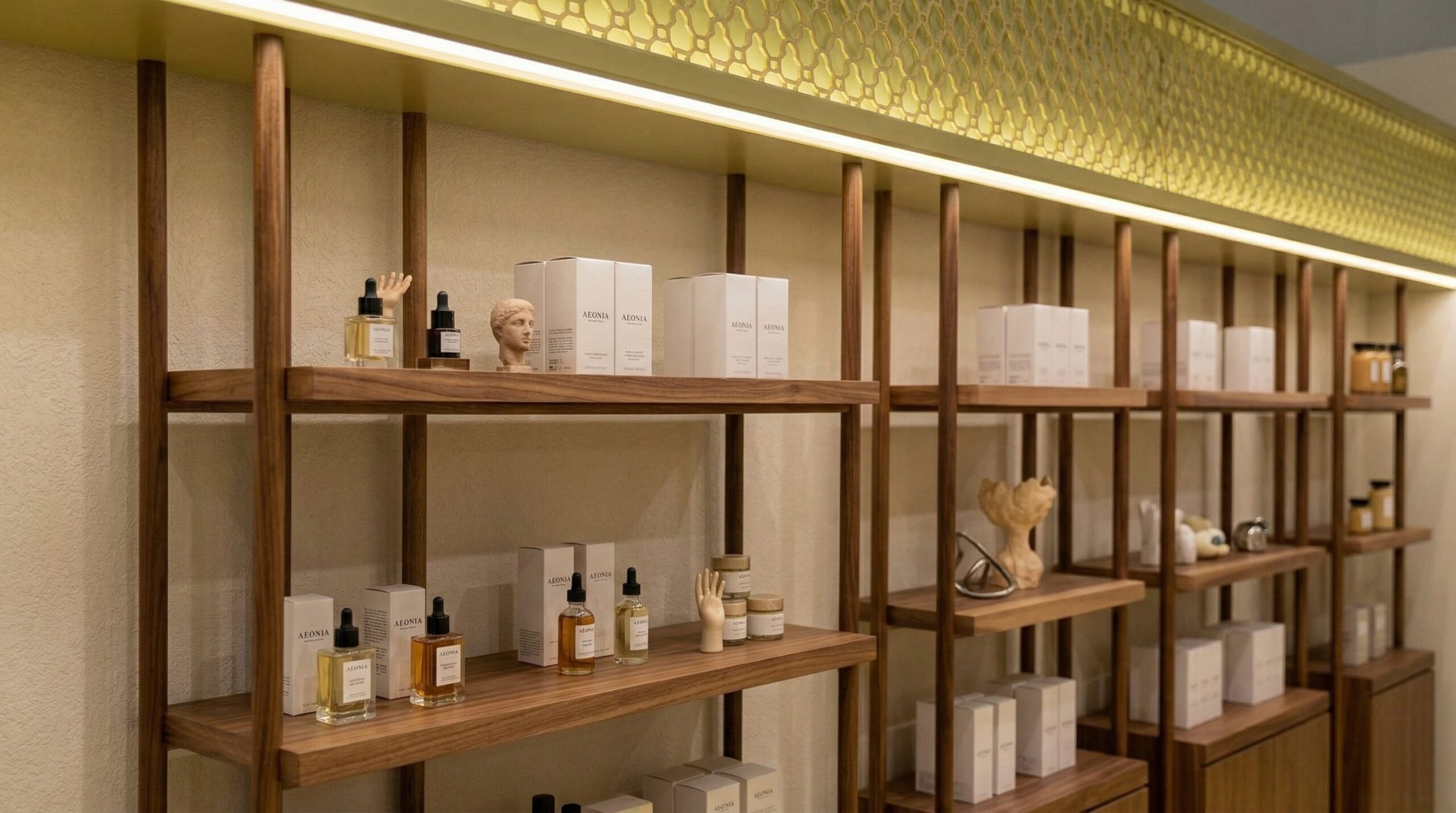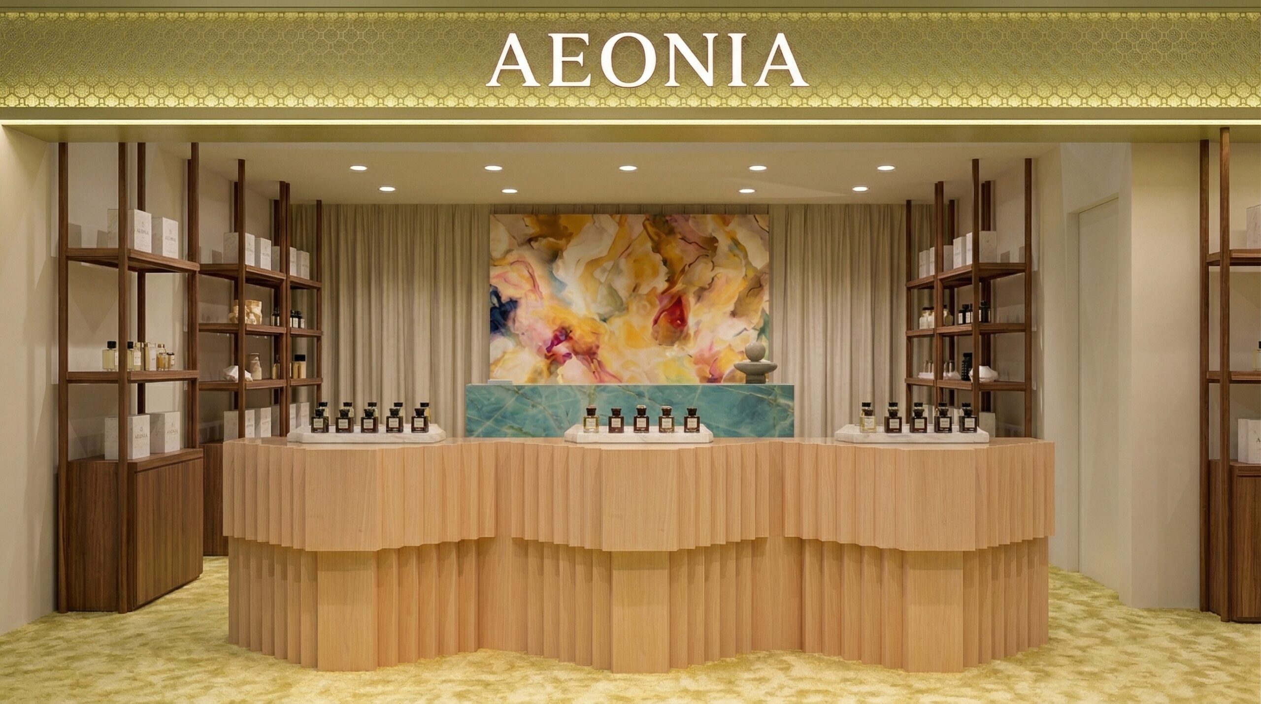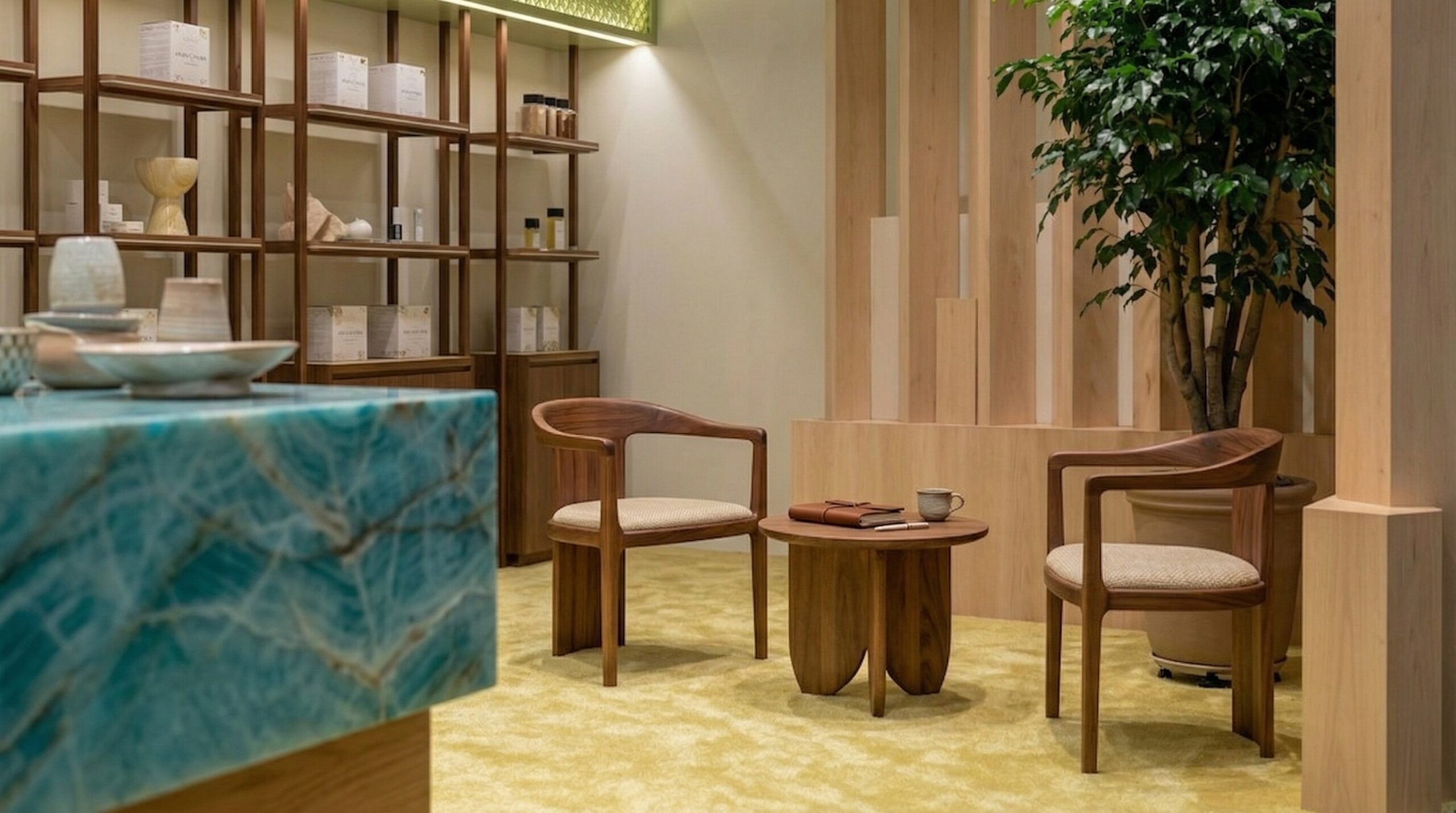 Arka duvar boyunca uzanan açık raf sistemleri, ürünleri düzenli ve erişilebilir bir şekilde sergilerken; ortadaki taş yüzeyli sergileme adası mekâna güçlü bir karakter kazandırır. Sıcak aydınlatma ve dengeli renk paleti, mekânda sakin ve premium bir atmosfer yaratır. Tasarım yaklaşımı, doğallık ve zarafeti çağdaş perakende deneyimi ile birleştirir.