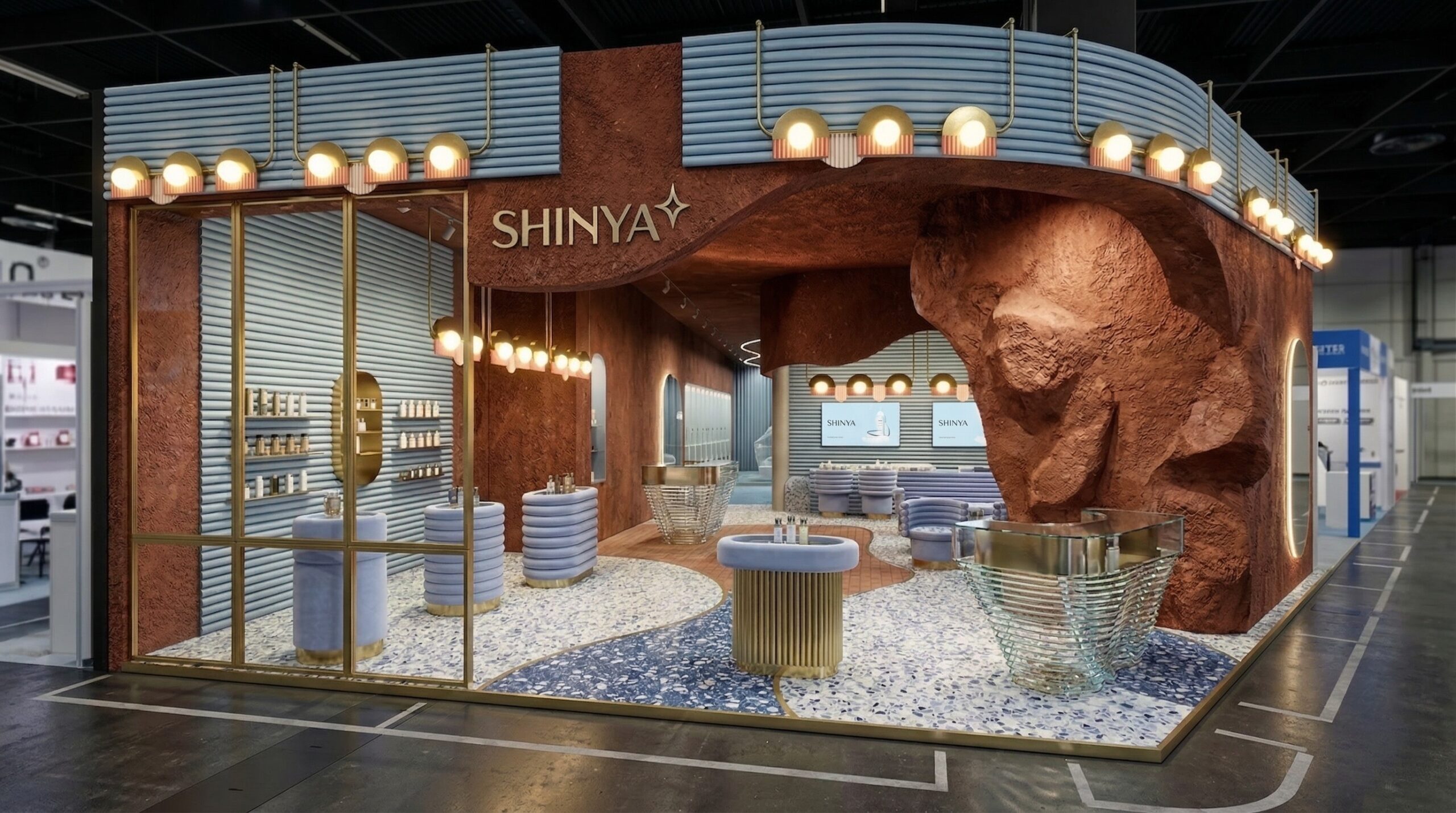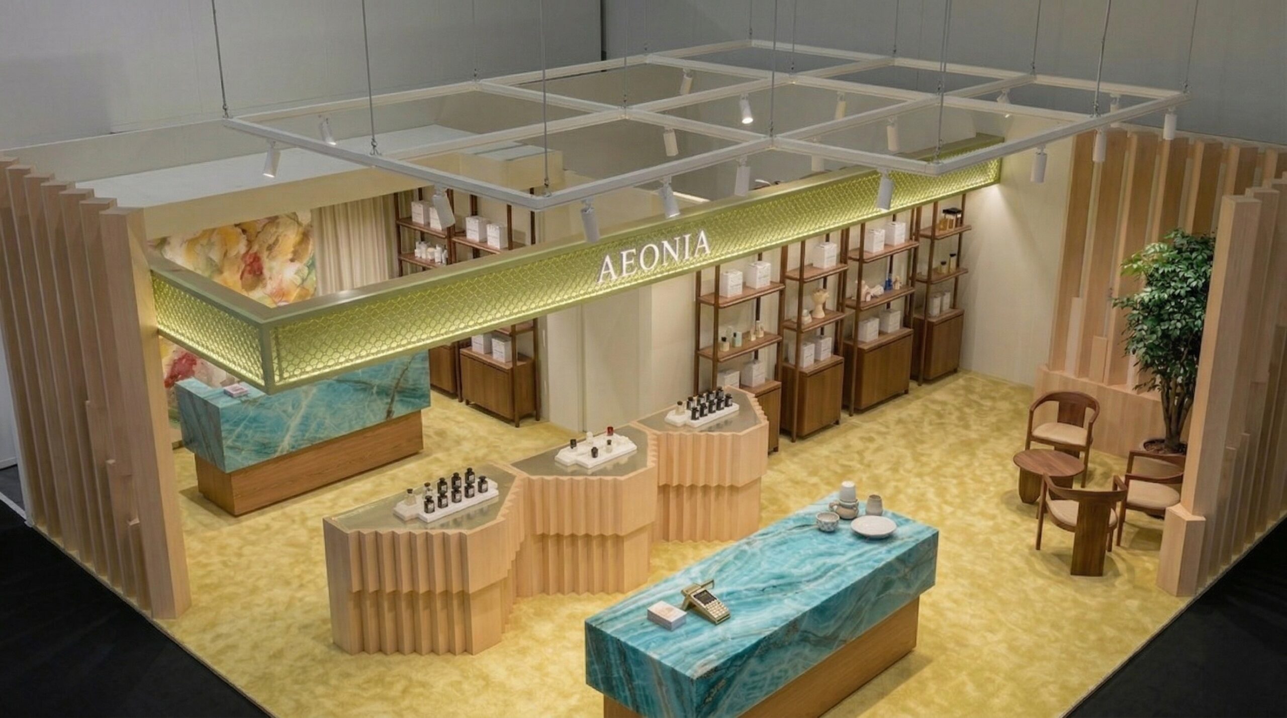 Doğal ahşap dokular ve rafine taş yüzeylerin dengeli birlikteliği ile kurgulanan bu fuar standı, lüks kozmetik markaları için sade ama etkileyici bir sahne sunar. Mekânın ön cephesinde yer alan yumuşak form geçişlerine sahip banko, kullanıcıyı içeri davet eden bir odak noktası oluşturur.