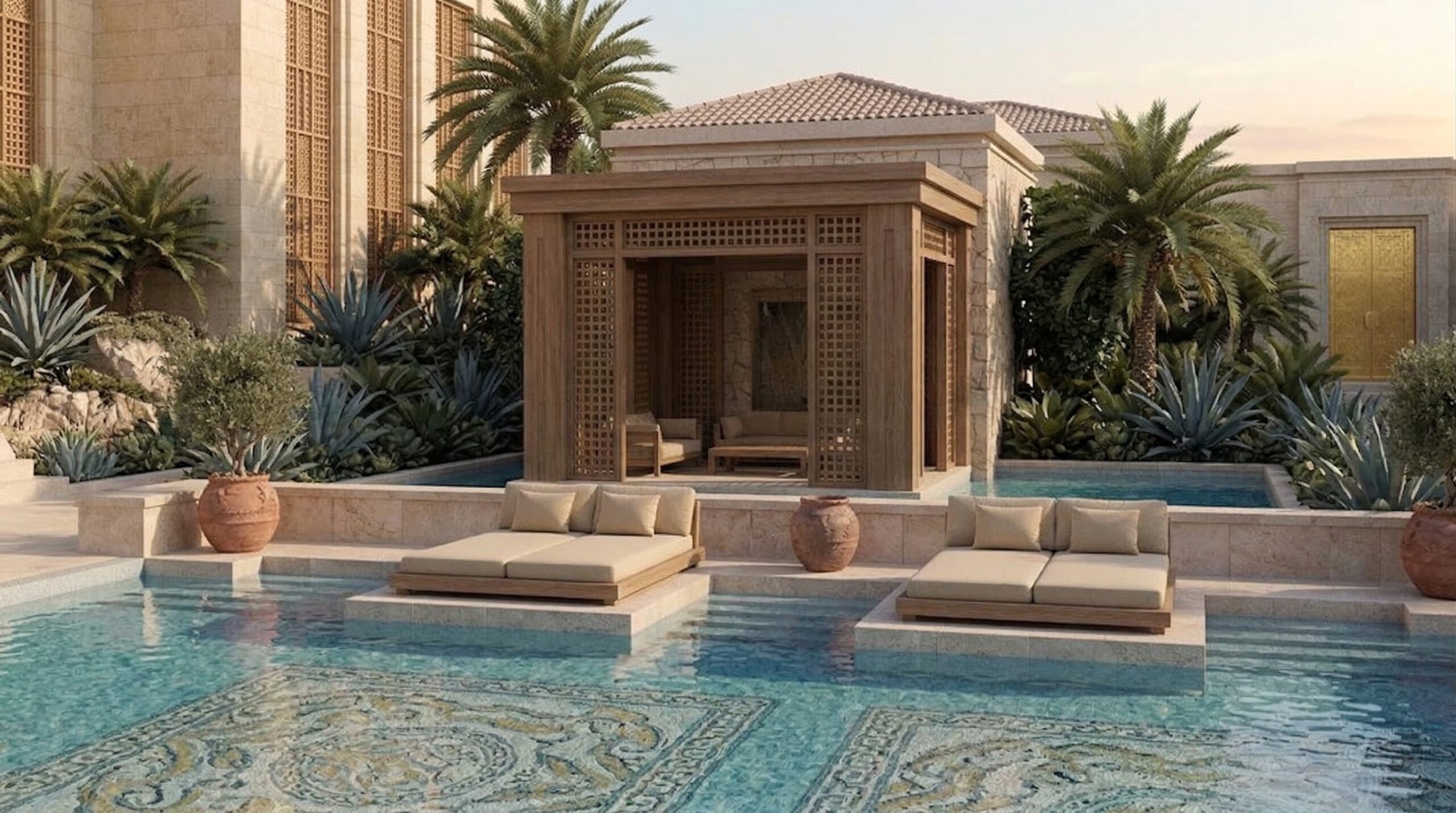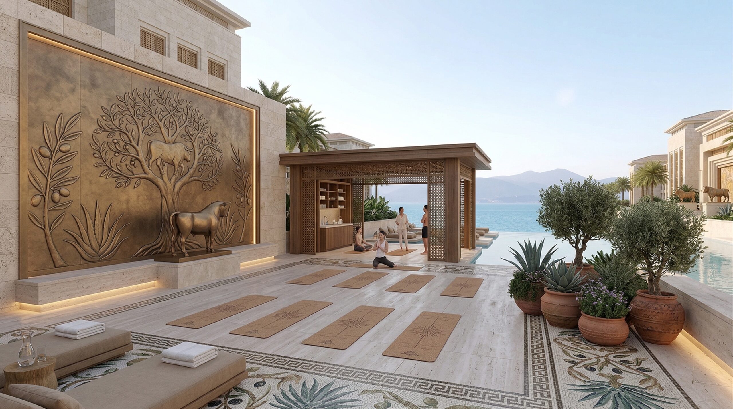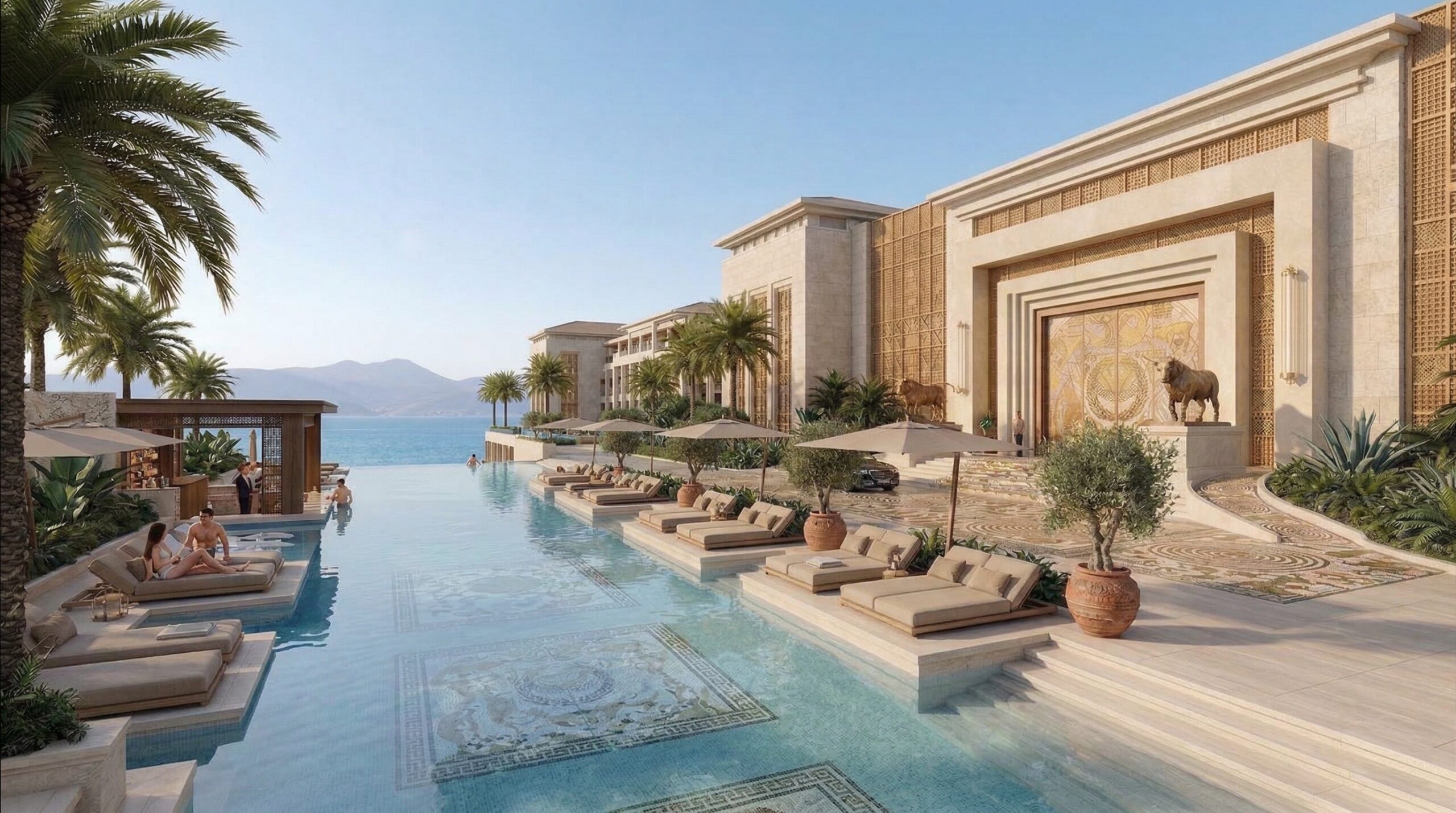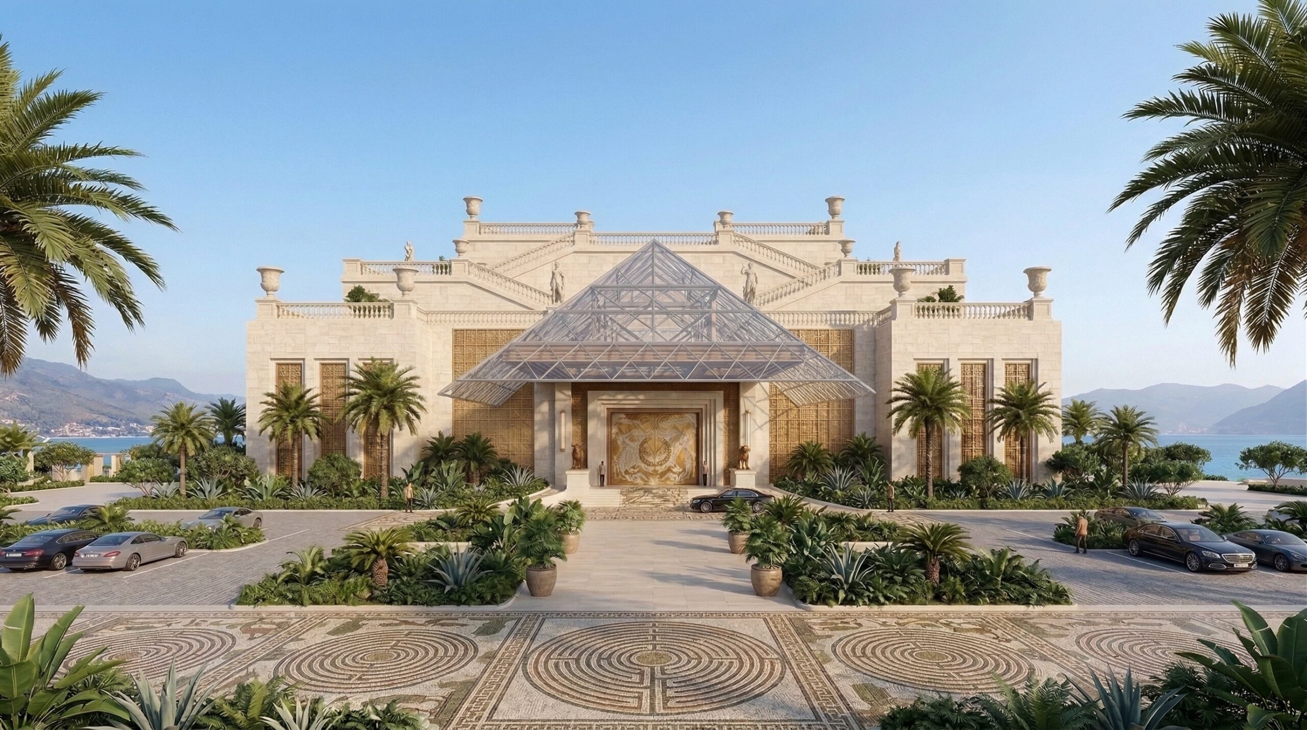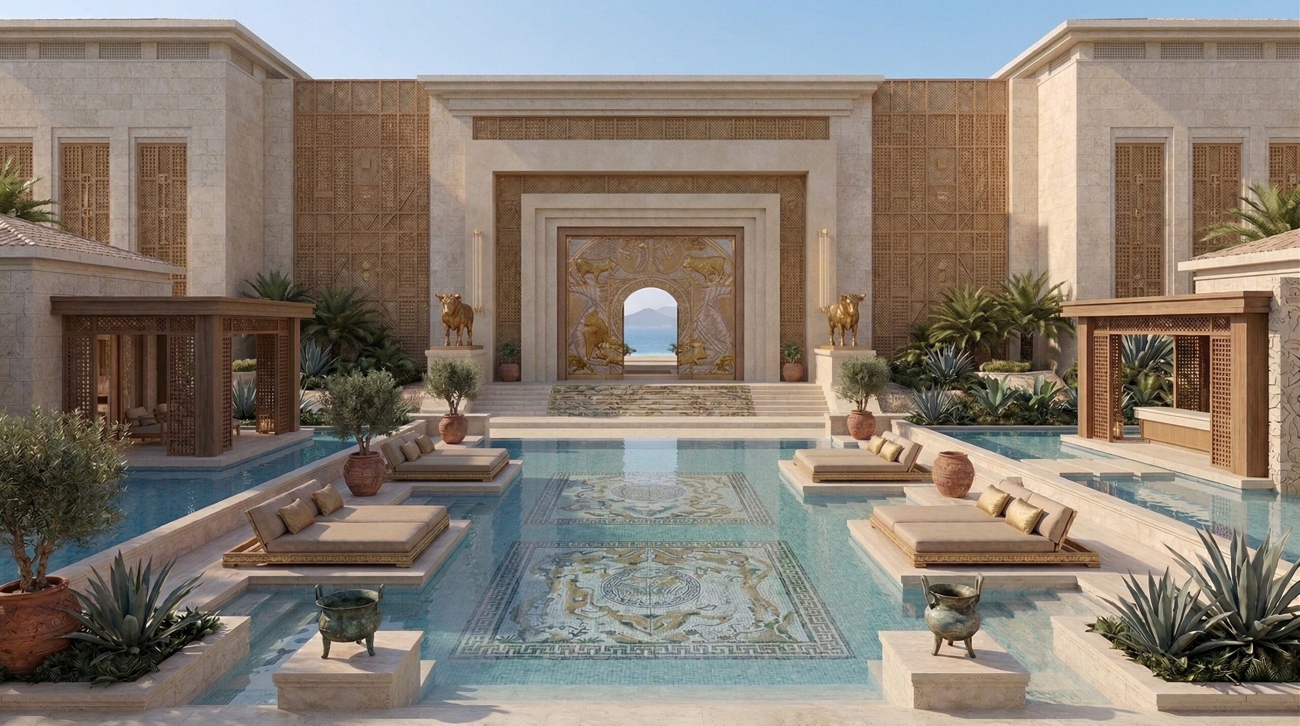 Klasik Akdeniz mimarisinin anıtsal dili ile çağdaş lüks anlayışını birleştiren bu otel tasarımı, su öğeleri ve simetrik kurgular üzerinden güçlü bir mekânsal deneyim sunar. Geniş avlu etrafında konumlanan yapı kütleleri, merkezi havuz ve yansıma yüzeyleri ile birlikte hem görsel süreklilik hem de serinletici bir mikroklima oluşturur.