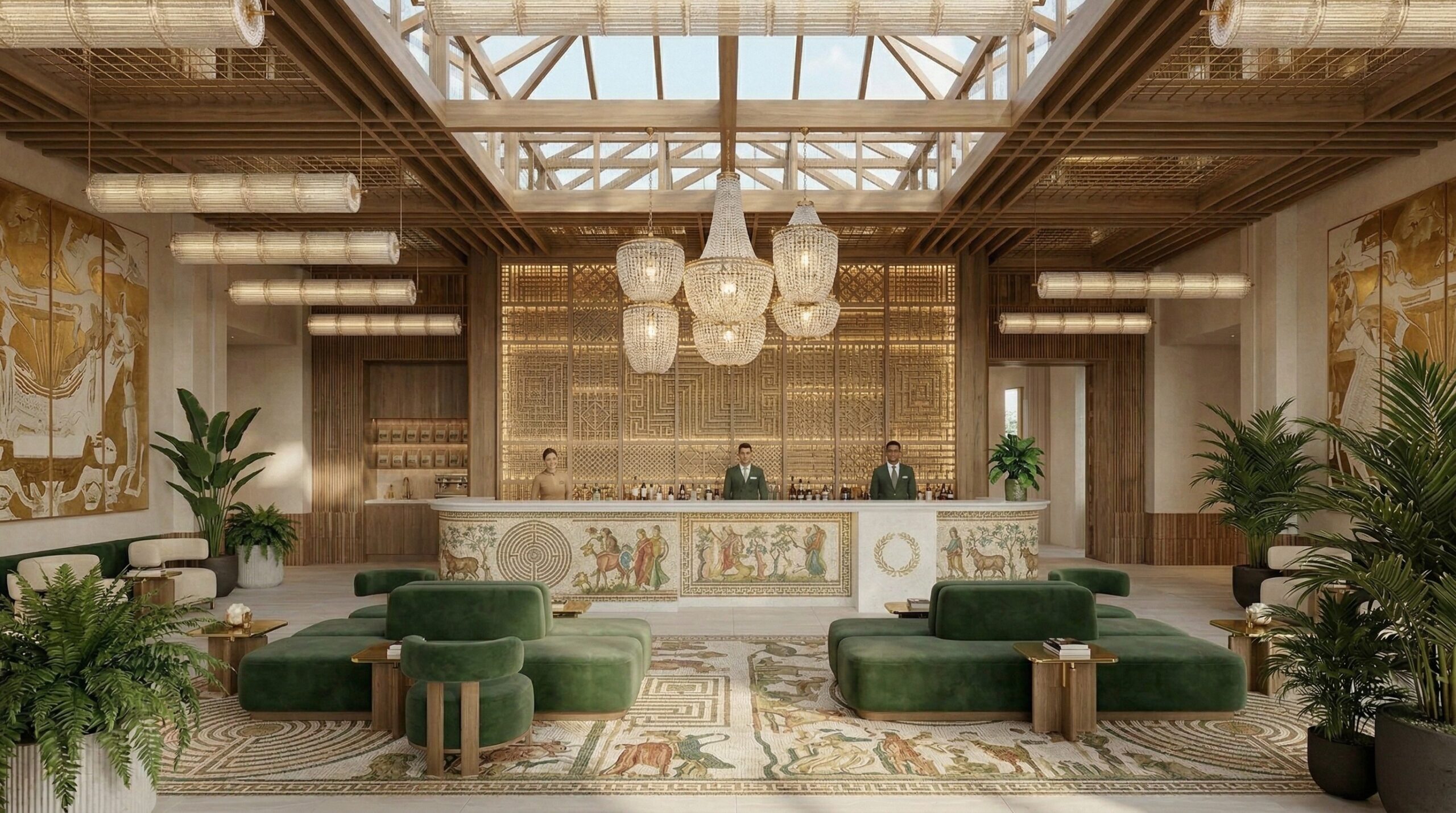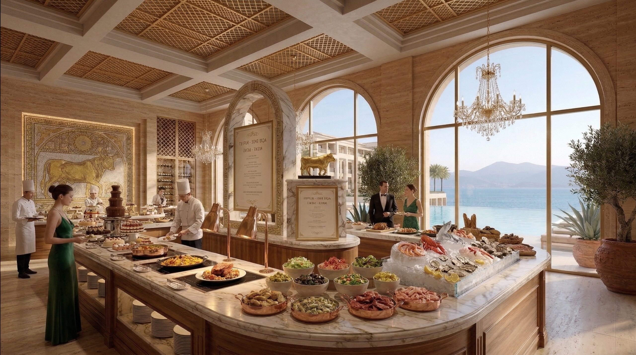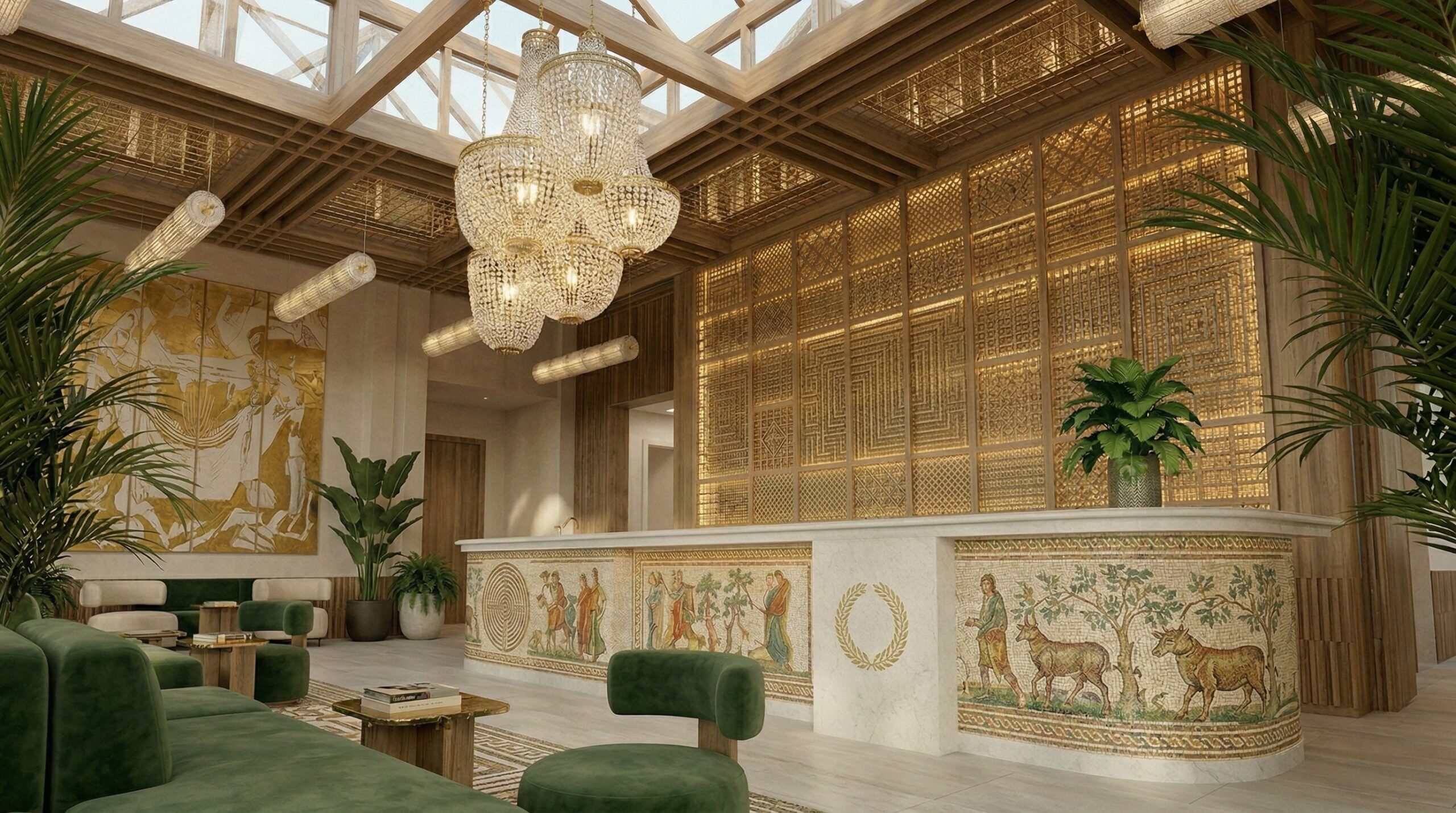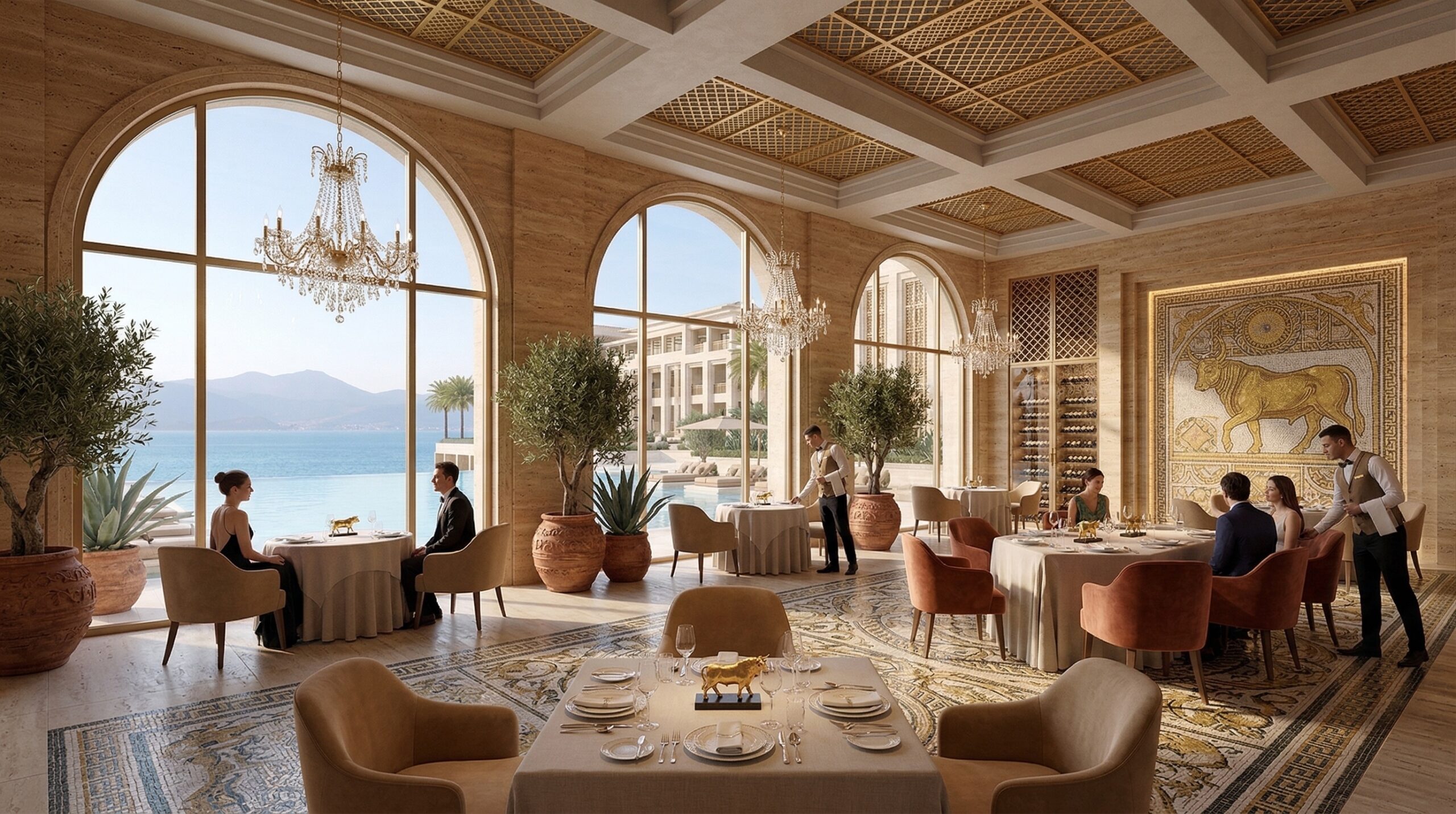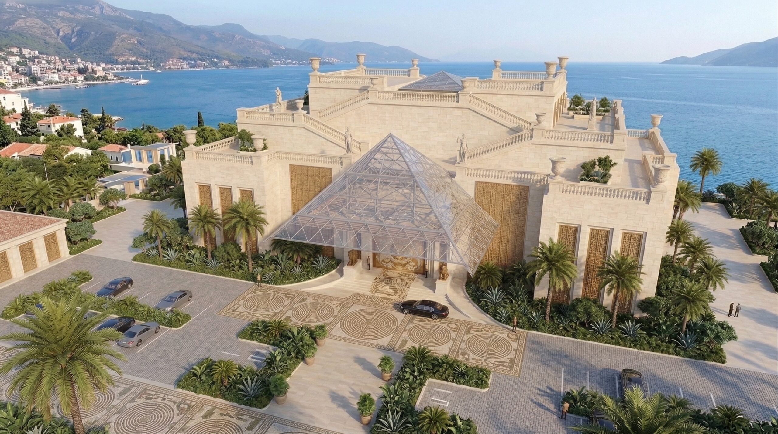 Klasik Akdeniz mimarisinin anıtsal dili ile çağdaş lüks anlayışını birleştiren bu otel tasarımı, su öğeleri ve simetrik kurgular üzerinden güçlü bir mekânsal deneyim sunar. Geniş avlu etrafında konumlanan yapı kütleleri, merkezi havuz ve yansıma yüzeyleri ile birlikte hem görsel süreklilik hem de serinletici bir mikroklima oluşturur.