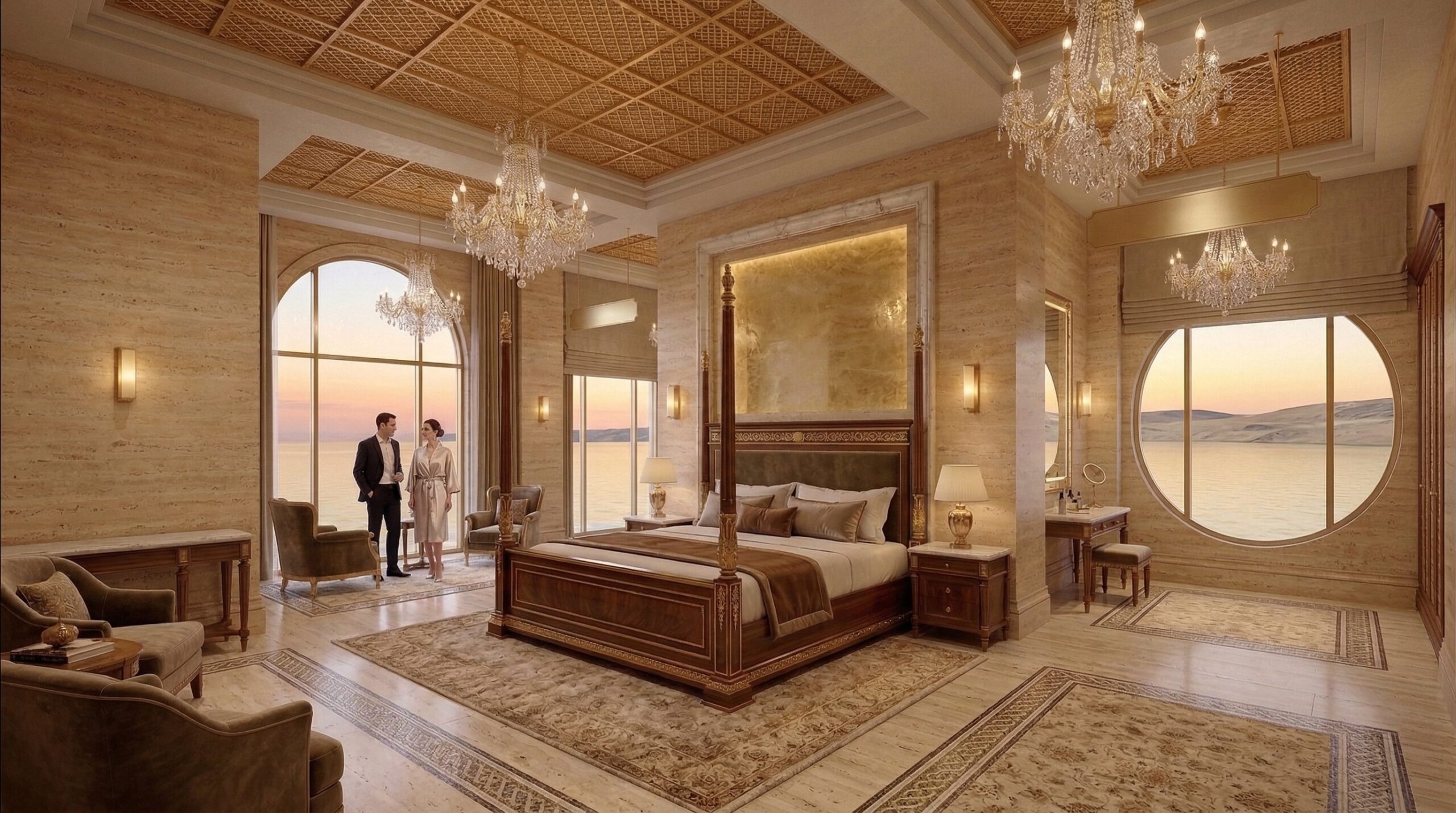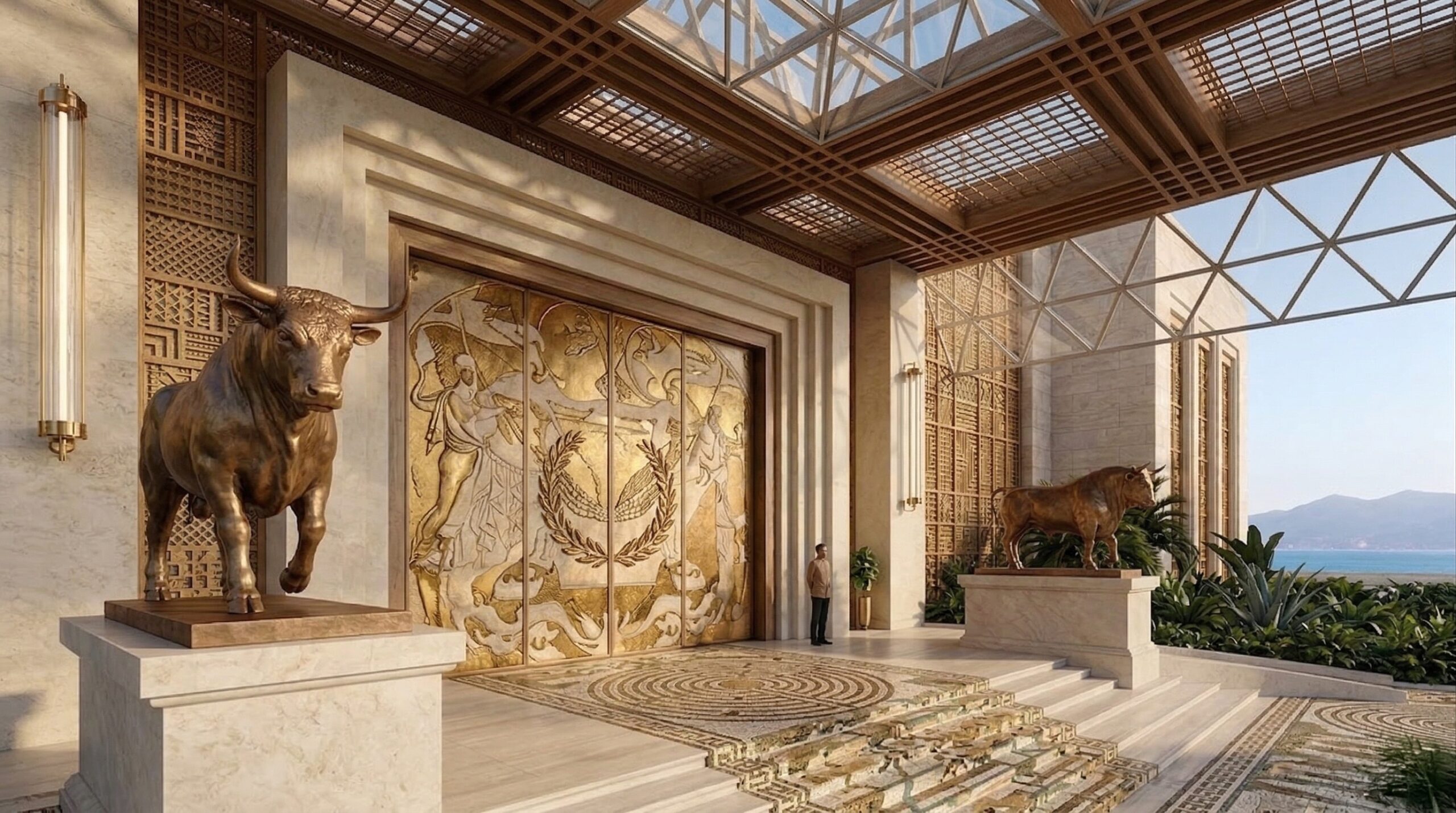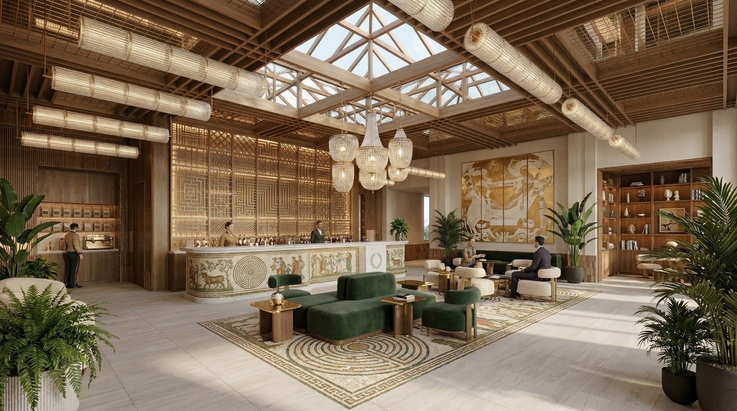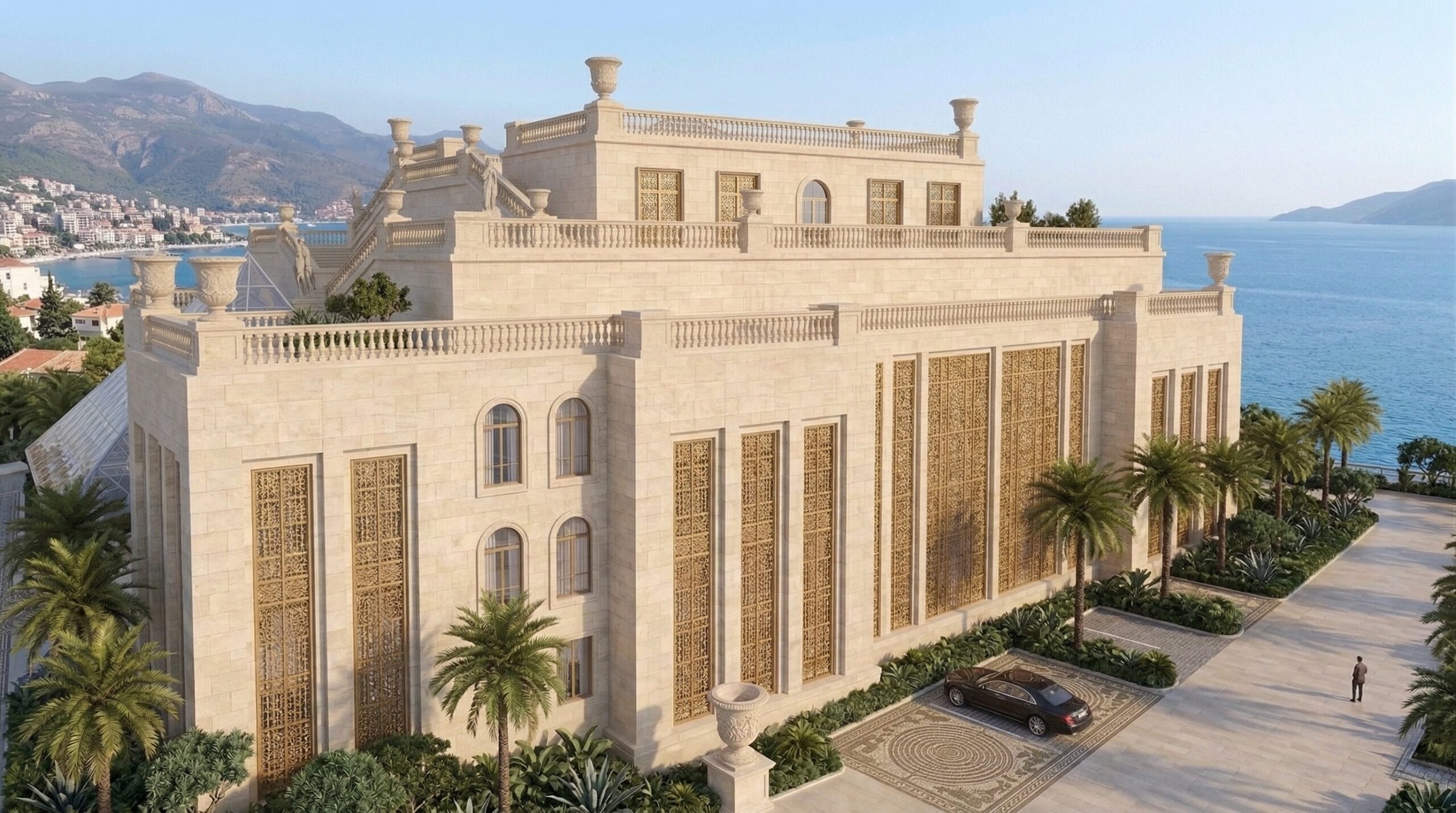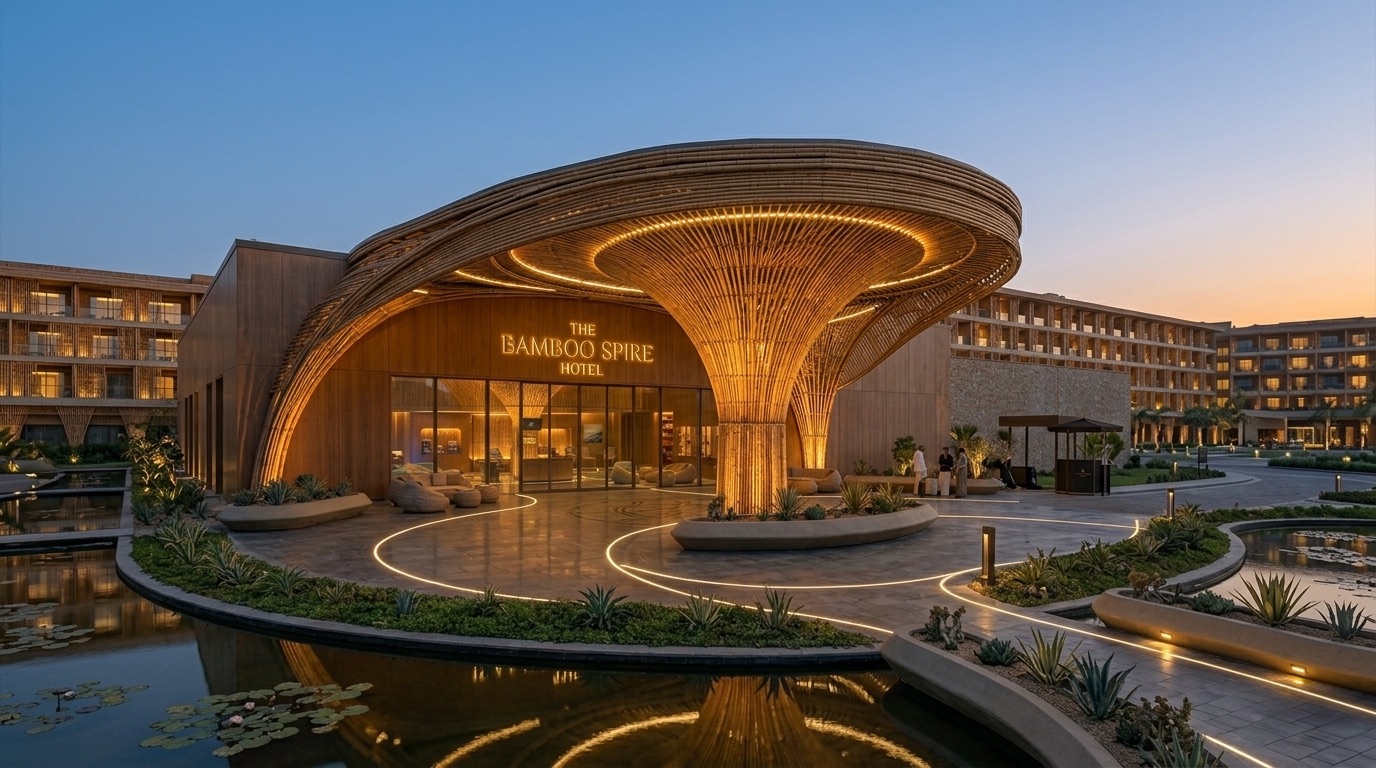 Klasik Akdeniz mimarisinin anıtsal dili ile çağdaş lüks anlayışını birleştiren bu otel tasarımı, su öğeleri ve simetrik kurgular üzerinden güçlü bir mekânsal deneyim sunar. Geniş avlu etrafında konumlanan yapı kütleleri, merkezi havuz ve yansıma yüzeyleri ile birlikte hem görsel süreklilik hem de serinletici bir mikroklima oluşturur.
