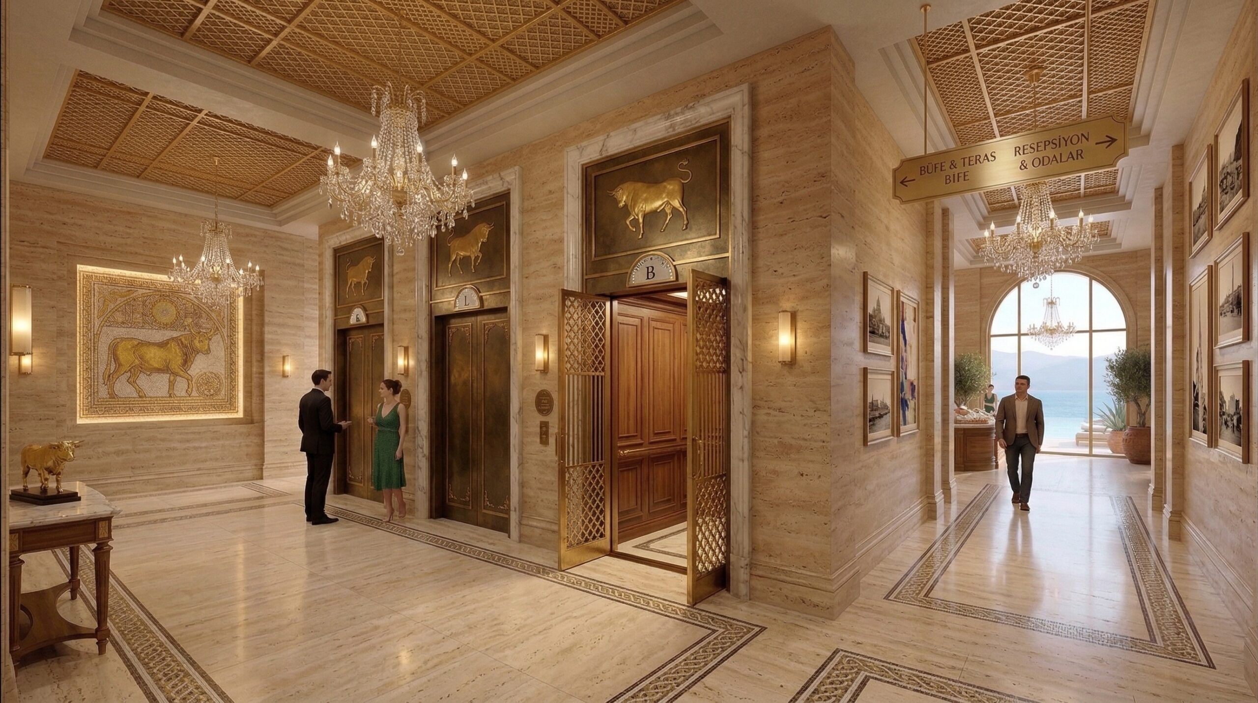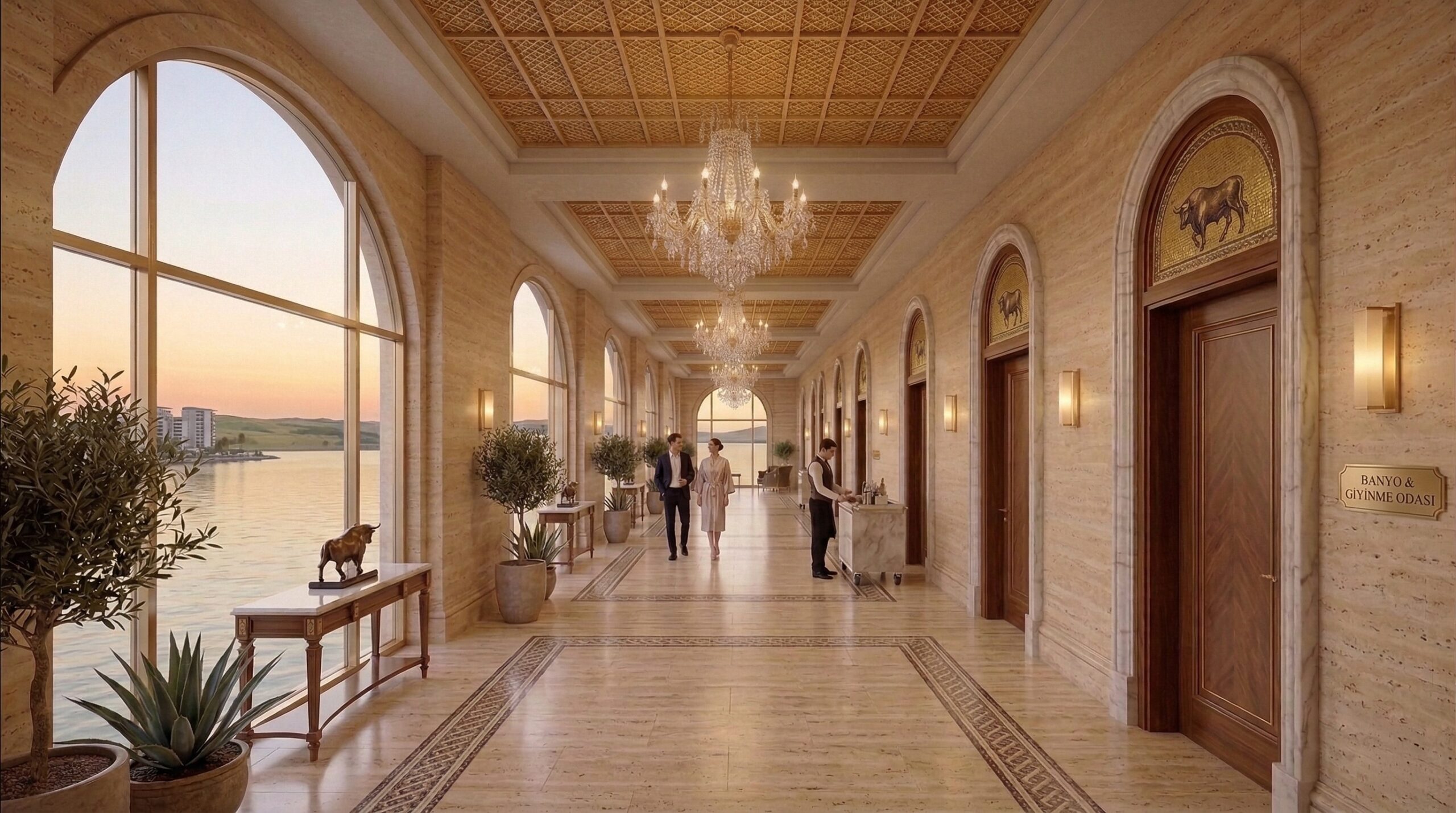 Doğal taş cepheler, kemerli açıklıklar ve yüksek tavanlı iç mekânlar, zamansız bir mimari karakter yaratırken; iç mekânda kullanılan sıcak tonlar, ahşap detaylar ve zarif aydınlatmalar kullanıcı deneyimini yumuşatır. Büyük açıklıklardan alınan gün ışığı ve deniz manzarası, mekânın ferahlığını artırarak iç ve dış mekân arasında akışkan bir ilişki kurar.