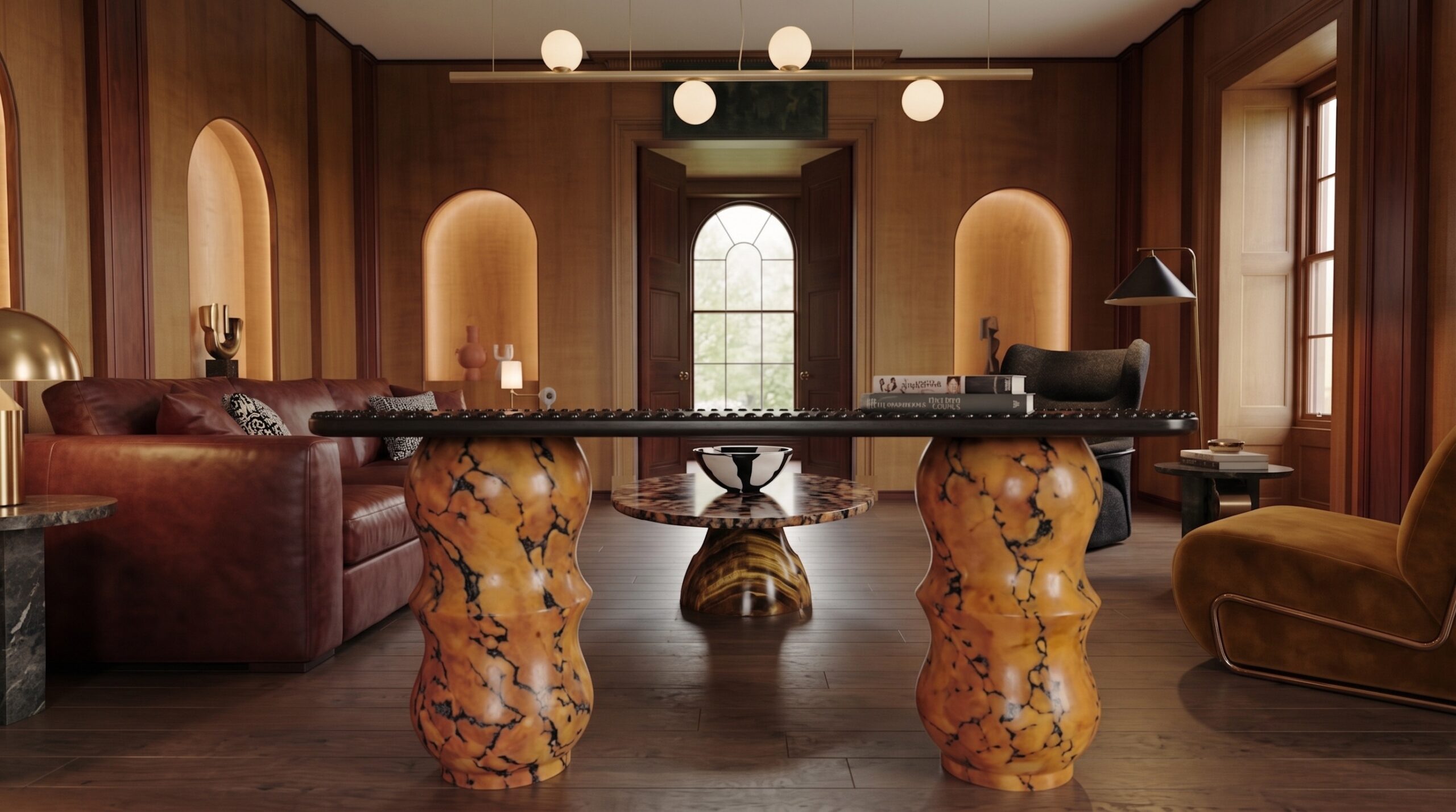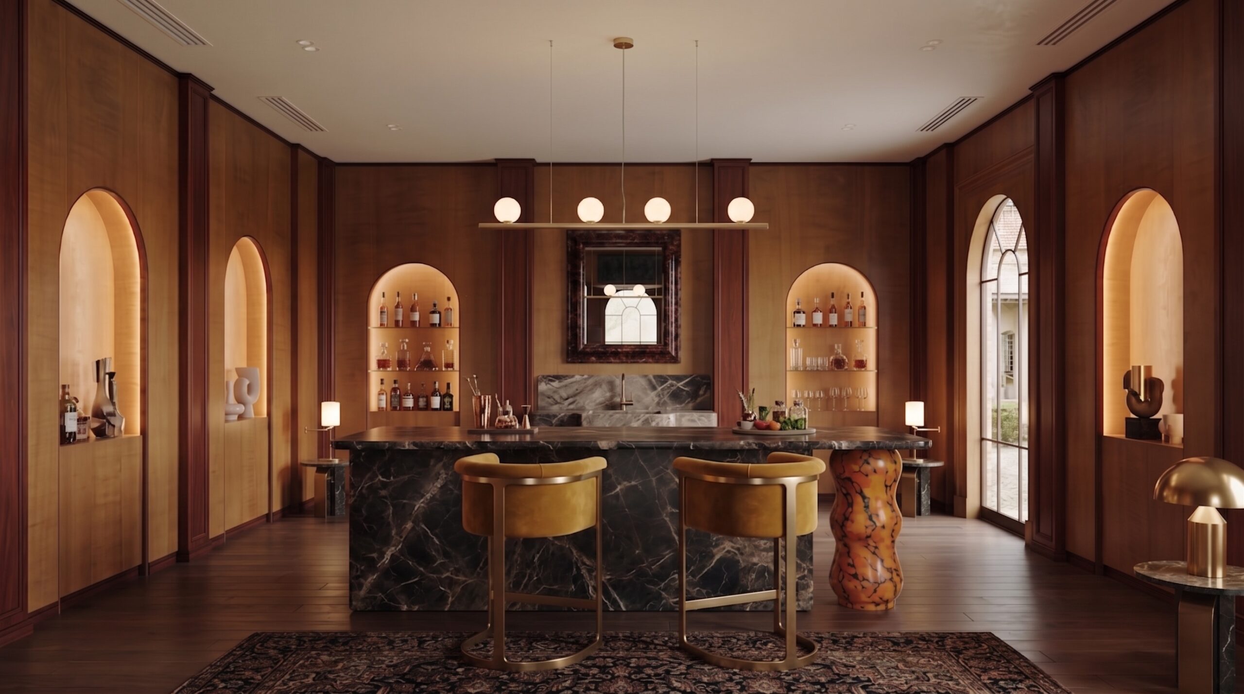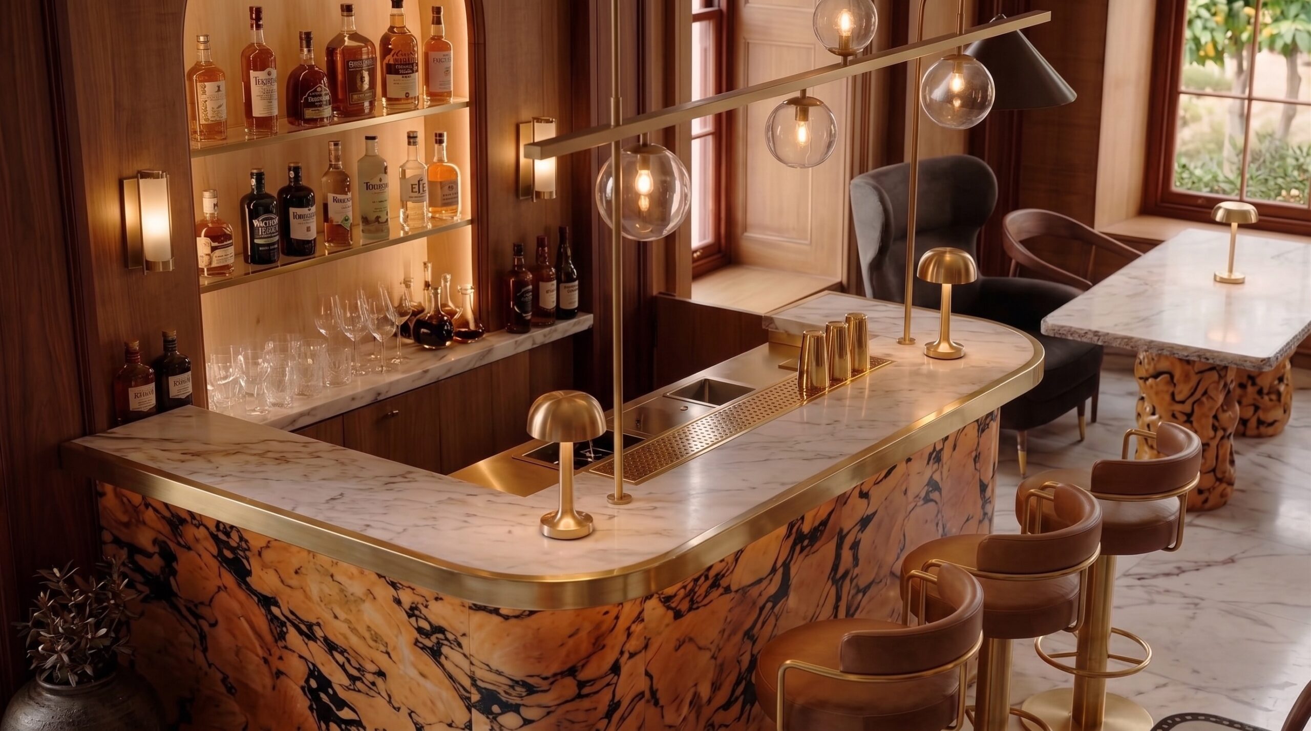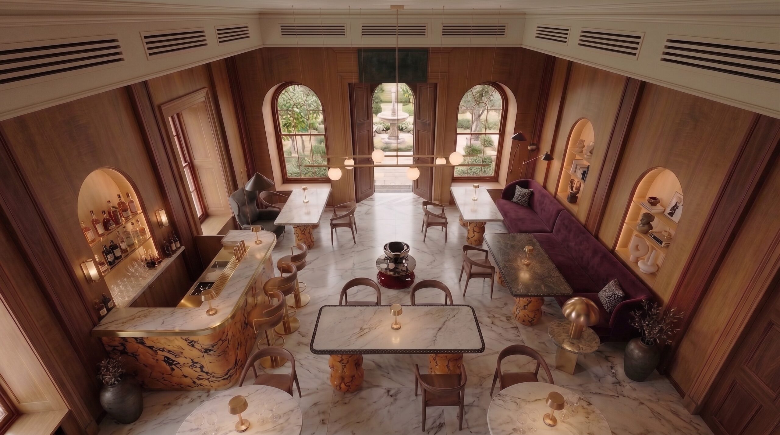 Heykelsi ayaklara sahip mermer masa tablaları, kadife ve deri döşemeli oturma elemanları, masif ahşap bar tezgâhı ve özel üretim sandalyeler mekânın karakterini tanımlar. Bar alanında damarlı doğal taş yüzeyler ve pirinç detaylar öne çıkarken; kemerli nişler, dekoratif objeler ve yumuşak aydınlatmalar mekâna katmanlı bir derinlik kazandırır.