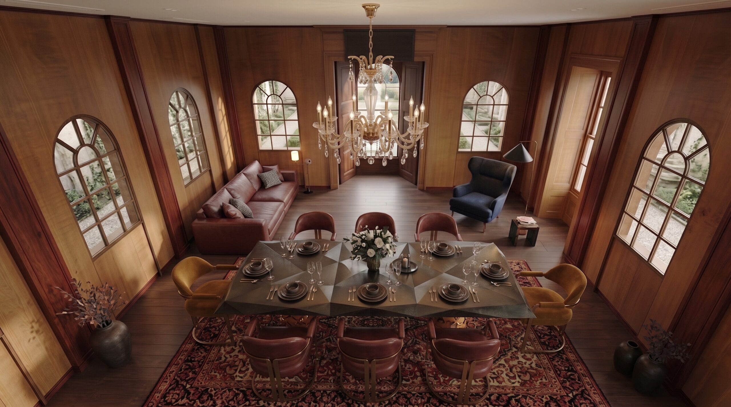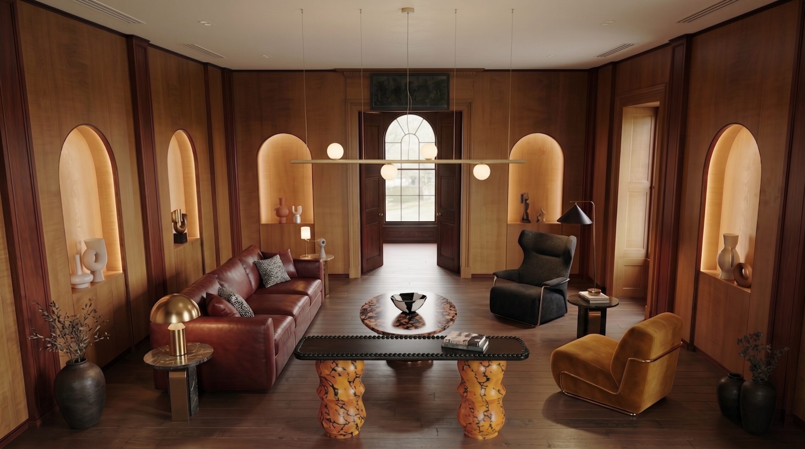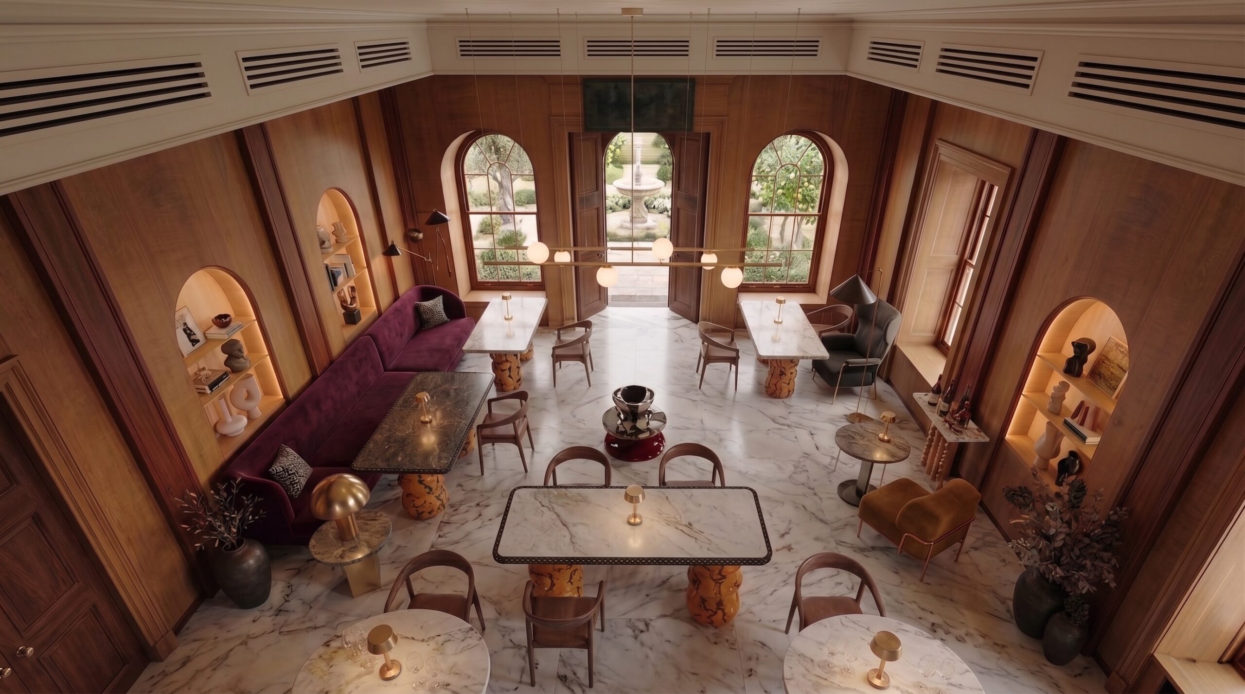 Yüksek kemerli açıklıklar ve iç avluya açılan cam yüzeyler, doğal ışık ve peyzaj ile güçlü bir ilişki kurarak mekâna davetkâr bir atmosfer kazandırır. Sıcak amber tonları, ceviz kaplamalar ve doğal taş zeminler, mekânda sofistike ve bütüncül bir zemin oluşturur.