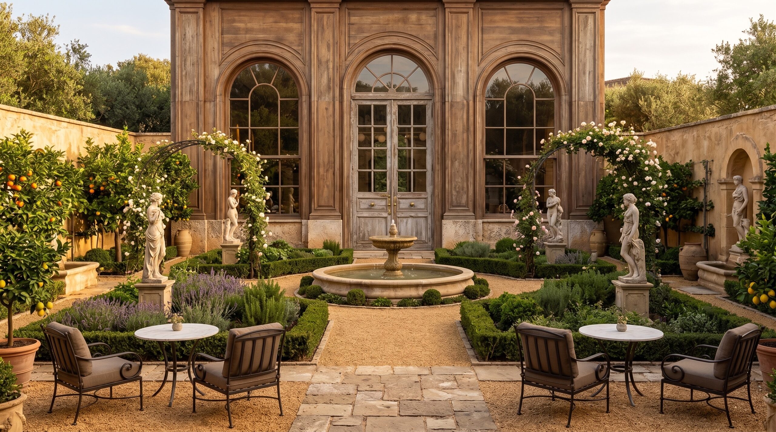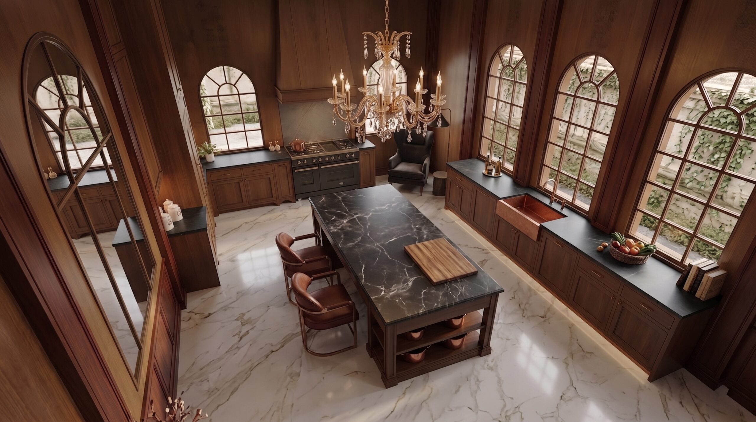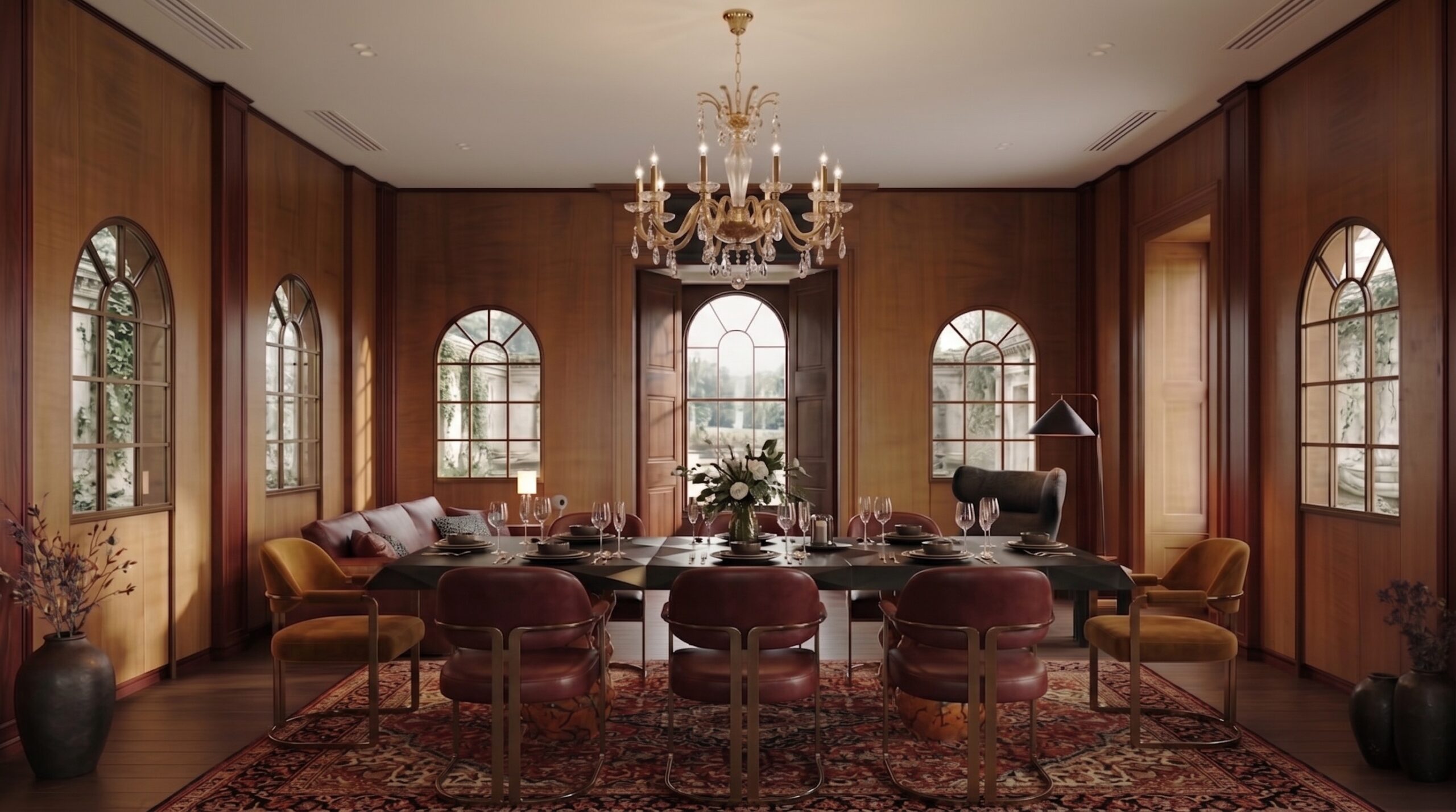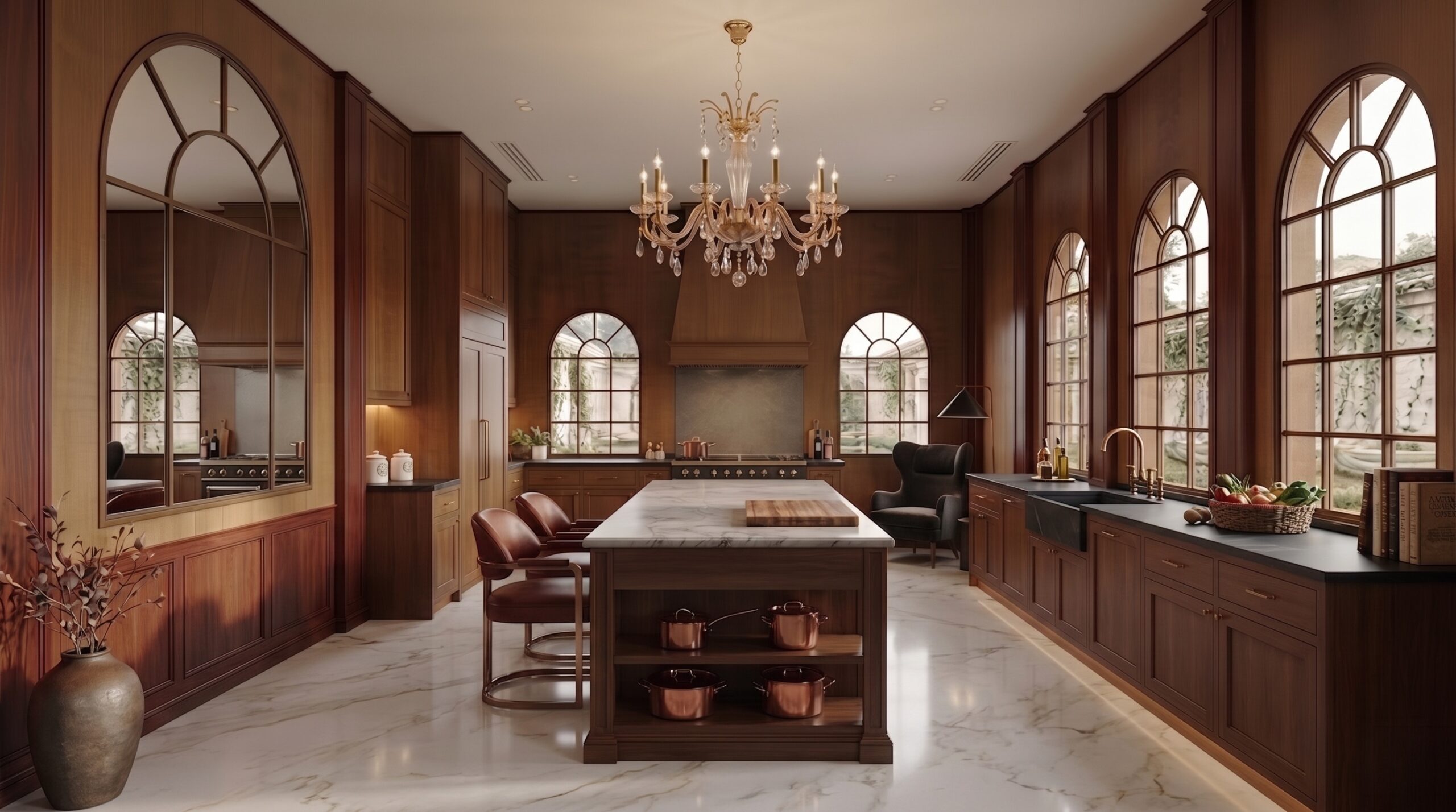 Yüksek kemerli açıklıklar ve iç avluya açılan cam yüzeyler, doğal ışık ve peyzaj ile güçlü bir ilişki kurarak mekâna davetkâr bir atmosfer kazandırır. Sıcak amber tonları, ceviz kaplamalar ve doğal taş zeminler, mekânda sofistike ve bütüncül bir zemin oluşturur.