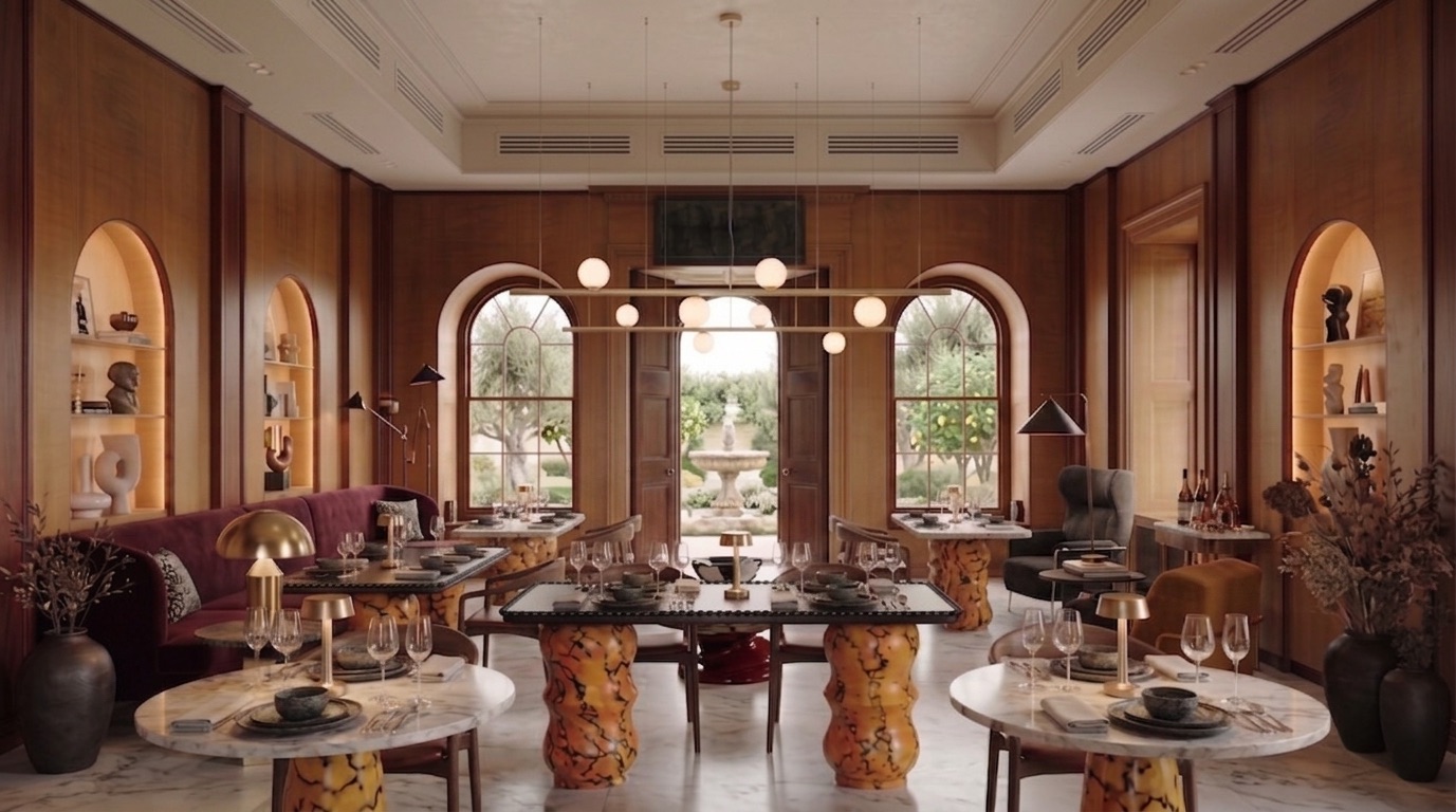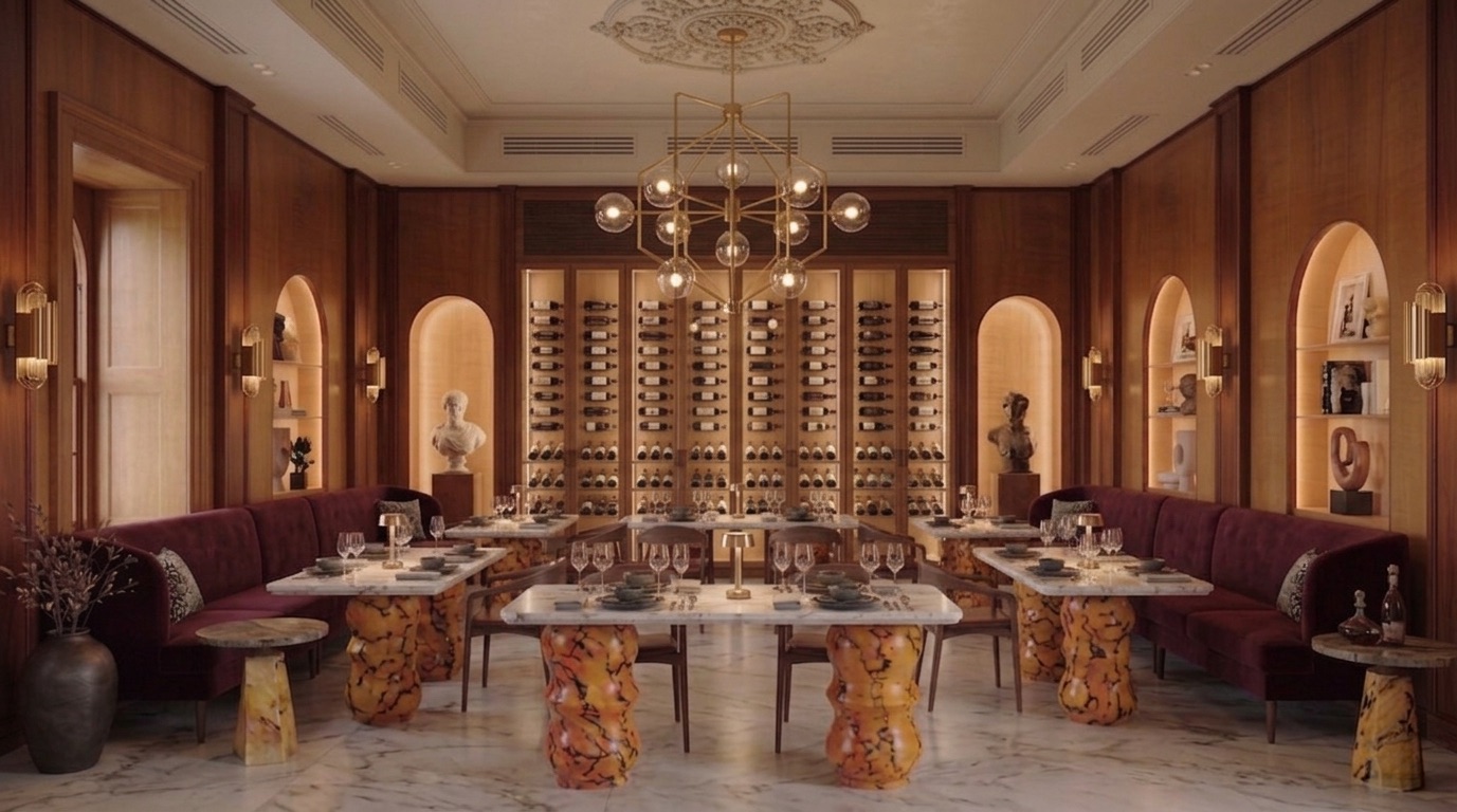Klasik mimari referanslar ile çağdaş malzeme ve mobilya dili arasında kurulan bu denge, mekânı zamansız ve deneyim odaklı bir gastronomi alanına dönüştürür.
