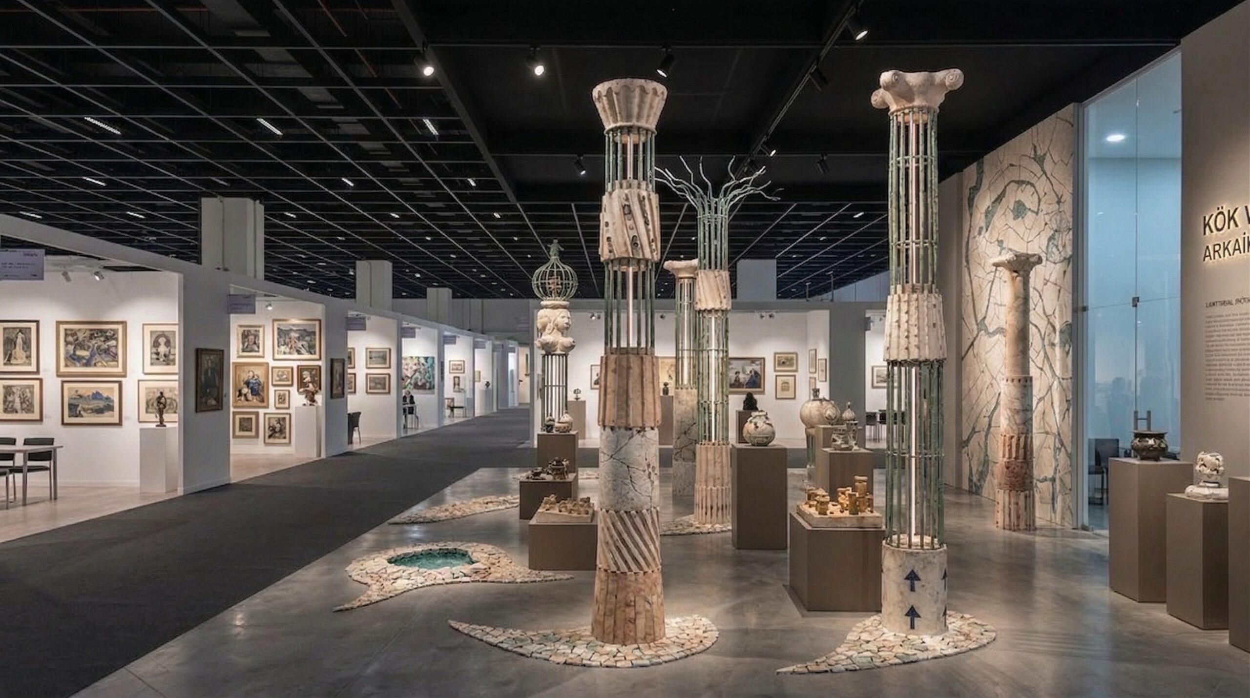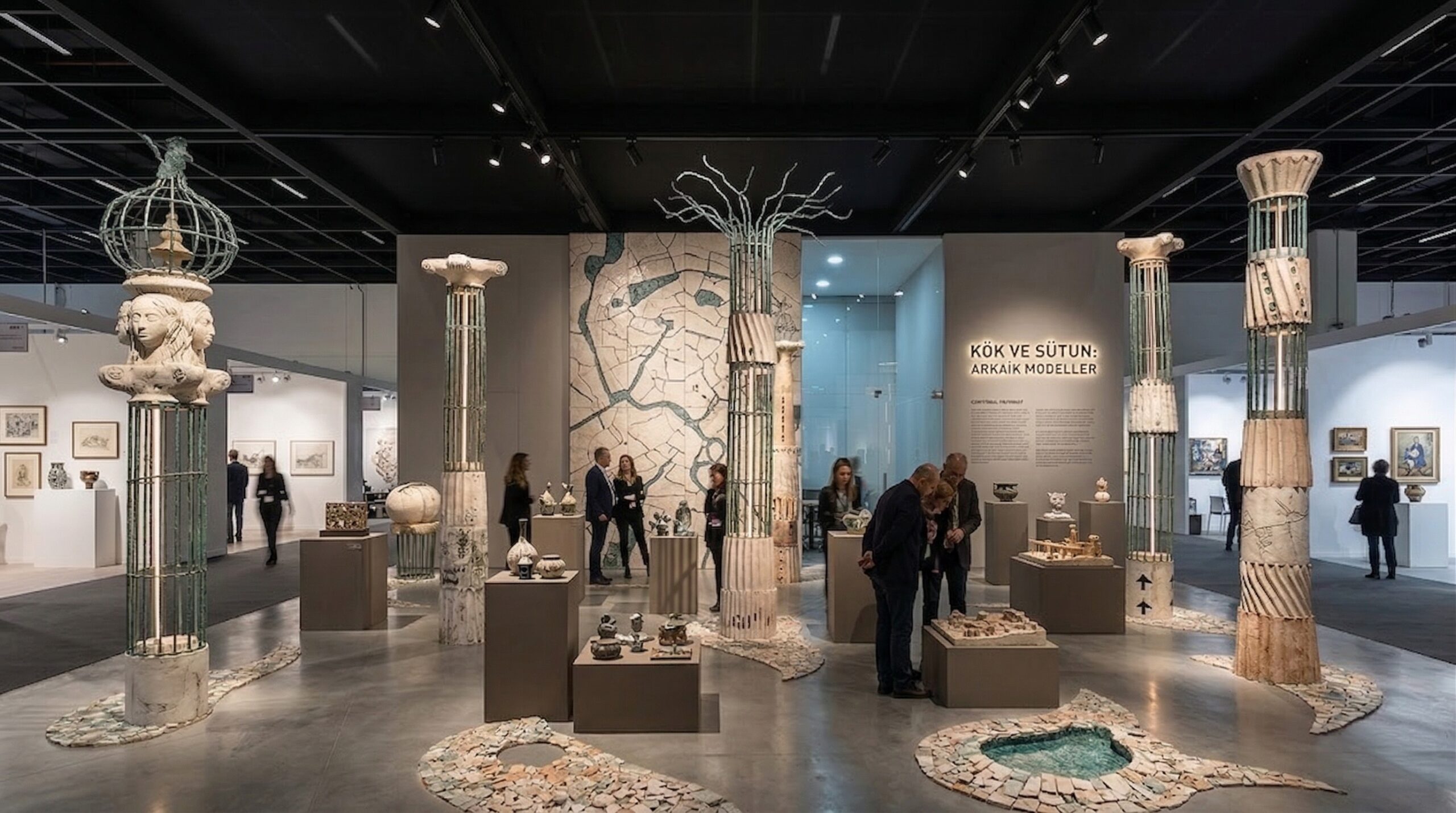 Arkeolojik referansları çağdaş sergileme diliyle yeniden yorumlayan bu fuar/sergi tasarımı, mekân içinde heykelsi kolonlar ve merkezi yerleştirmeler aracılığıyla güçlü bir anlatı kurgusu oluşturur. Farklı yüksekliklerde konumlandırılan strüktürel elemanlar, ziyaretçiyi yönlendiren bir dolaşım aksı tanımlarken; her bir obje kendi mikro sahnesi içinde sergilenir.