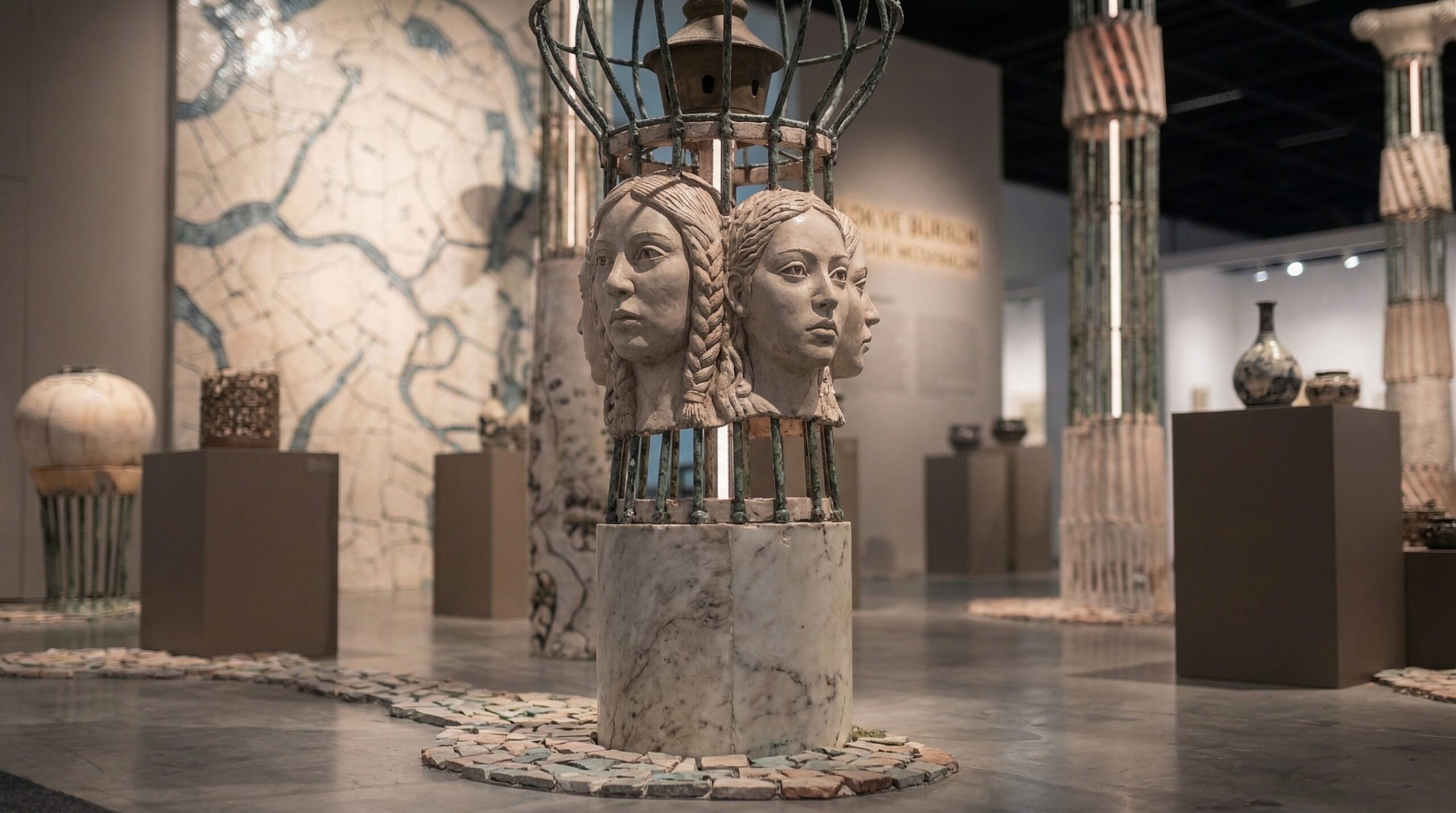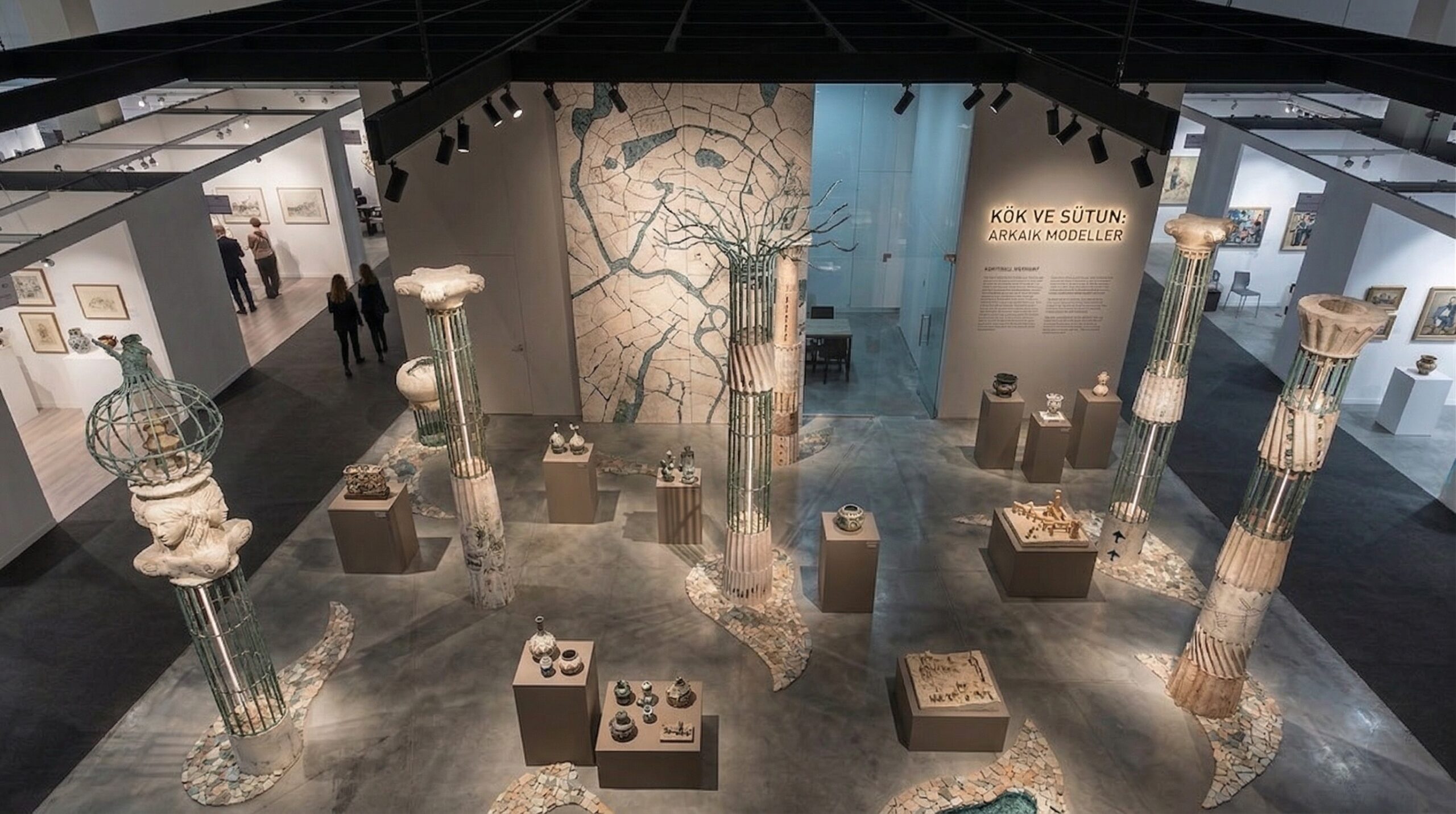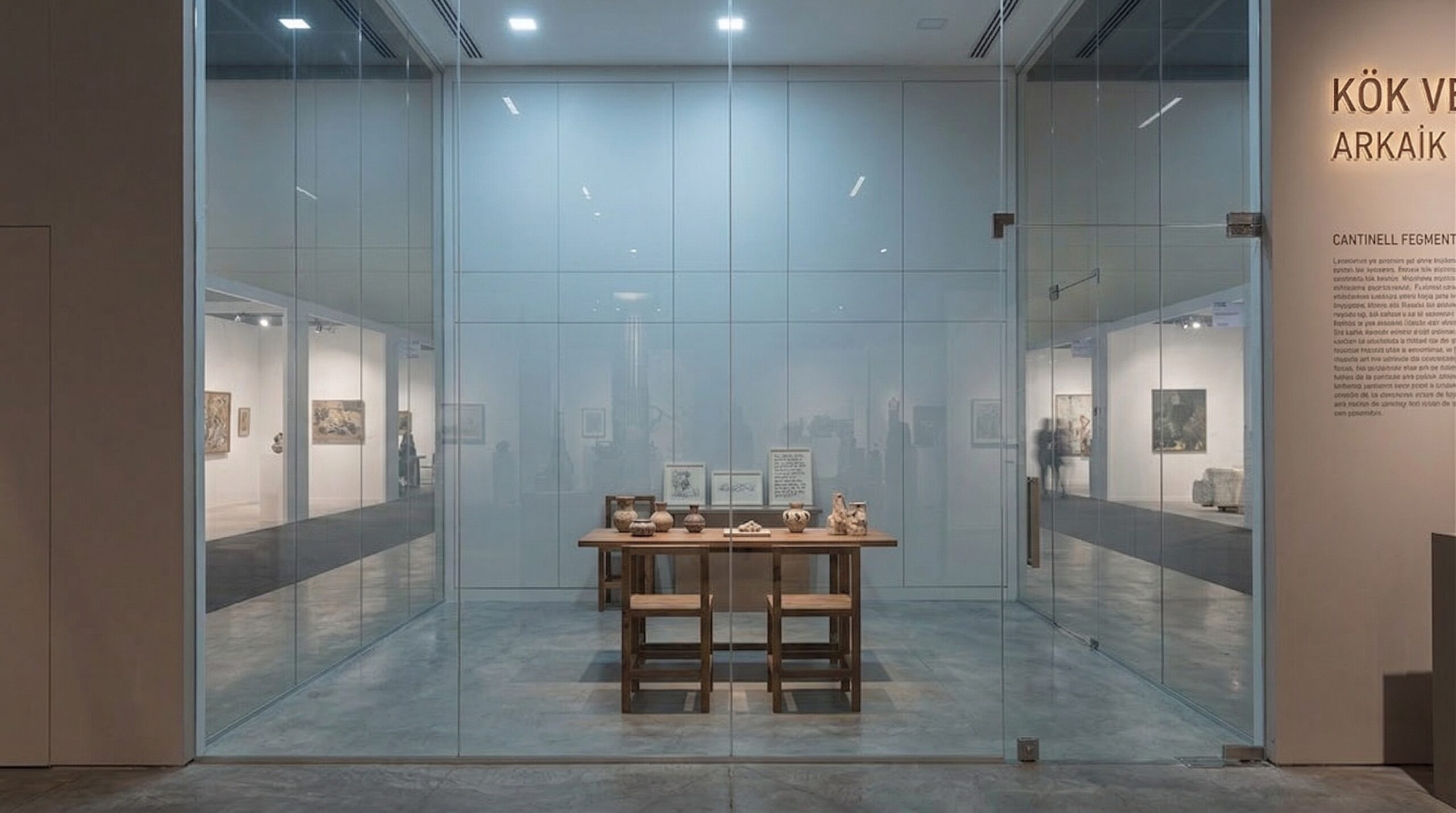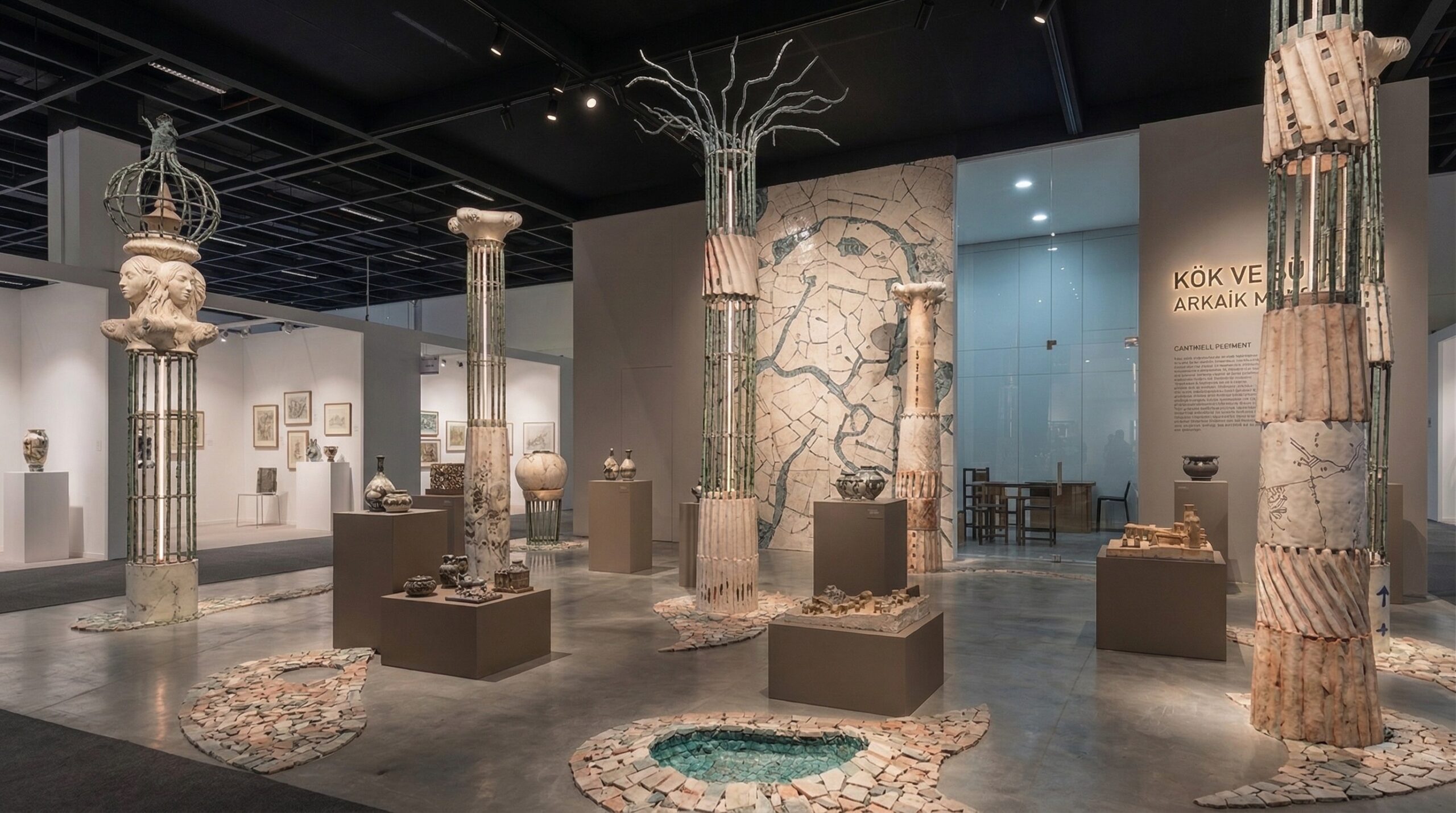 Doğal taş dokular, nötr yüzeyler ve yumuşak aydınlatma ile desteklenen mekân, sergilenen eserlerin ön plana çıkmasını sağlar. Ortadaki ana yerleştirme, mekânsal odak noktası olarak kurgulanırken; çevresel galeri bantları kronolojik ve tematik bir sergi akışı sunar. Tasarım yaklaşımı, geçmiş ile günümüz arasında mekânsal bir diyalog kurar.