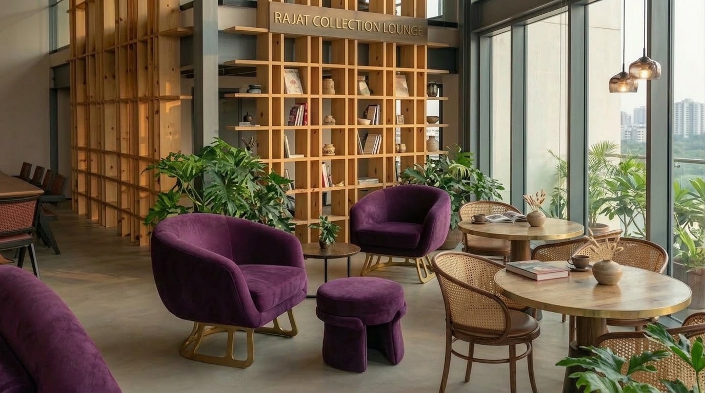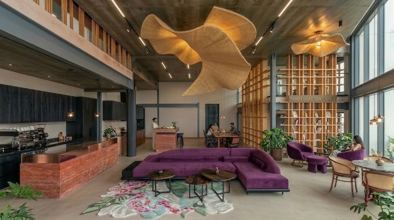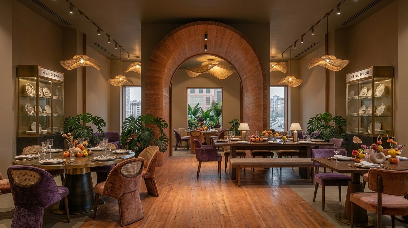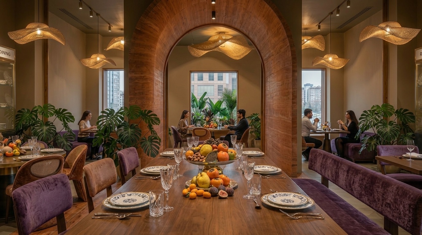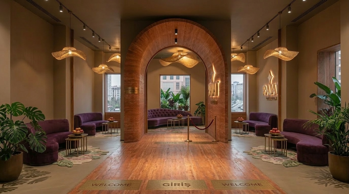 Yüksek hacimli mekânın merkezinde yer alan büyük kemerli geçiş, tüm alanı tanımlayan ana mimari öğe olarak öne çıkar. Ahşap tonları, mor ve bordo oturma elemanları ile sıcak ve sofistike bir atmosfer oluşturulurken; açık plan yerleşim farklı kullanım senaryolarını bir araya getirir. Tavanlarda kullanılan organik formlu aydınlatma elemanları ve büyük ölçekli sanat objeleri mekâna çağdaş bir karakter kazandırırken, bitkisel dokular ve doğal ışık iç mekâna canlılık katmaktadır.