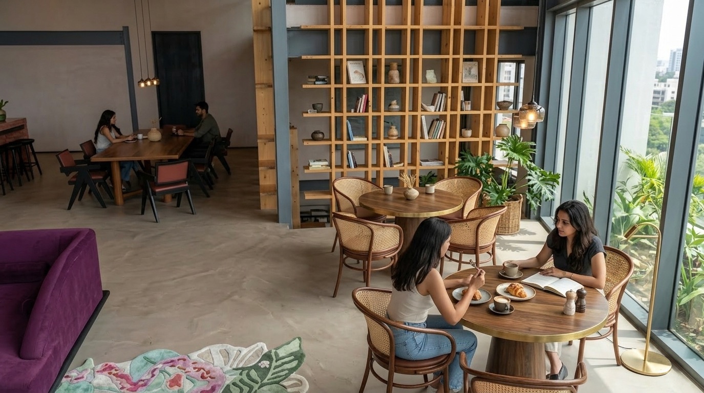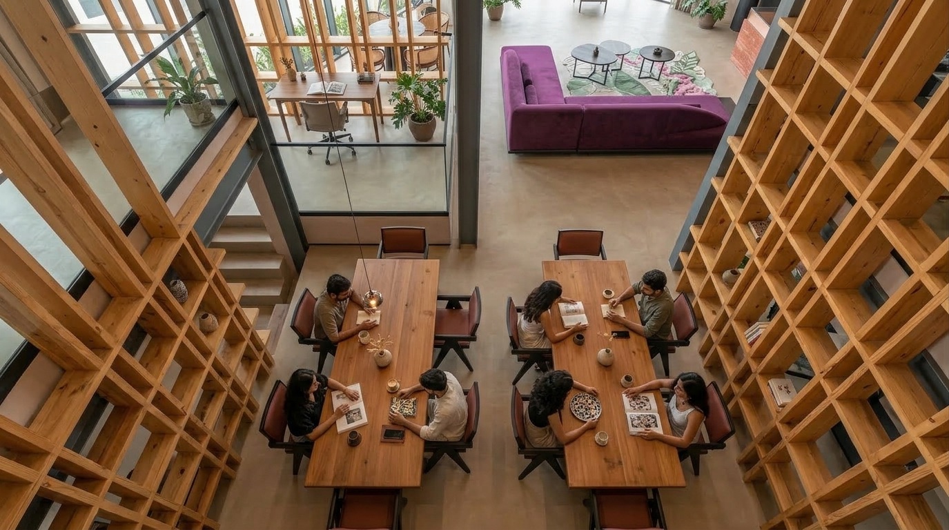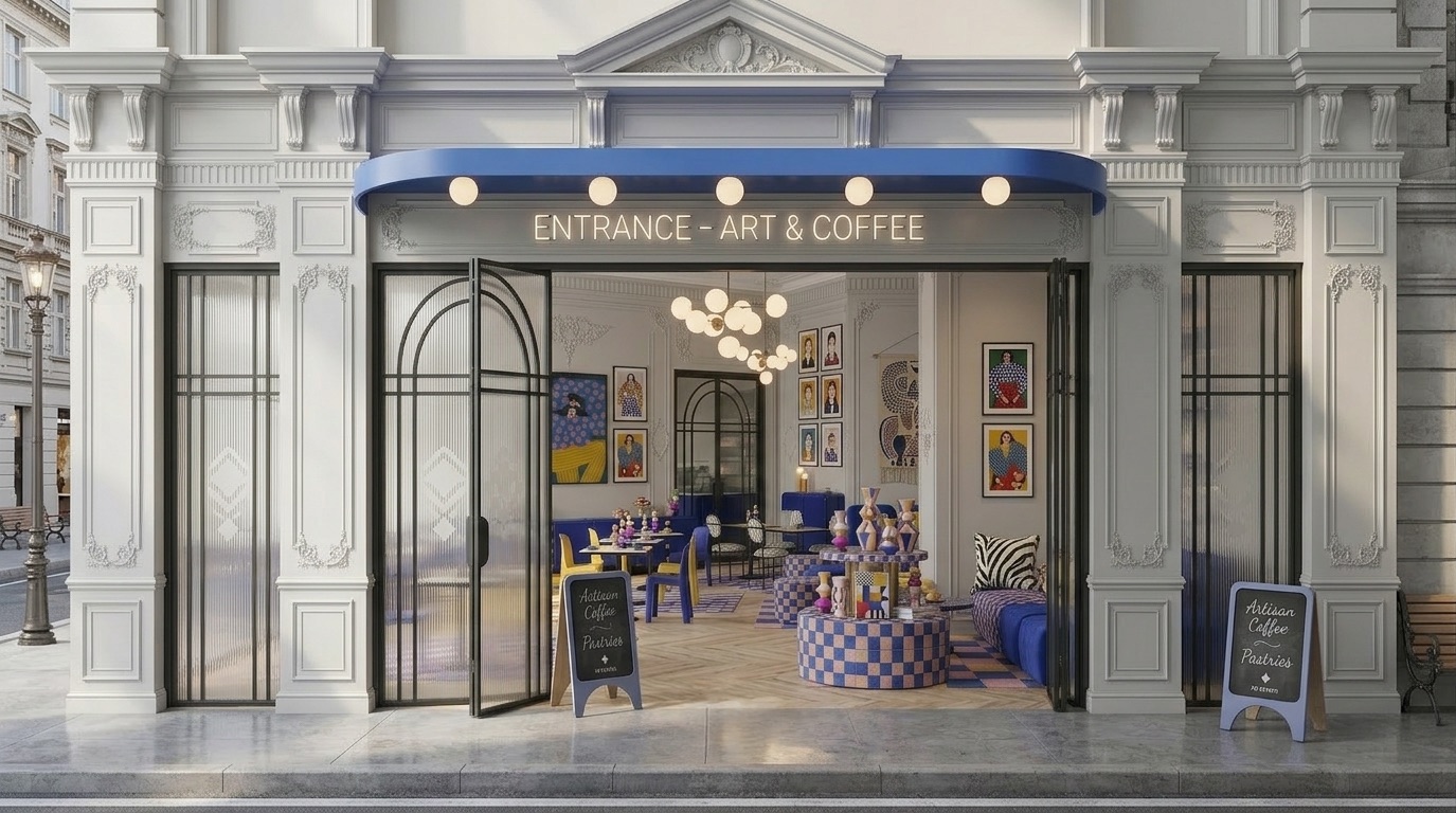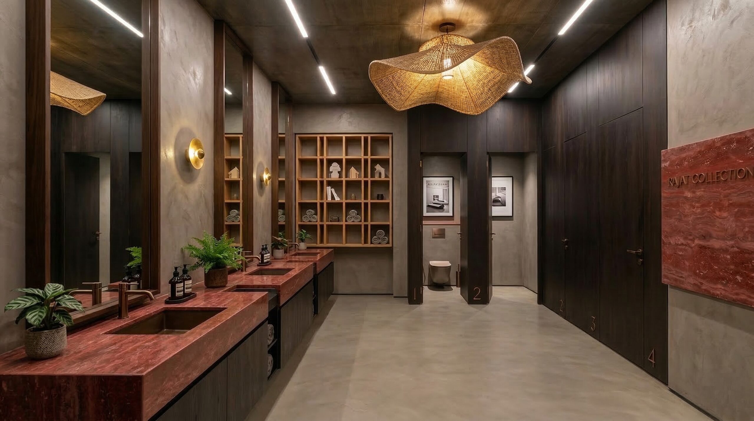 Yüksek hacimli mekânın merkezinde yer alan büyük kemerli geçiş, tüm alanı tanımlayan ana mimari öğe olarak öne çıkar. Ahşap tonları, mor ve bordo oturma elemanları ile sıcak ve sofistike bir atmosfer oluşturulurken; açık plan yerleşim farklı kullanım senaryolarını bir araya getirir. Tavanlarda kullanılan organik formlu aydınlatma elemanları ve büyük ölçekli sanat objeleri mekâna çağdaş bir karakter kazandırırken, bitkisel dokular ve doğal ışık iç mekâna canlılık katmaktadır.