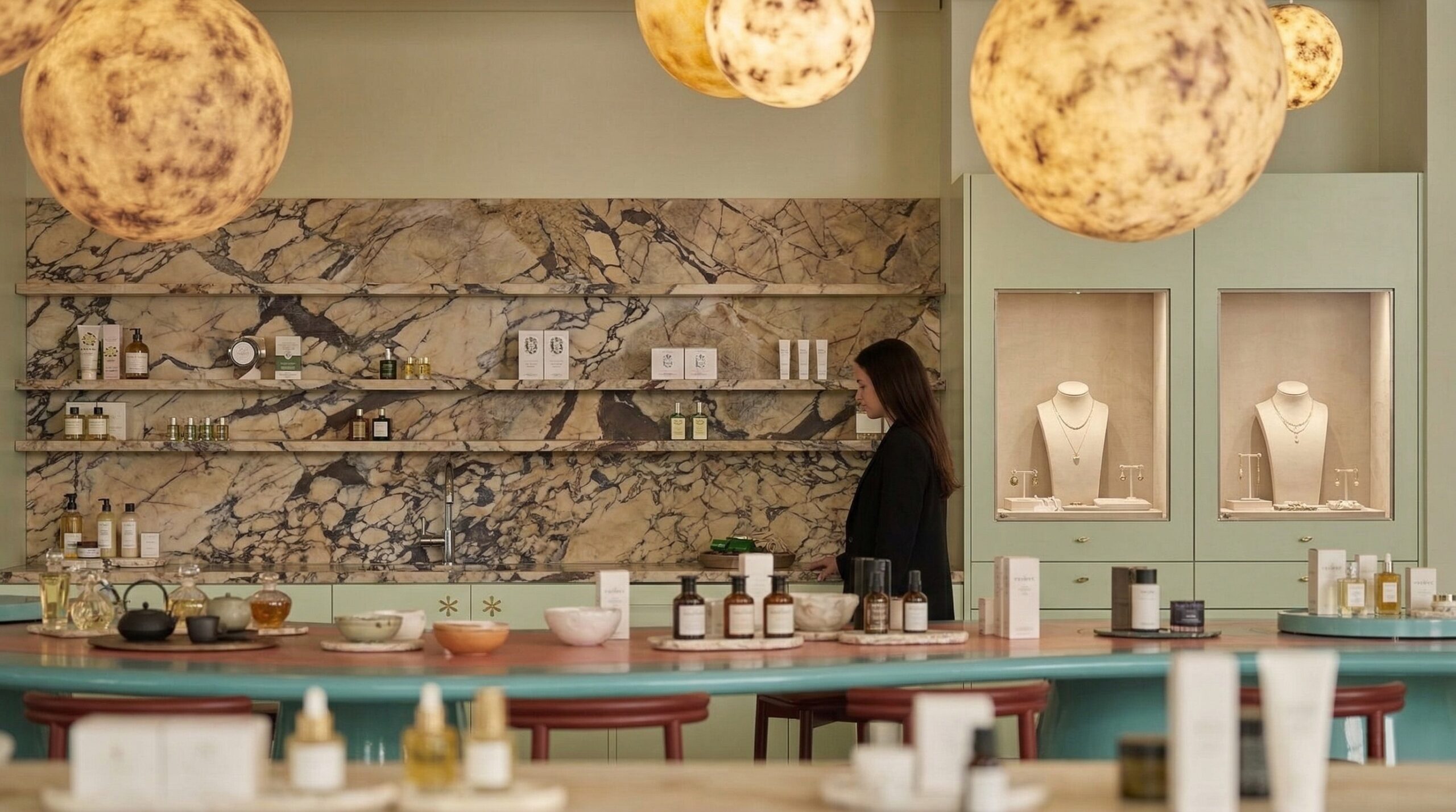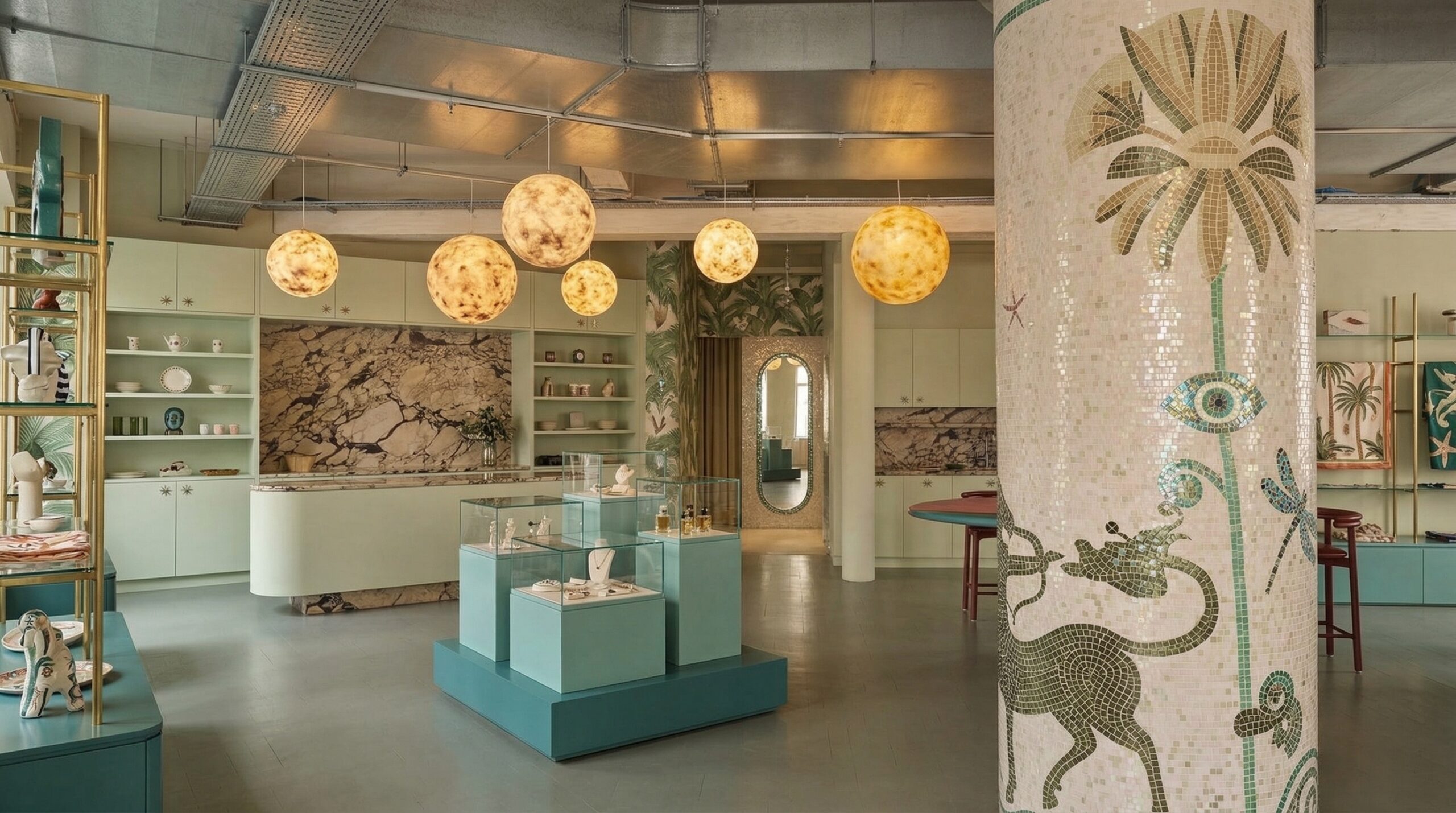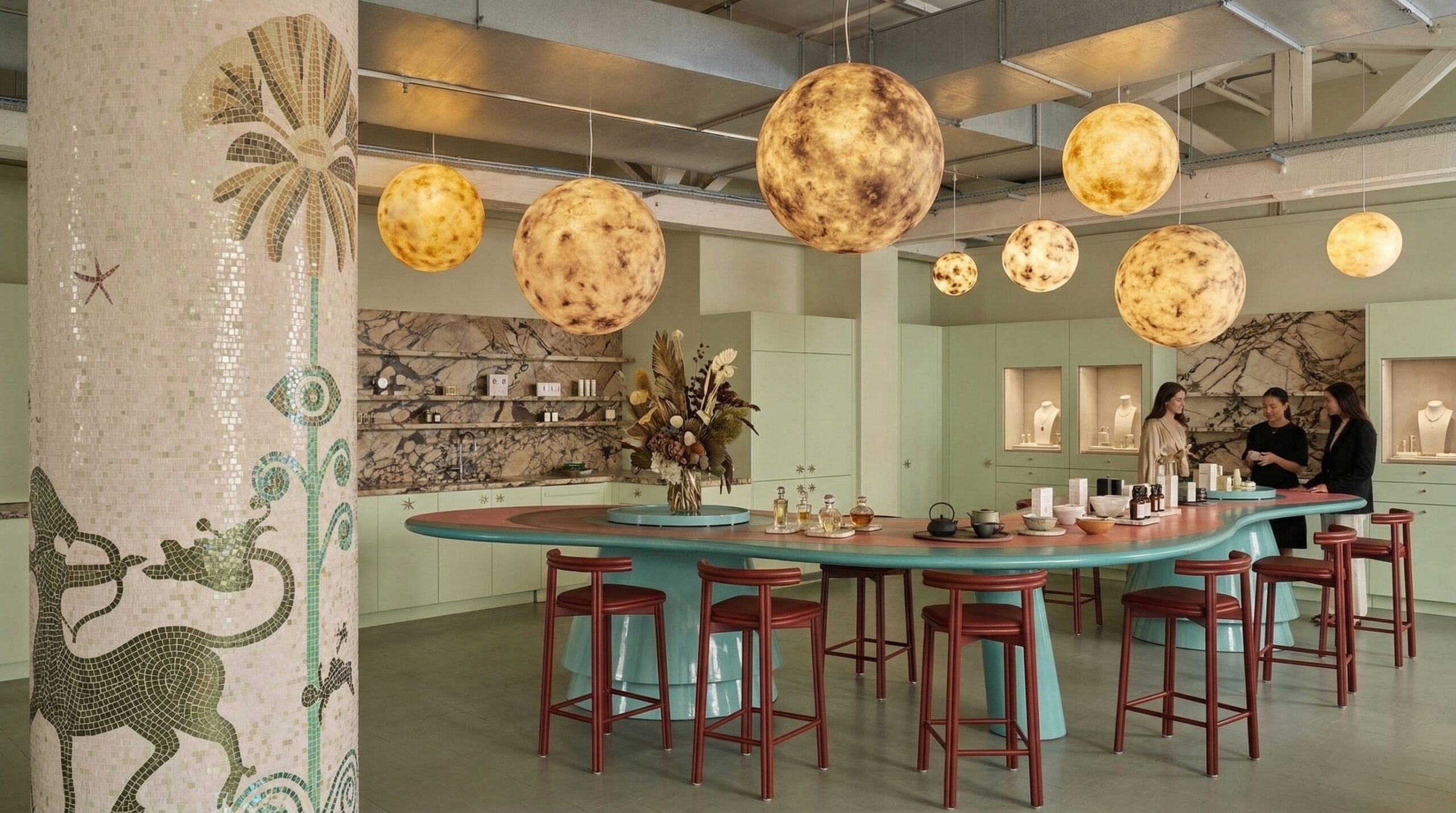 Doğal taş dokuları ve botanik temaların birleşimiyle kurgulanan bu mağaza tasarımı, perakende deneyimini duyusal bir keşif alanına dönüştürür. Mermer yüzeyli tezgâhlar, mekânın merkezinde güçlü bir odak oluştururken; duvarlarda yer alan illüstratif bitki ve figür kompozisyonları, mekâna hikâyesel bir katman kazandırır.