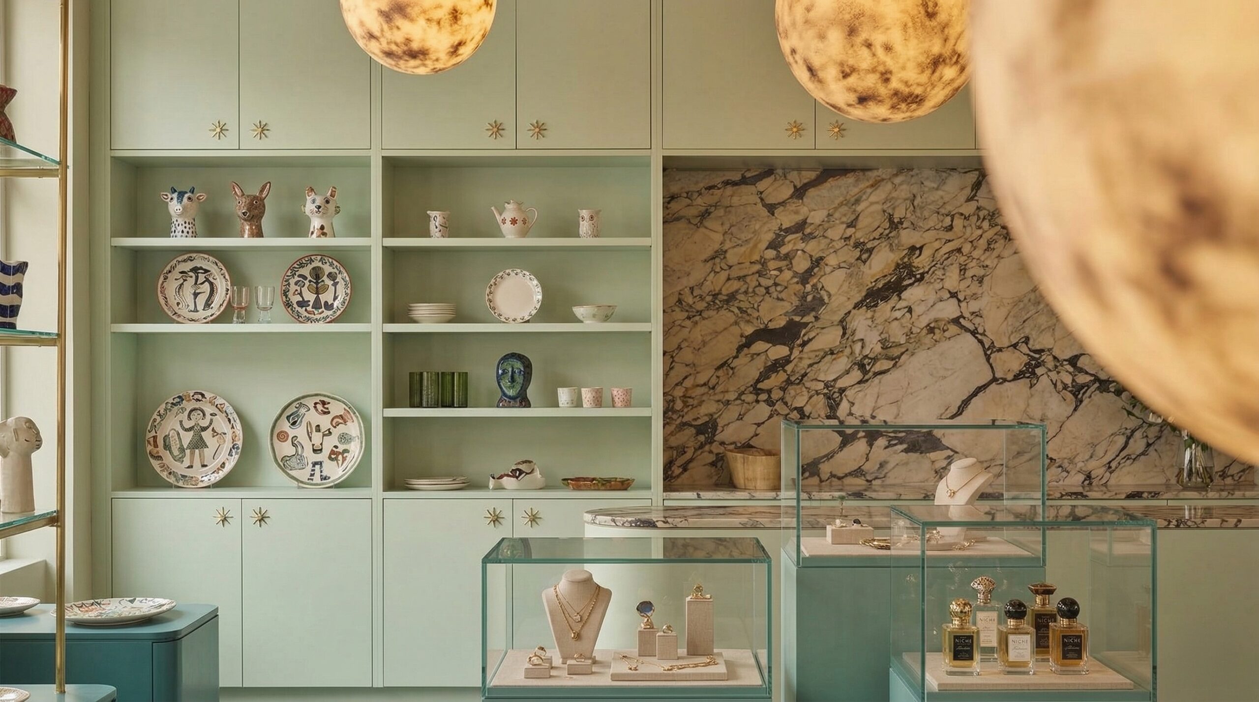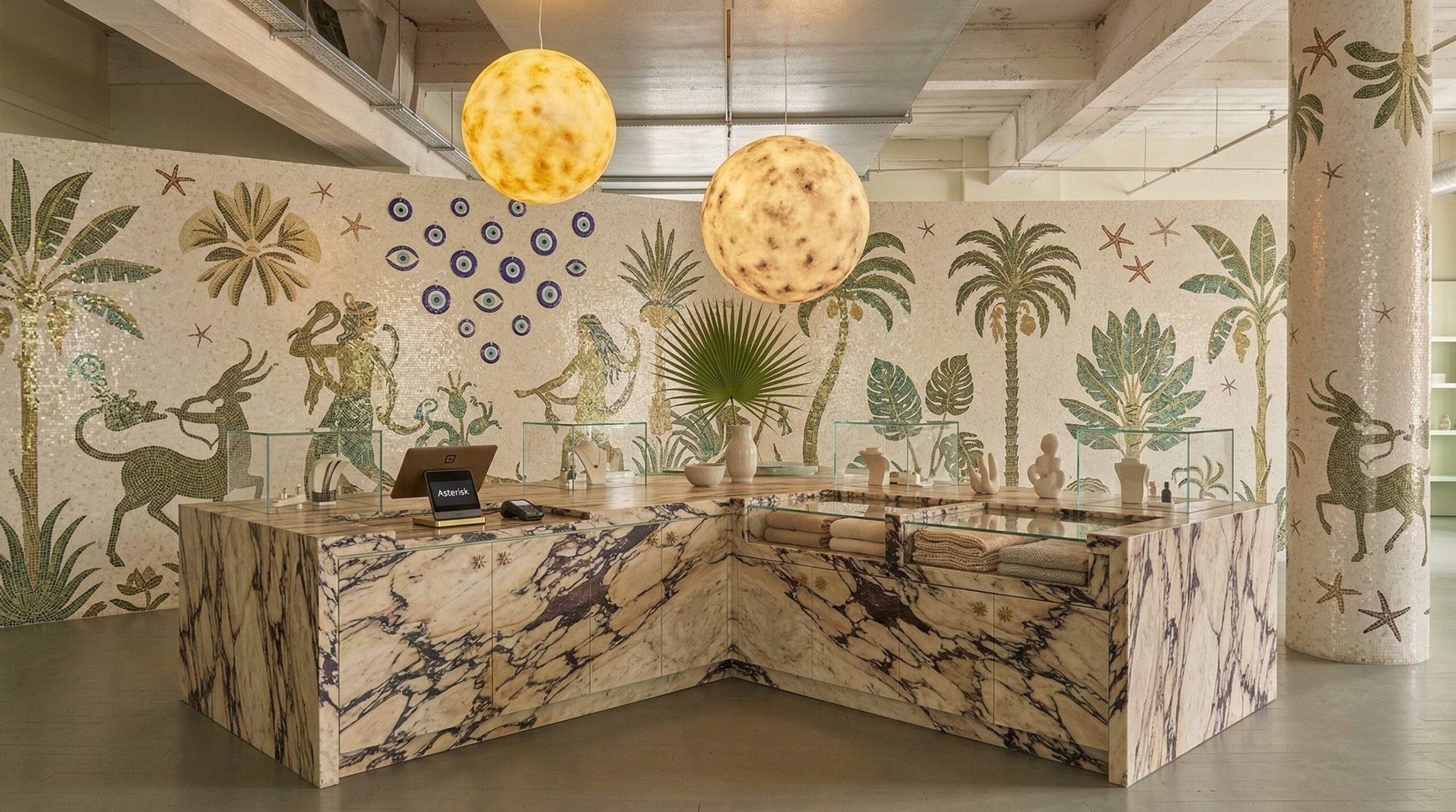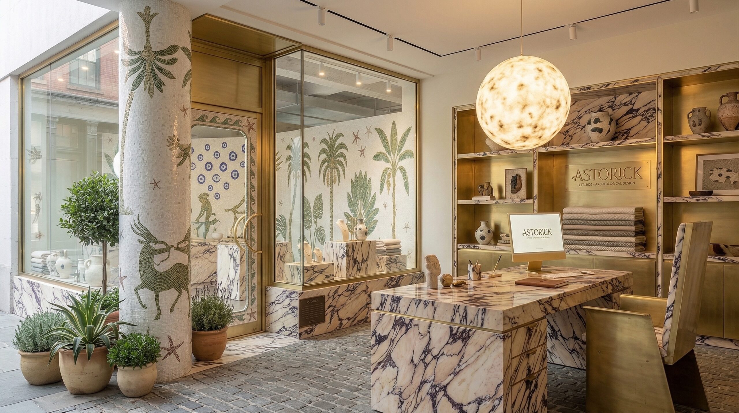 Doğal taş dokuları ve botanik temaların birleşimiyle kurgulanan bu mağaza tasarımı, perakende deneyimini duyusal bir keşif alanına dönüştürür. Mermer yüzeyli tezgâhlar, mekânın merkezinde güçlü bir odak oluştururken; duvarlarda yer alan illüstratif bitki ve figür kompozisyonları, mekâna hikâyesel bir katman kazandırır.