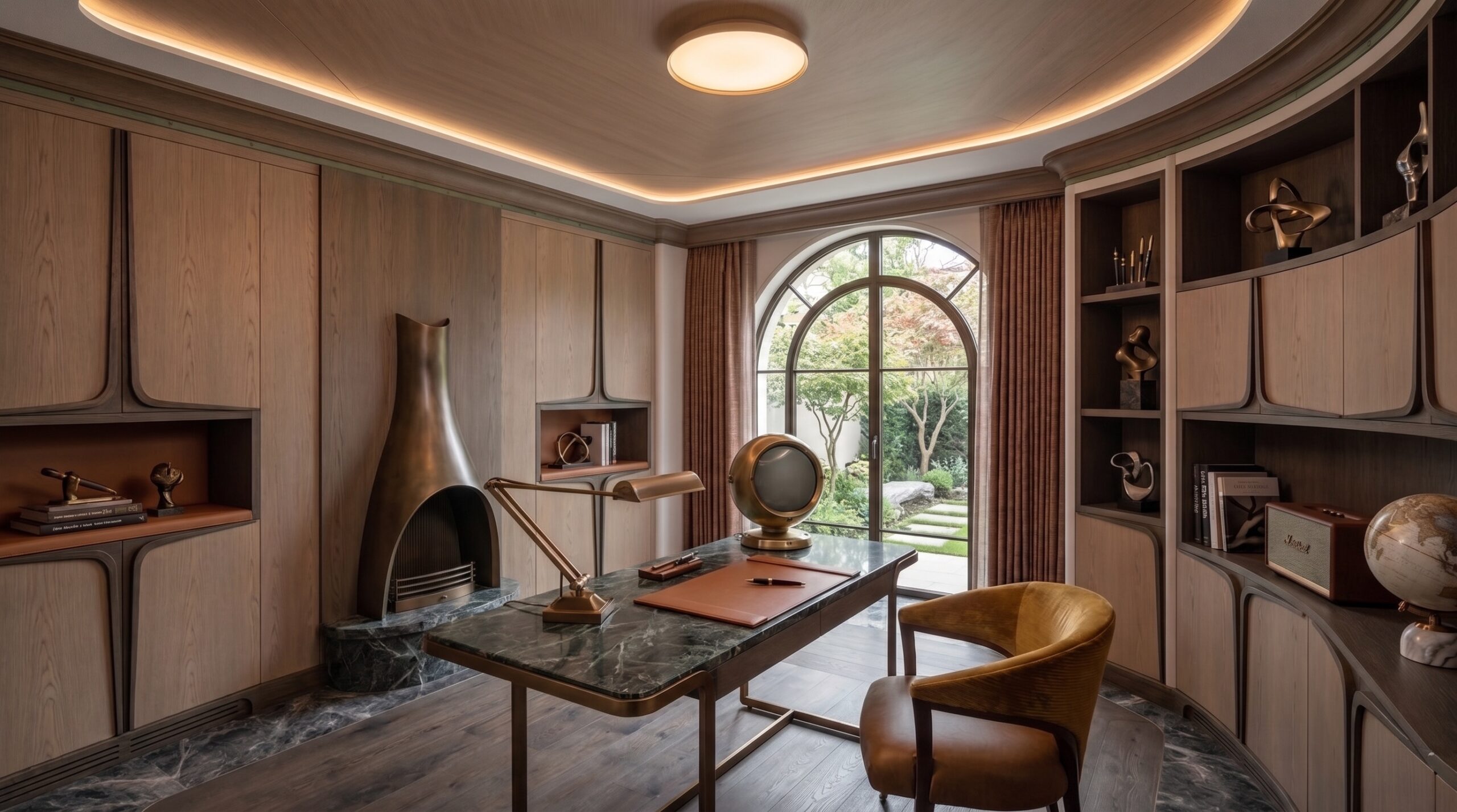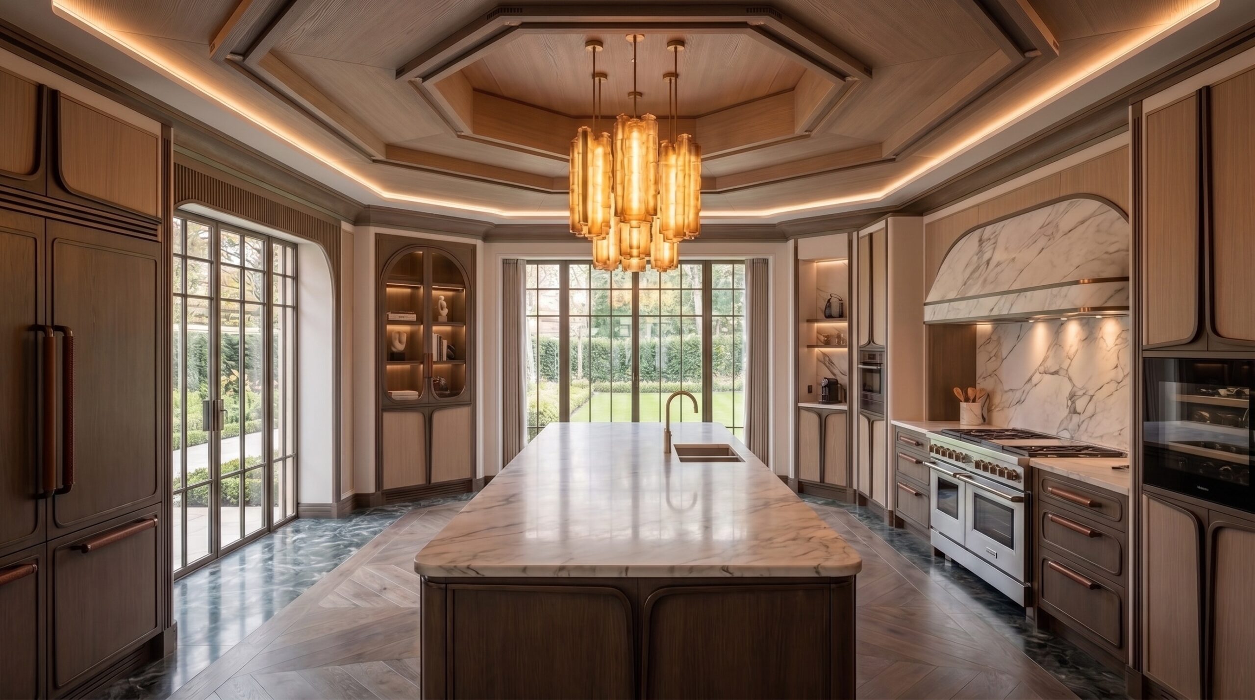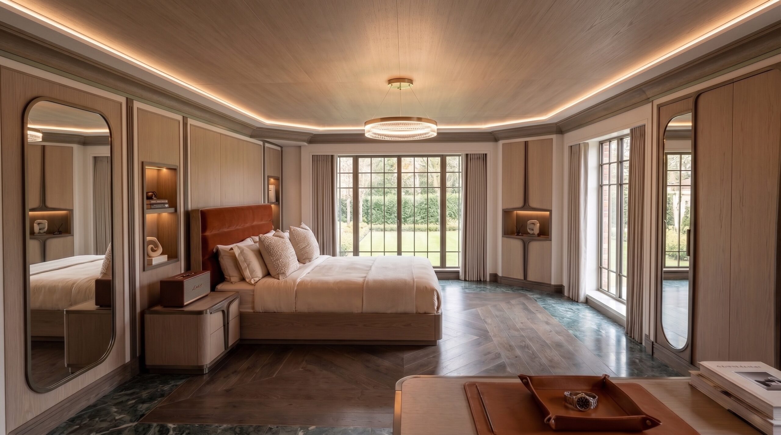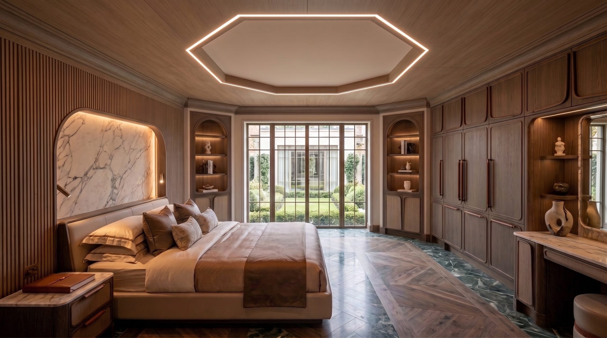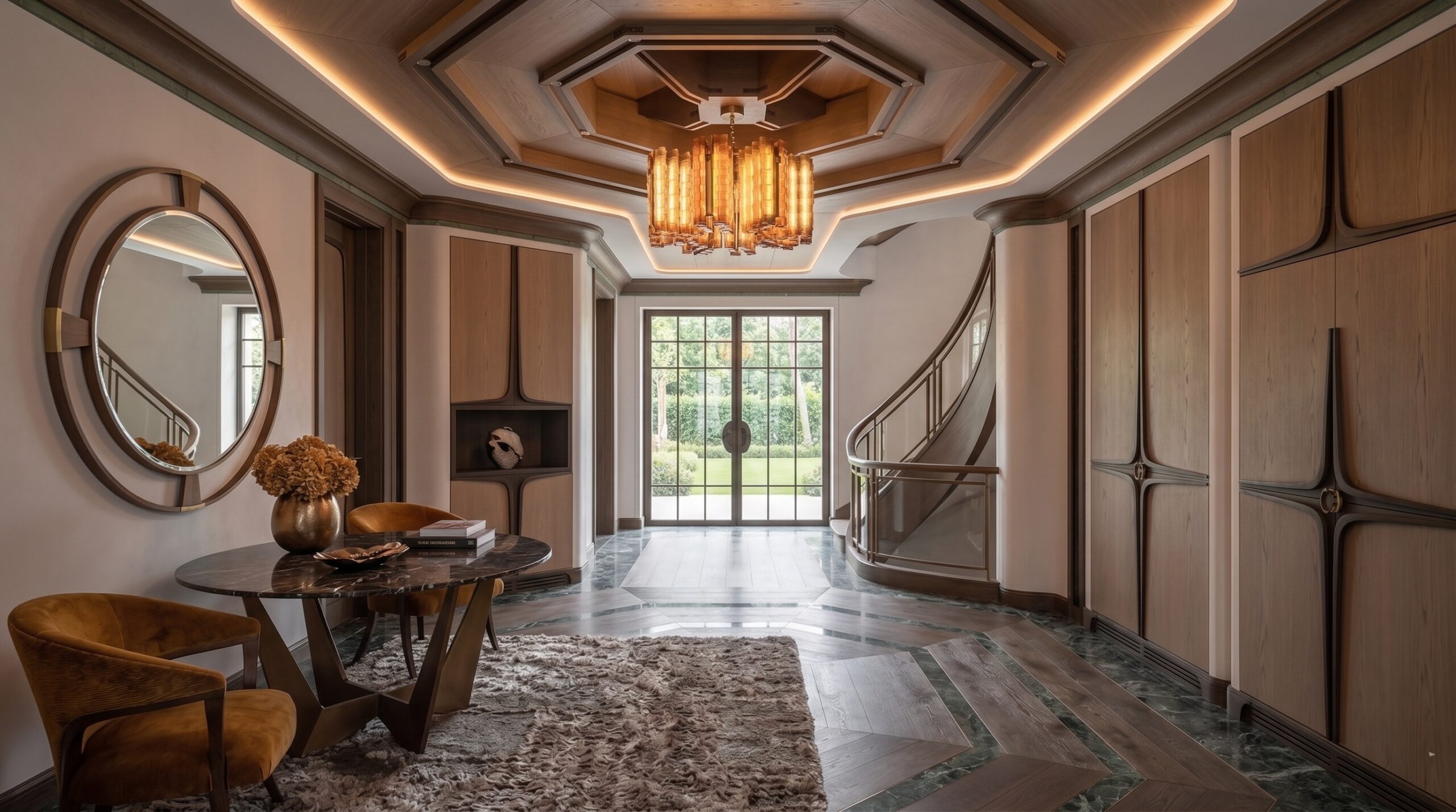 Klasik mimari dil ile çağdaş mobilya ve malzeme seçimlerinin birleşimi, mekânı zamansız, güçlü ve yüksek konforlu bir yaşam alanına dönüştürür.