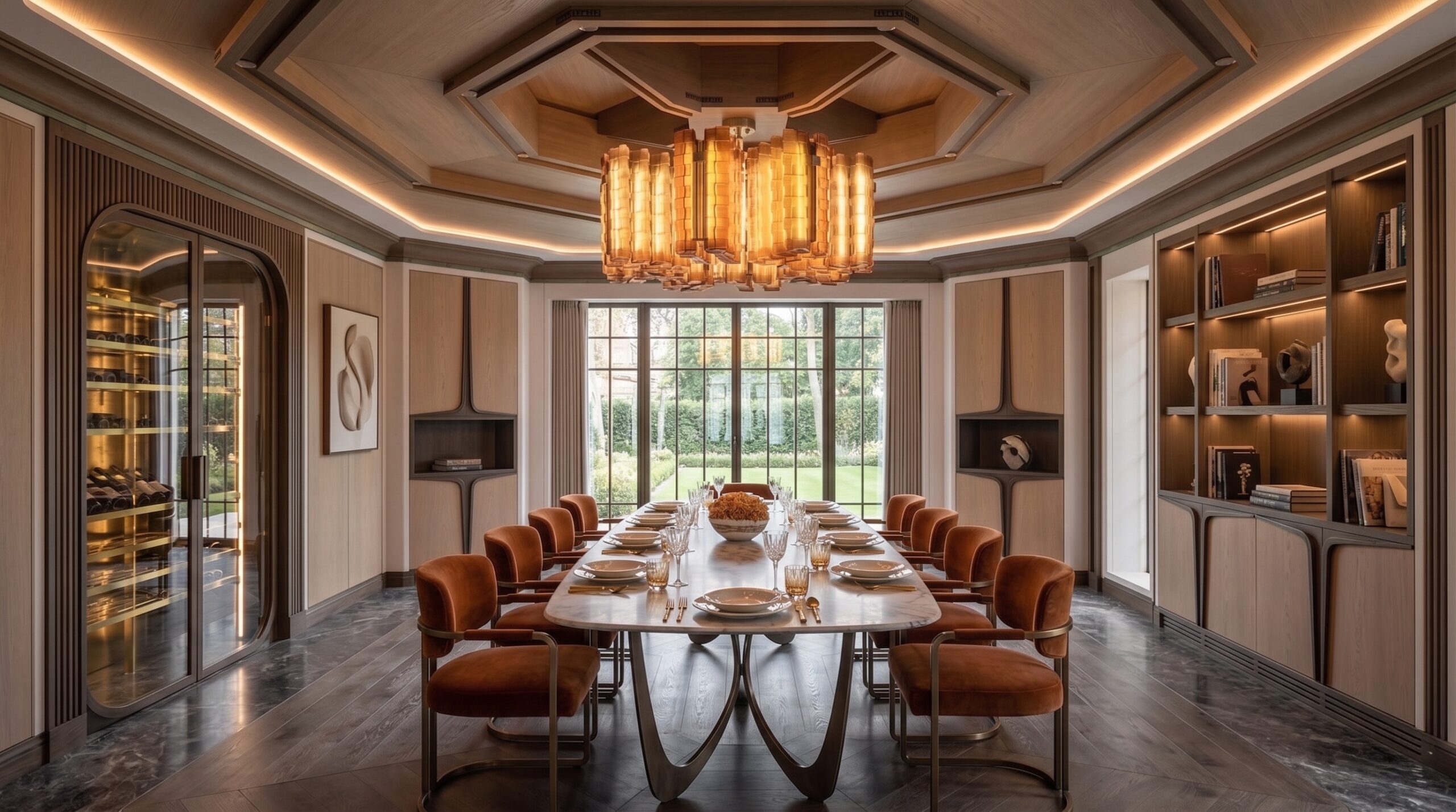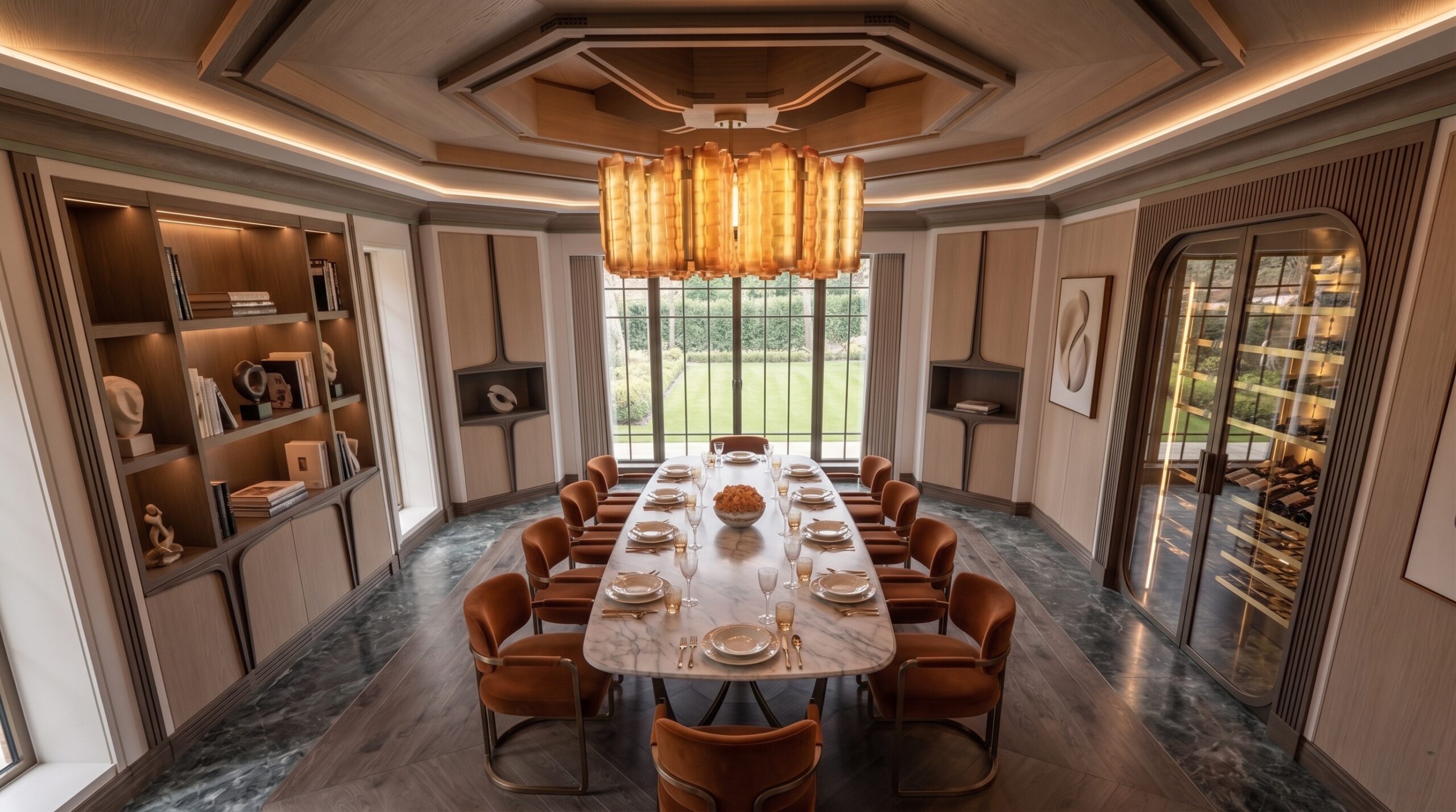 Geniş pencere açıklıkları ve yeşil çevre ile kurulan görsel ilişki, mekâna dengeli bir doğal ışık dağılımı kazandırırken klasik oranlar modern detaylarla yeniden yorumlanır. Ahşap panel duvarlar, geometrik tavan süslemeleri ve doğal taş zeminler, mekânda sıcak ve rafine bir atmosfer oluşturur.