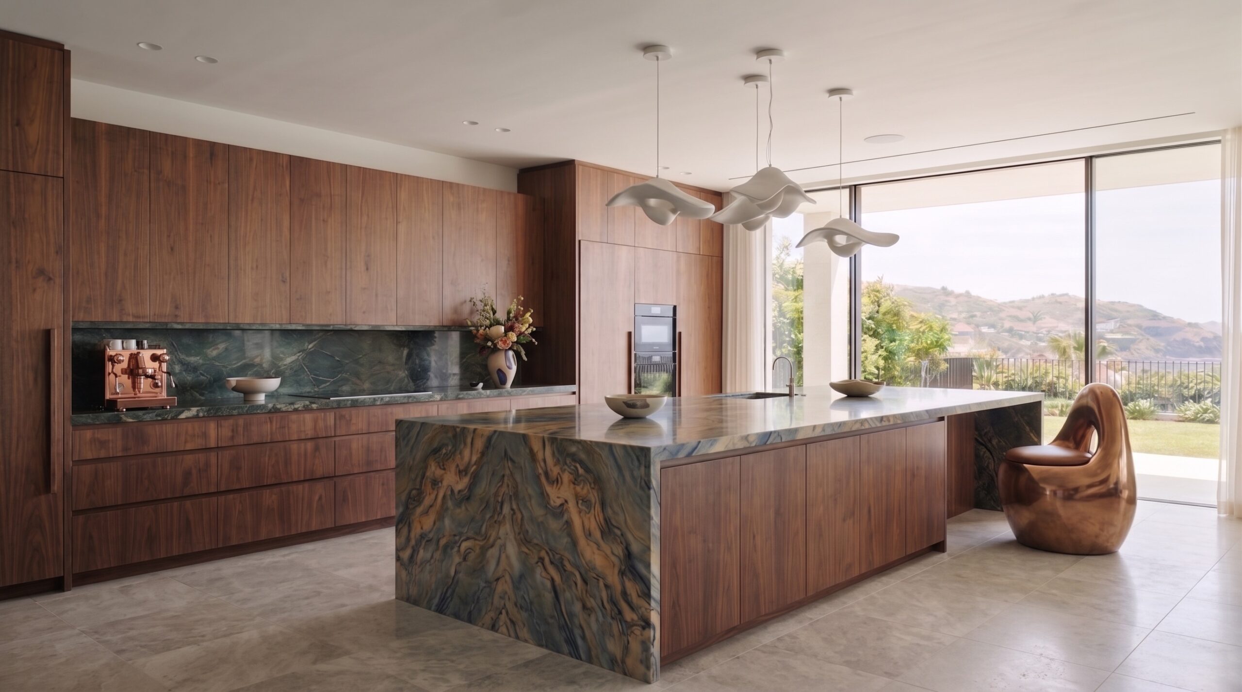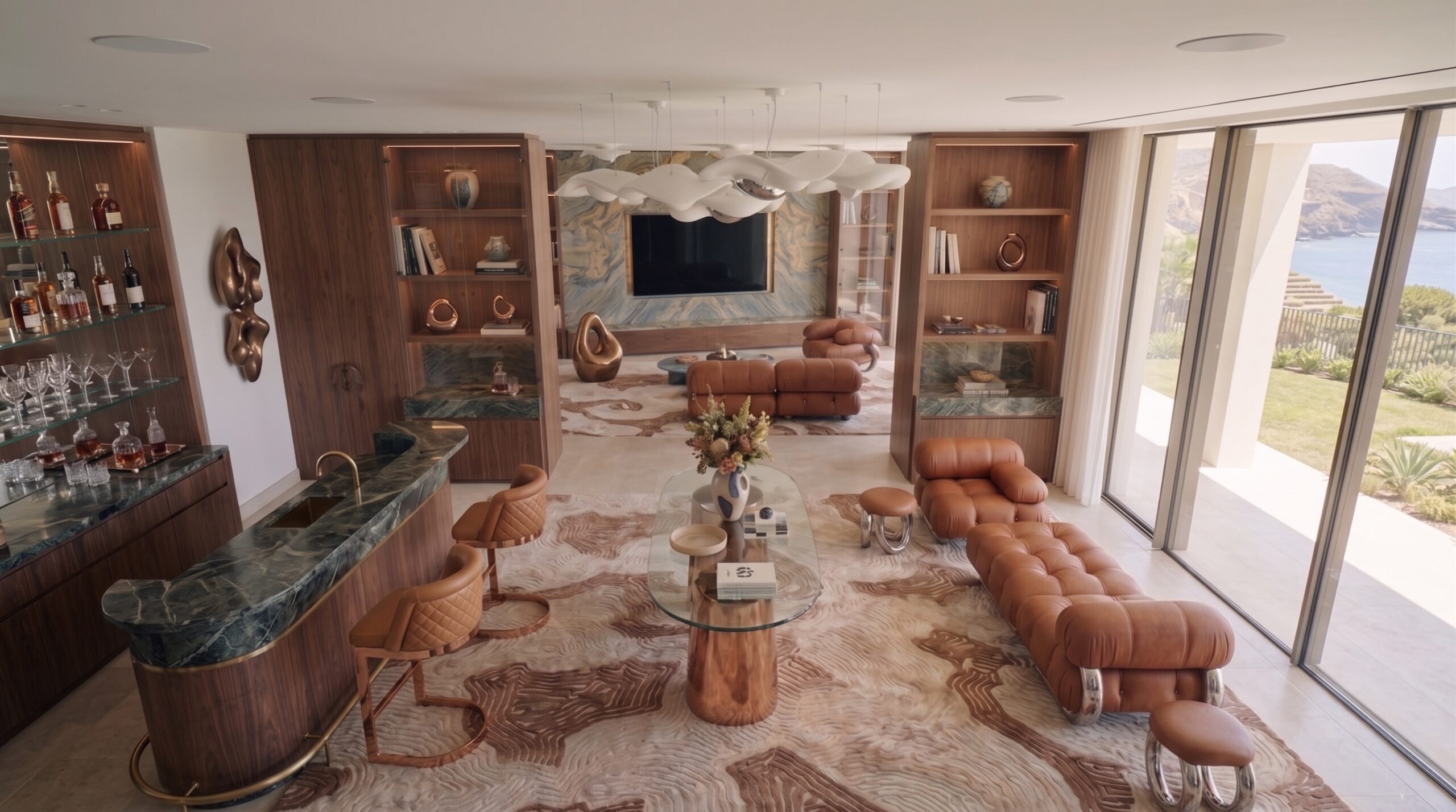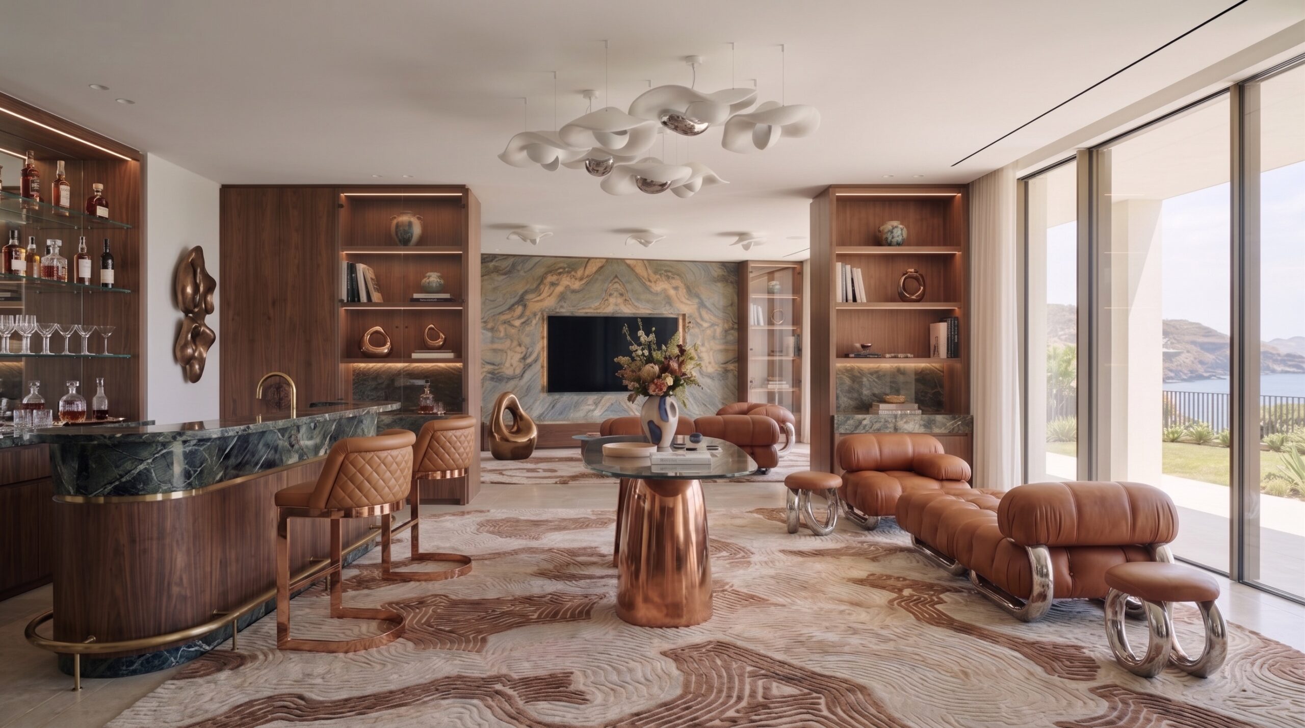 Organik formlu deri oturma elemanları, heykelsi tekil koltuklar, masif ahşap depolama üniteleri ve doğal taş orta sehpalar mekânın karakterini belirler. Mutfakta kullanılan büyük ölçekli taş ada, entegre ahşap dolap sistemleri ve sade hatlı aydınlatmalar ile birlikte hem görsel süreklilik hem de işlevsellik sağlanır.