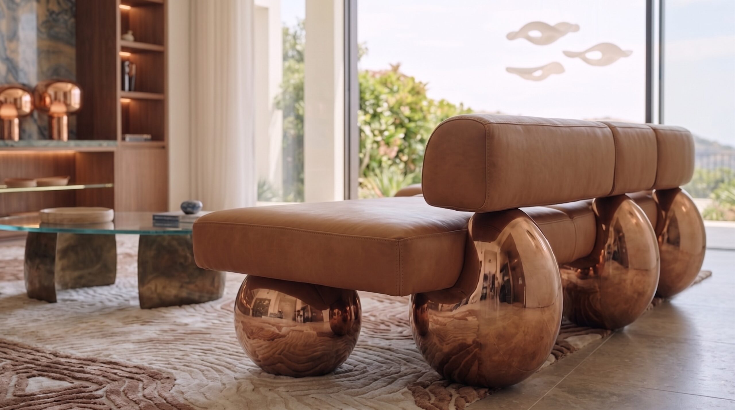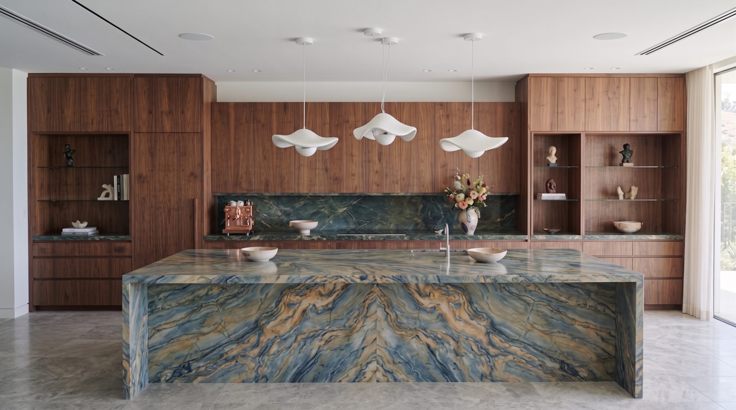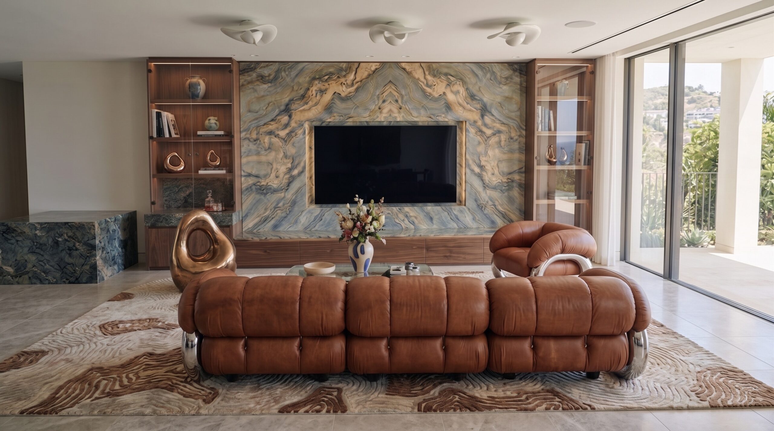Organik formlu deri oturma elemanları, heykelsi tekil koltuklar, masif ahşap depolama üniteleri ve doğal taş orta sehpalar mekânın karakterini belirler. Mutfakta kullanılan büyük ölçekli taş ada, entegre ahşap dolap sistemleri ve sade hatlı aydınlatmalar ile birlikte hem görsel süreklilik hem de işlevsellik sağlanır.