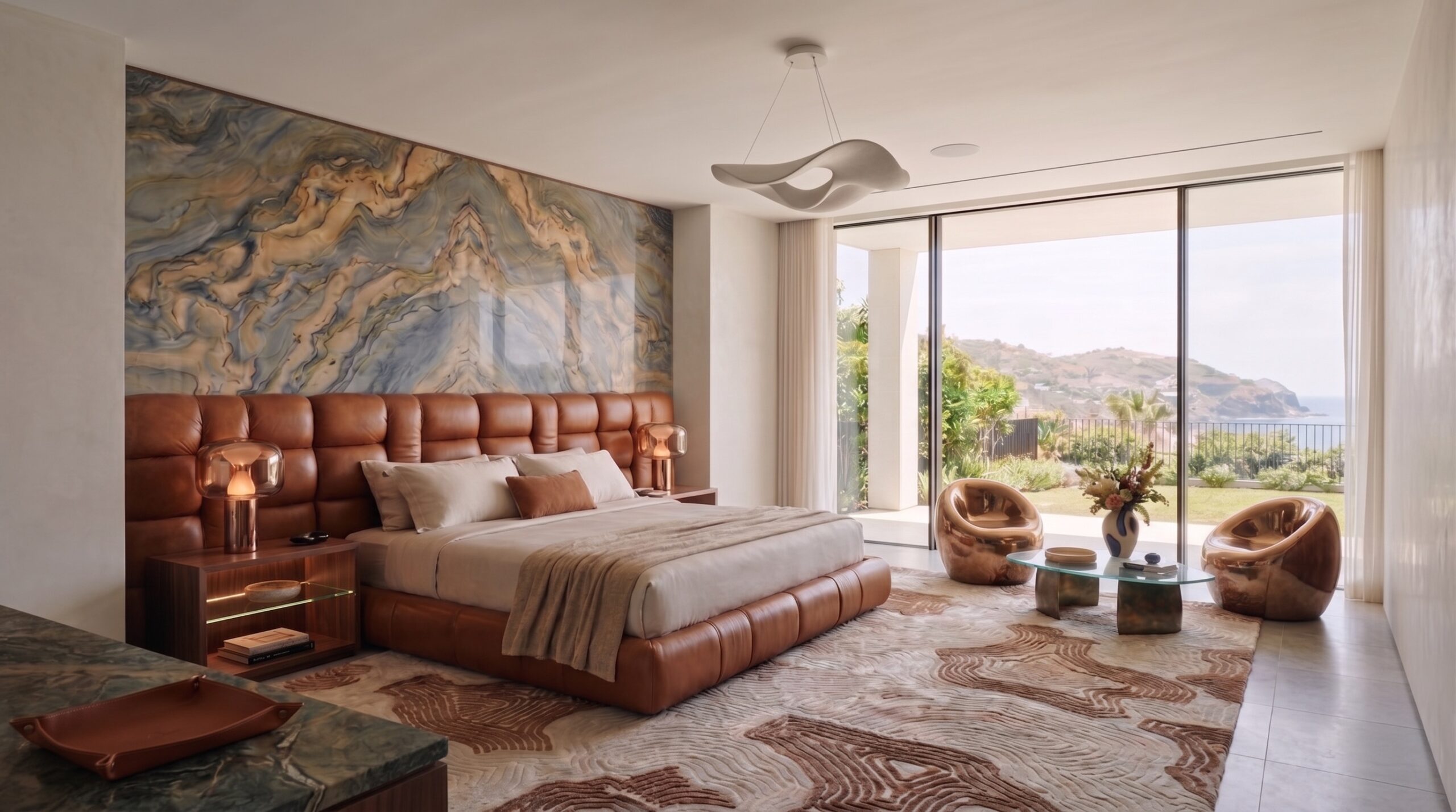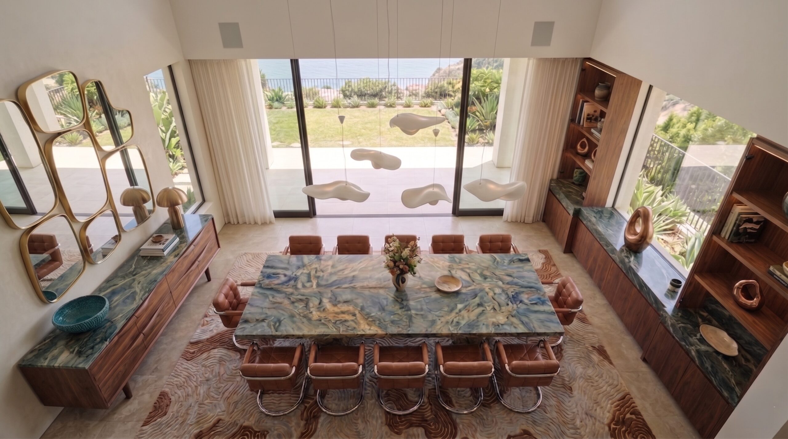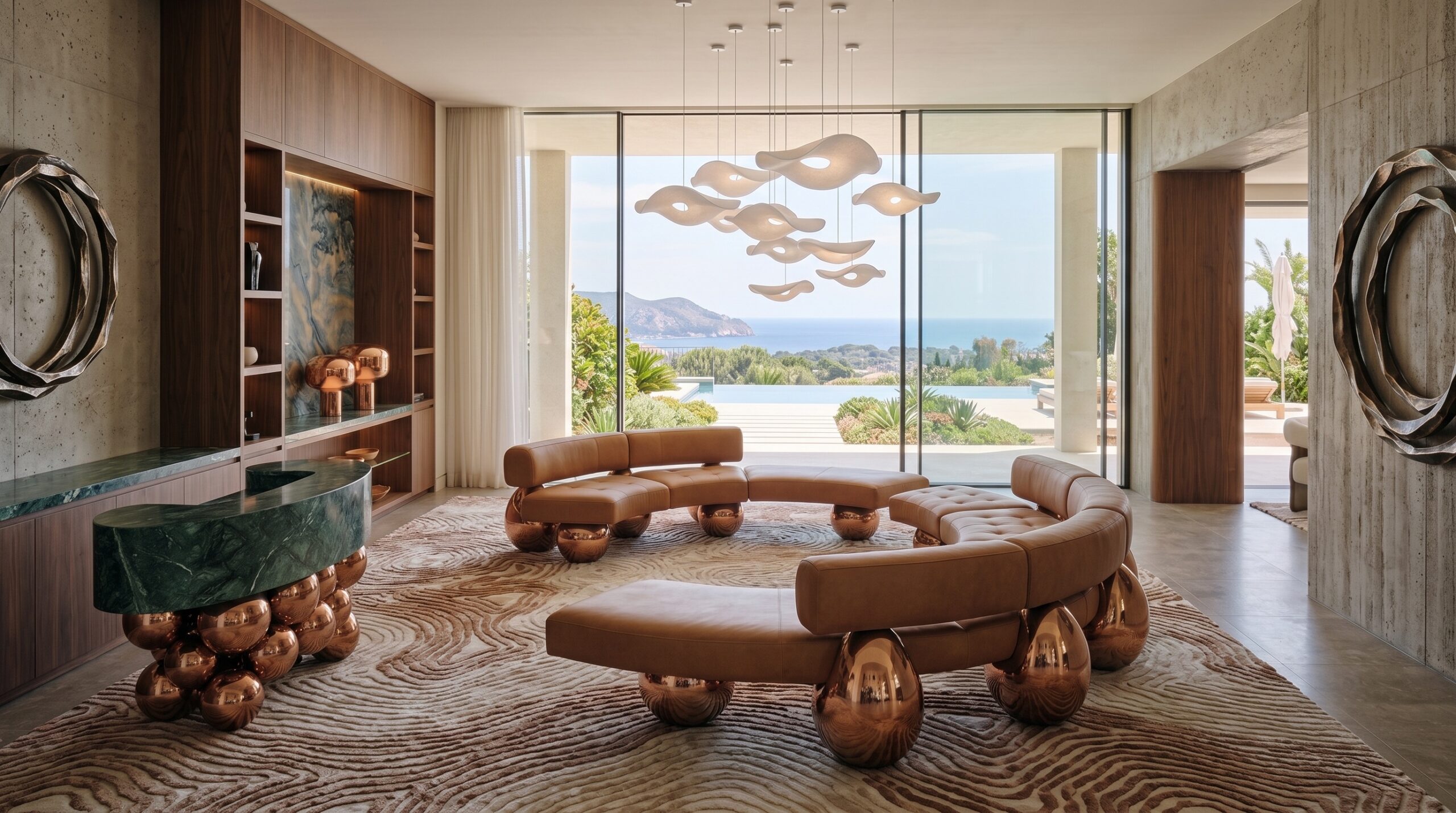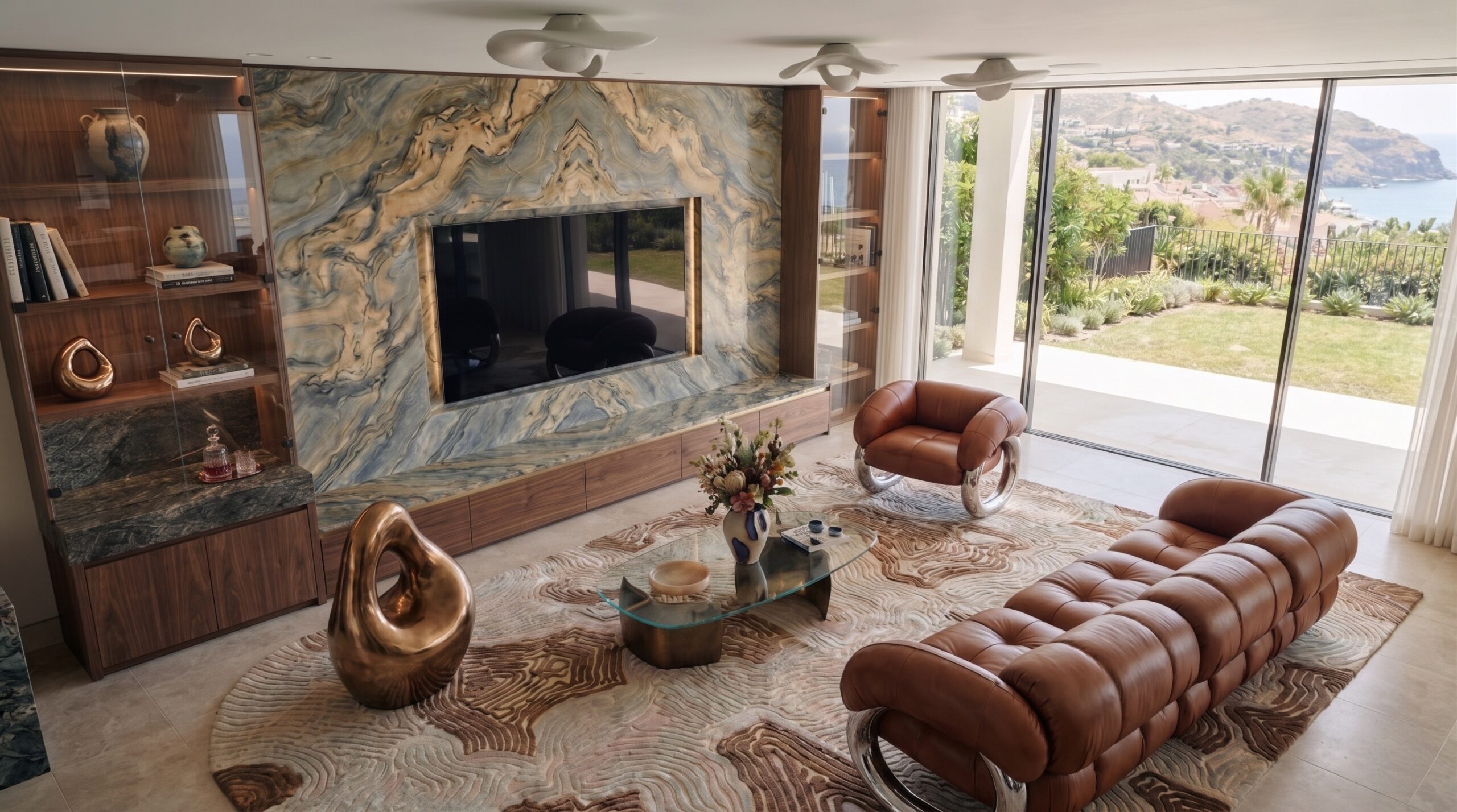 Doğal malzemeler ile çağdaş mobilya tasarımının birleşimi, mekânı manzara ile bütünleşen, zamansız ve yüksek konforlu bir yaşam alanına dönüştürür.