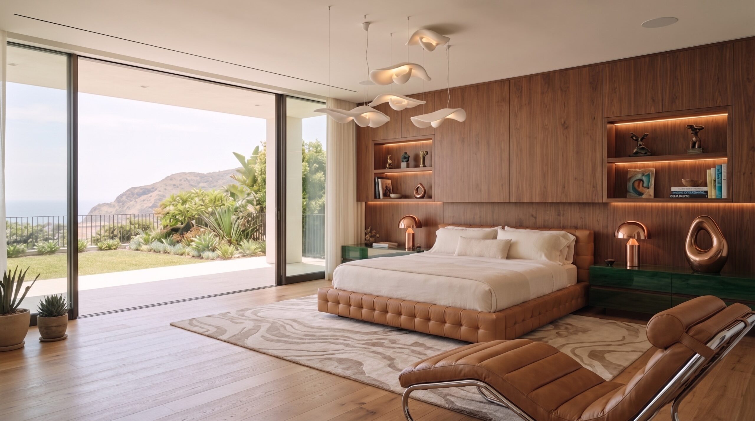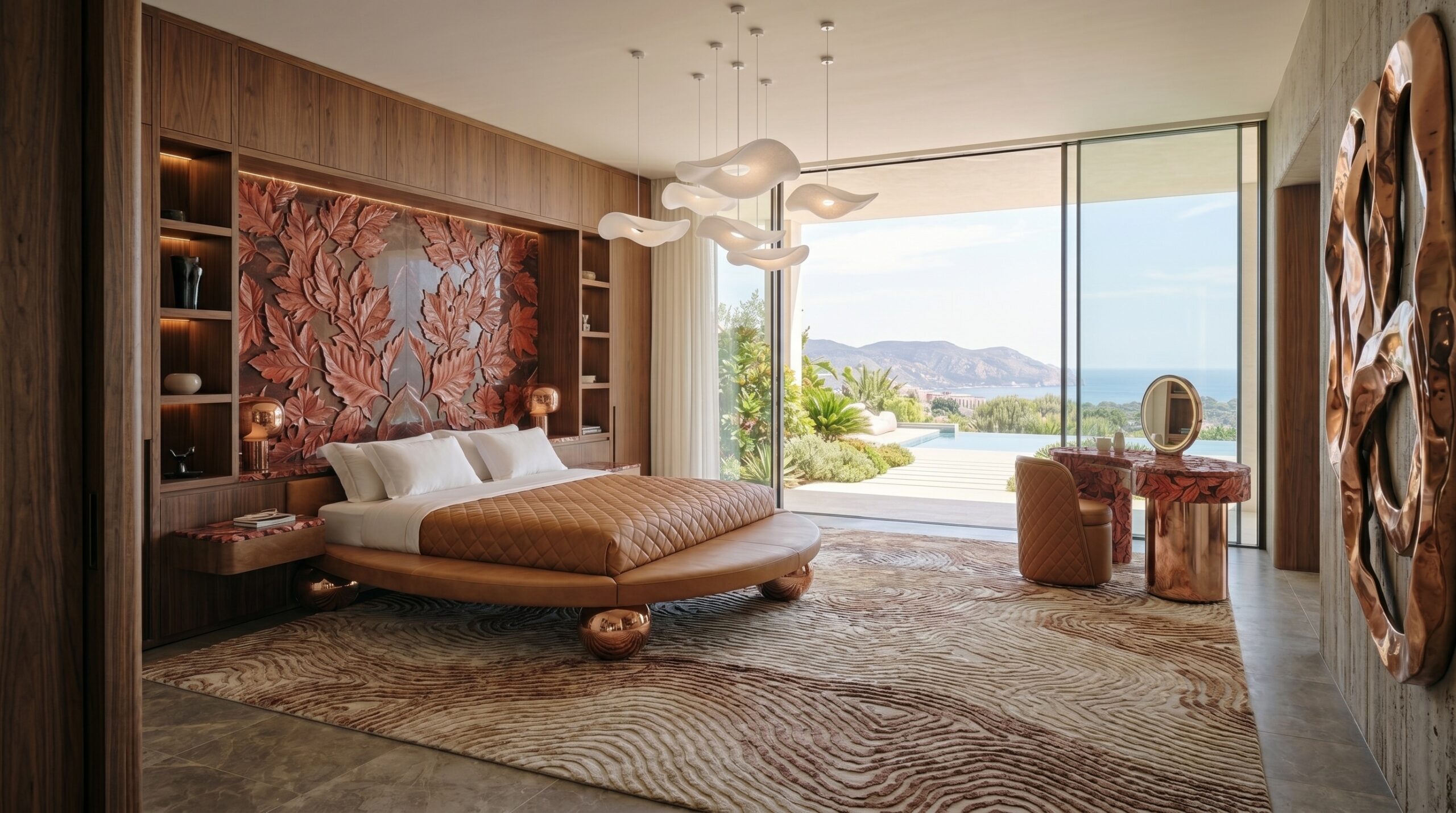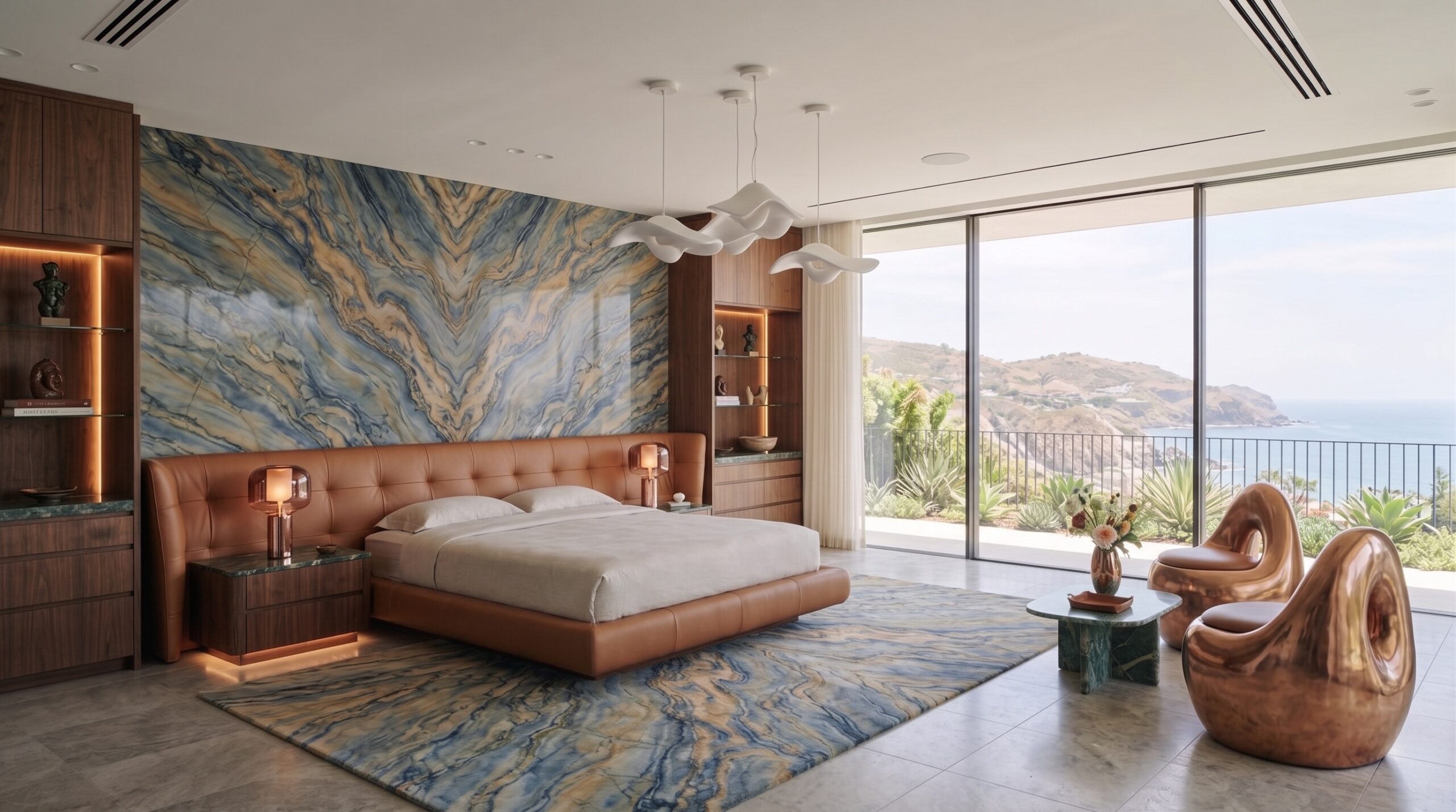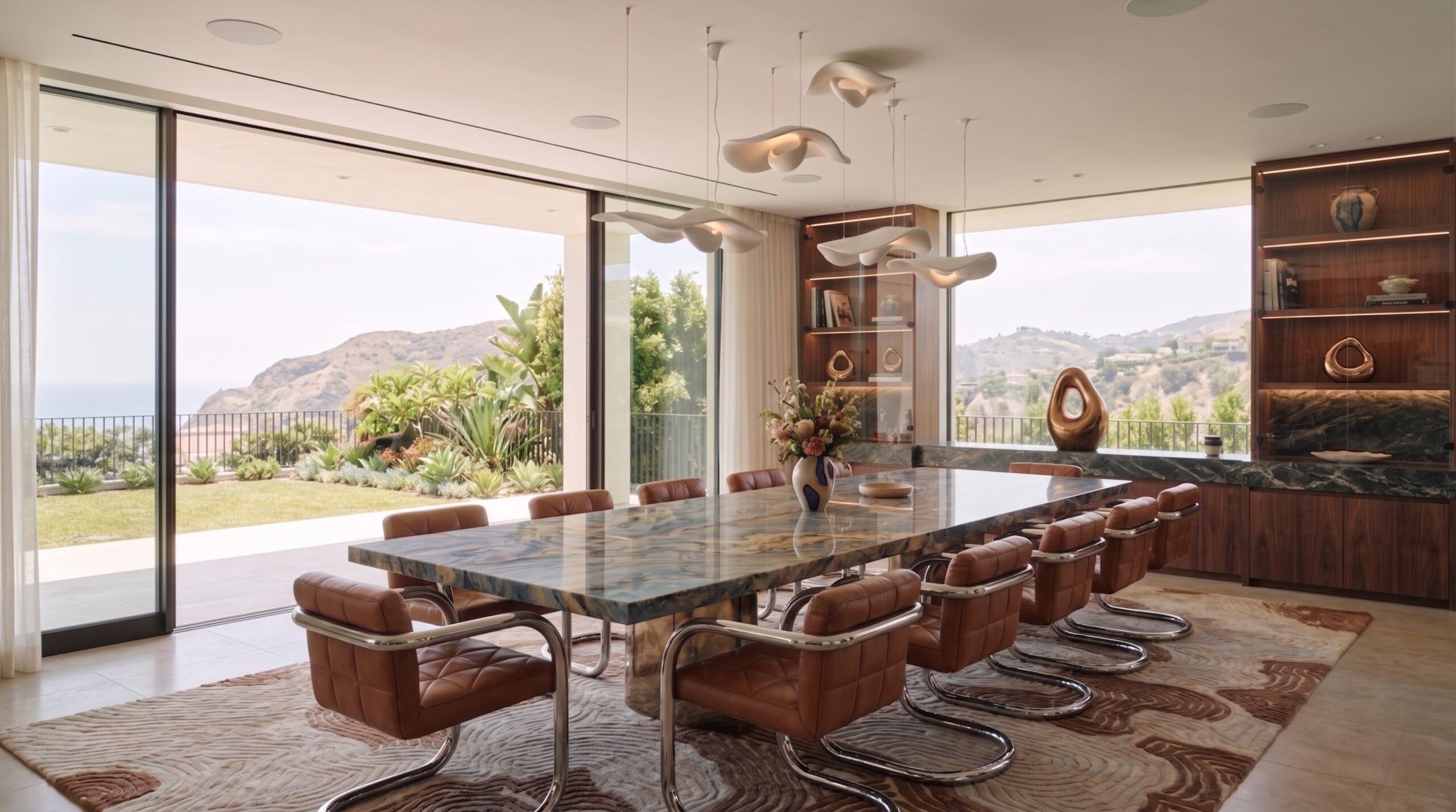 Doğal malzemeler ile çağdaş mobilya tasarımının birleşimi, mekânı manzara ile bütünleşen, zamansız ve yüksek konforlu bir yaşam alanına dönüştürür.