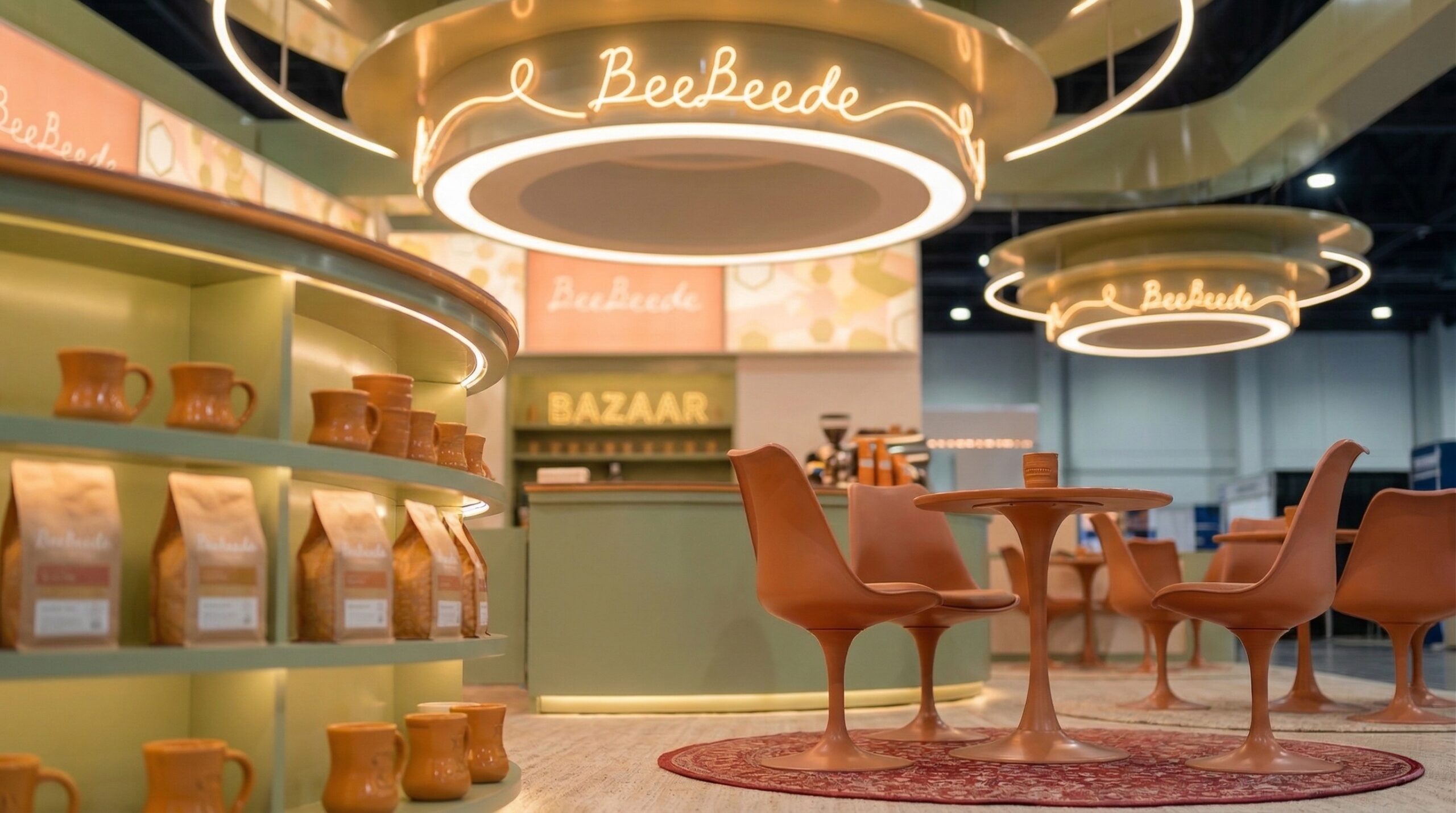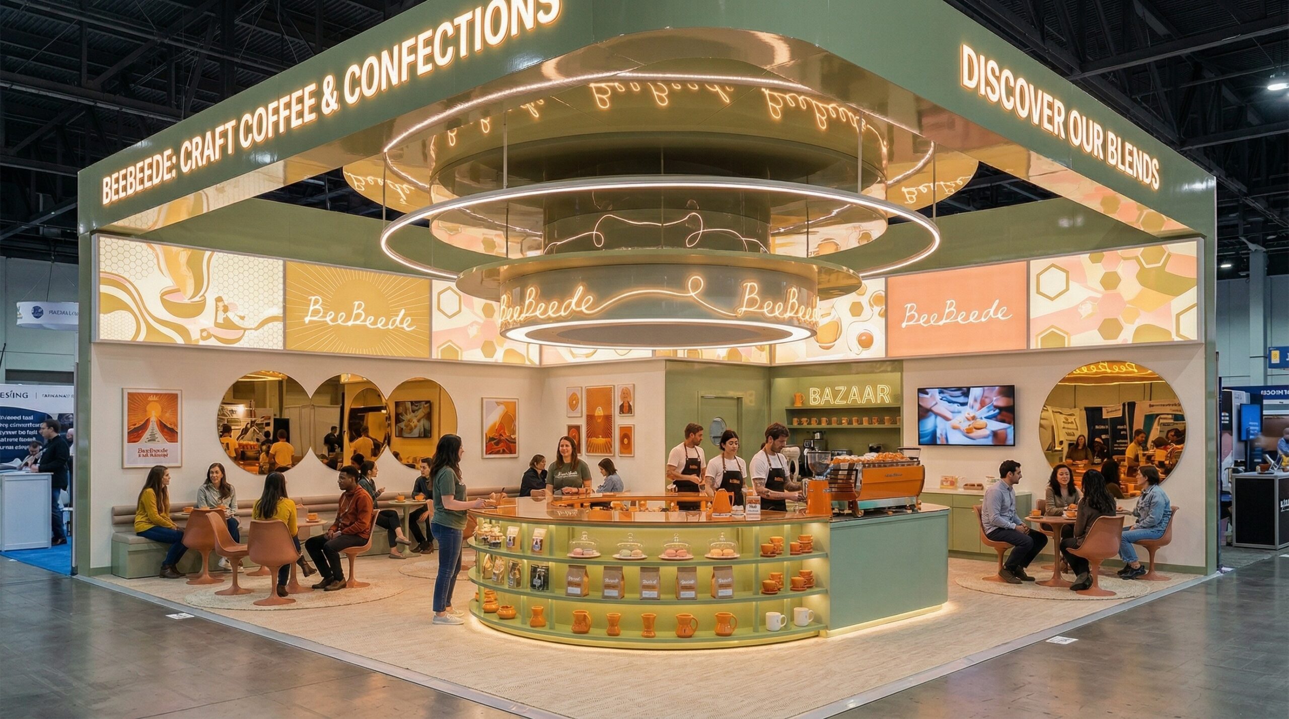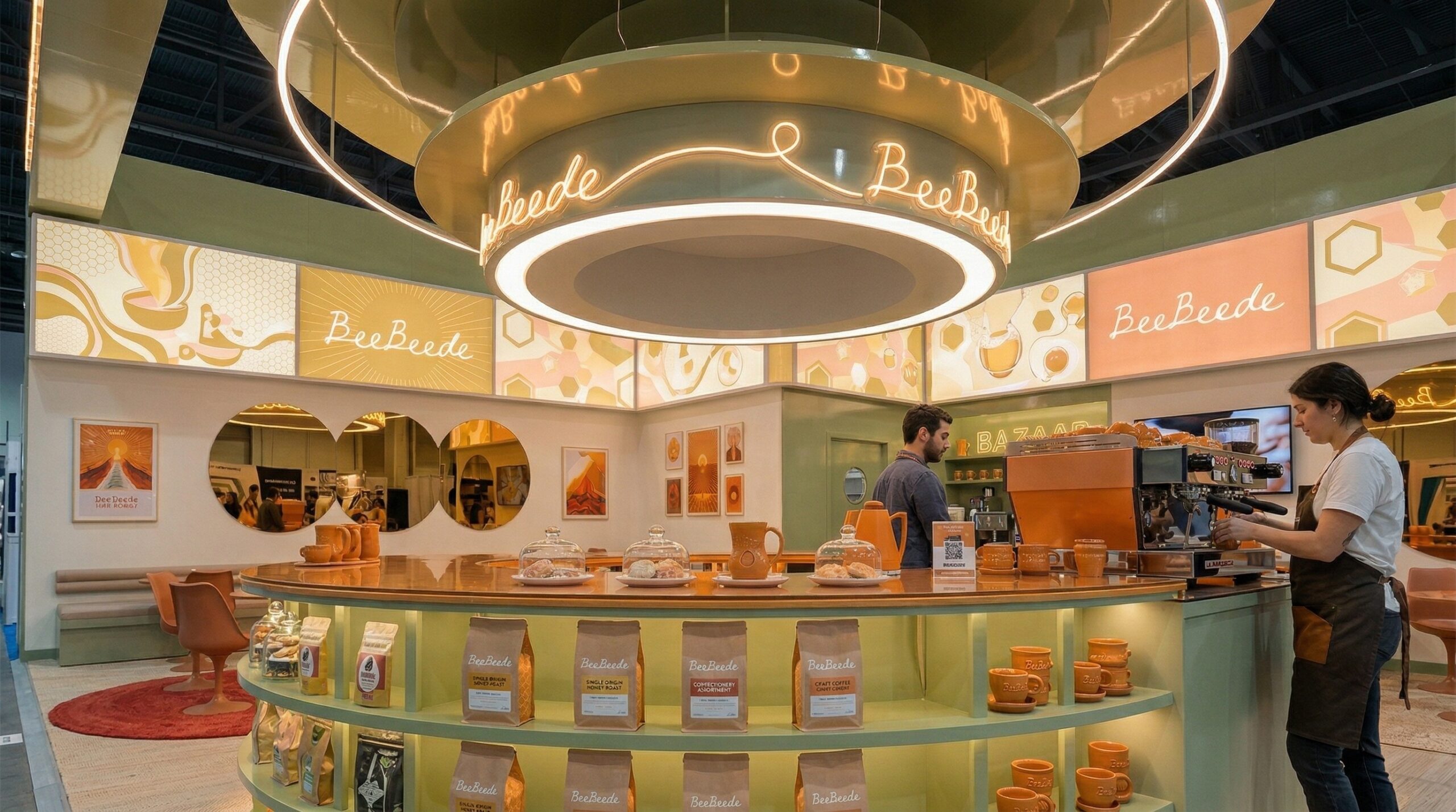 Sıcak pastel tonlar ve yuvarlatılmış formlar ile kurgulanan bu fuar standı, markayı deneyim odaklı bir kafe atmosferi üzerinden sunar. Merkezi dairesel bar, mekânın ana odağını oluştururken; etrafında gelişen oturma ve ürün sergileme alanları kullanıcıyı içeri davet eden akışkan bir plan oluşturur.
