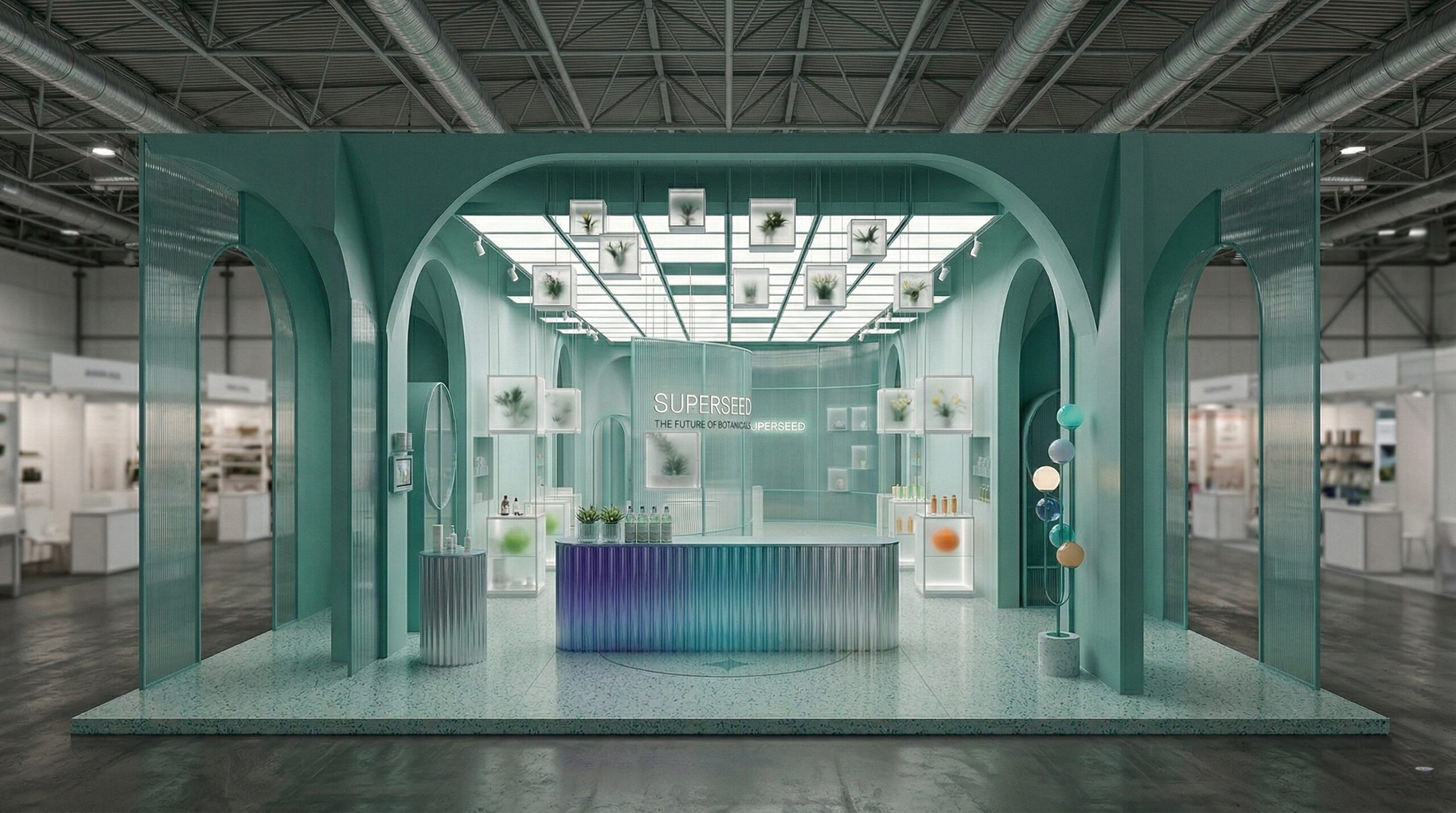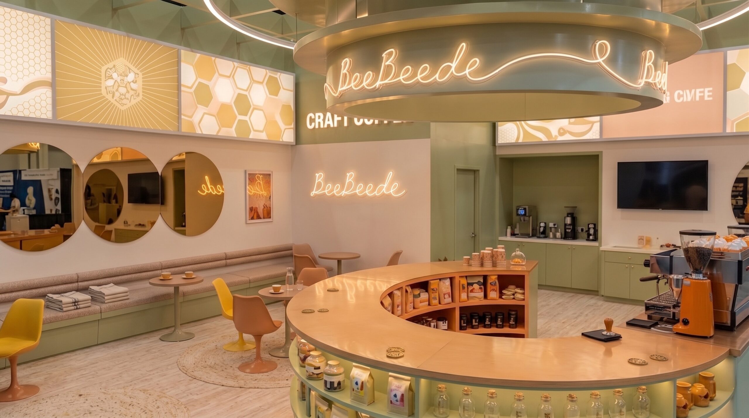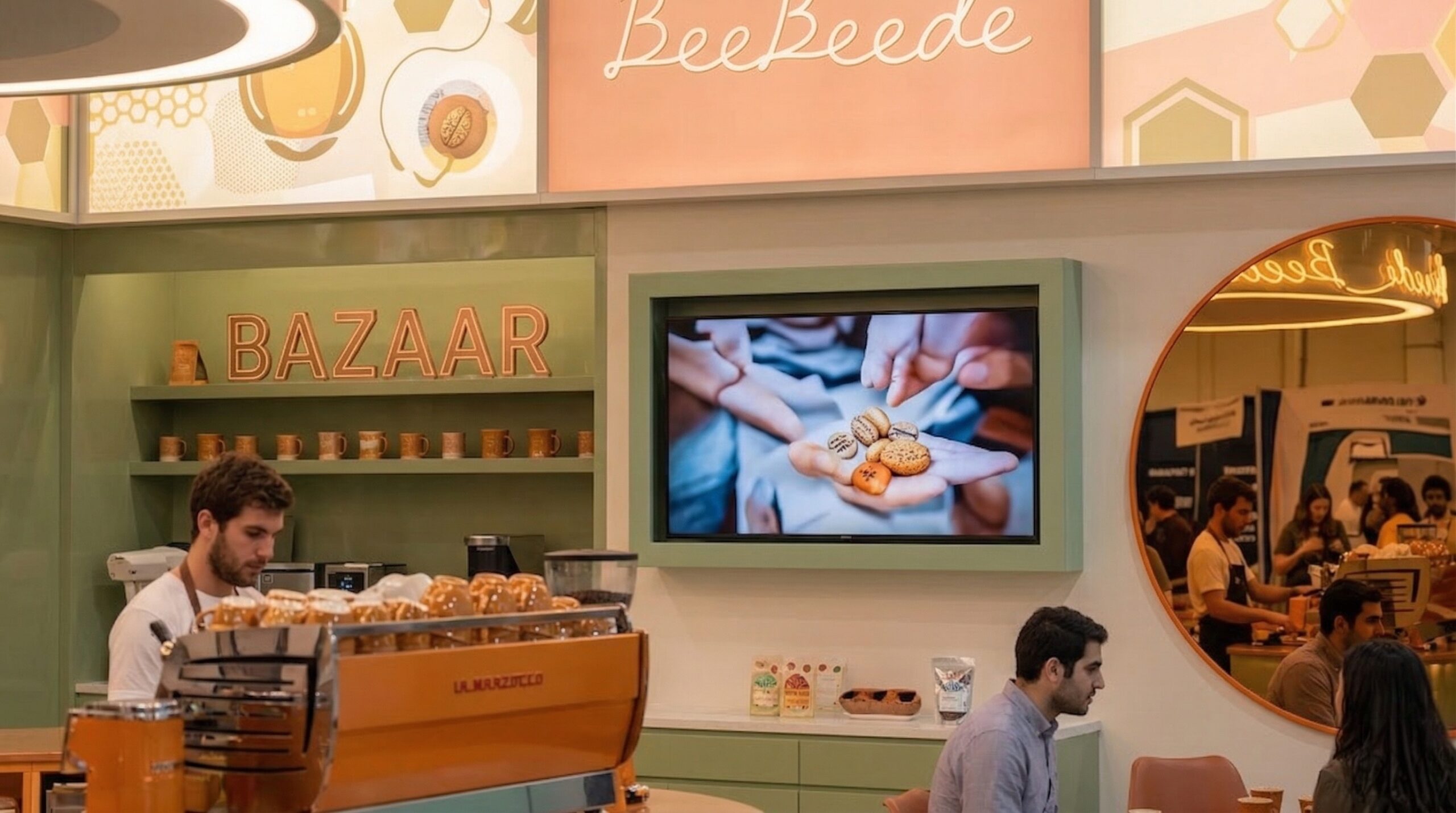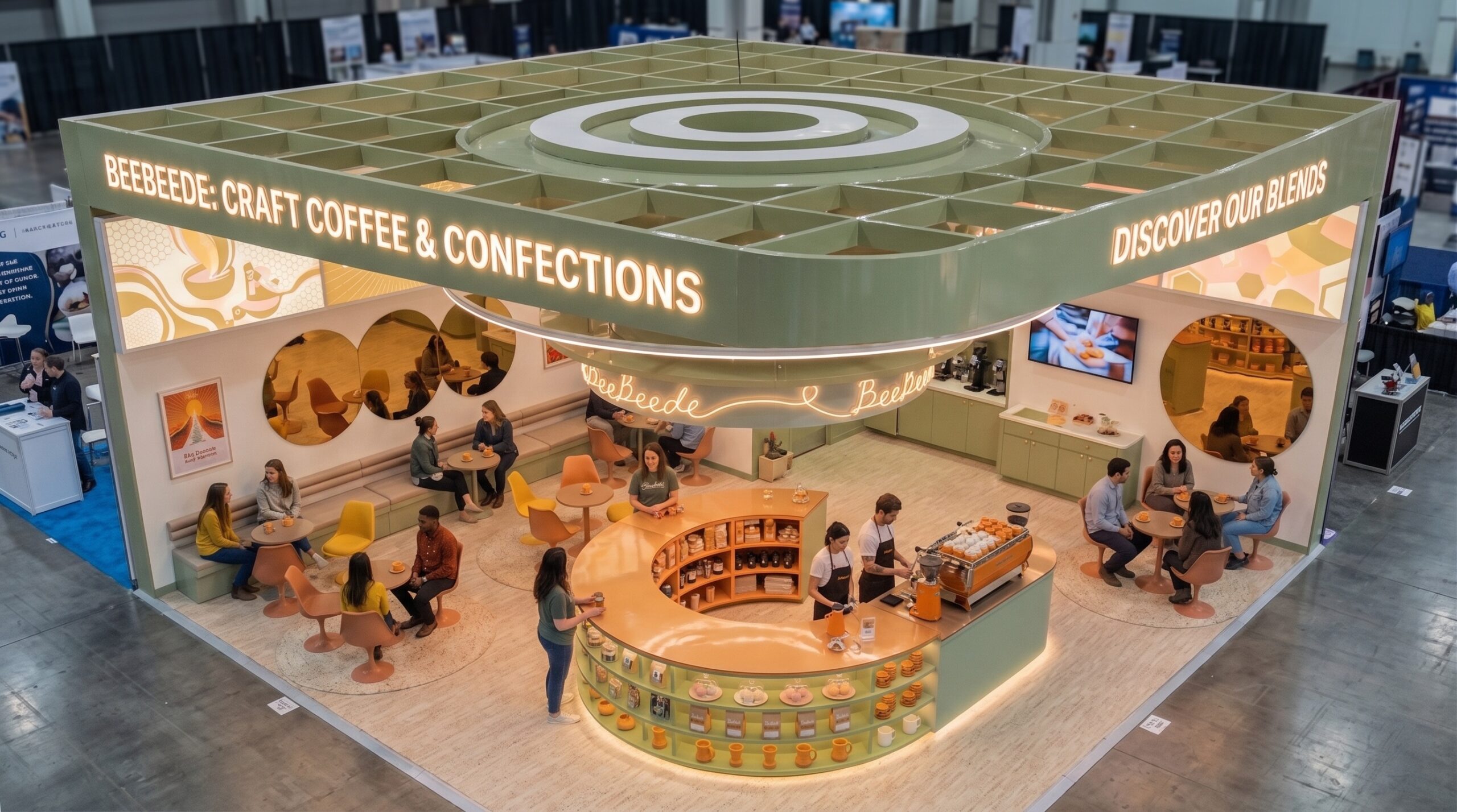 Sıcak pastel tonlar ve yuvarlatılmış formlar ile kurgulanan bu fuar standı, markayı deneyim odaklı bir kafe atmosferi üzerinden sunar. Merkezi dairesel bar, mekânın ana odağını oluştururken; etrafında gelişen oturma ve ürün sergileme alanları kullanıcıyı içeri davet eden akışkan bir plan oluşturur.