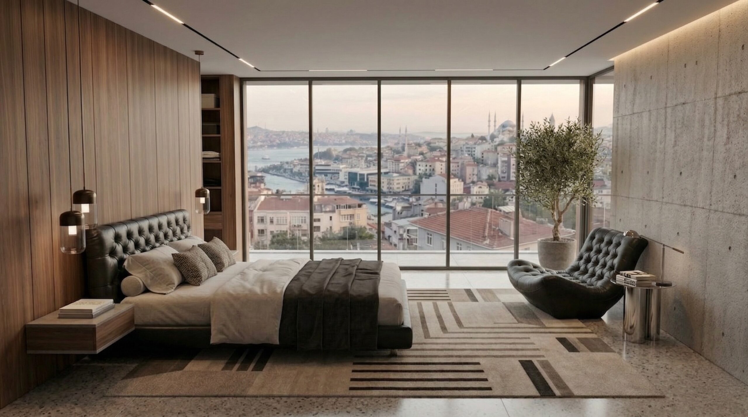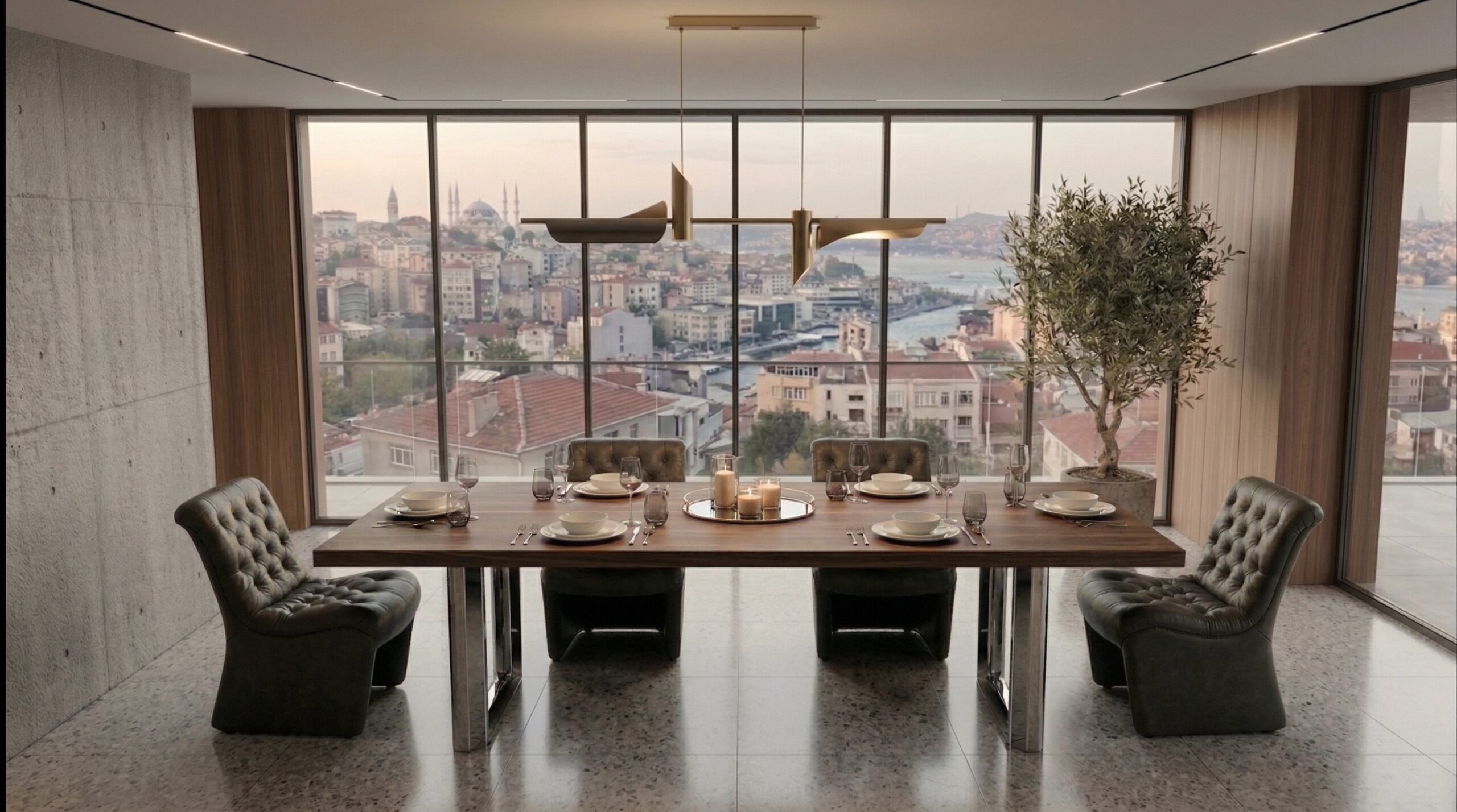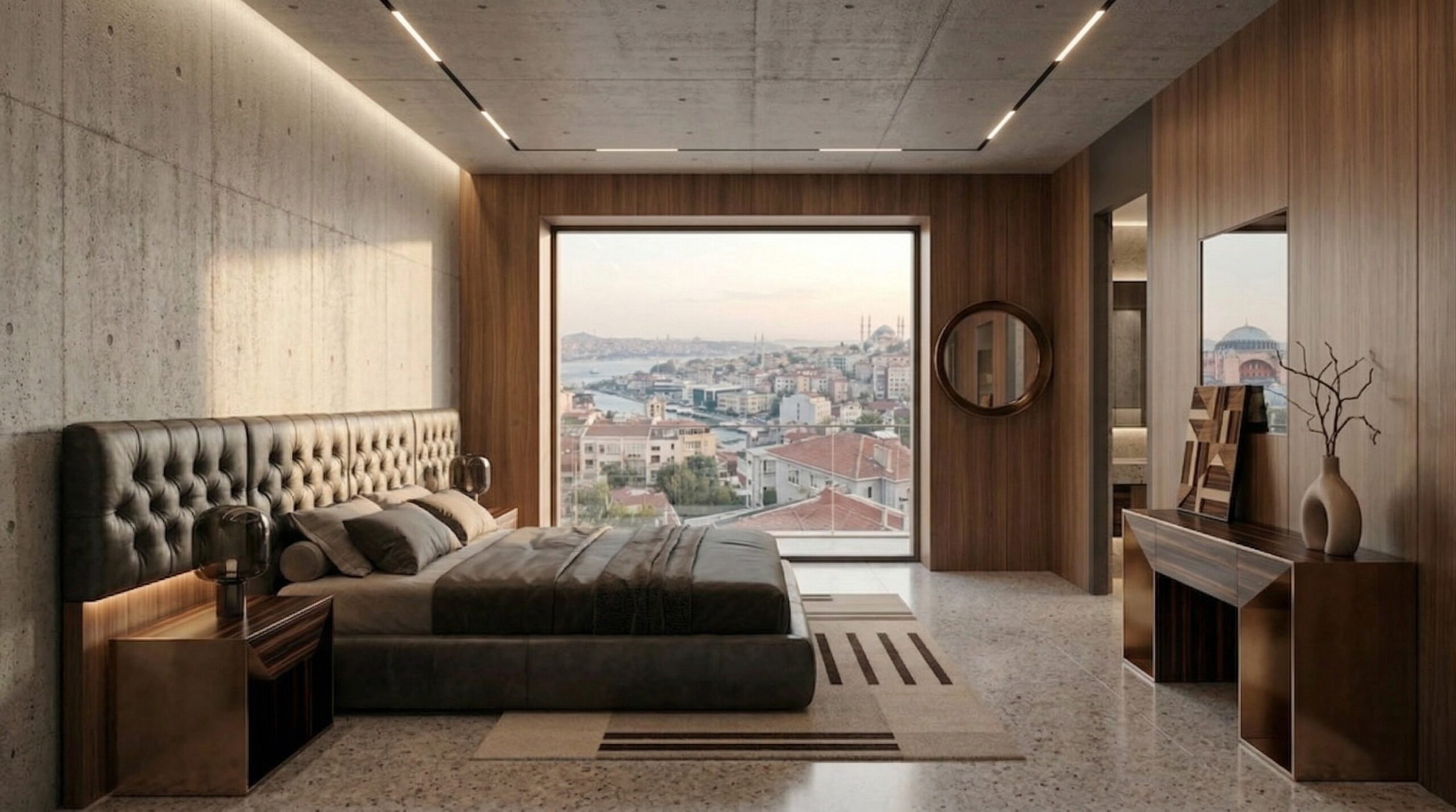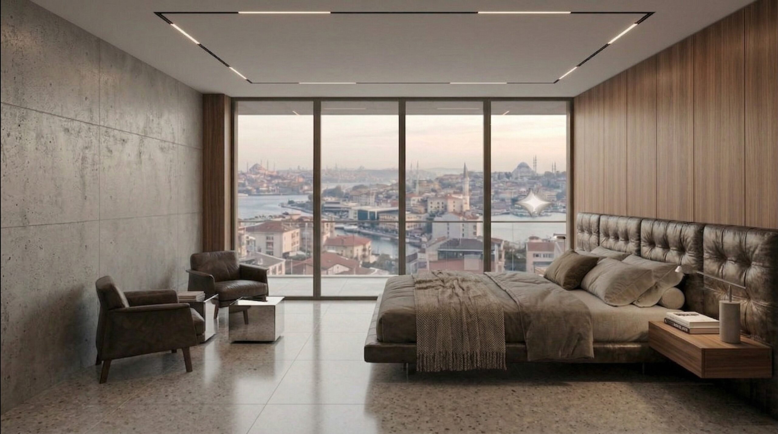 Geniş cam yüzeyler ve köşe açıklıkları, İstanbul silüetini iç mekânın ana odak noktası haline getirirken; beton yüzeyler ve doğal ahşap paneller dengeli bir kontrast oluşturur. Chesterfield karakterli deri oturma grupları, masif ahşap yemek masası ve sade formlu yatak tasarımı mekâna güçlü bir duruş kazandırır. Taş zeminler, lineer tavan aydınlatmaları ve metal detaylar, modern ve zamansız bir atmosfer oluştururken; kullanılan doğal malzemeler mekânsal sürekliliği destekler.
