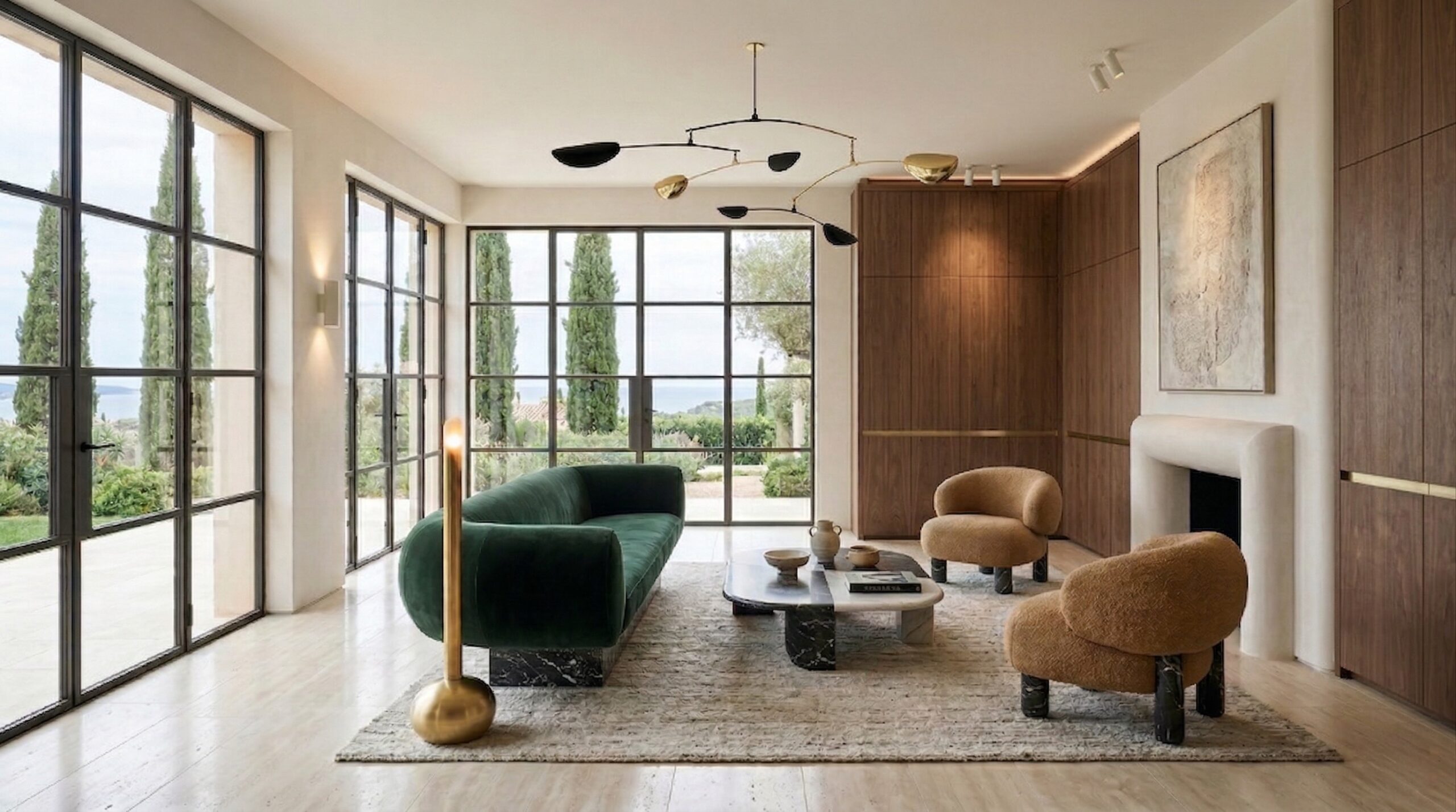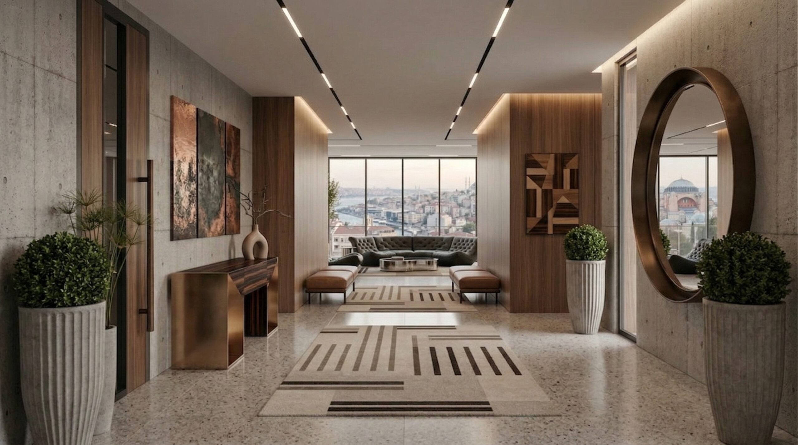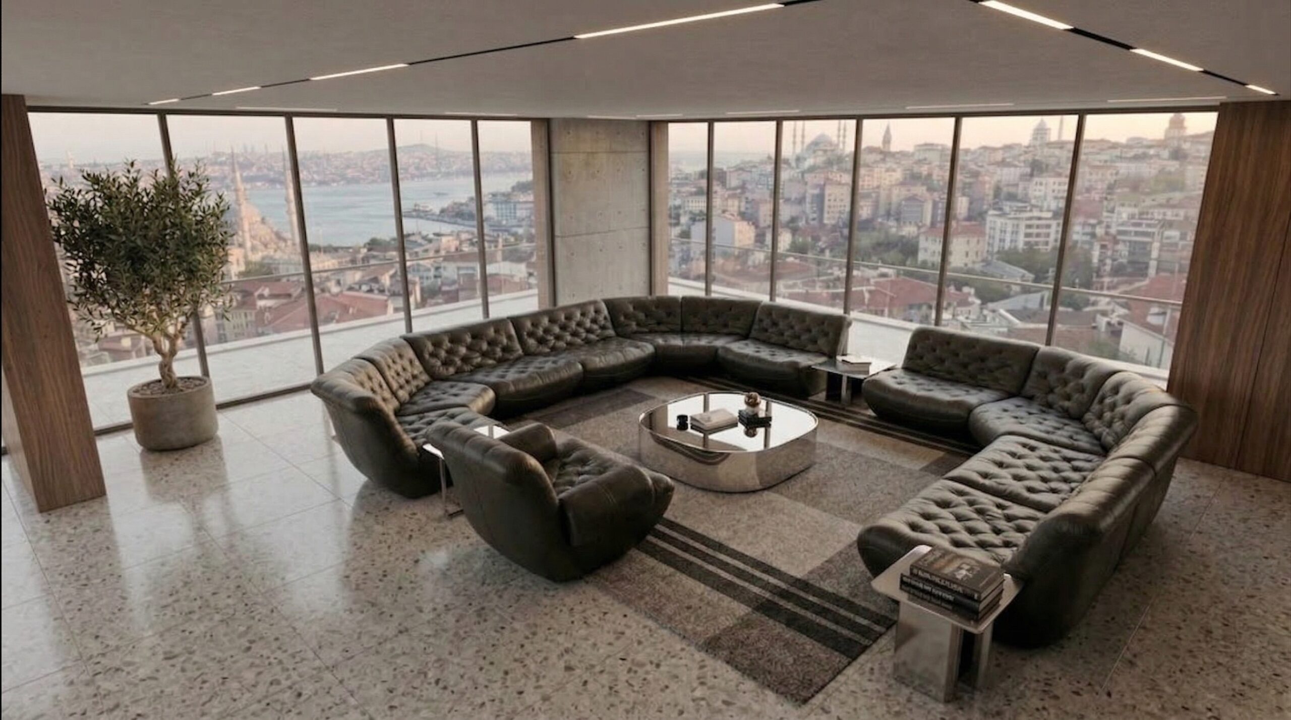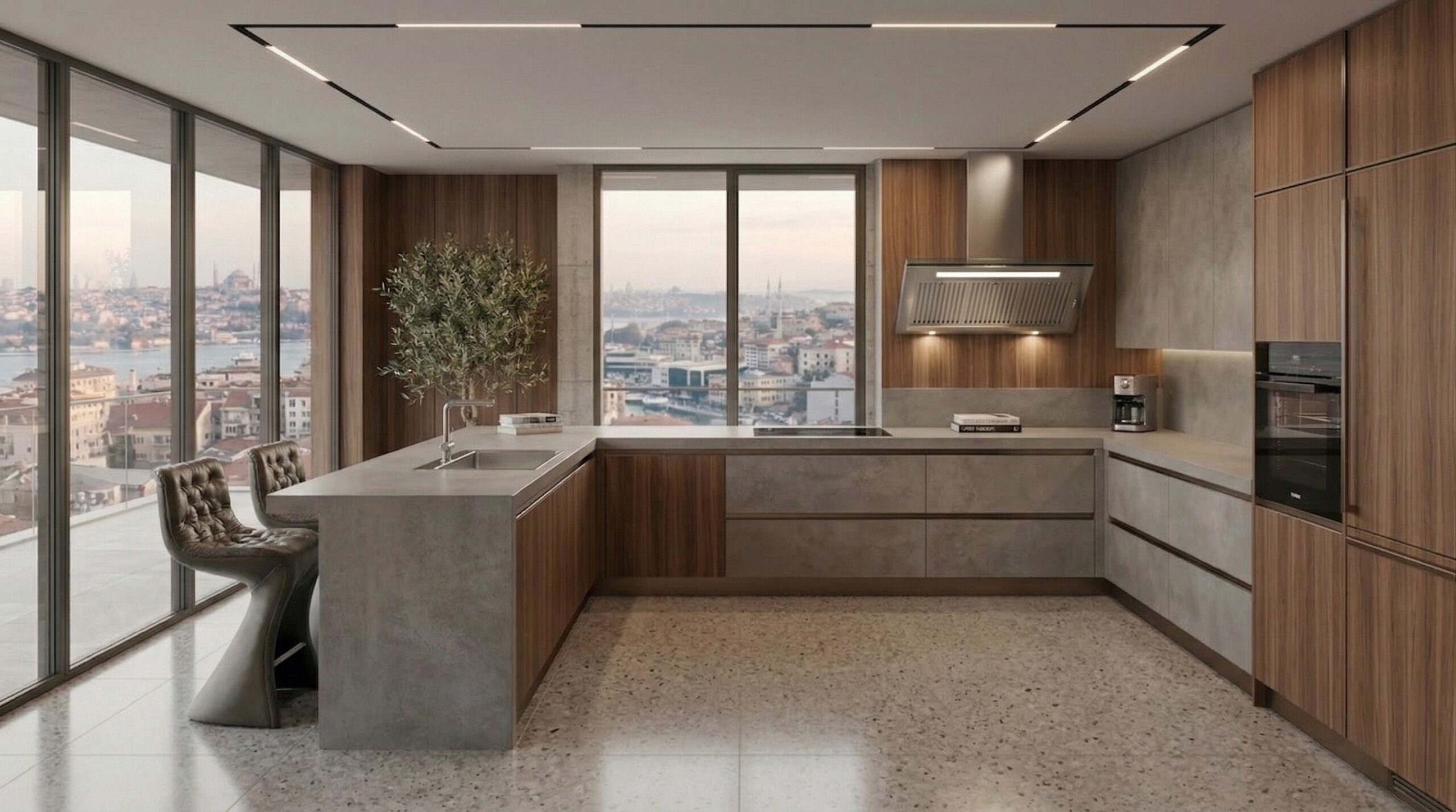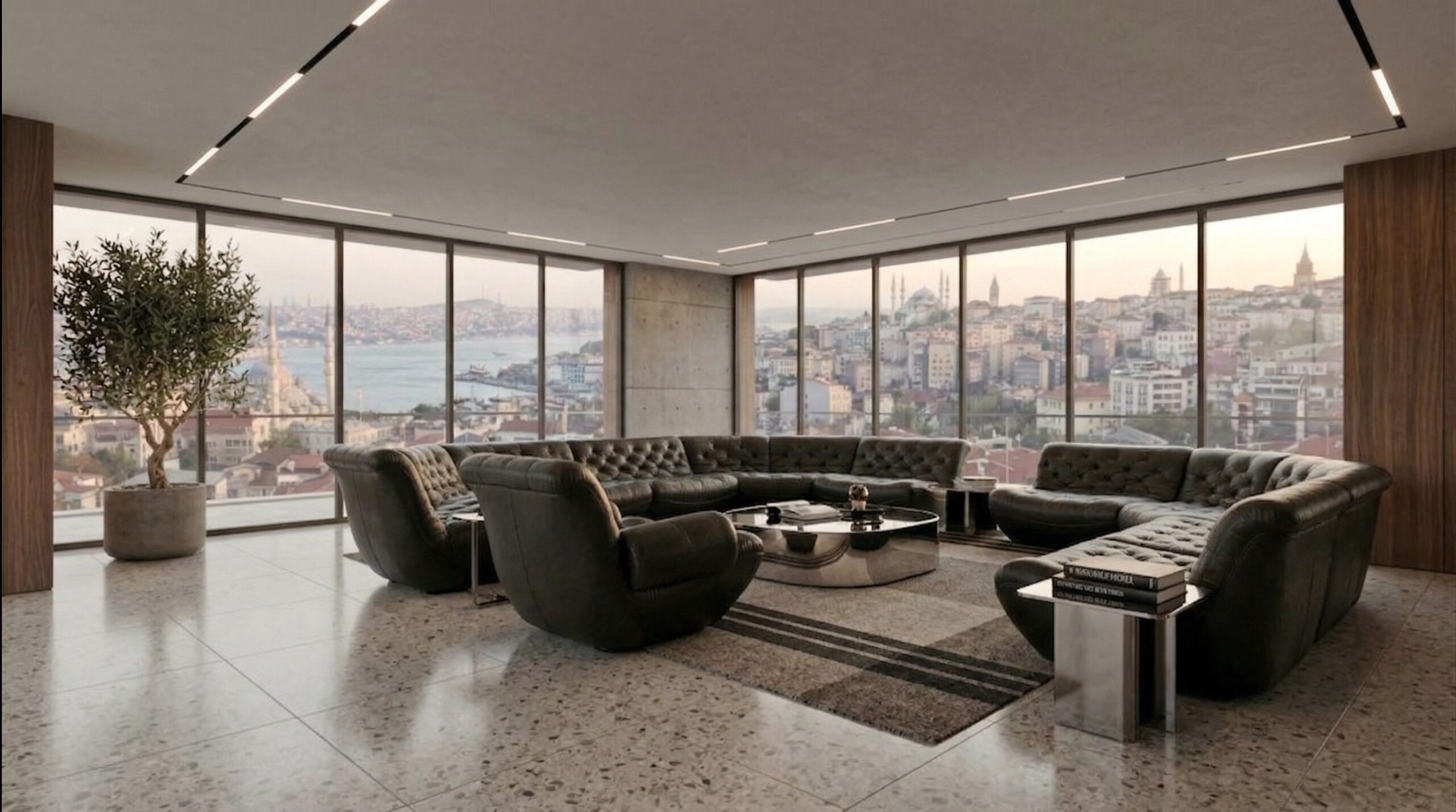 Geniş cam yüzeyler ve köşe açıklıkları, İstanbul silüetini iç mekânın ana odak noktası haline getirirken; beton yüzeyler ve doğal ahşap paneller dengeli bir kontrast oluşturur. Chesterfield karakterli deri oturma grupları, masif ahşap yemek masası ve sade formlu yatak tasarımı mekâna güçlü bir duruş kazandırır. Taş zeminler, lineer tavan aydınlatmaları ve metal detaylar, modern ve zamansız bir atmosfer oluştururken; kullanılan doğal malzemeler mekânsal sürekliliği destekler.