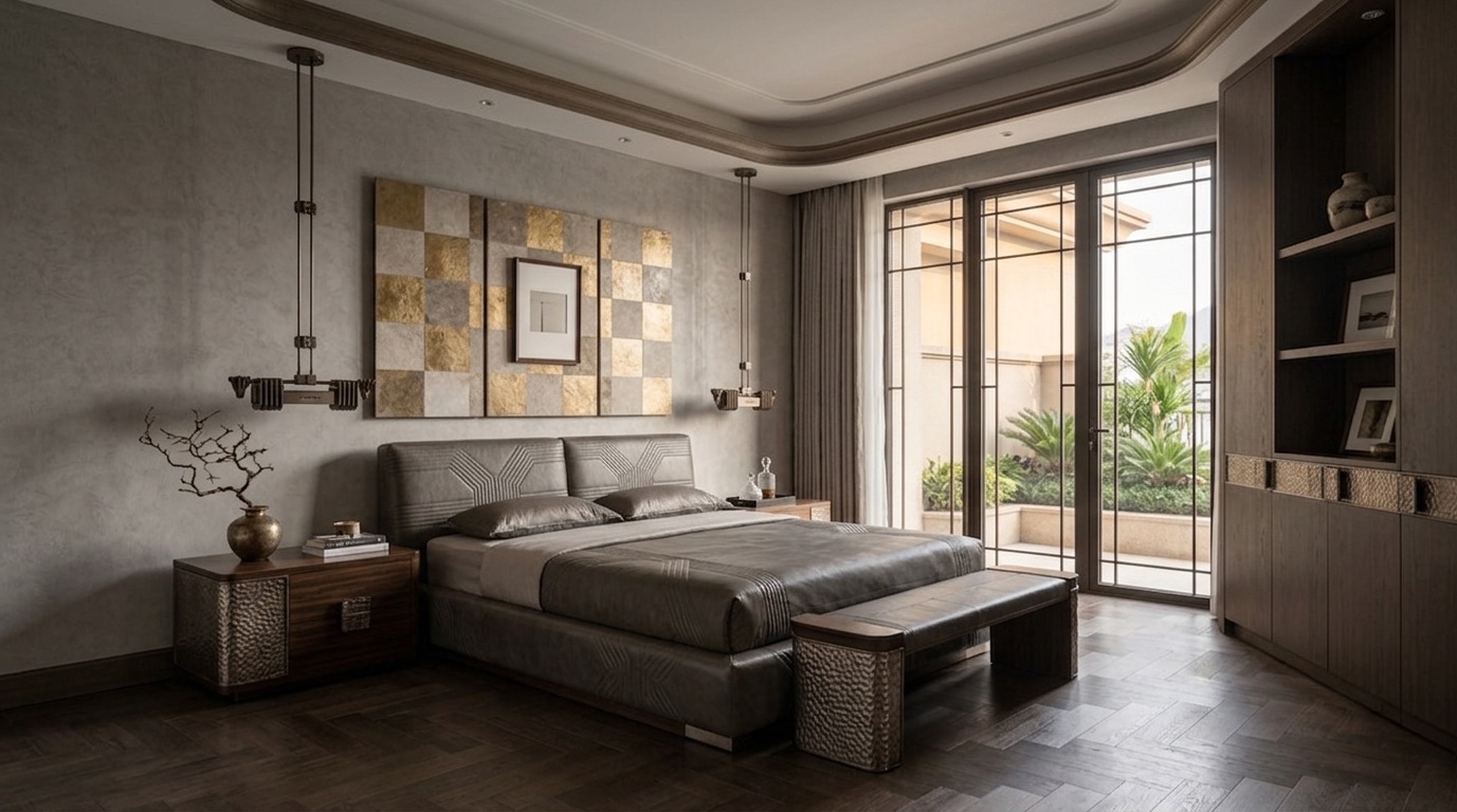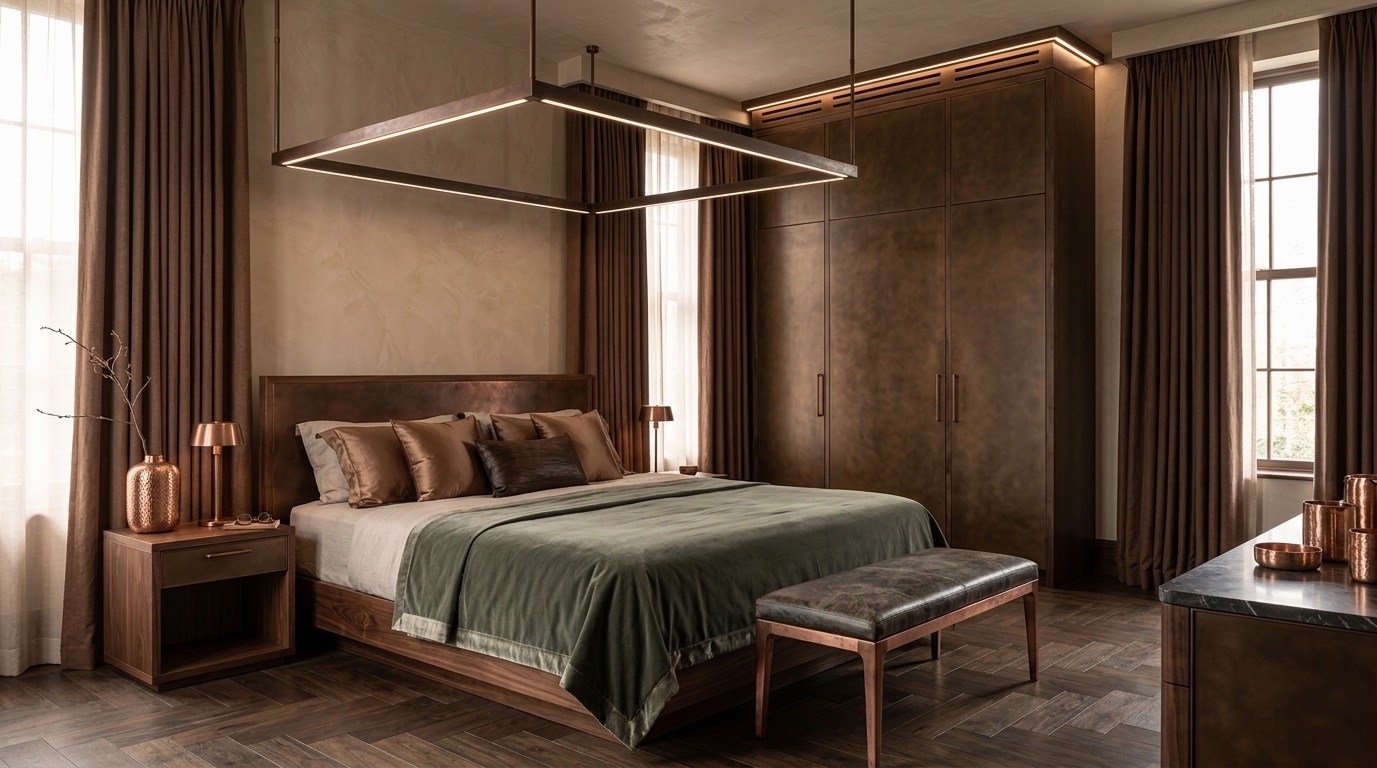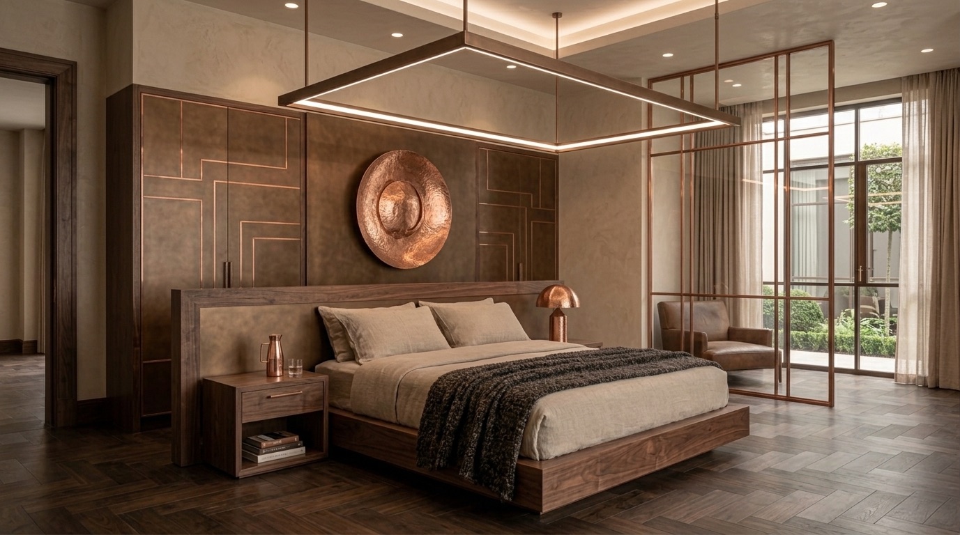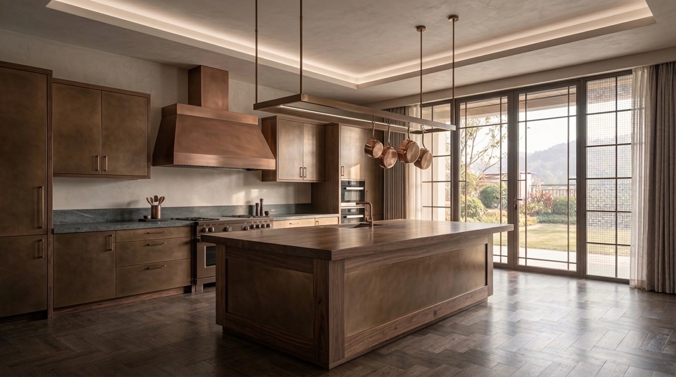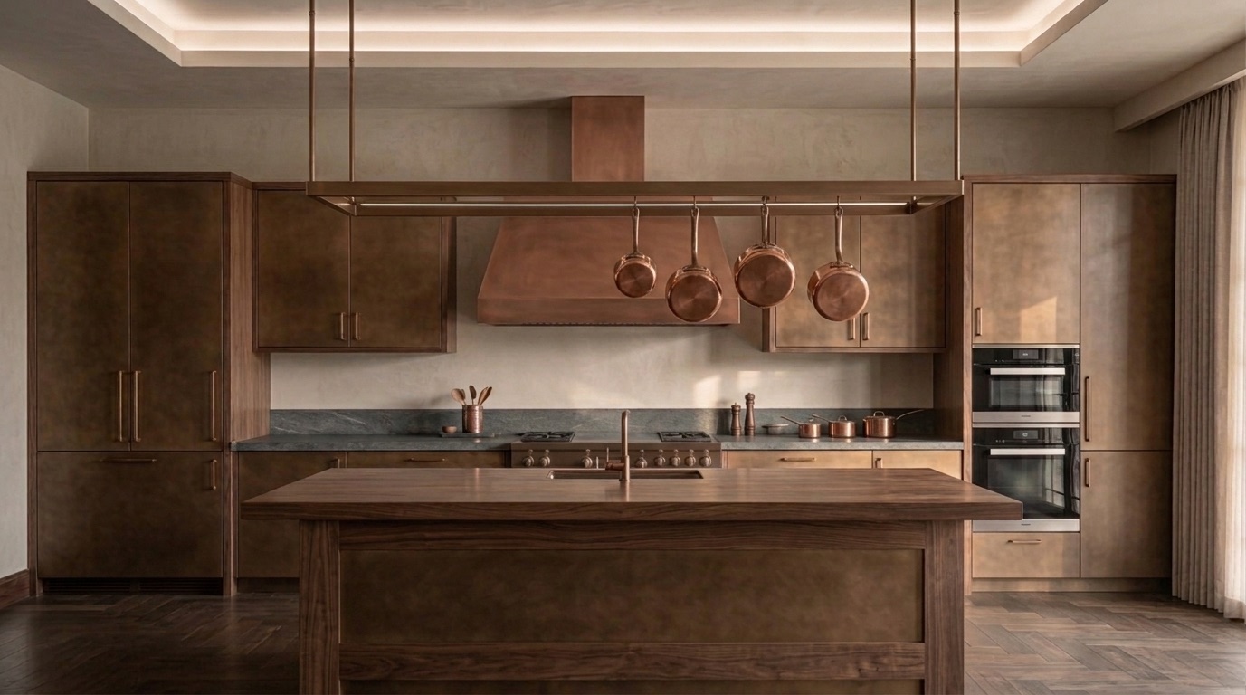Deri ve dokuma yüzeylerin birlikte kullanıldığı oturma grupları, bronz detaylı masif ahşap yemek masası, doğal taş tezgâhlı mutfak adası ve entegre depolama çözümleri mekânın karakterini tanımlar. Yatak odalarında ahşap panel duvarlar, metal çerçeveli aydınlatmalar ve yumuşak dokulu tekstiller öne çıkarken; tüm mekânda pirinç/bronze aydınlatma elemanları ve el işçiliği detaylar bütüncül bir malzeme dili kurar.