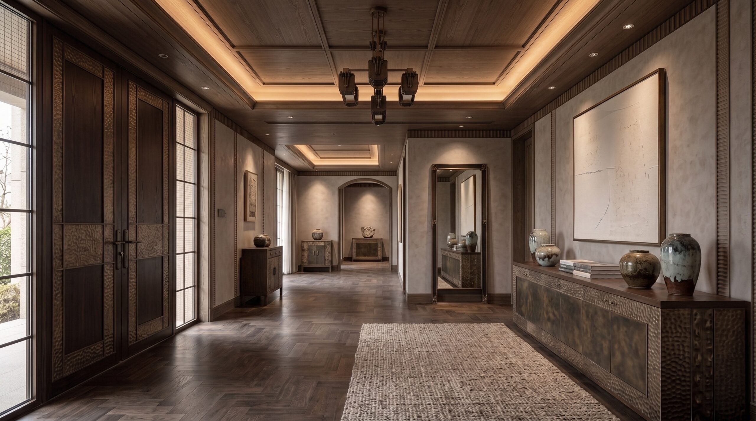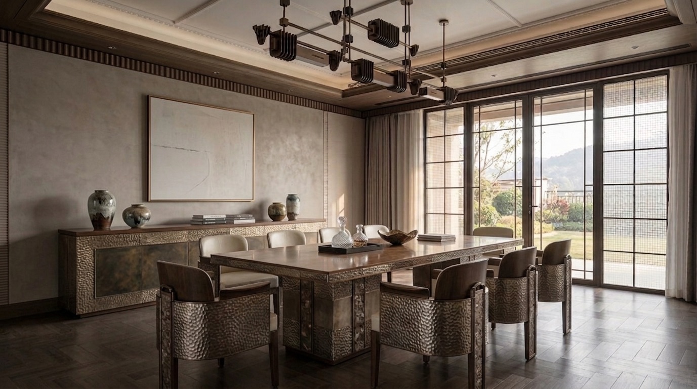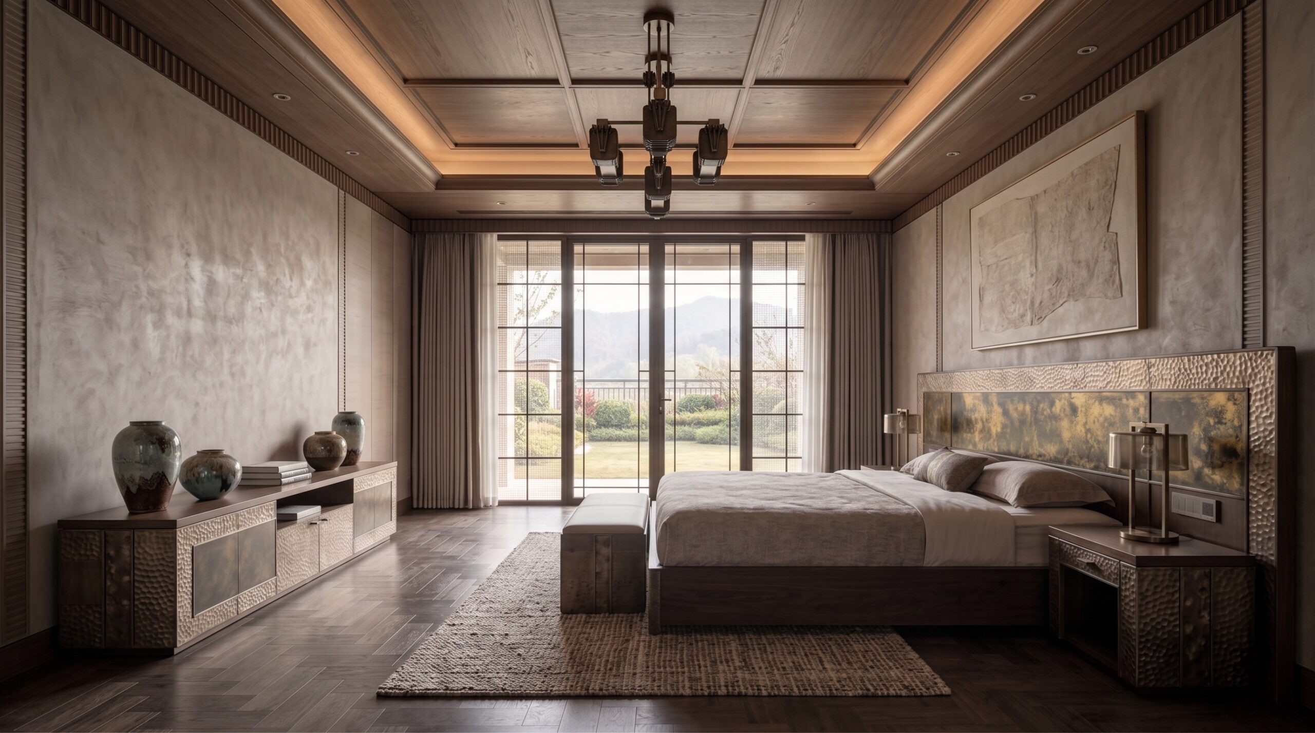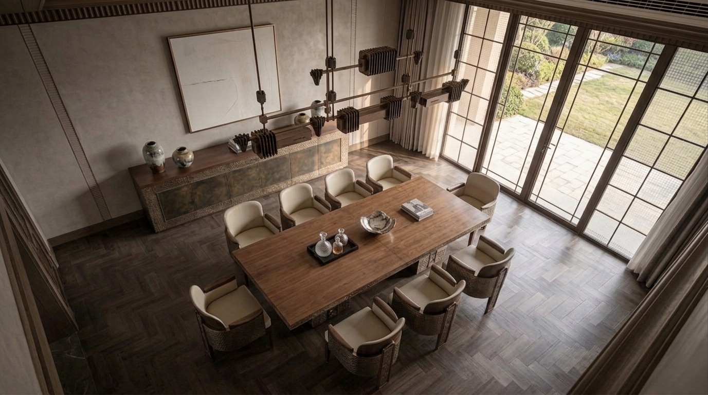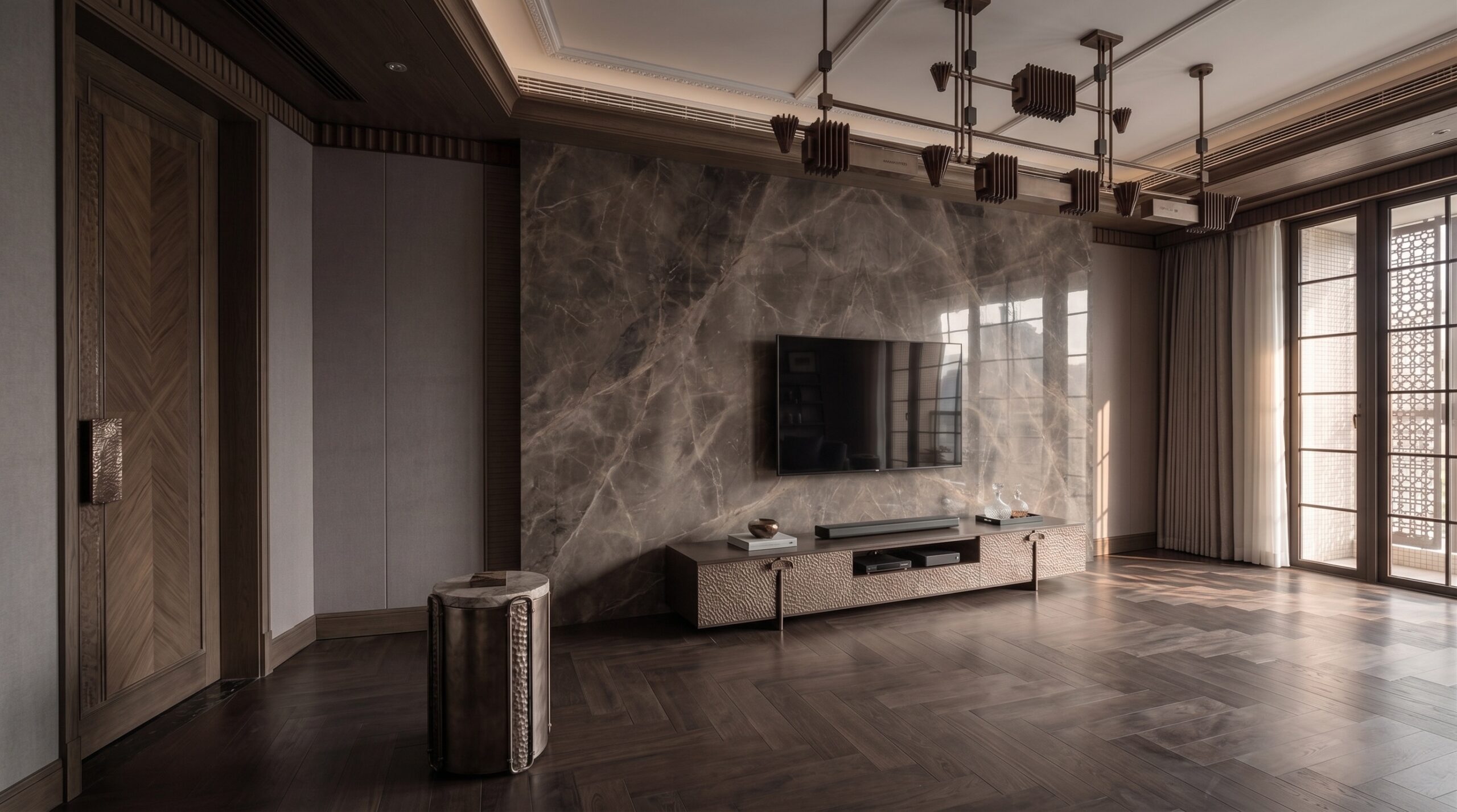 Deri ve dokuma yüzeylerin birlikte kullanıldığı oturma grupları, bronz detaylı masif ahşap yemek masası, doğal taş tezgâhlı mutfak adası ve entegre depolama çözümleri mekânın karakterini tanımlar. Yatak odalarında ahşap panel duvarlar, metal çerçeveli aydınlatmalar ve yumuşak dokulu tekstiller öne çıkarken; tüm mekânda pirinç/bronze aydınlatma elemanları ve el işçiliği detaylar bütüncül bir malzeme dili kurar.