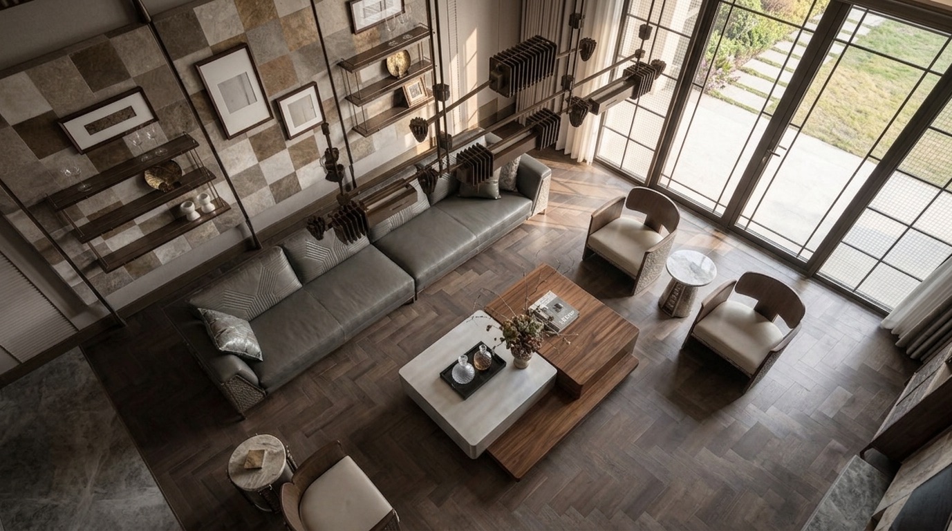 Doğal malzemelerin zengin ton geçişleriyle şekillenen bu konut, modern yaşamı sıcak, dengeli ve zamansız bir mekânsal deneyime dönüştürür.