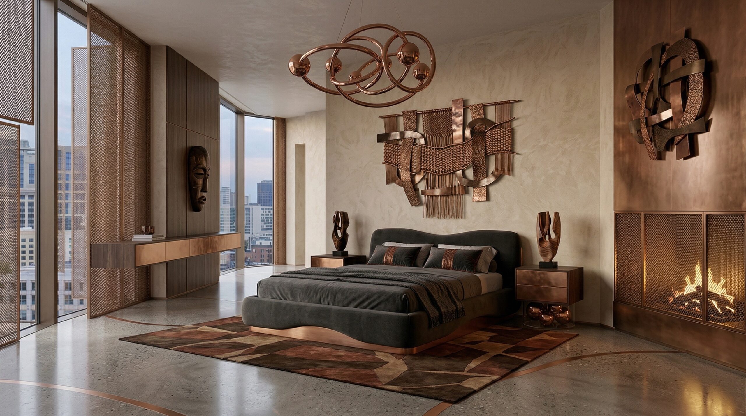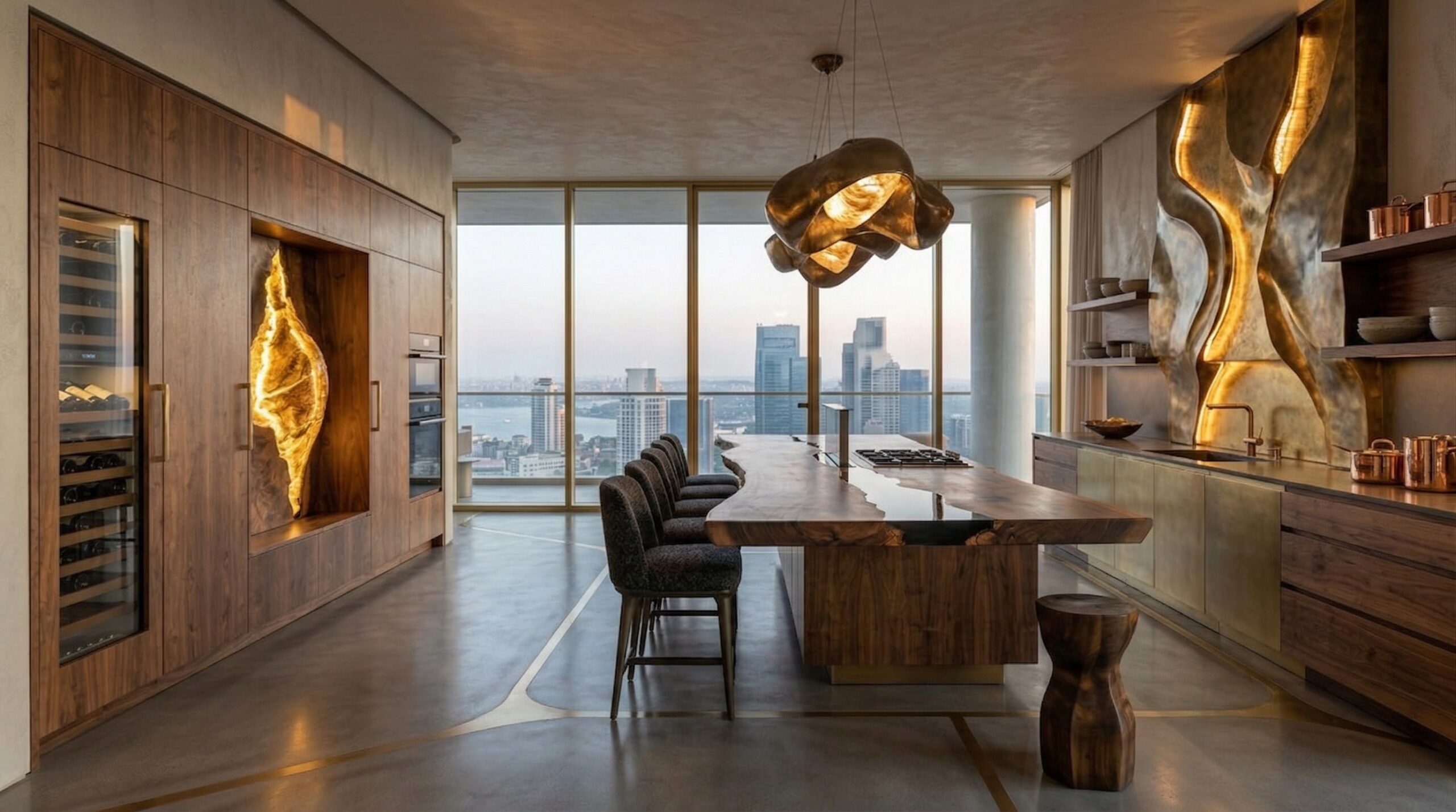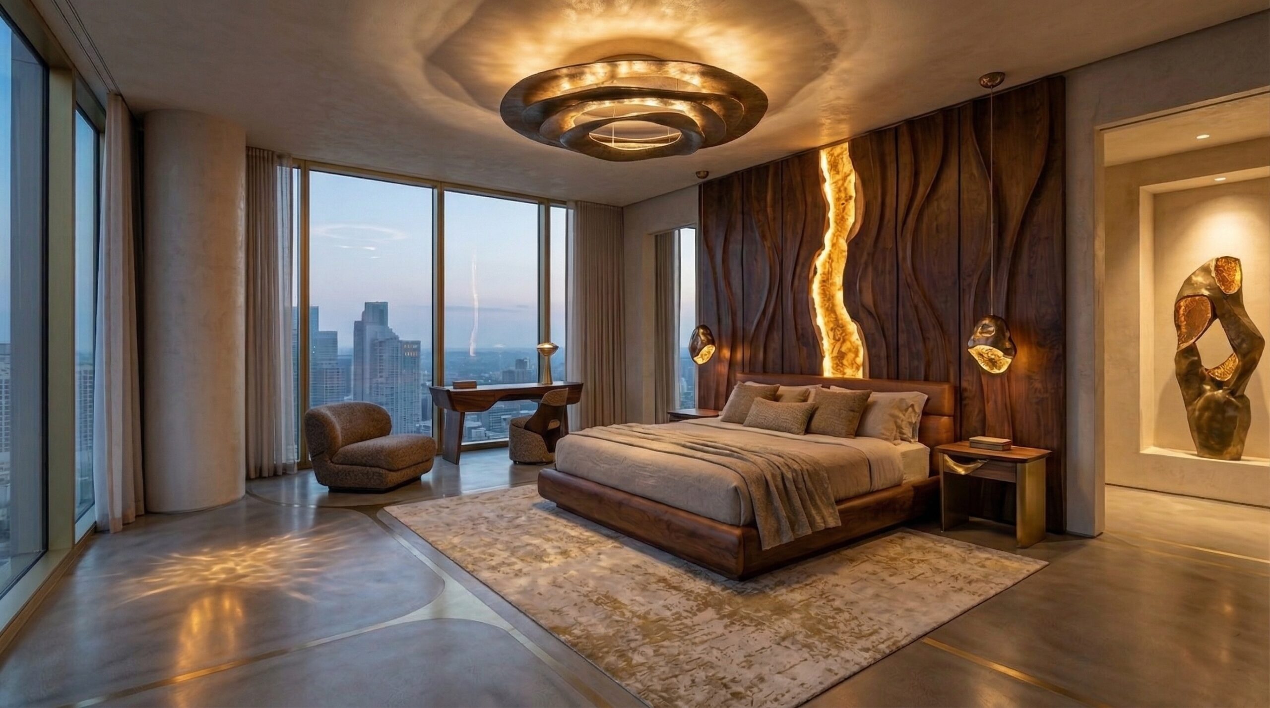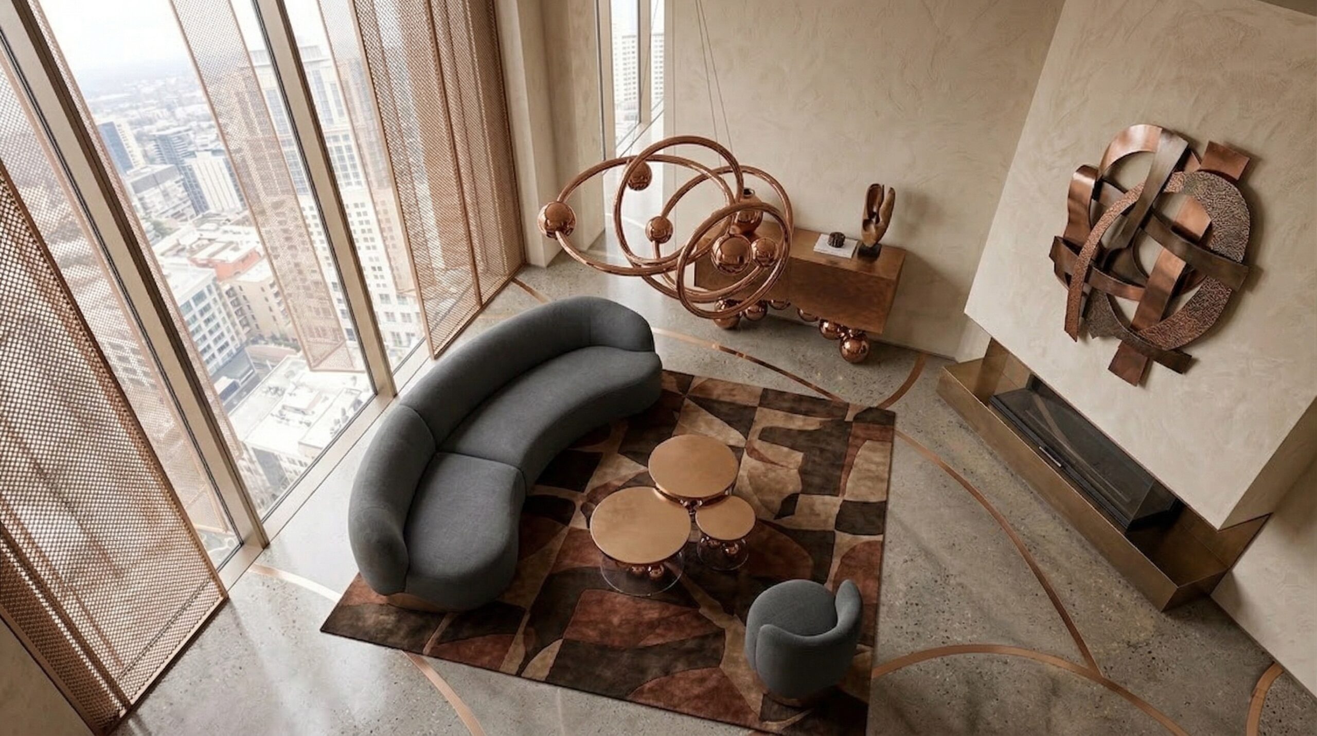 Geniş cam yüzeyler ve panoramik şehir manzarası, yüksek katlı yaşamın dinamik atmosferini iç mekâna taşır. Sıcak tonlu yüzeyler ve bronz detaylar, gün batımı ışığıyla birleşerek mekâna dramatik ve sofistike bir karakter kazandırır.