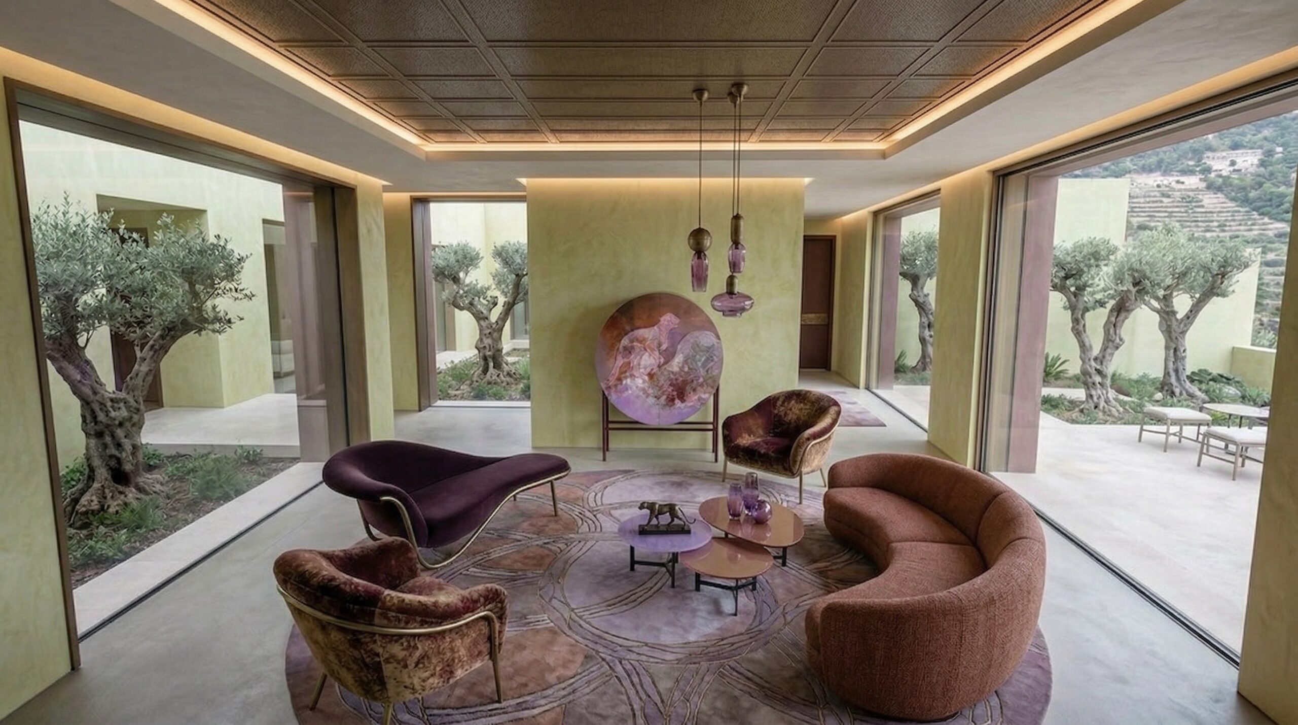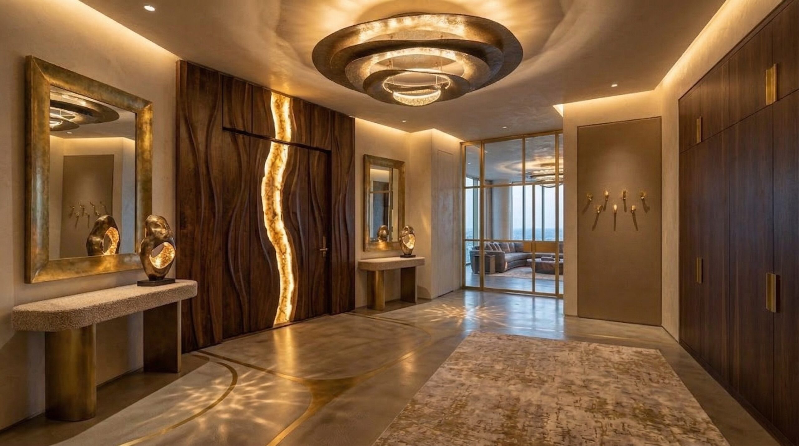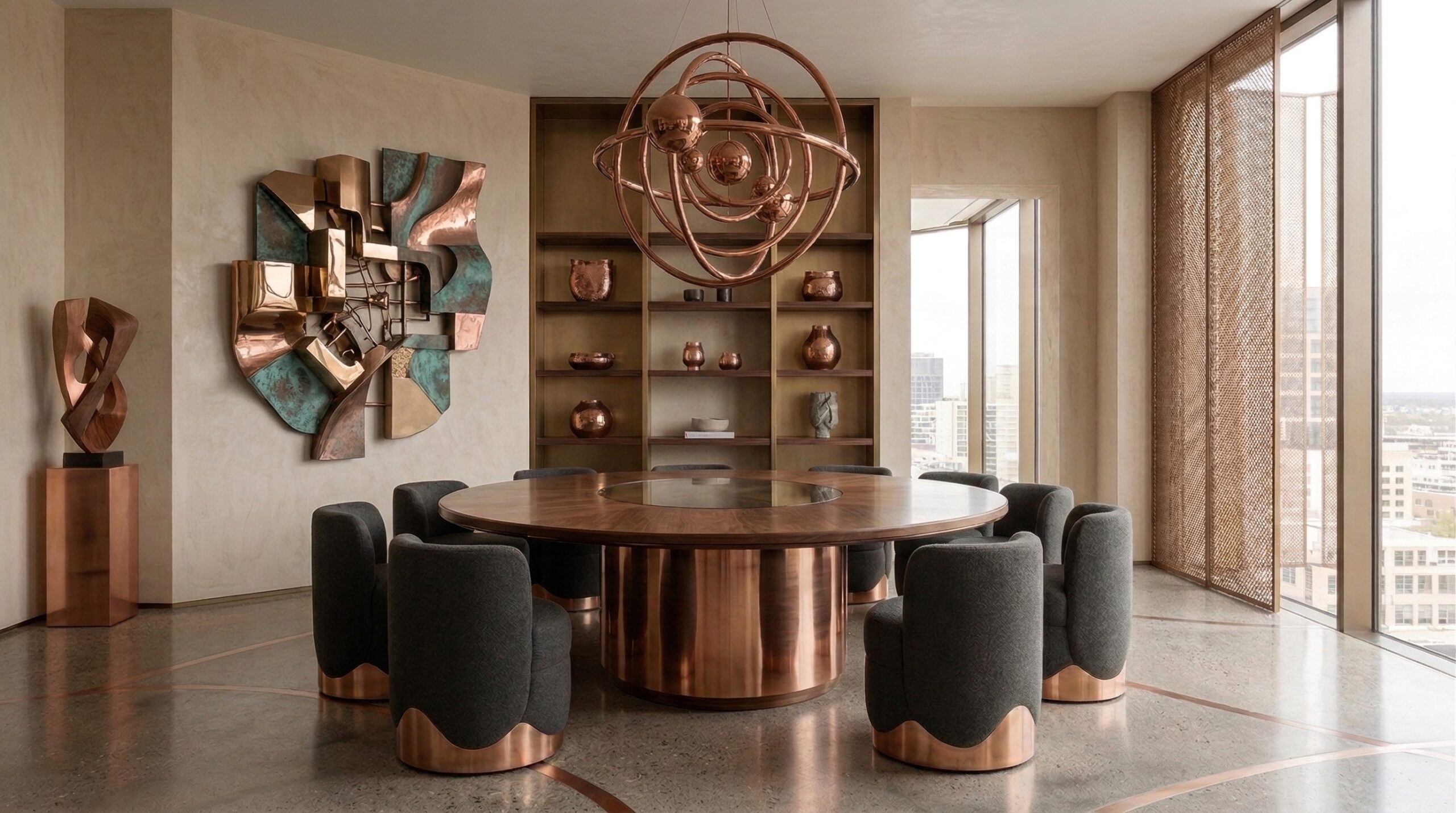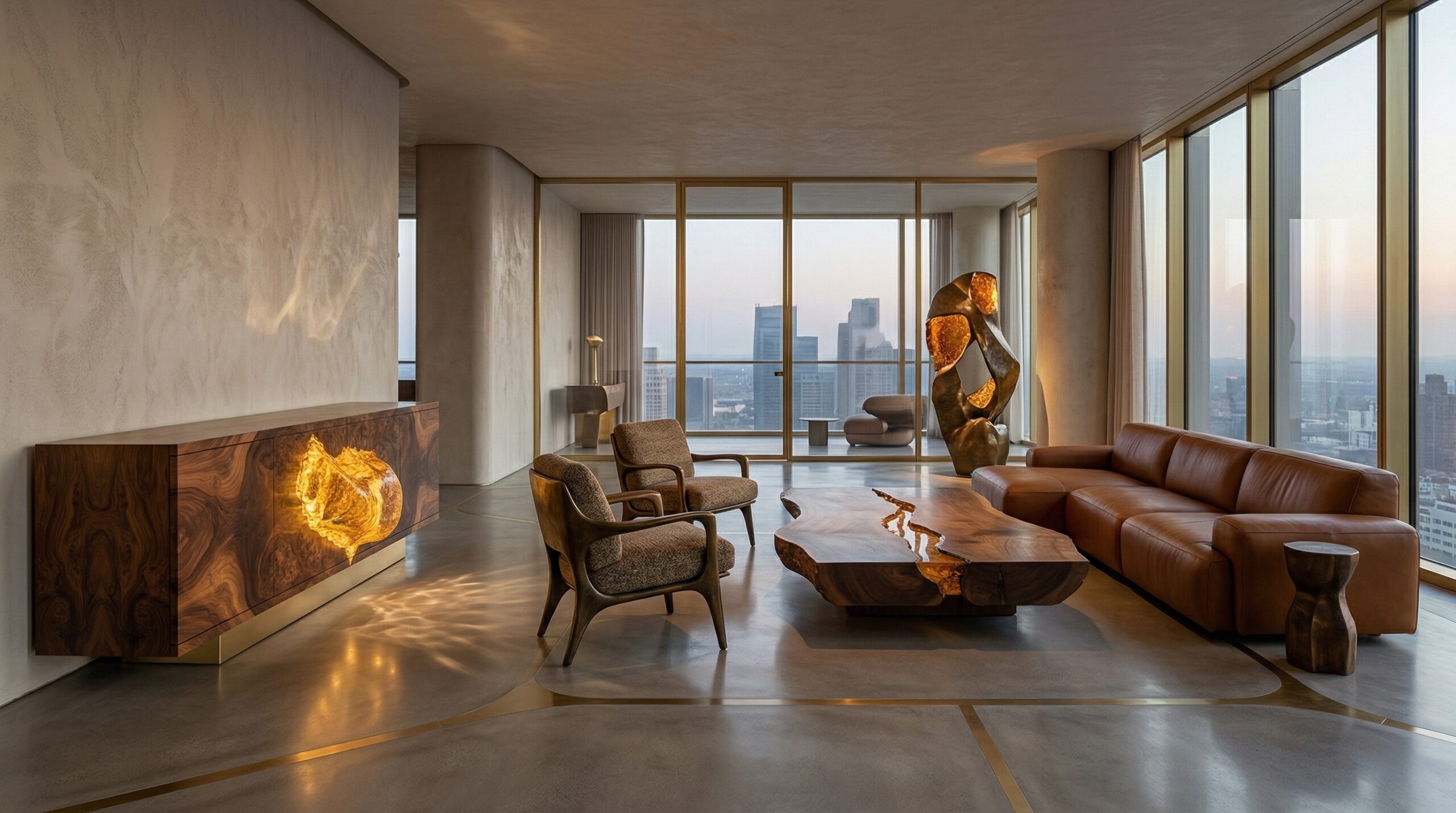 Organik formlu koltuklar, özel tasarım masif yemek masası, heykelsi aydınlatmalar ve entegre şömine elemanları mekânın odak noktalarını oluşturur. Duvarlarda kullanılan metalik sanat objeleri ve doğal dokuya sahip yüzeyler, modern lüks anlayışını güçlü bir malzeme dili ile destekler.
