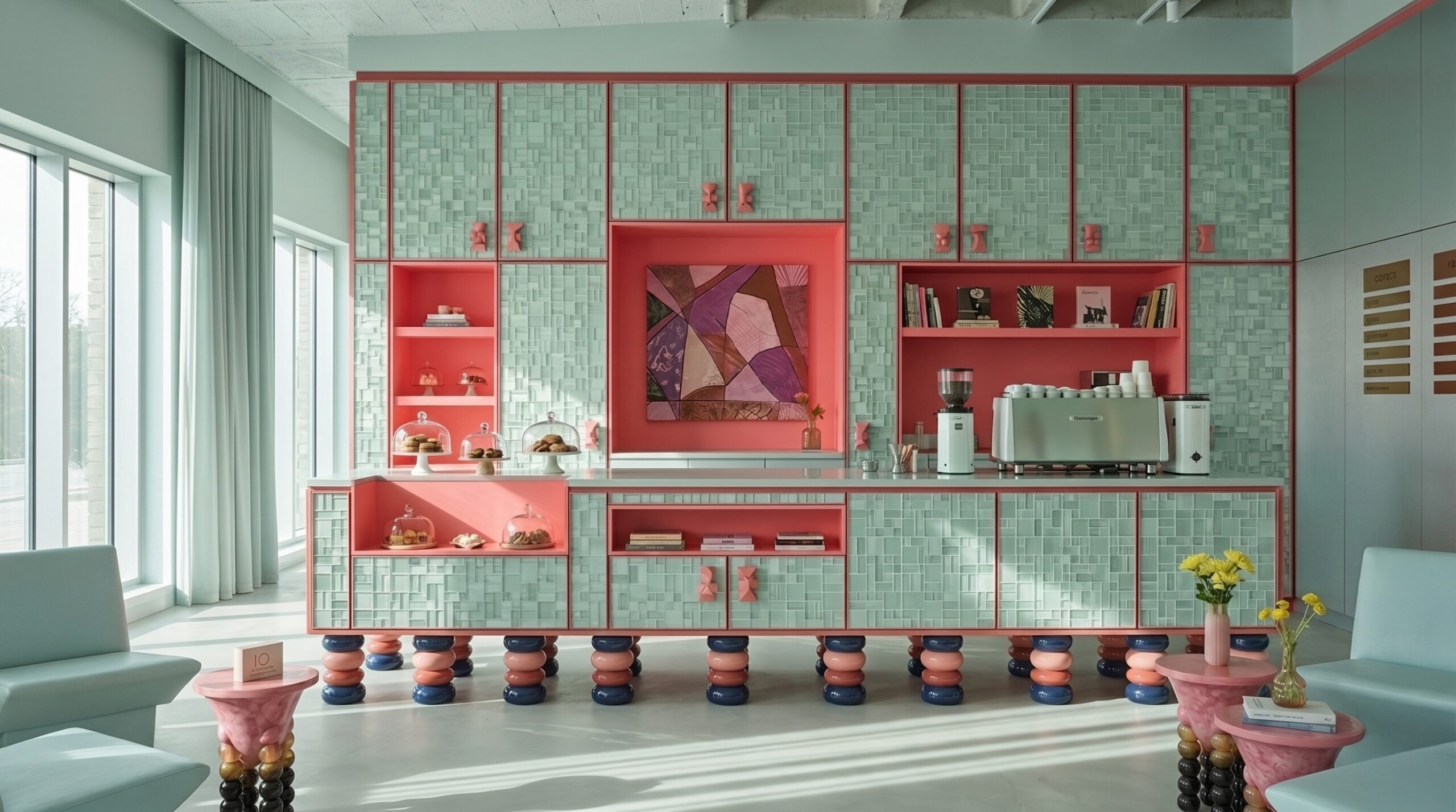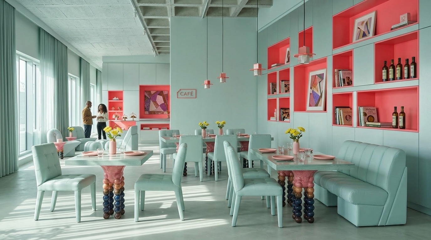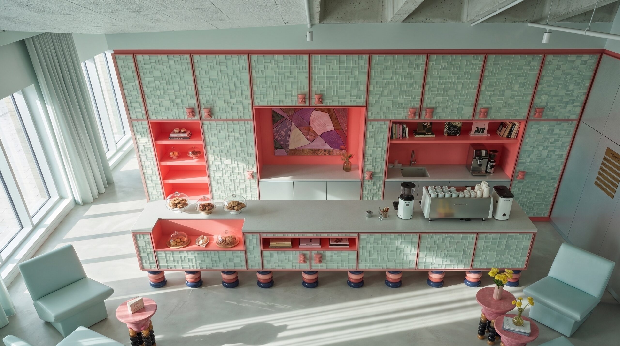 Yumuşak pastel tonların hakim olduğu bu kafe tasarımı, sade geometriler ve akışkan mobilya formlarıyla huzurlu ve davetkar bir atmosfer oluşturur. Açık mint yeşili yüzeyler, pudra pembe detaylarla dengelenirken; minimal süslemeler ve grid tavan sistemi mekâna düzenli ve rafine bir karakter kazandırır. Doğal ışığın yoğun kullanımı ve ferah plan kurgusu, mekânı hem dinlenme hem de sosyal etkileşim için ideal bir ortama dönüştürür.