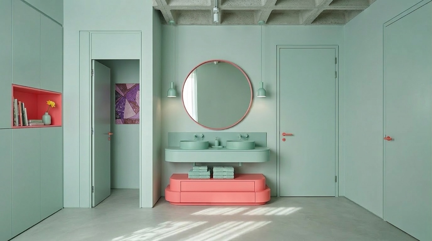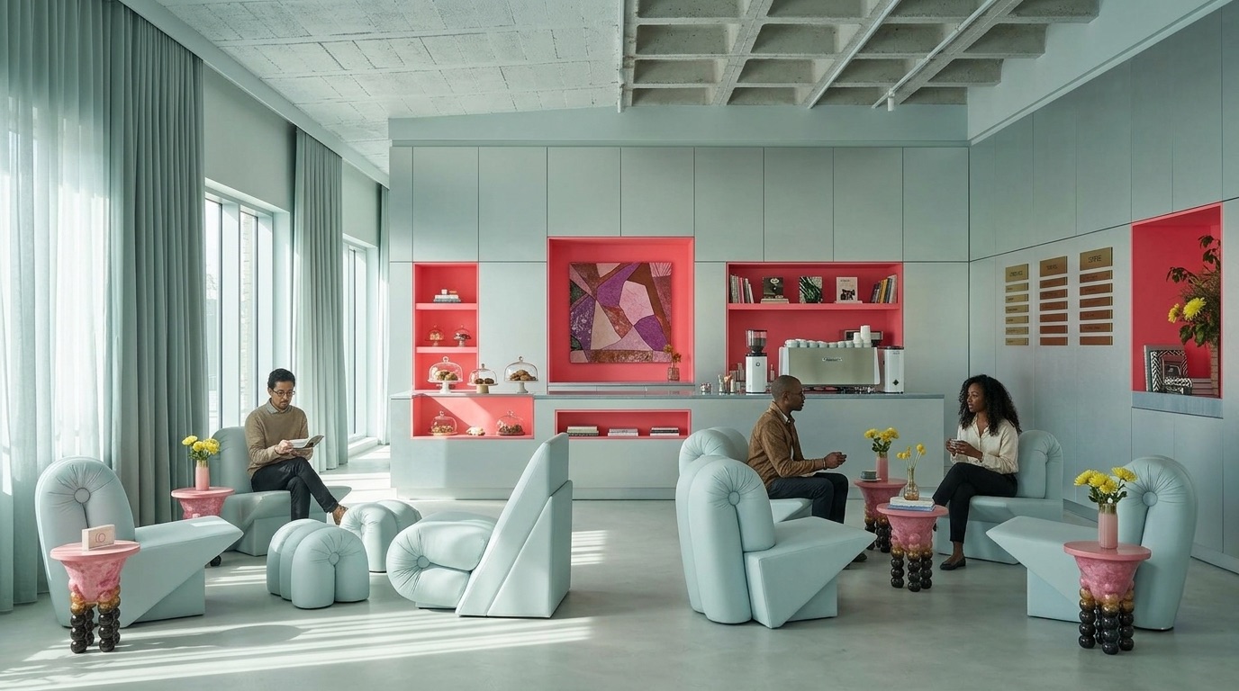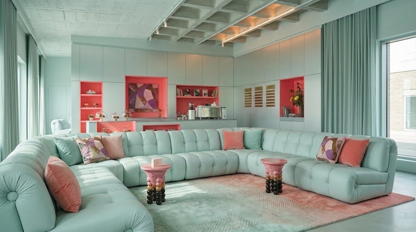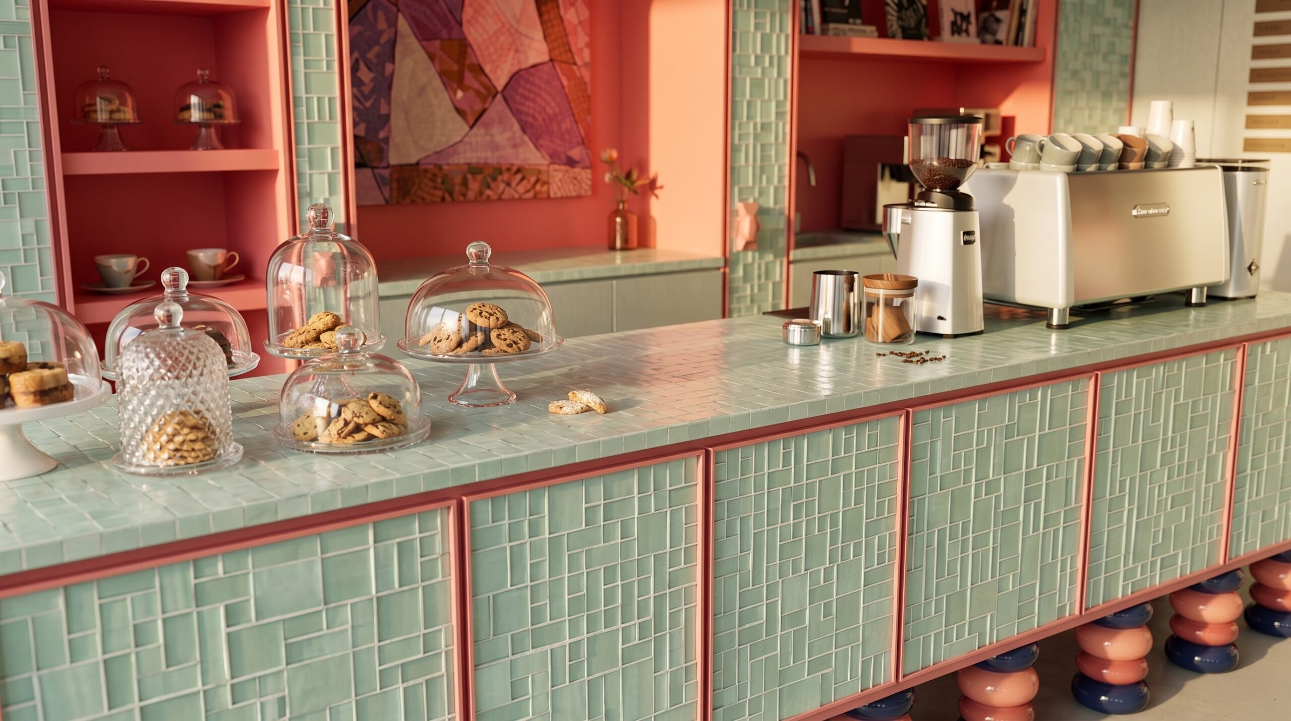 Yumuşak pastel tonların hakim olduğu bu kafe tasarımı, sade geometriler ve akışkan mobilya formlarıyla huzurlu ve davetkar bir atmosfer oluşturur. Açık mint yeşili yüzeyler, pudra pembe detaylarla dengelenirken; minimal süslemeler ve grid tavan sistemi mekâna düzenli ve rafine bir karakter kazandırır. Doğal ışığın yoğun kullanımı ve ferah plan kurgusu, mekânı hem dinlenme hem de sosyal etkileşim için ideal bir ortama dönüştürür.