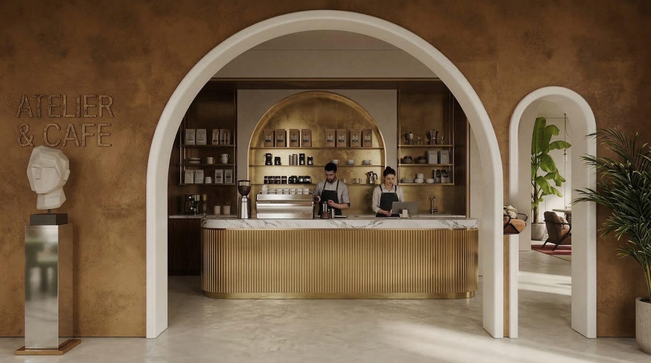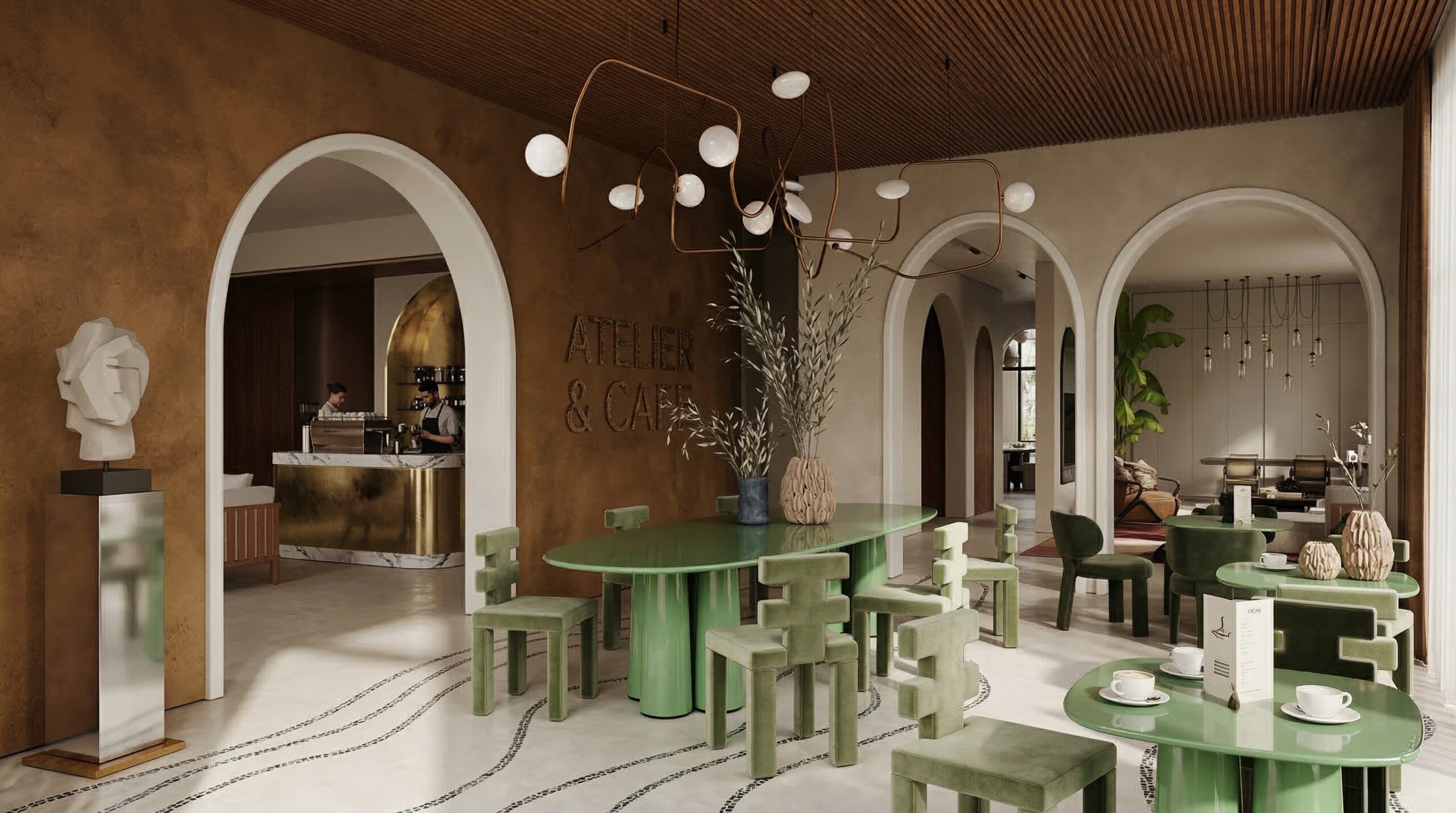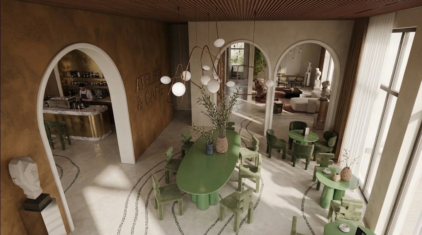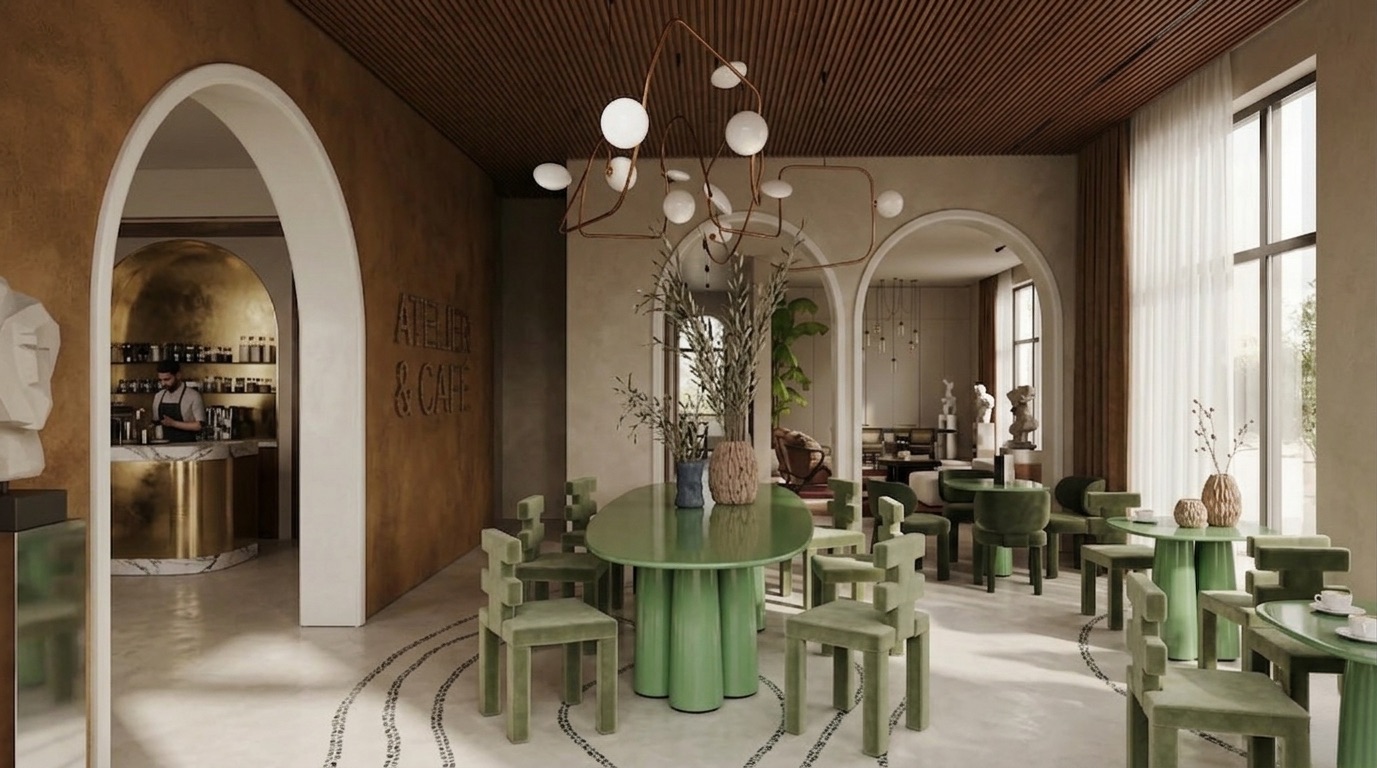 Doğal malzemelerin ve sıcak toprak tonlarının hâkim olduğu, kemerli geçişler ve yüksek tavanlarla zenginleşen bir kafe tasarımı. Mekânda kullanılan terracotta duvar yüzeyleri, ahşap tavan detayları ve yeşil tonlardaki mobilyalar doğa ile güçlü bir bağ kurarken; geniş açıklıklar ve bitkisel öğeler iç-dış mekân sürekliliğini destekler. Yumuşak form dili ve dengeli ışık kullanımı sayesinde sakin, rafine ve zamansız bir atmosfer oluşturulmuştur.