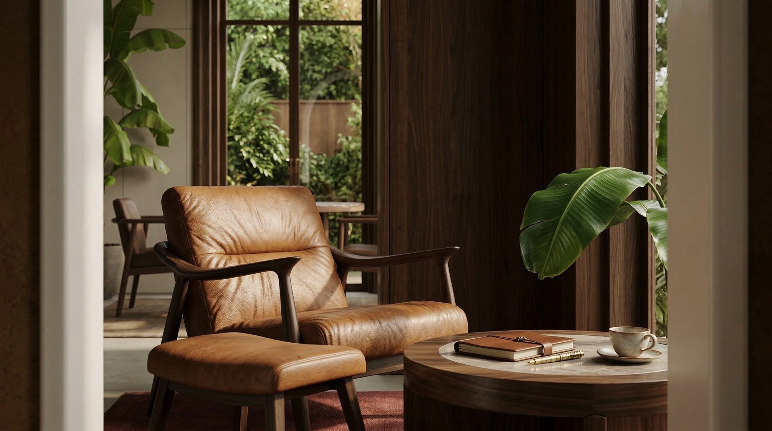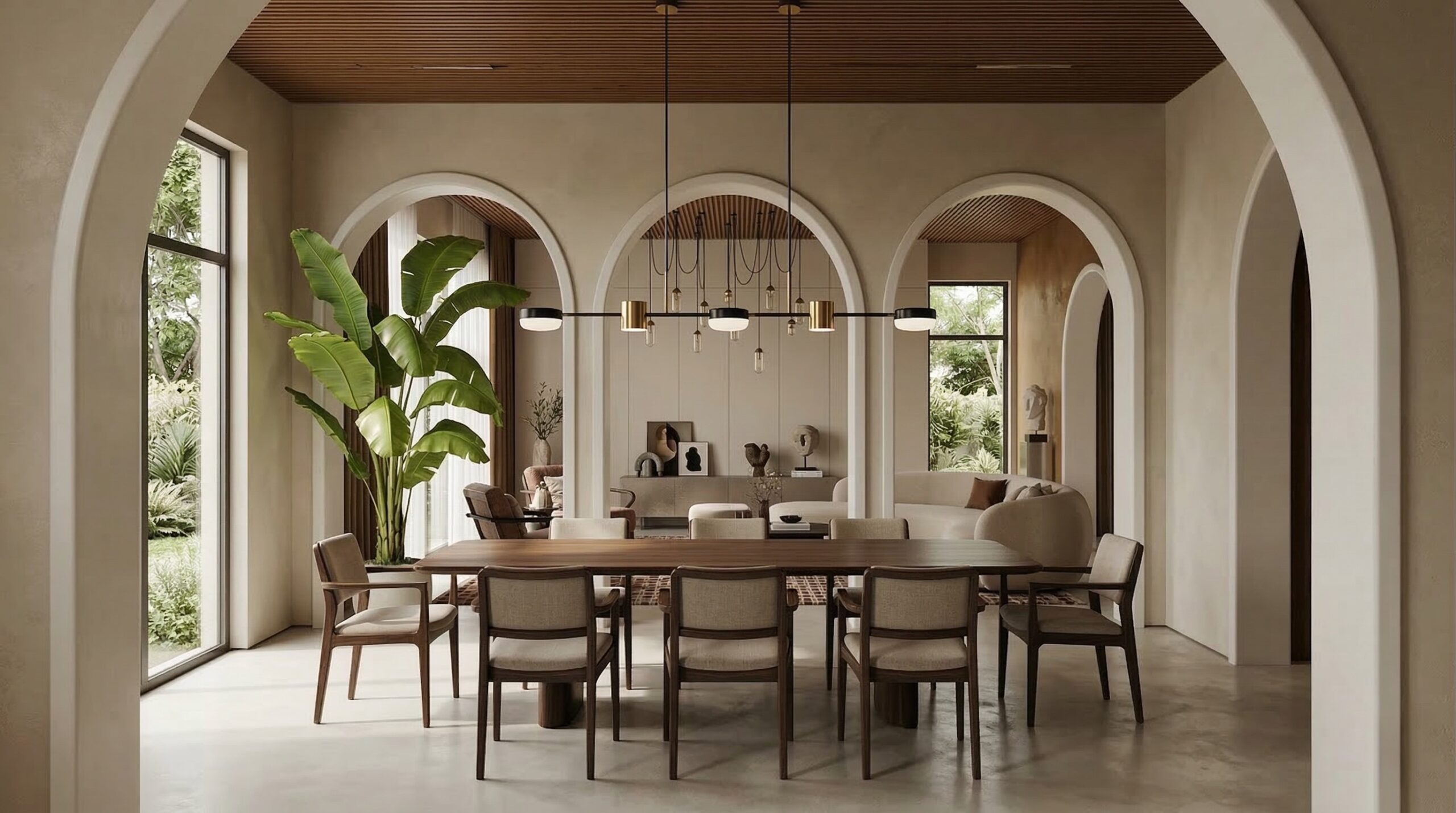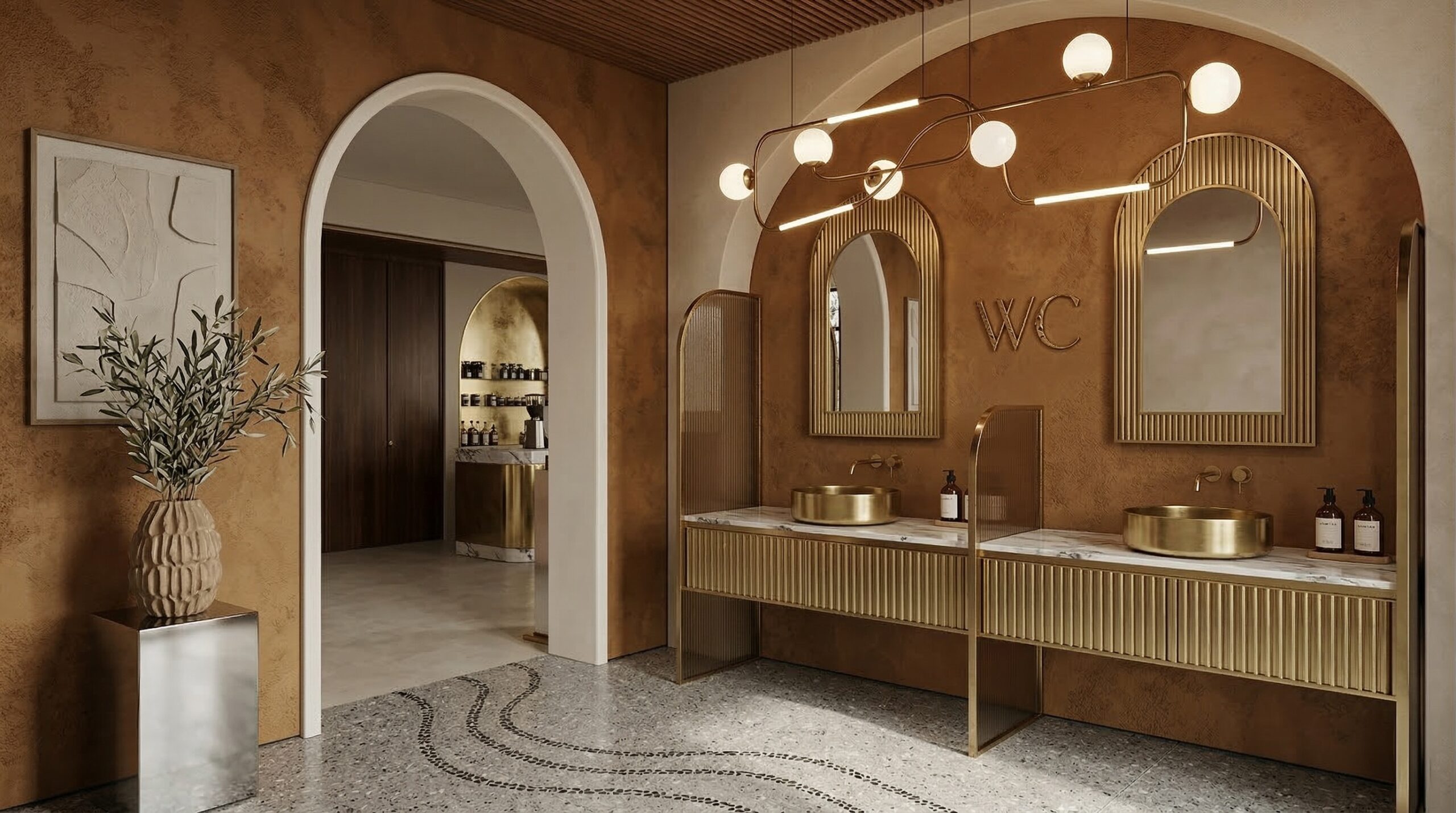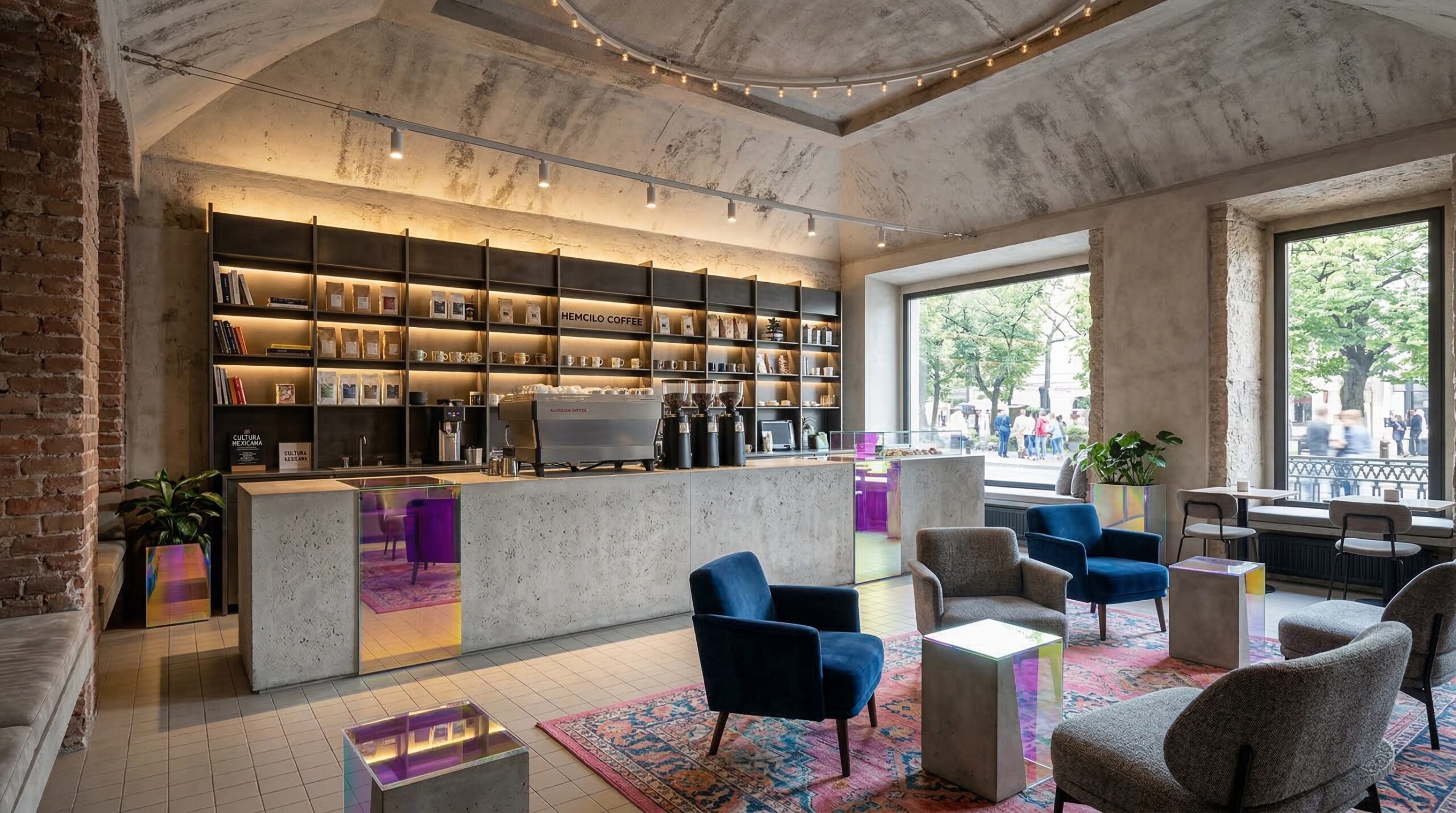 Doğal malzemelerin ve sıcak toprak tonlarının hâkim olduğu, kemerli geçişler ve yüksek tavanlarla zenginleşen bir kafe tasarımı. Mekânda kullanılan terracotta duvar yüzeyleri, ahşap tavan detayları ve yeşil tonlardaki mobilyalar doğa ile güçlü bir bağ kurarken; geniş açıklıklar ve bitkisel öğeler iç-dış mekân sürekliliğini destekler. Yumuşak form dili ve dengeli ışık kullanımı sayesinde sakin, rafine ve zamansız bir atmosfer oluşturulmuştur.