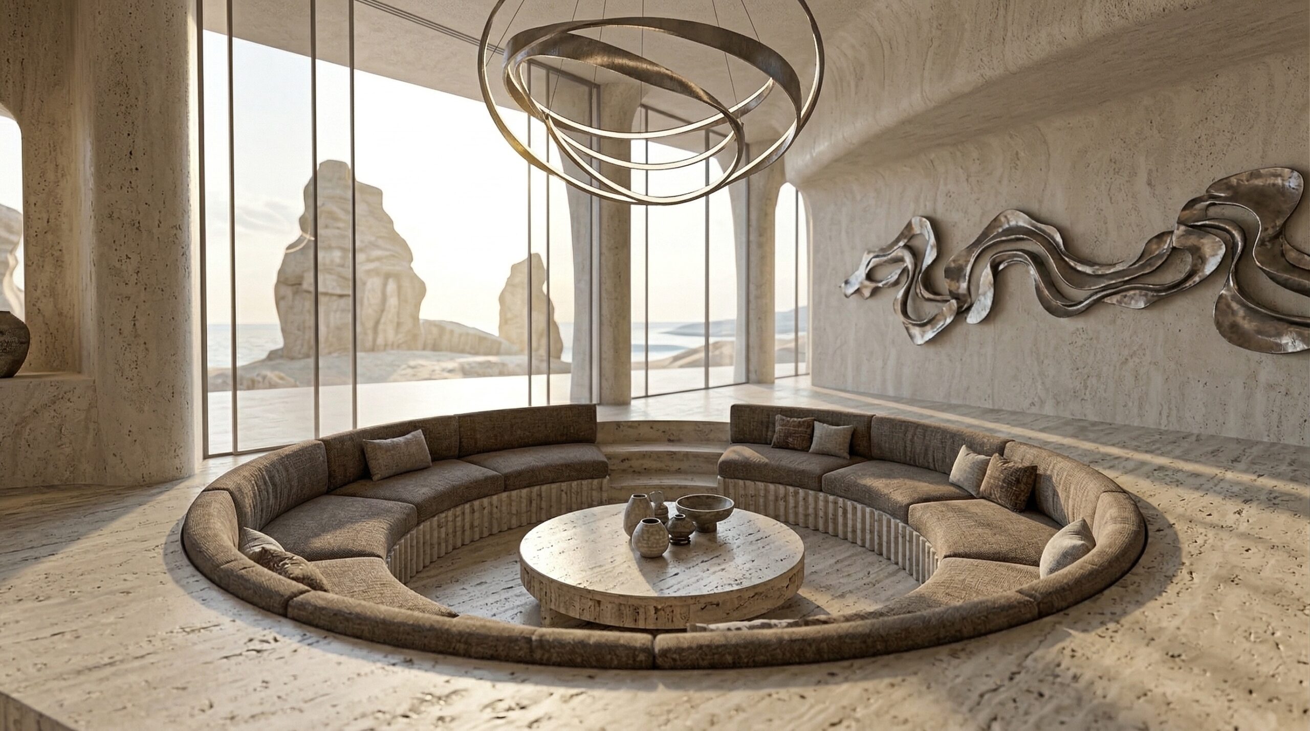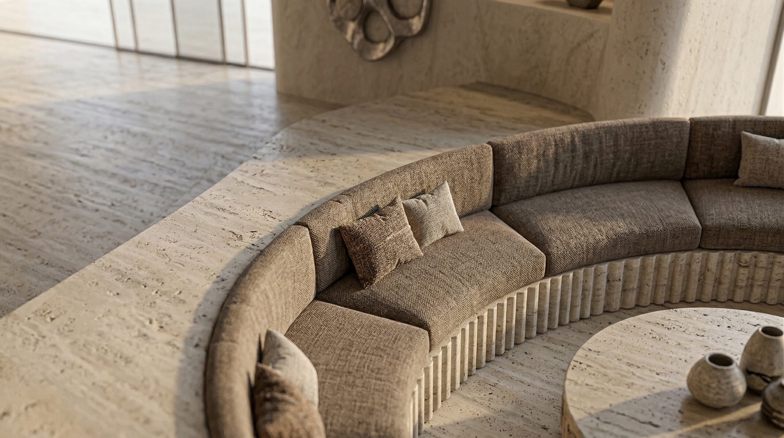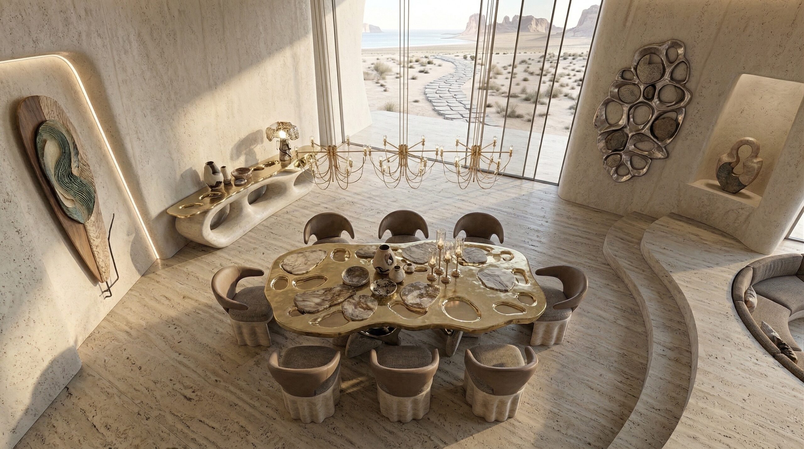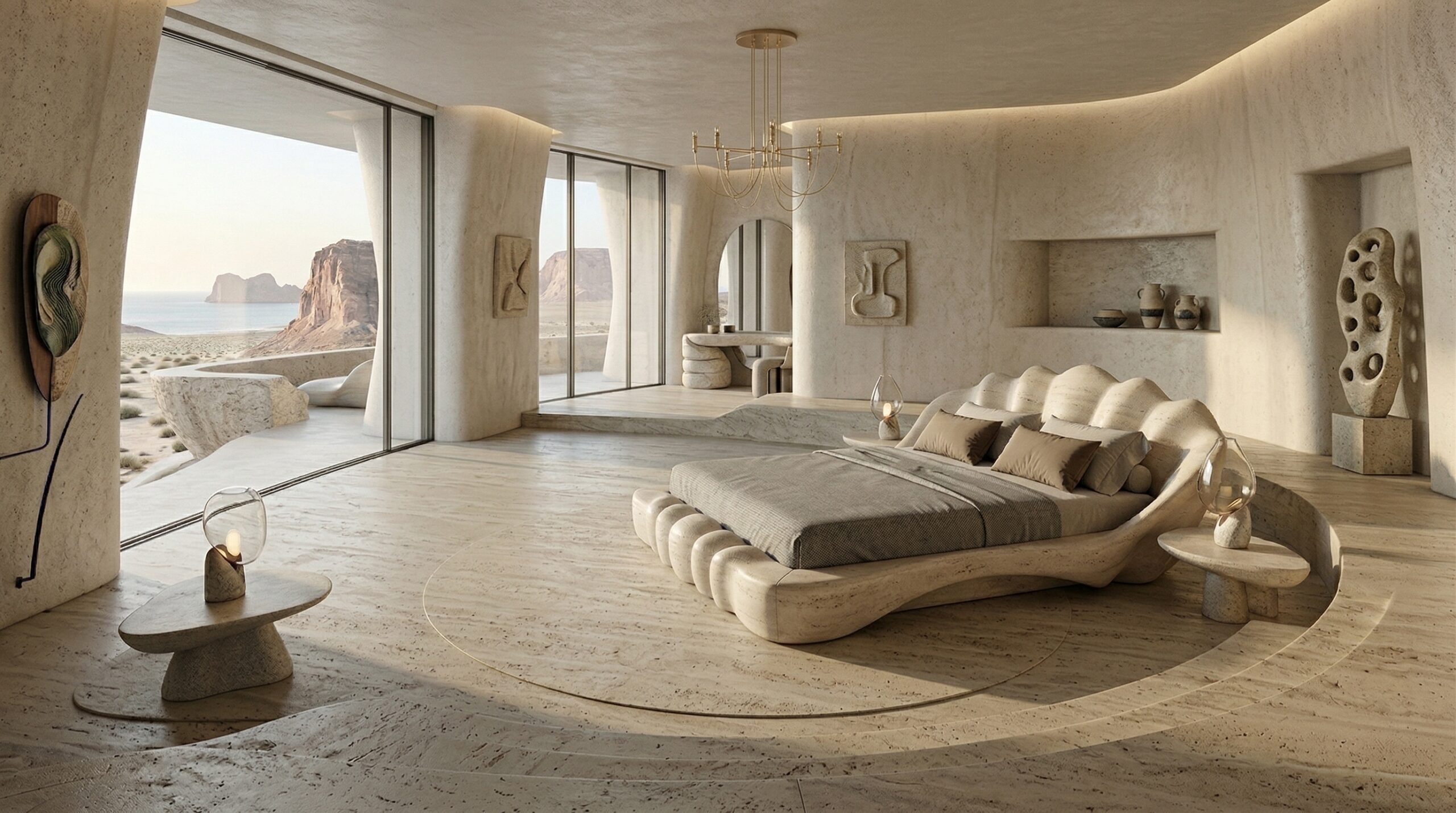 Kum tonlarının hâkim olduğu iç mekânda, doğal taş dokular ve yumuşak geçişli yüzeyler sakin ve zamansız bir atmosfer oluşturur. Kavisli oturma elemanları, gömme nişler ve özel üretim mobilyalar, mekânın heykelsi karakterini güçlendirir.