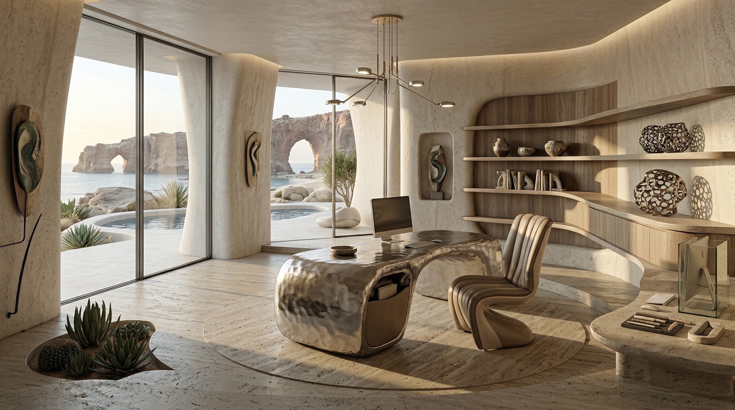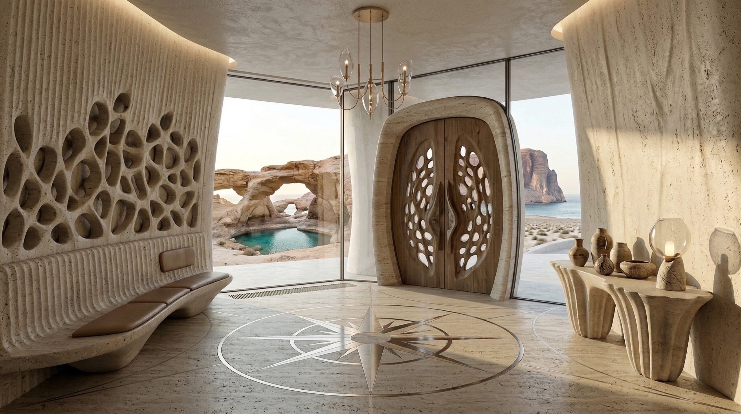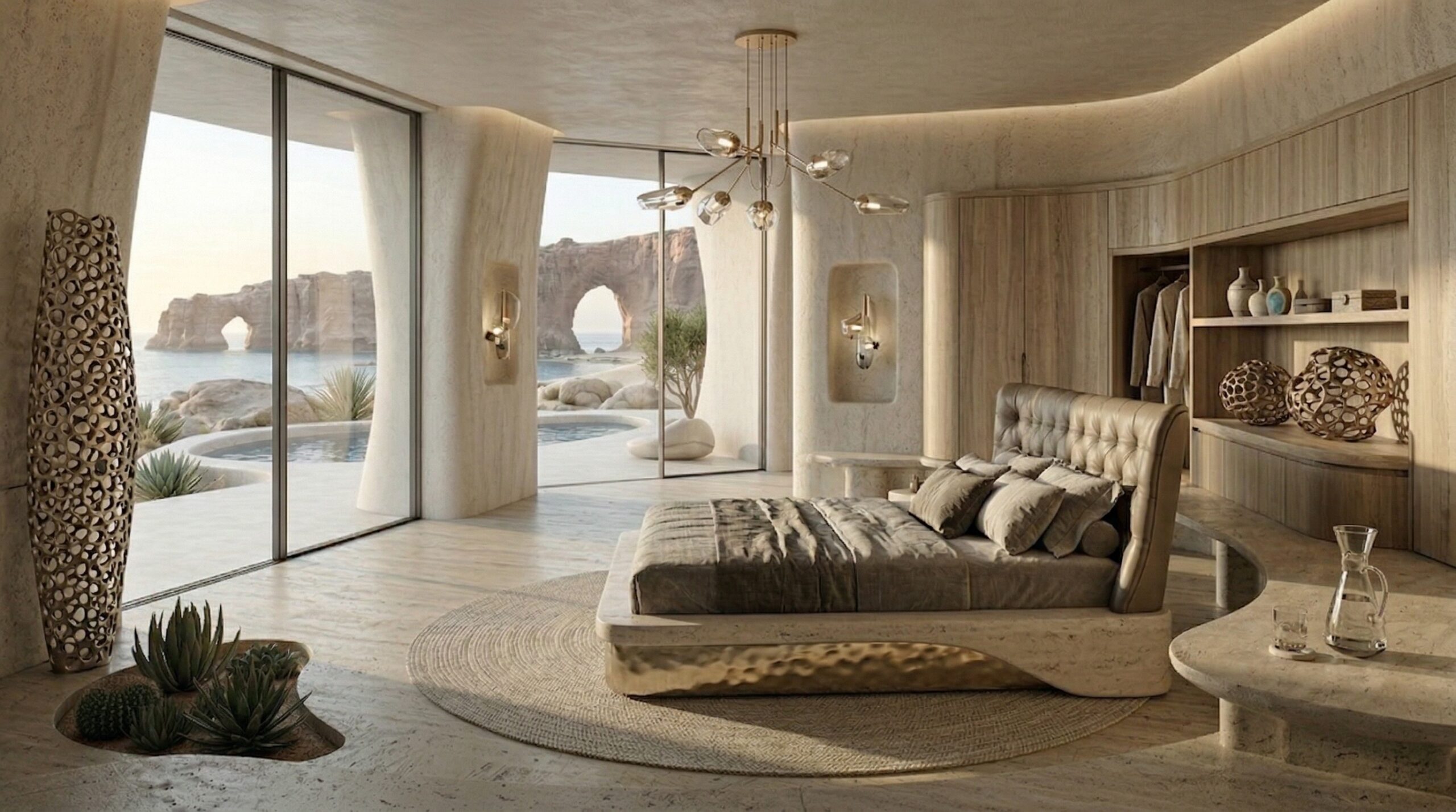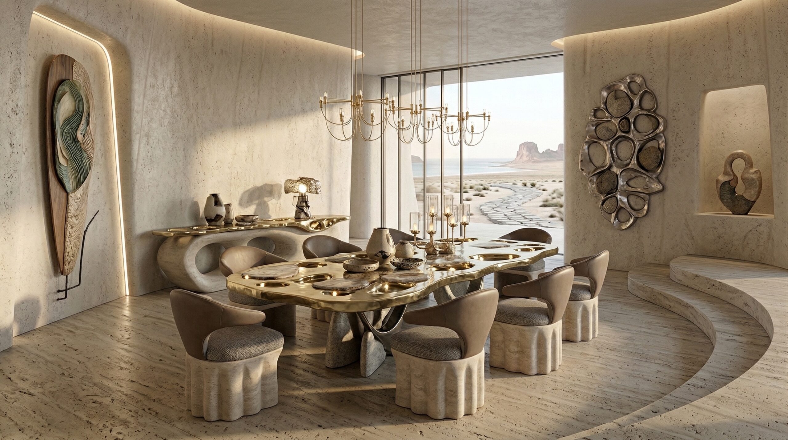 Kum tonlarının hâkim olduğu iç mekânda, doğal taş dokular ve yumuşak geçişli yüzeyler sakin ve zamansız bir atmosfer oluşturur. Kavisli oturma elemanları, gömme nişler ve özel üretim mobilyalar, mekânın heykelsi karakterini güçlendirir.