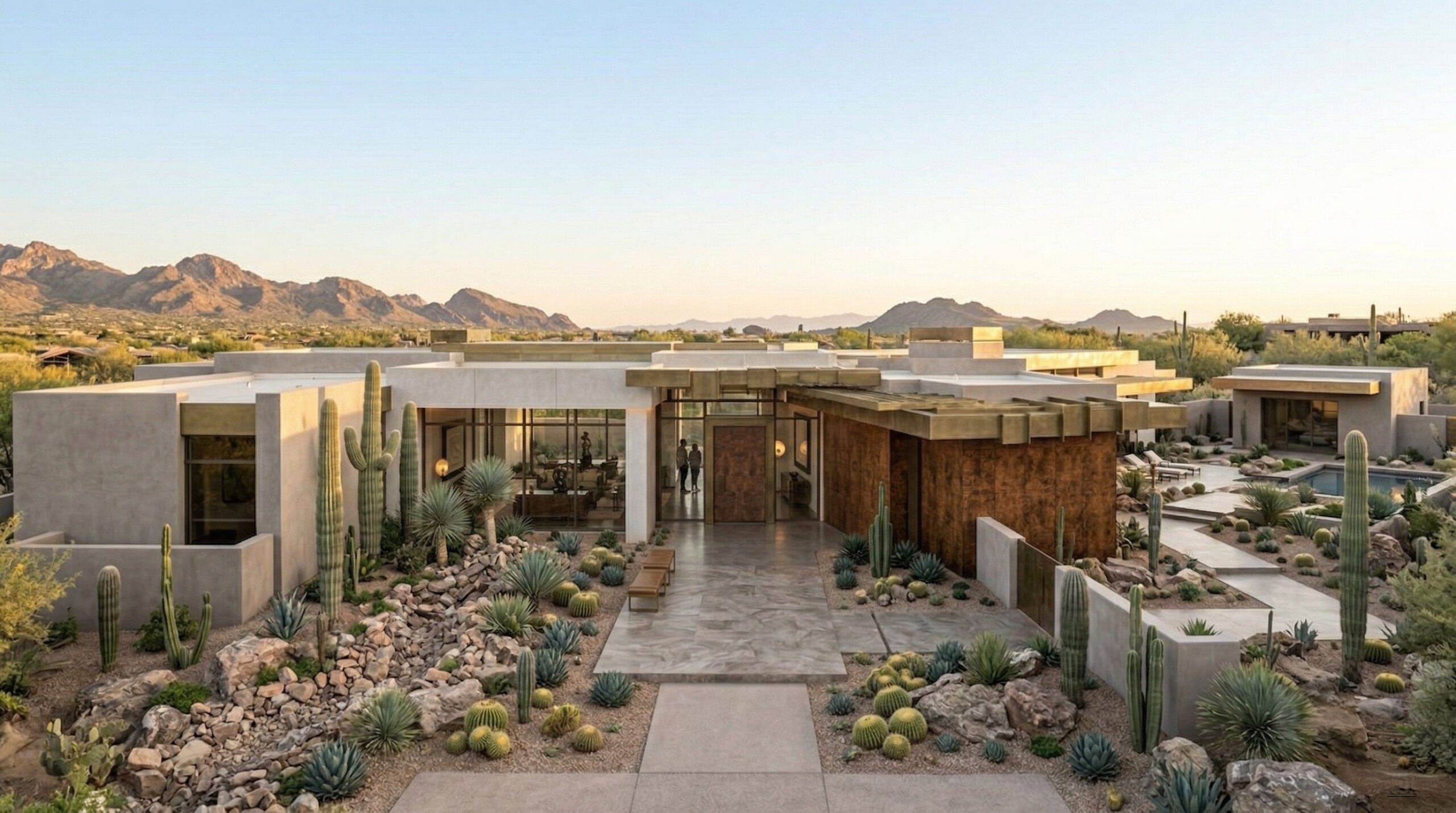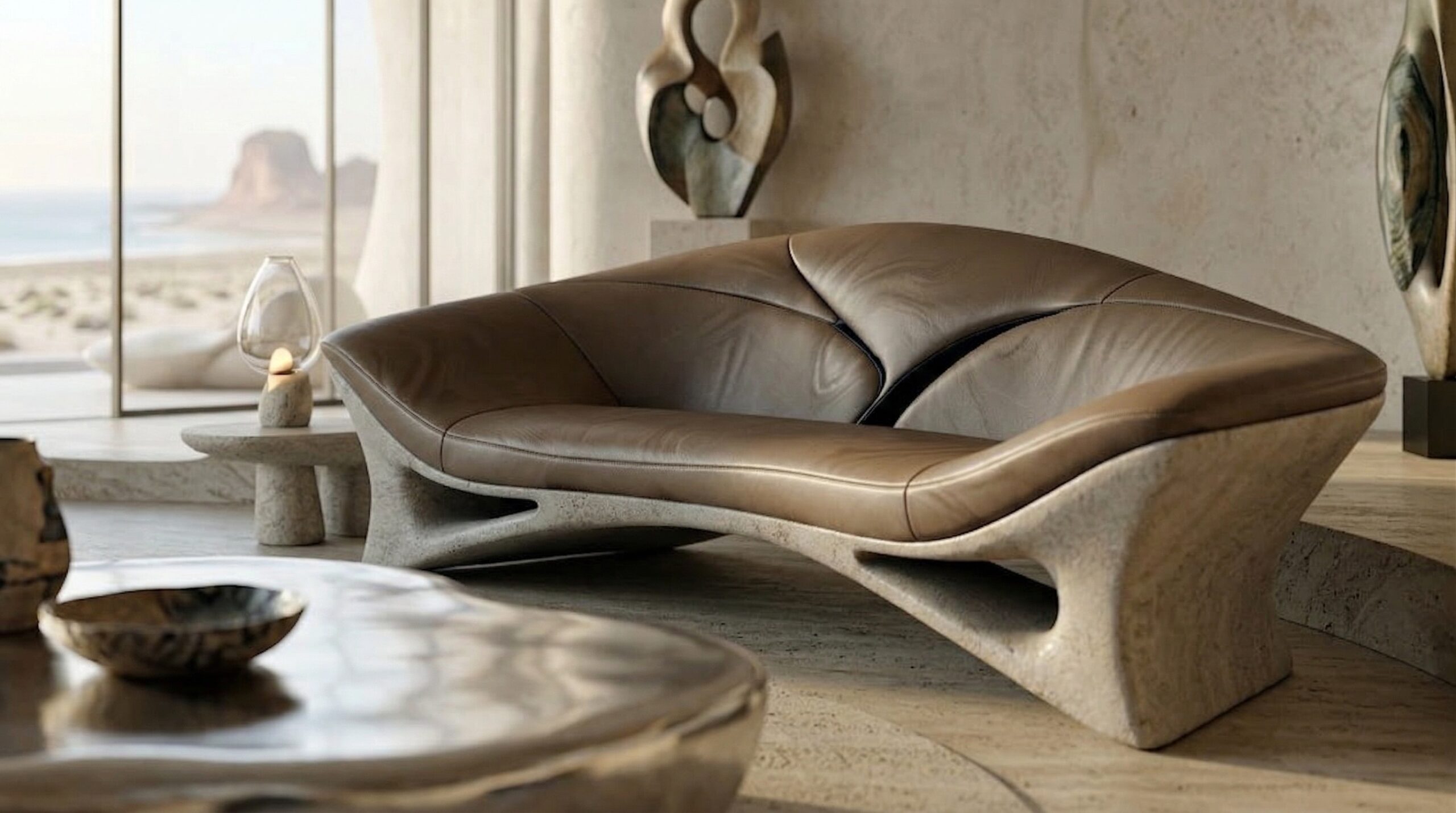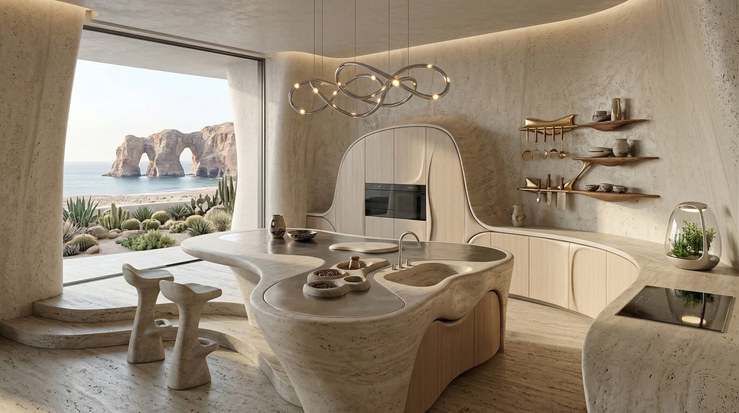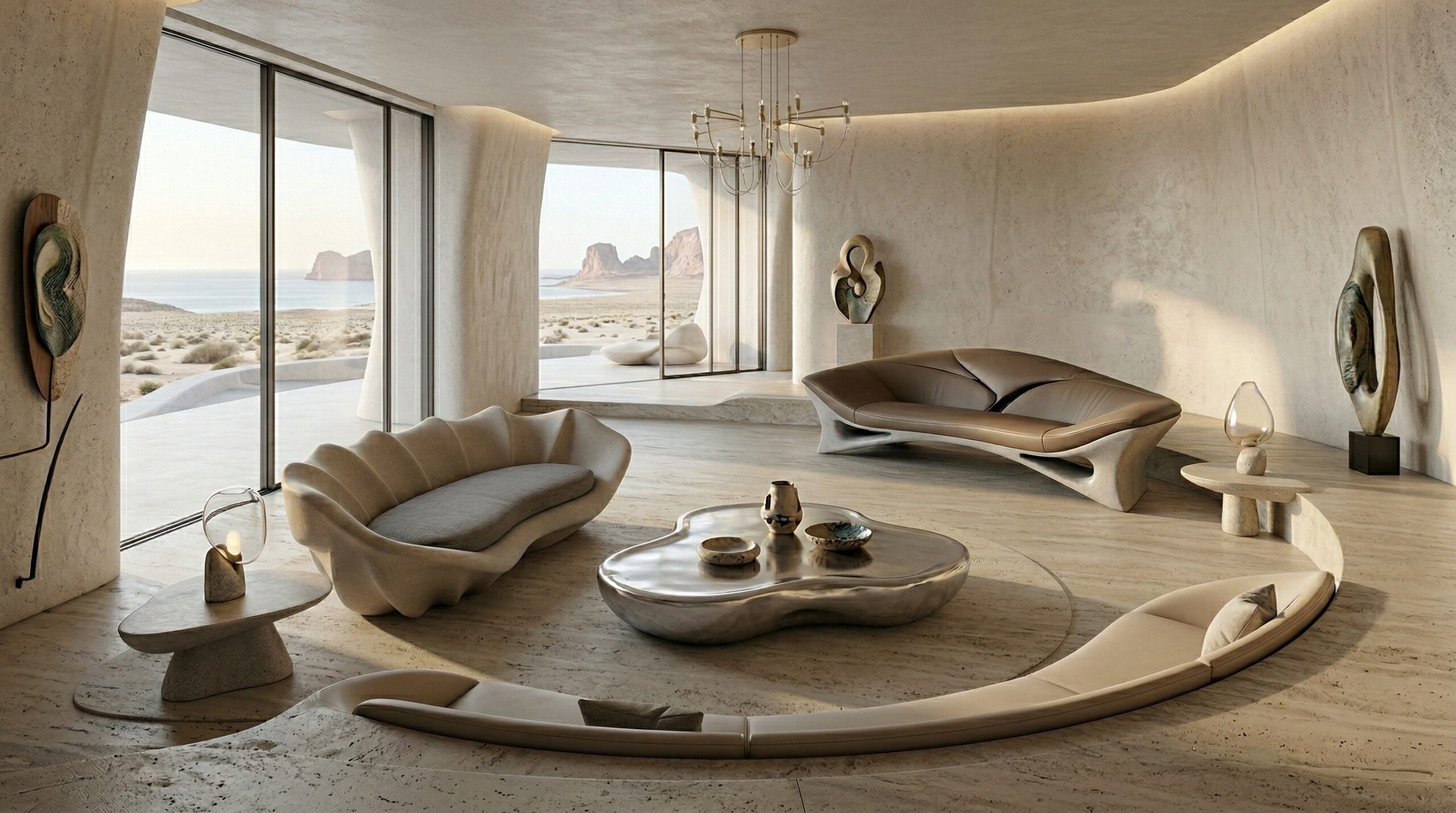 Kum tonlarının hâkim olduğu iç mekânda, doğal taş dokular ve yumuşak geçişli yüzeyler sakin ve zamansız bir atmosfer oluşturur. Kavisli oturma elemanları, gömme nişler ve özel üretim mobilyalar, mekânın heykelsi karakterini güçlendirir.