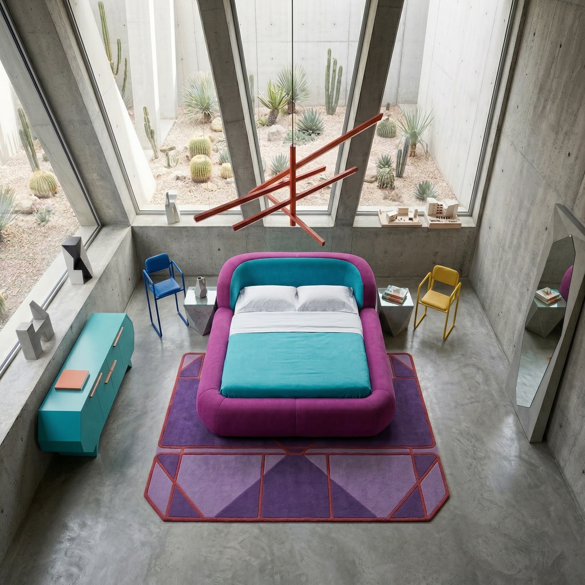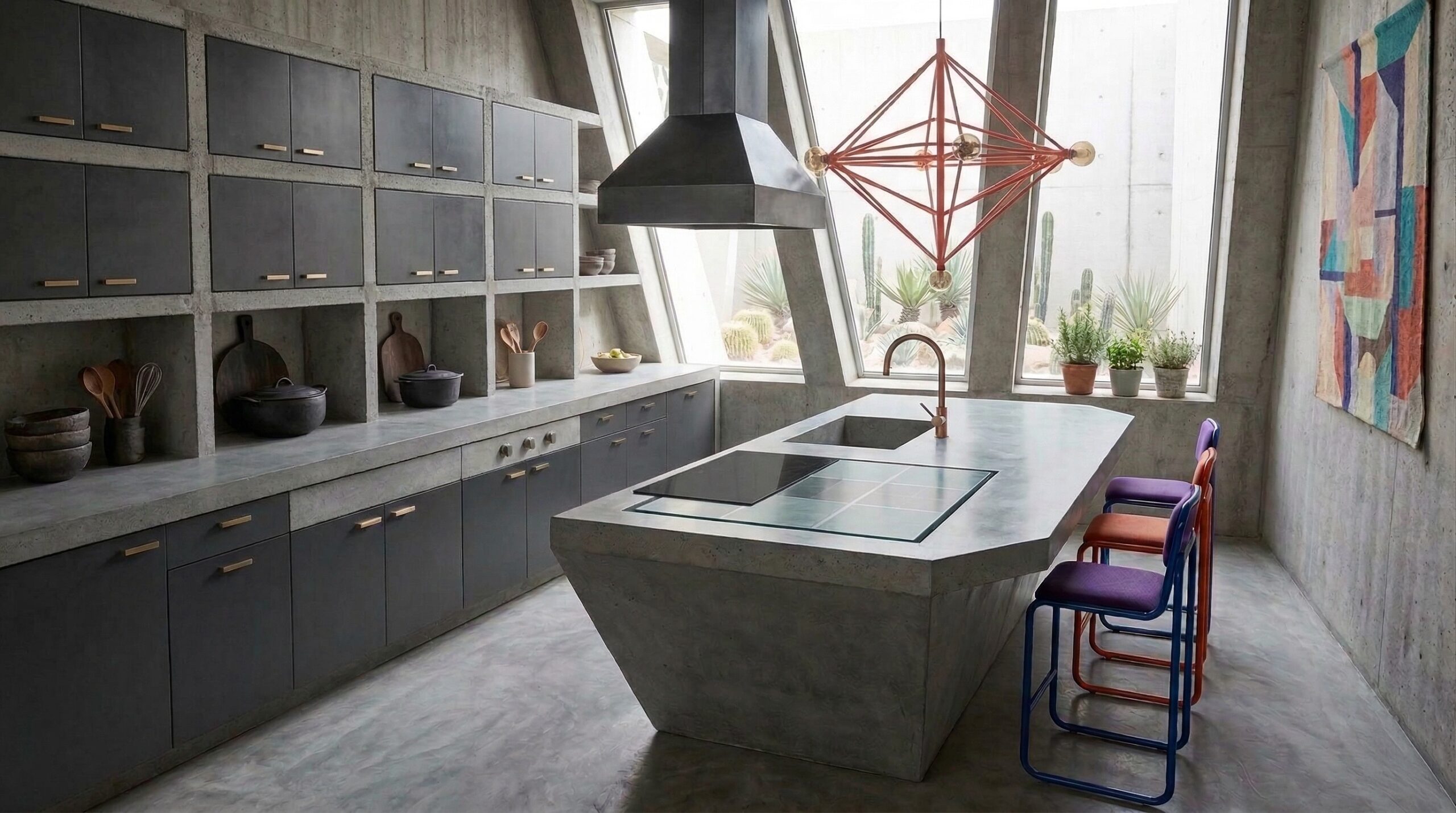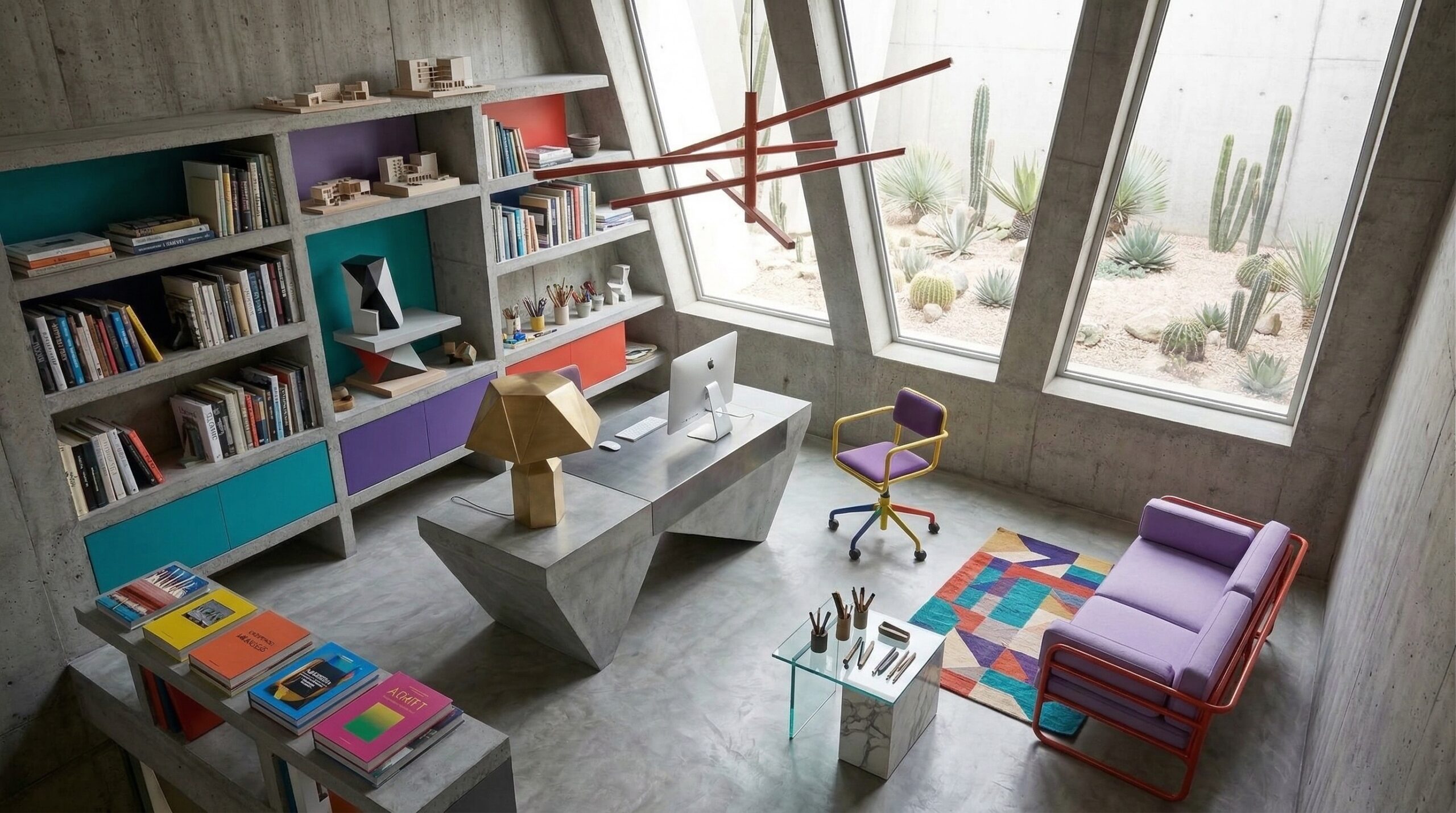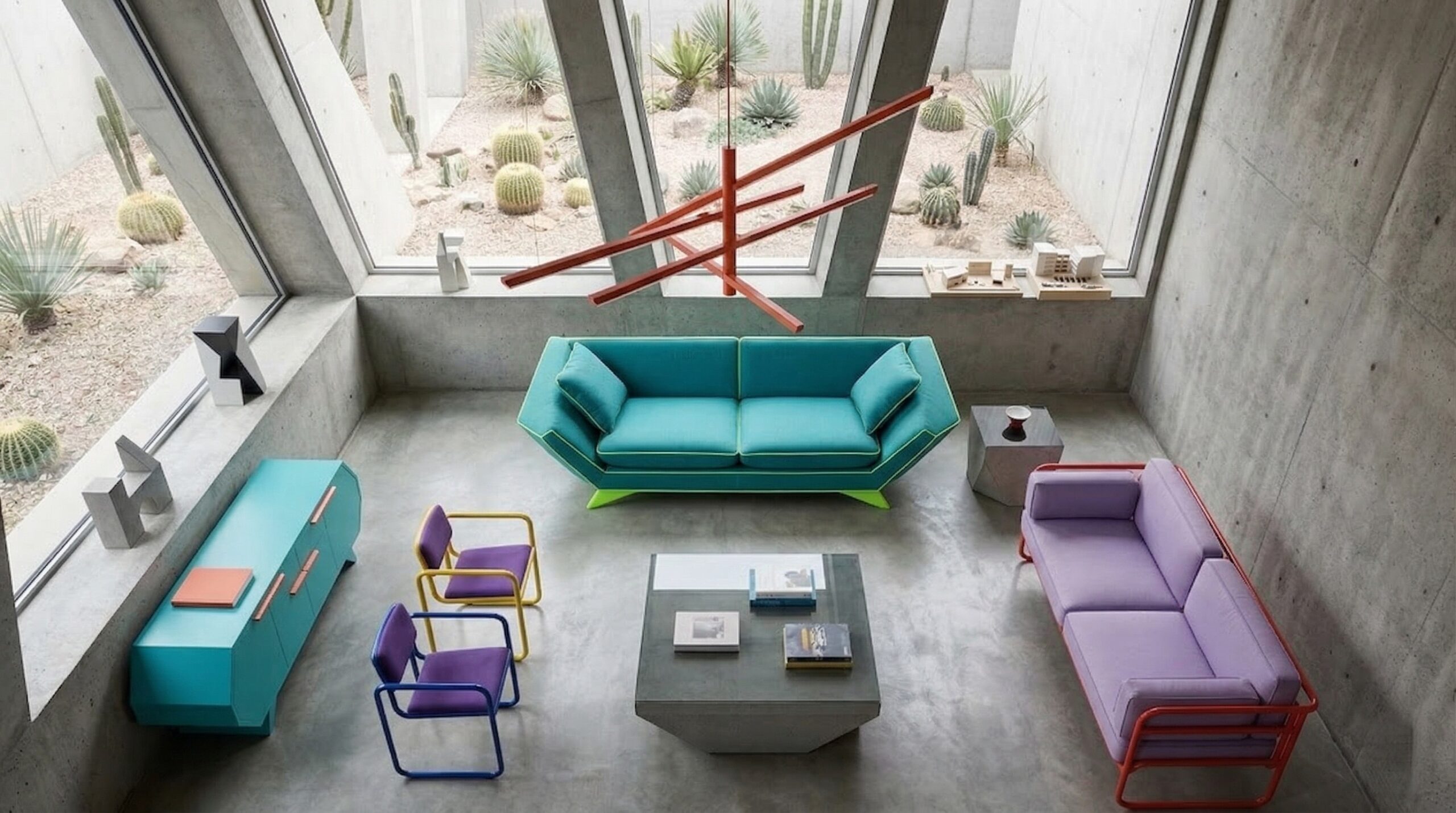 İç mekân organizasyonu; oturma, yemek ve çalışma alanlarının birbirine akışkan biçimde bağlandığı açık plan kurgusuna dayanır. Beton yüzeylerin nötr ve sert dili; turkuaz, mor, kırmızı ve sarı tonlarındaki mobilyalar ile dengelenerek dinamik bir atmosfer oluşturur.