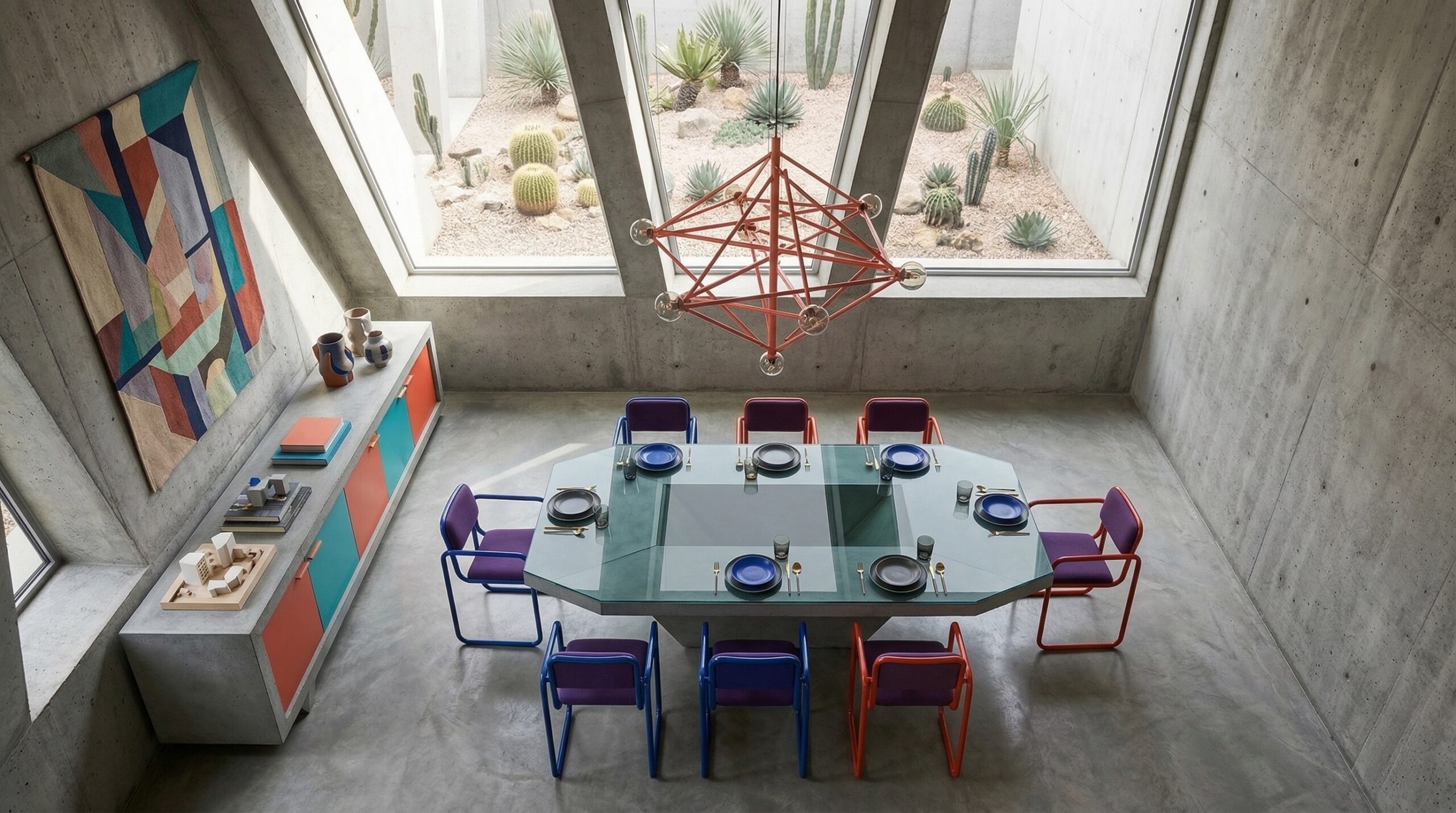 İç bahçe ve kaktüs peyzajı, dış mekân ile iç mekân arasında güçlü bir görsel süreklilik kurarken; geometrik aydınlatma elemanları ve sanat objeleri mekânın heykelsi karakterini destekler. Tasarım, mimari sadelik ile renkli yaşam enerjisini bir araya getiren güçlü bir mekânsal deneyim sunar.