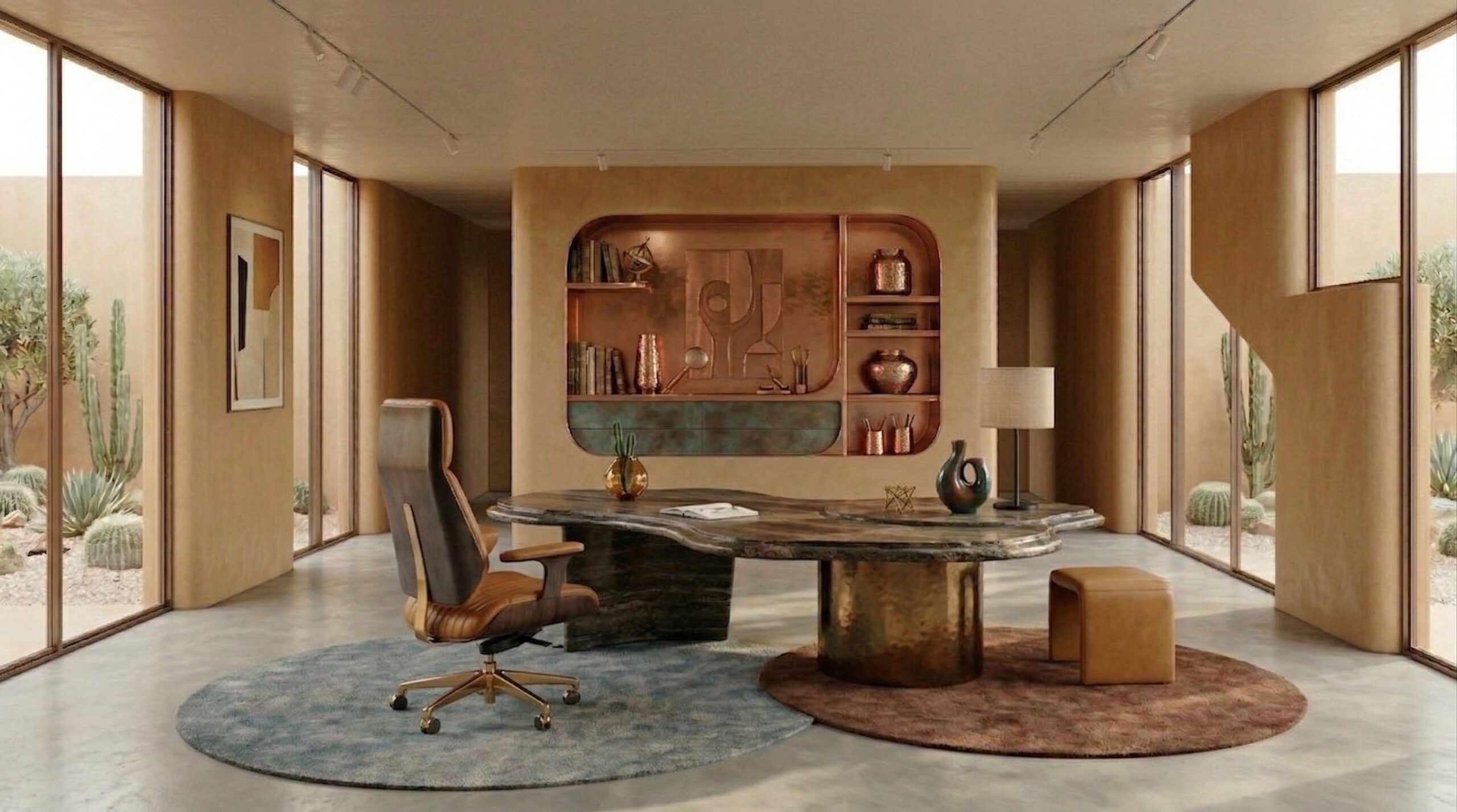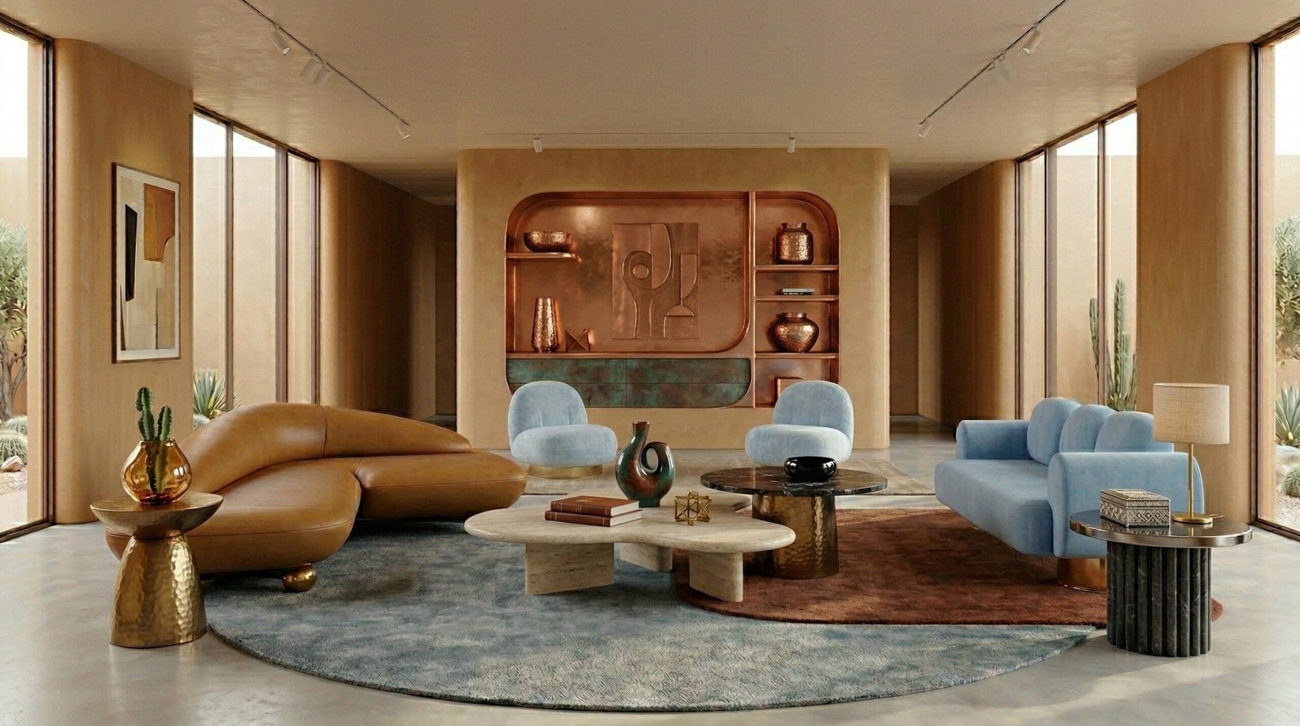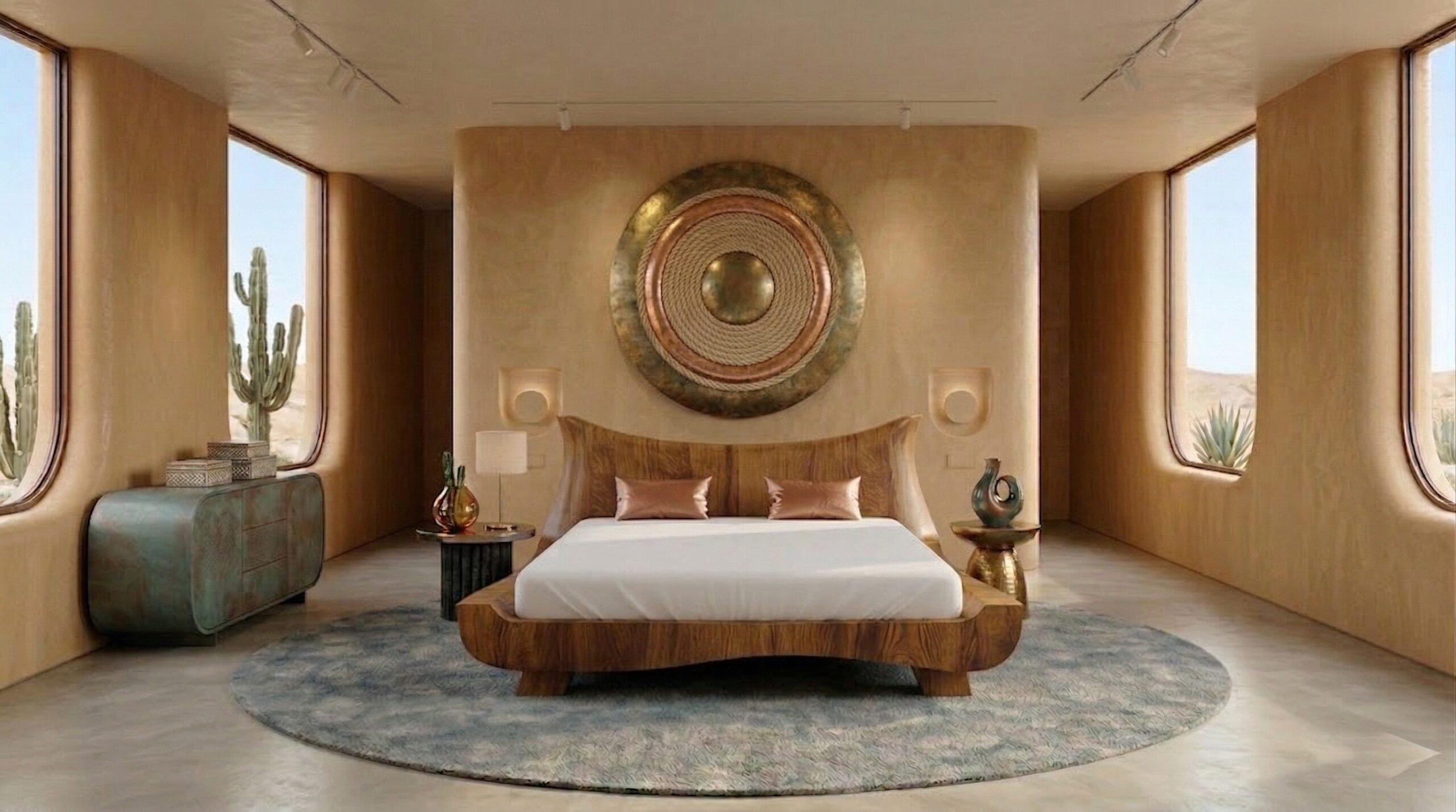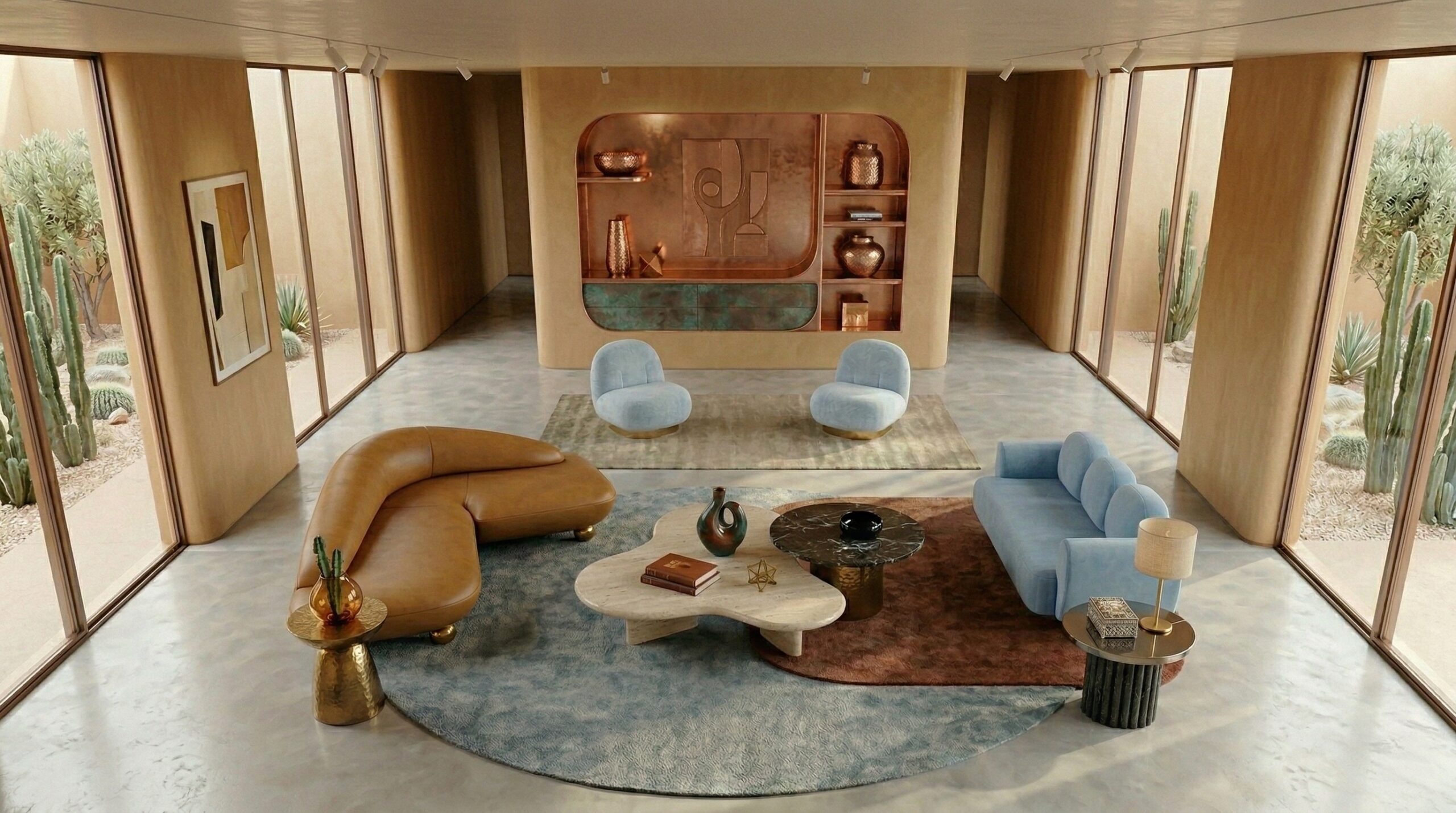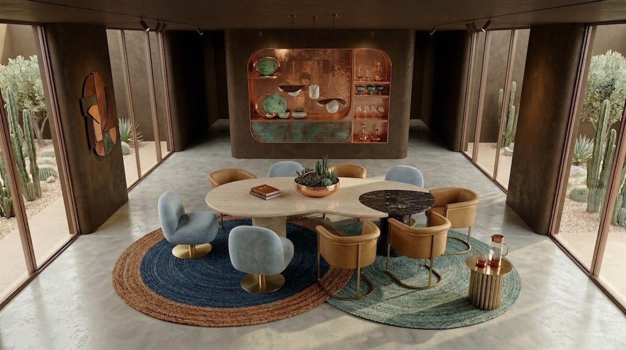 Mobilya seçimlerinde yuvarlak formlar, doğal taş yüzeyler ve sıcak ahşap tonları ön plana çıkar. Oturma, yemek ve çalışma alanları arasında kurulan açık plan organizasyon; hem sosyal etkileşimi hem de dingin bir yaşam atmosferini destekler. Tasarım, tropikal ve çöl etkilerini çağdaş bir mimari yaklaşımla bir araya getirir.
