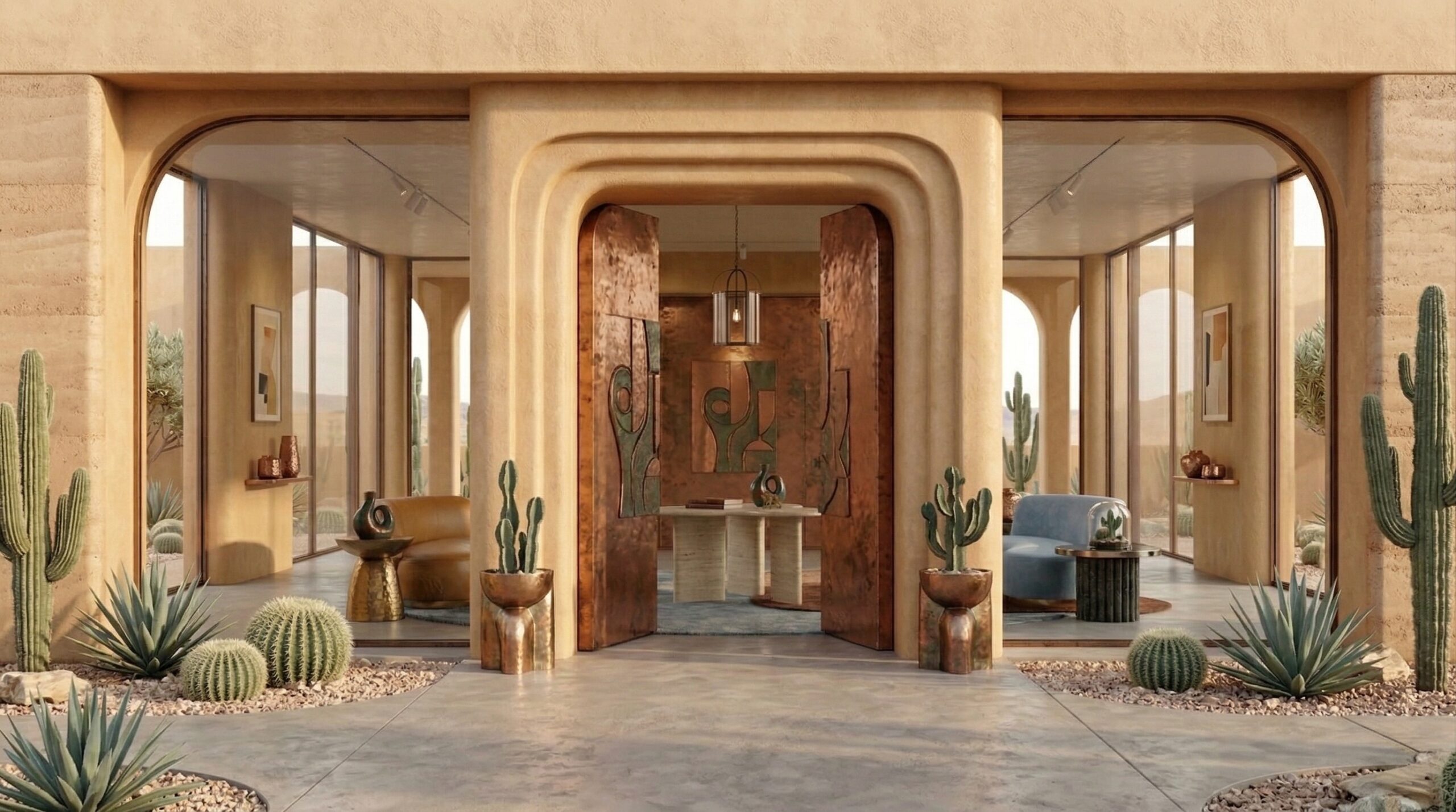 Geniş açıklıklı pencereler ve iç avlu düzeni sayesinde doğal ışık ve peyzaj, mekânın ayrılmaz bir parçası haline gelir. Kaktüs ve yerel bitki örtüsü ile oluşturulan dış mekân kompozisyonu, iç mekânın renk ve doku paleti ile uyum içinde ilerler.