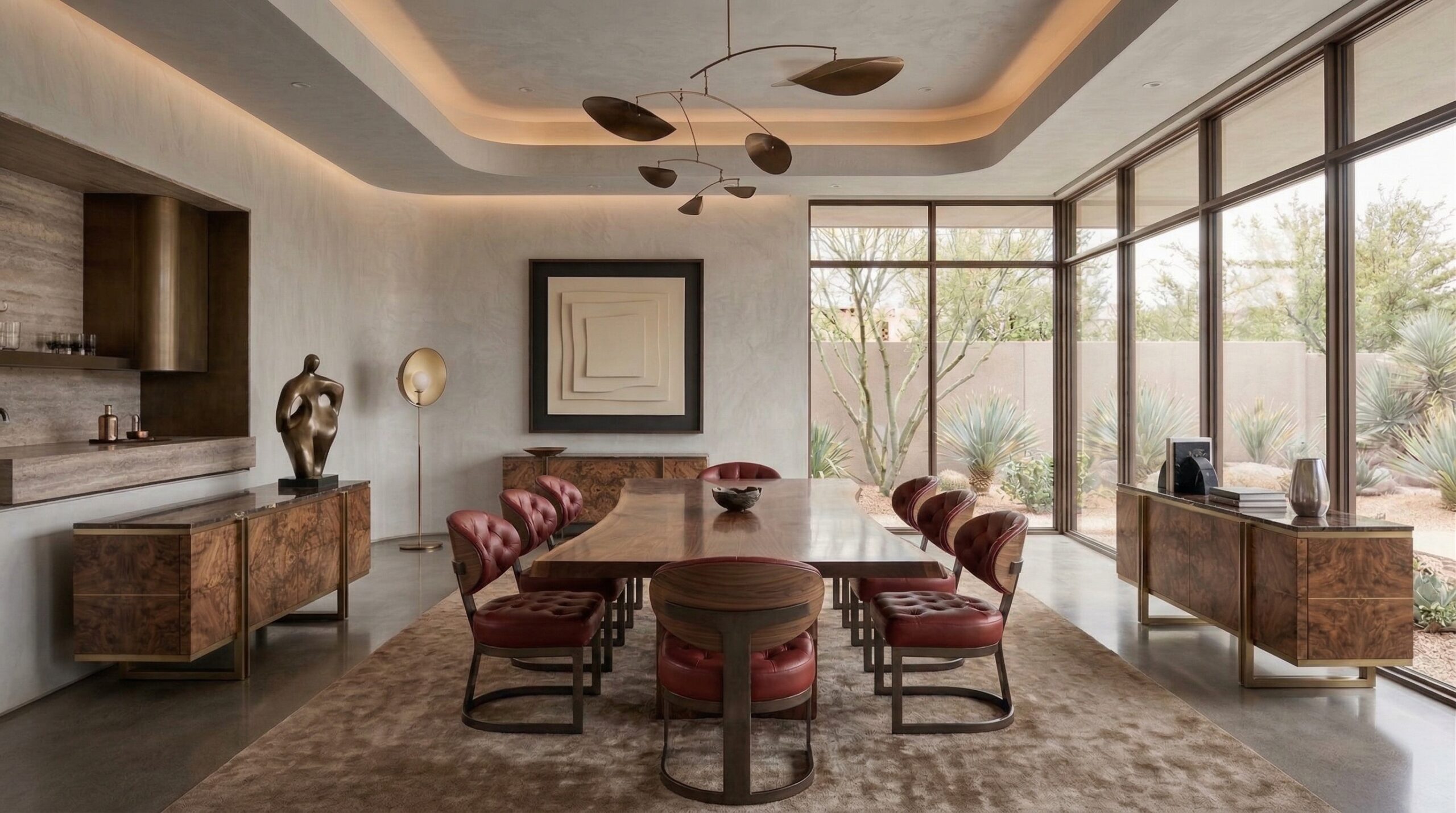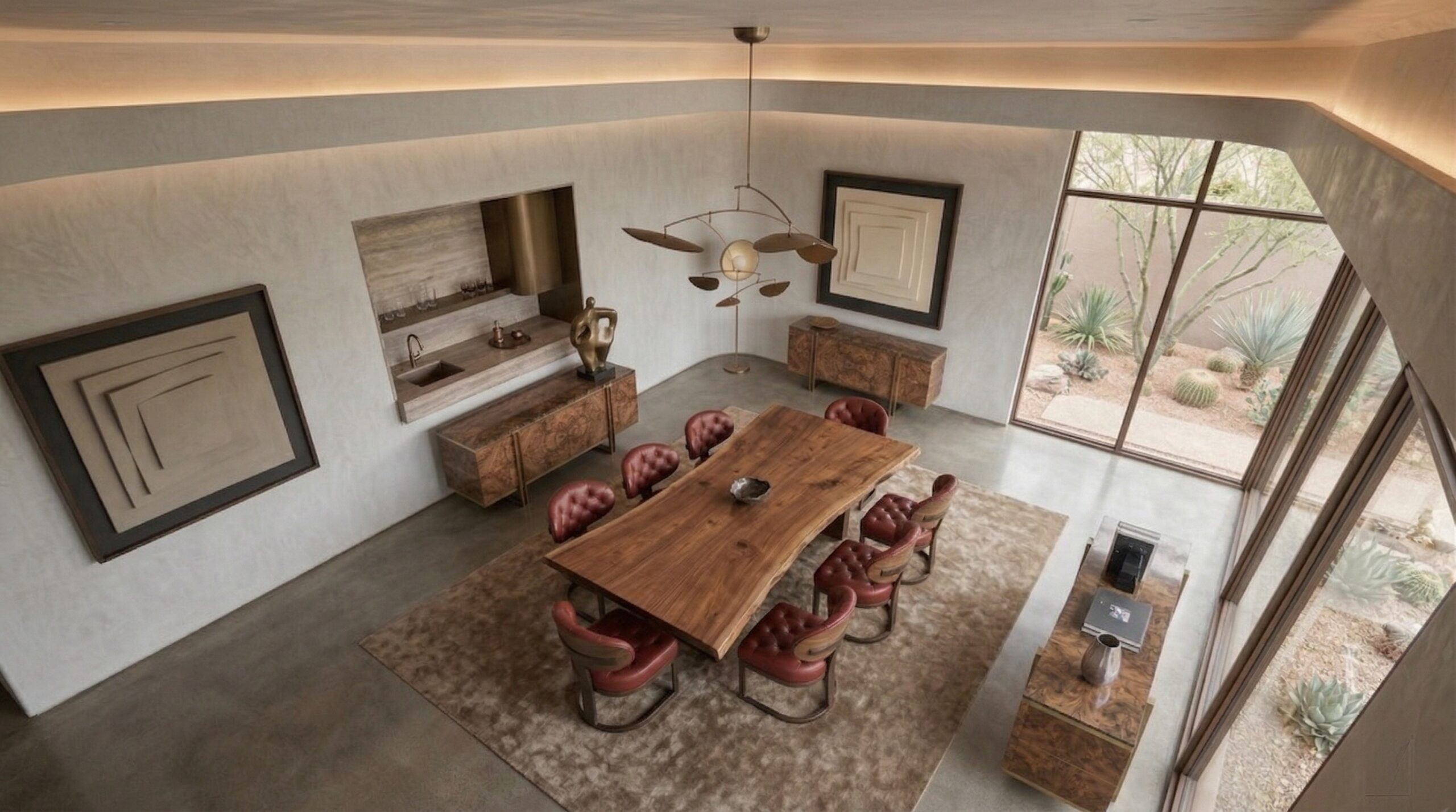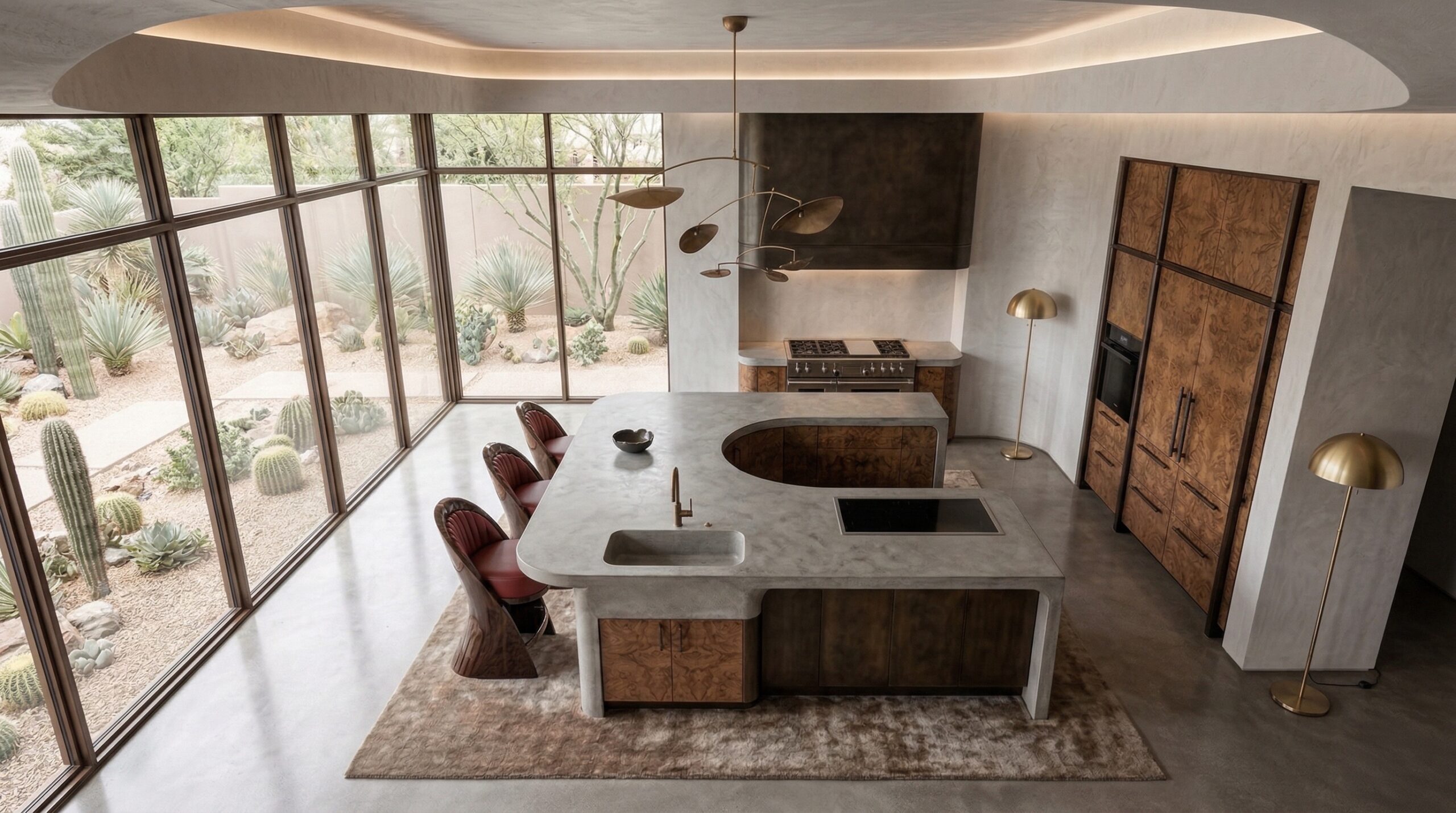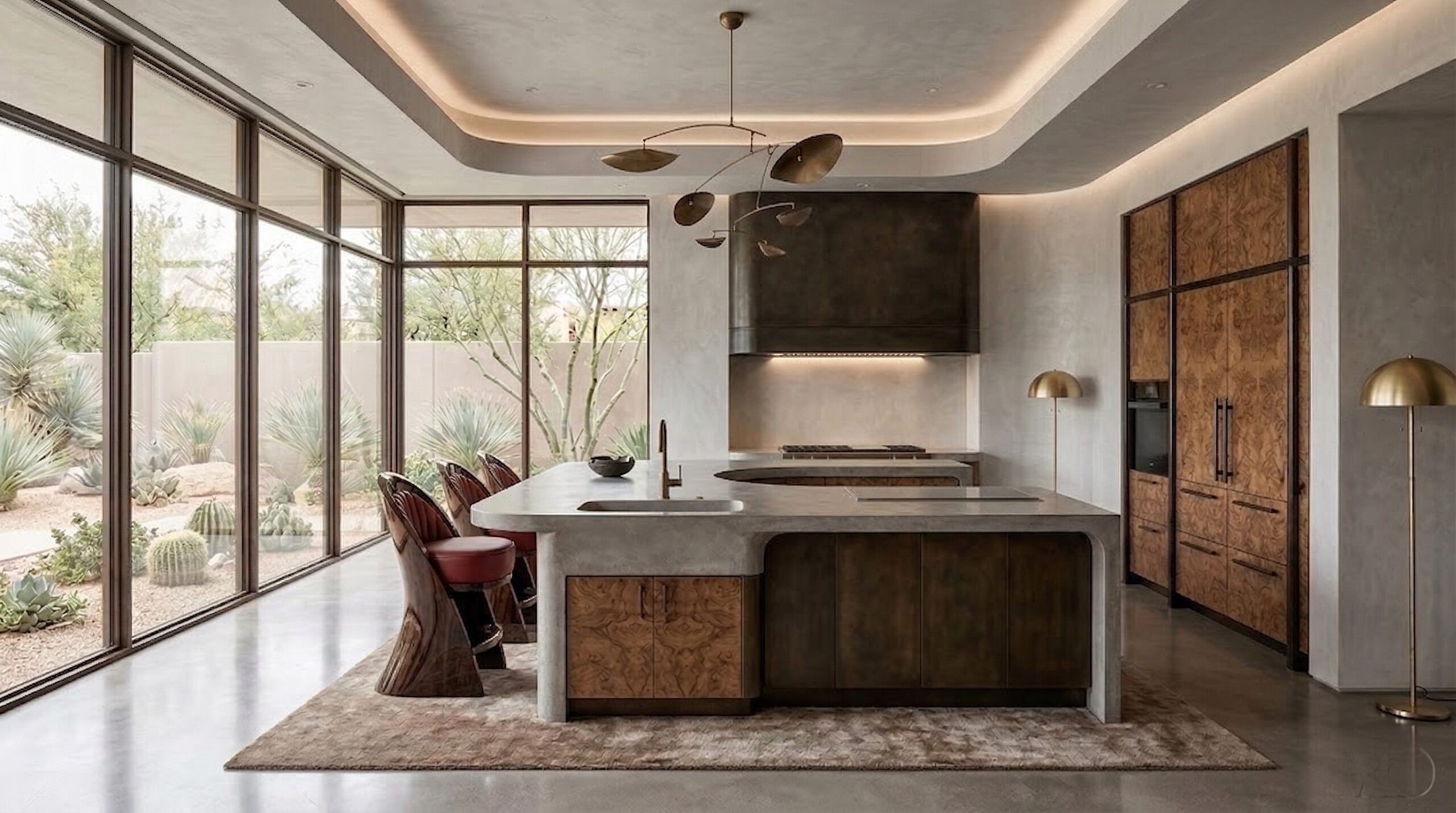 Mutfak ve yemek alanları, hem sosyal etkileşimi destekleyen hem de manzara ile ilişki kuran merkezi bir çekirdek olarak tasarlanmıştır. İç avlu ve kaktüs peyzajı, ışık ve gölge oyunlarıyla mekâna gün boyunca değişen bir atmosfer kazandırır. Tasarım, çağdaş çöl mimarisini rafine bir yaşam kurgusu ile birleştirir.