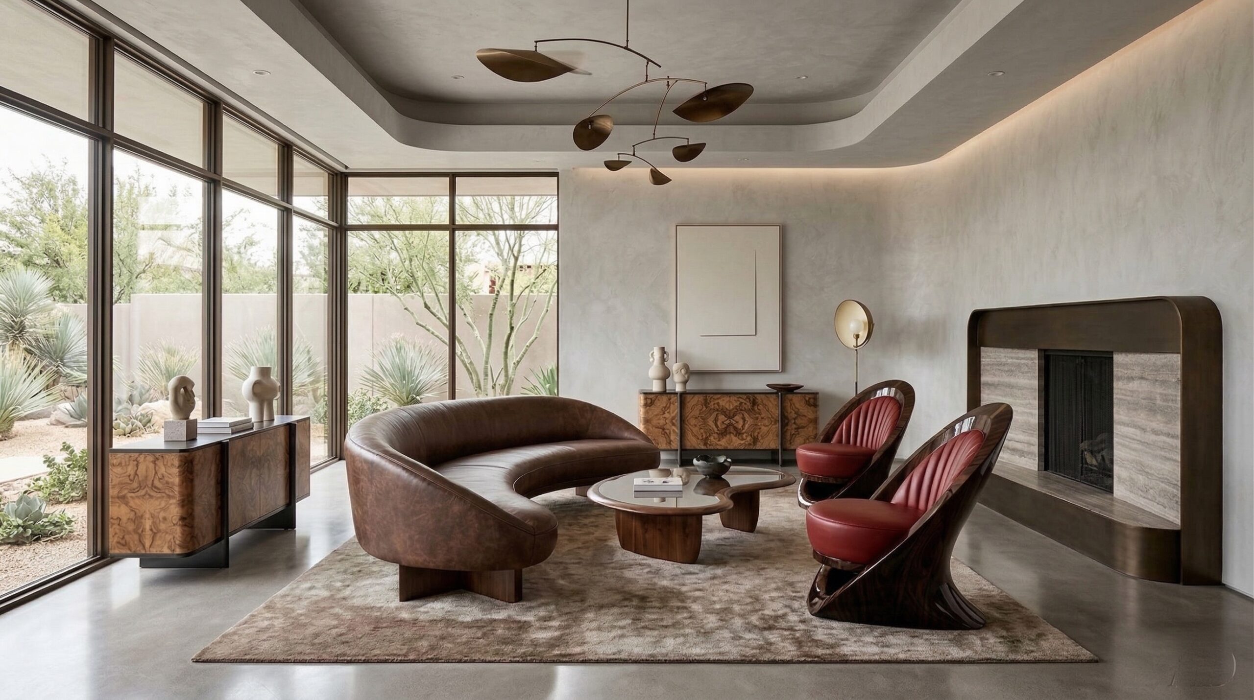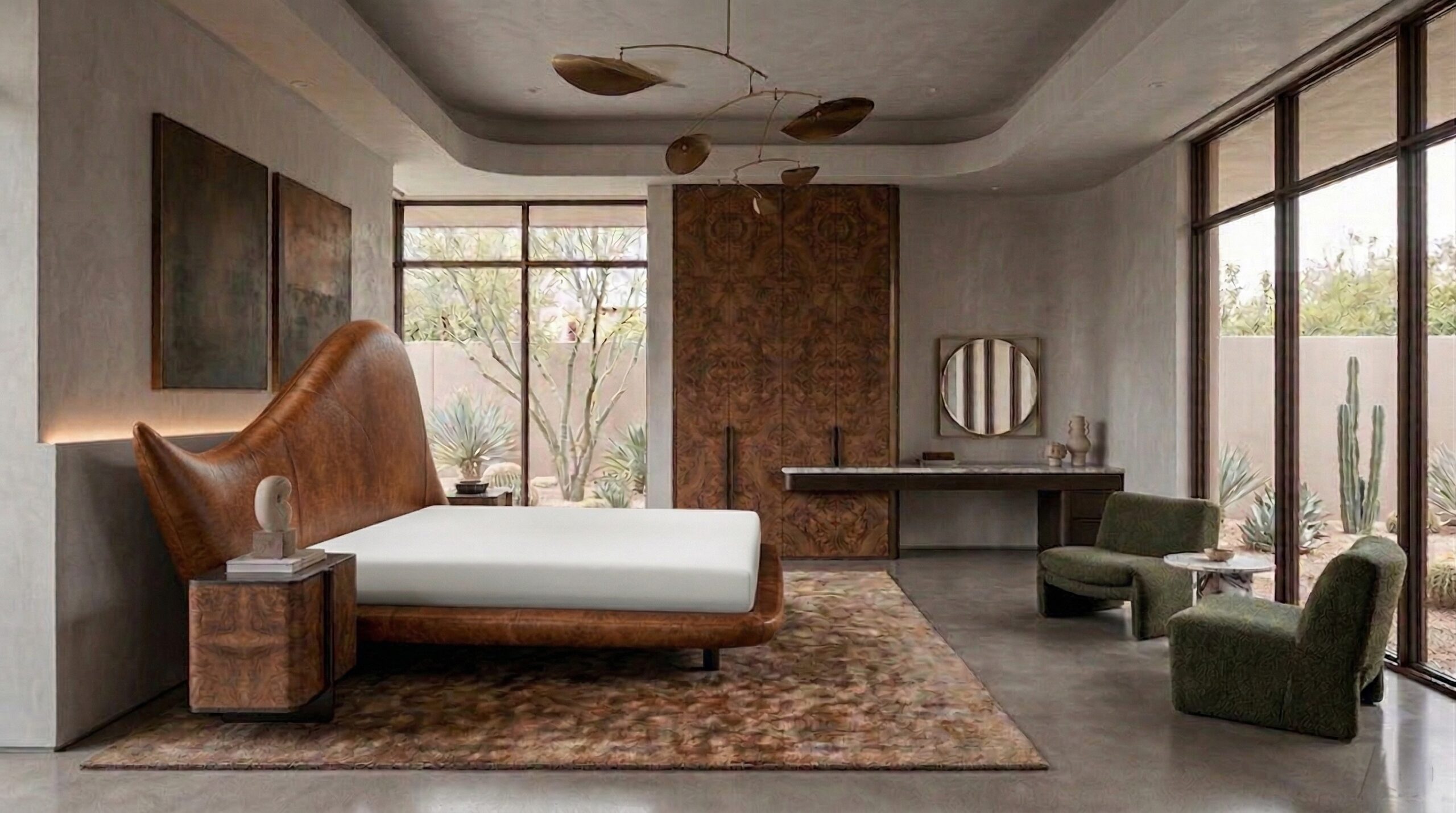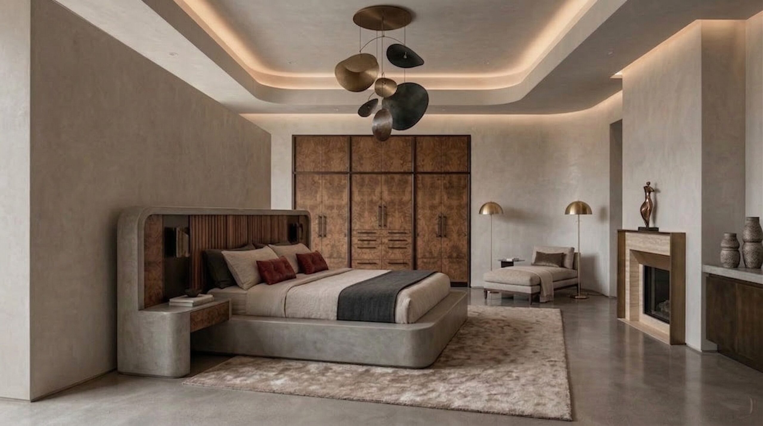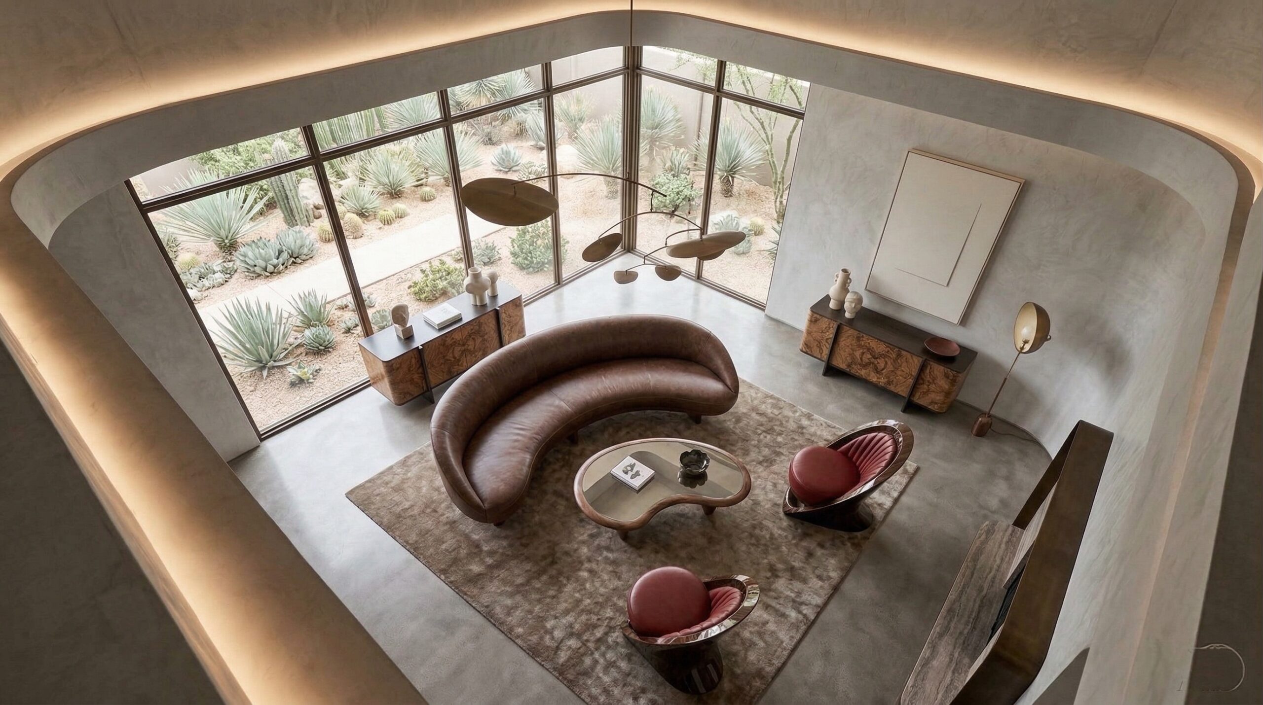 İç mekânda akışkan tavan formları ve yumuşatılmış köşe detayları, mekân deneyimini daha organik ve süreklilik hissi veren bir yapıya dönüştürür. Oturma alanlarında kullanılan kavisli mobilyalar ve doğal dokular, mimari ile bütünleşen bir iç mekân kompozisyonu oluşturur.